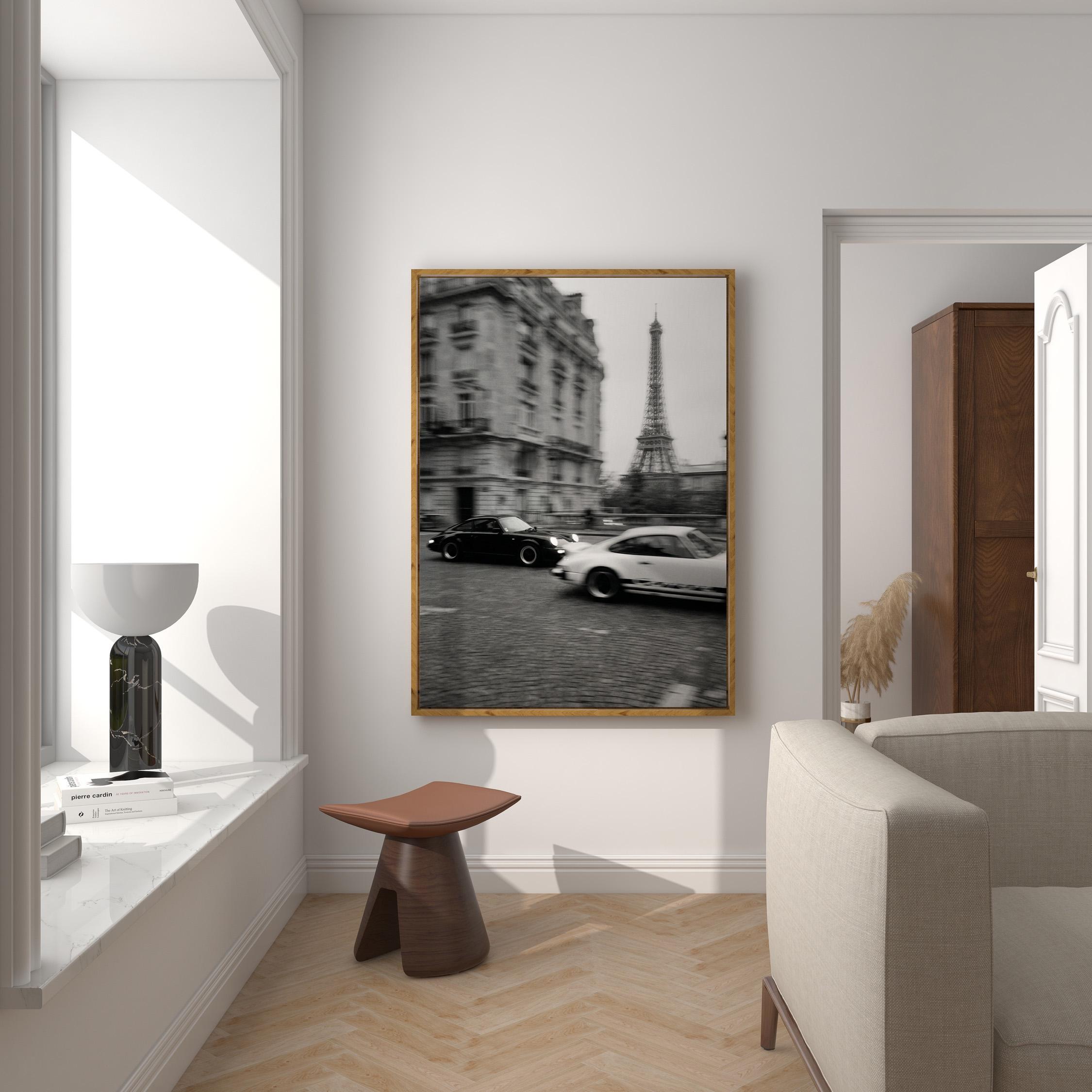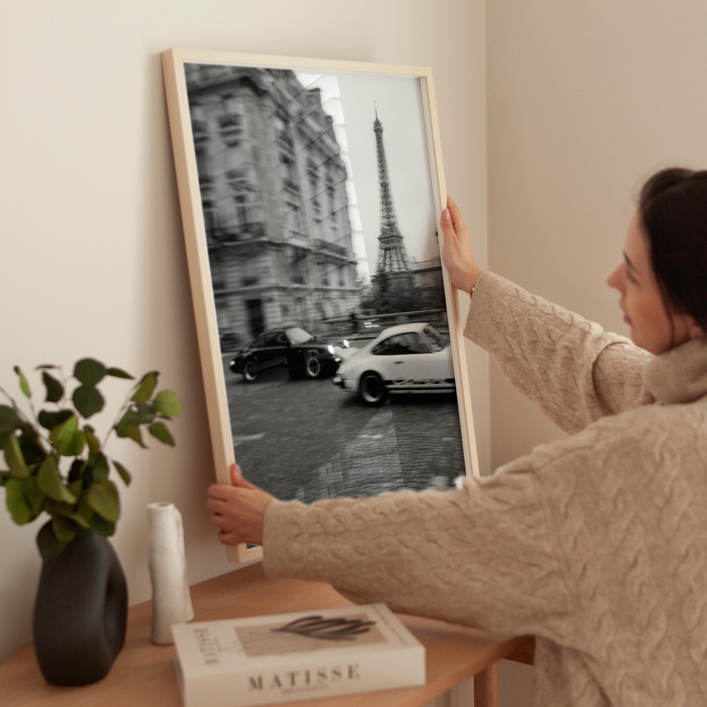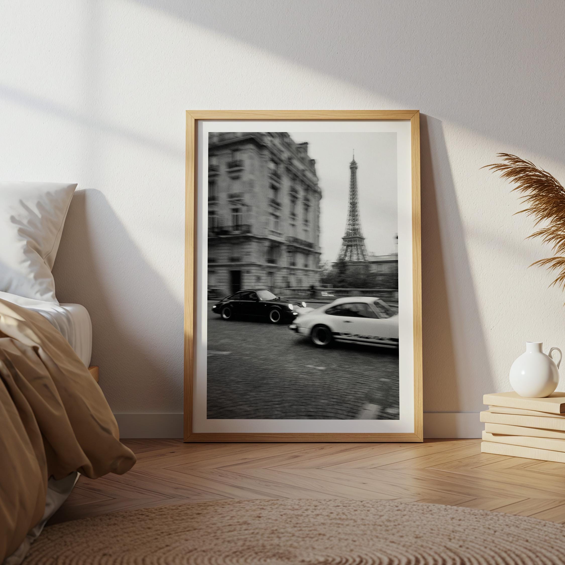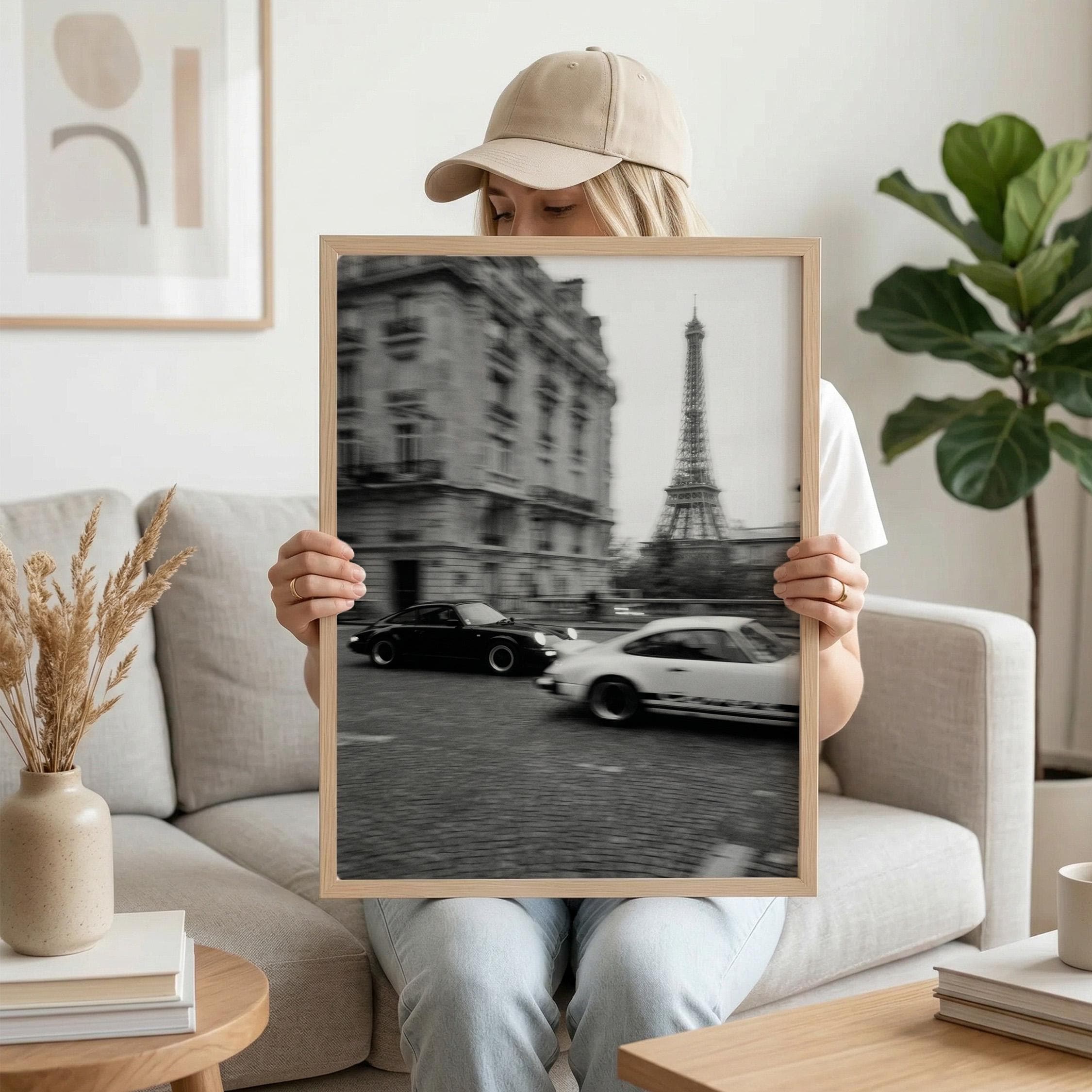 Porsche 911 wall art print captured in Paris with the Eiffel Tower in the background. Perfect for an office, garage, studio, or for anyone who loves classic cars, French style, and black and white photography. Digital download wall art to print and frame in your space.
