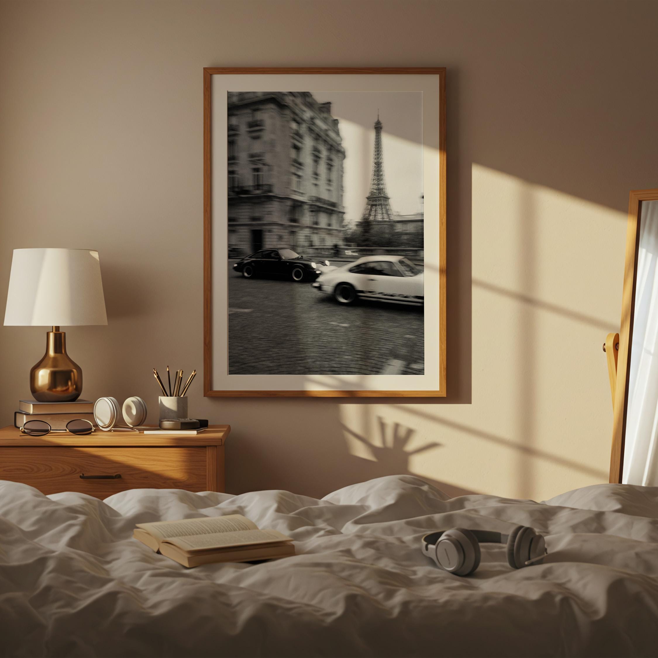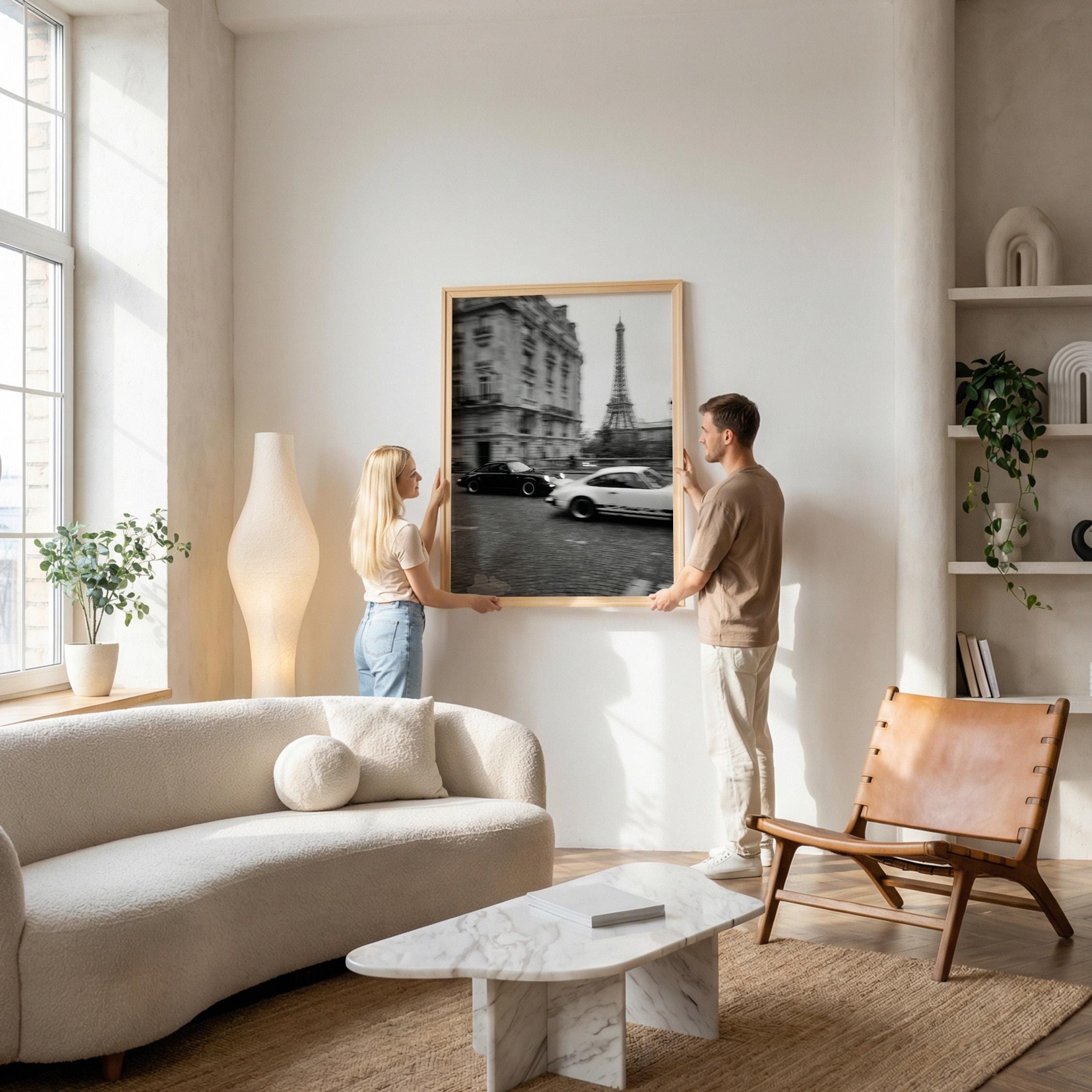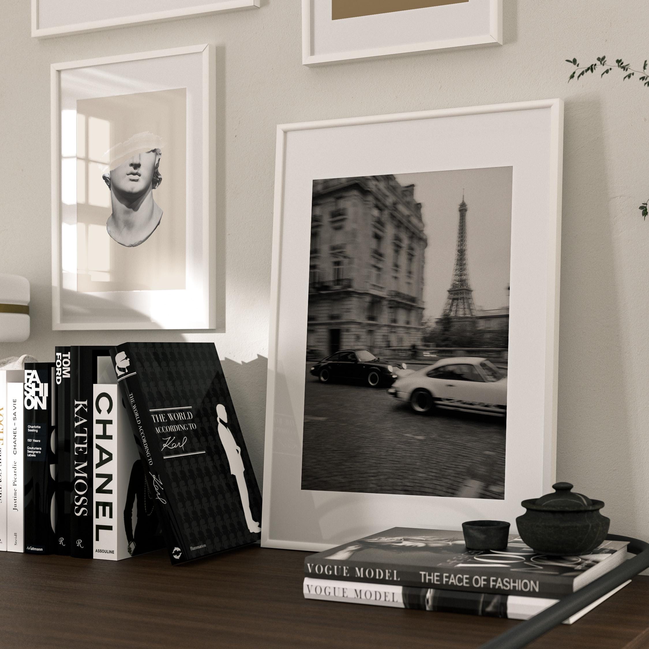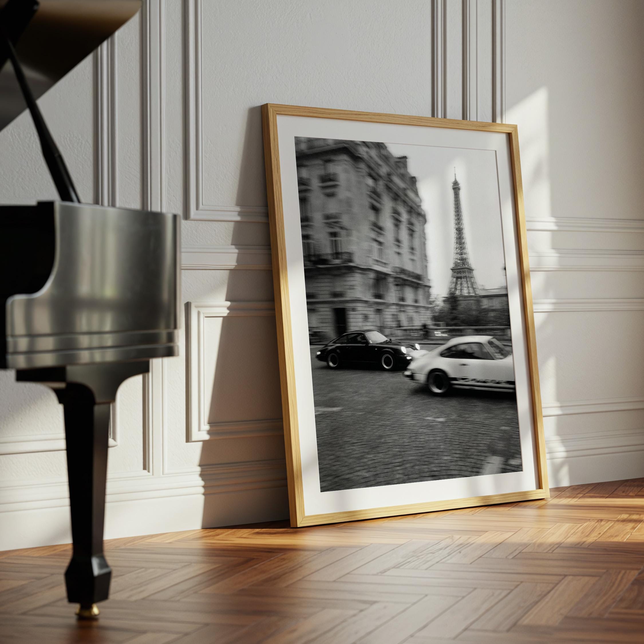 Porsche 911 wall art print captured in Paris with the Eiffel Tower in the background. Perfect for an office, garage, studio, or for anyone who loves classic cars, French style, and black and white photography. Digital download wall art to print and frame in your space.