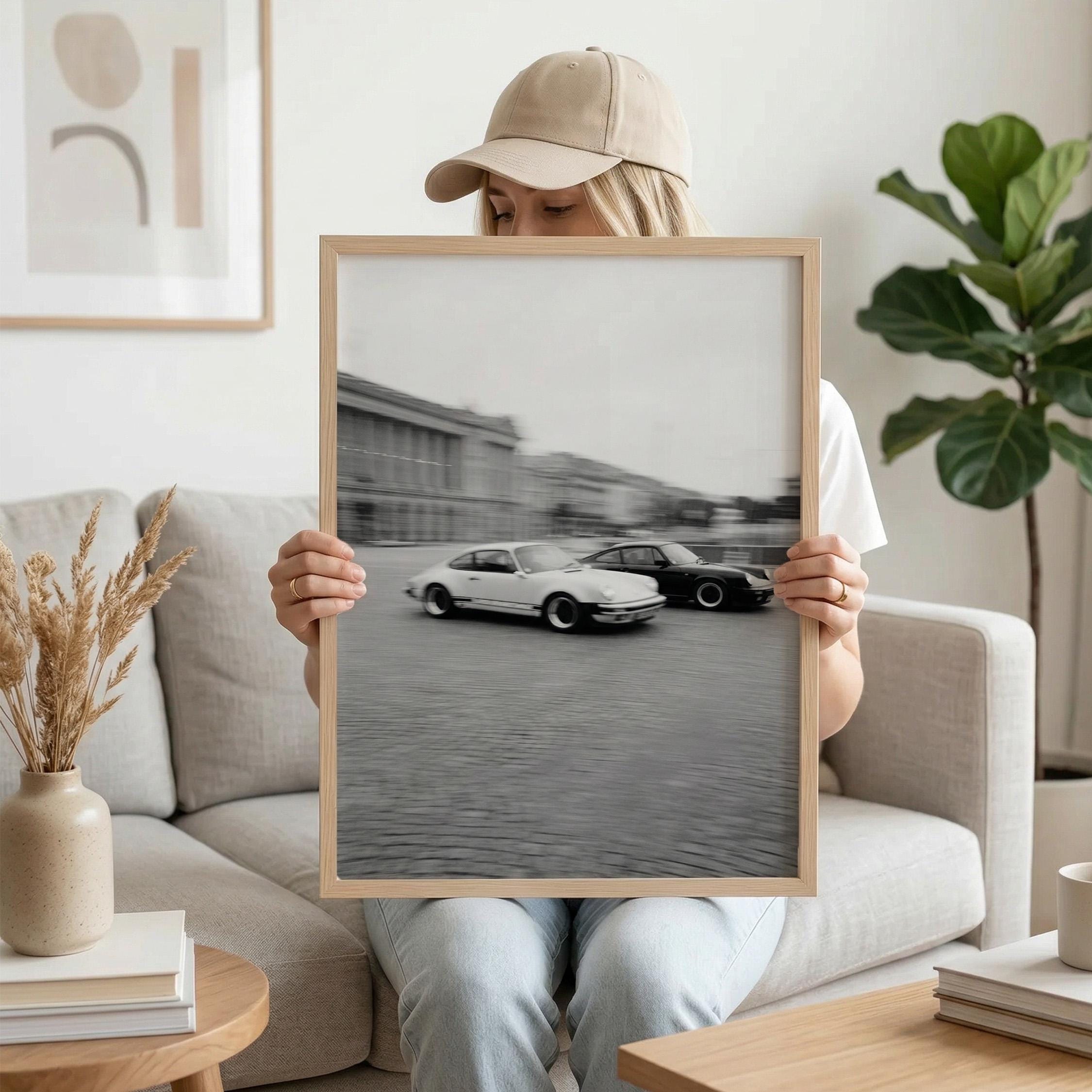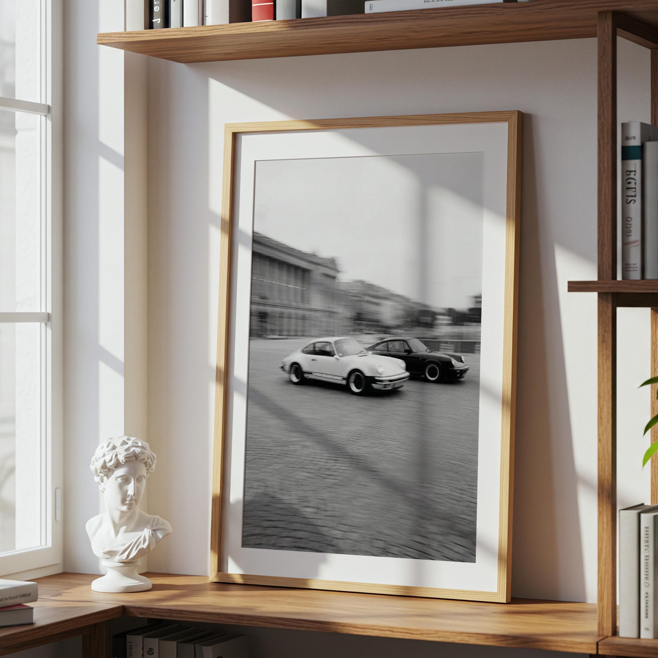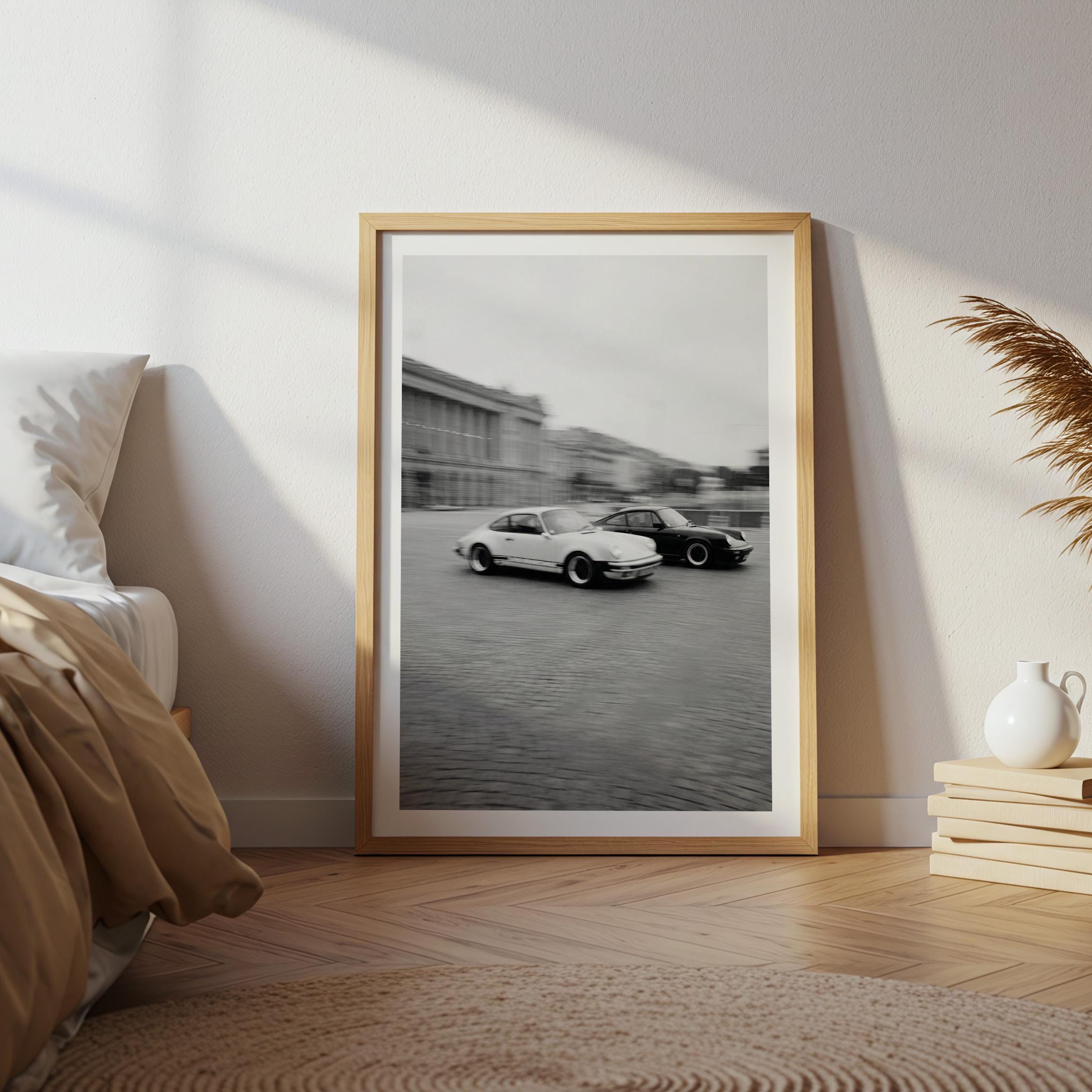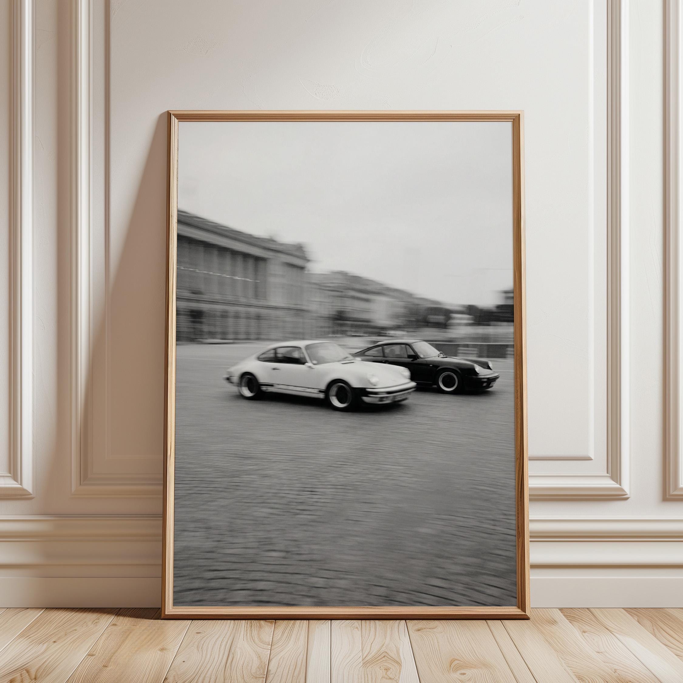 Porsche 911 wall art print with a vintage Carrera feel and clean black and white motion. Perfect for an office, garage, studio, or for anyone who loves classic cars and timeless design.