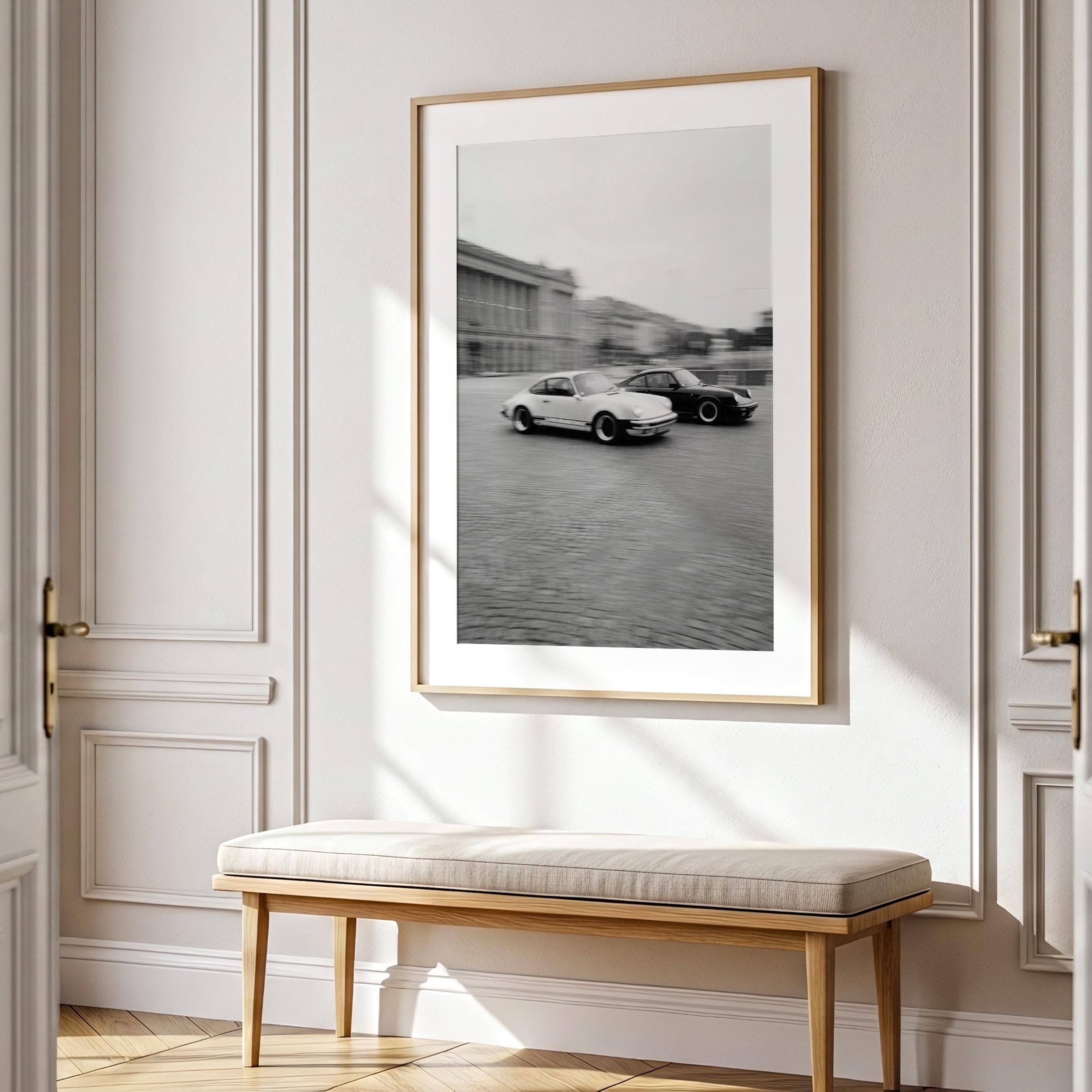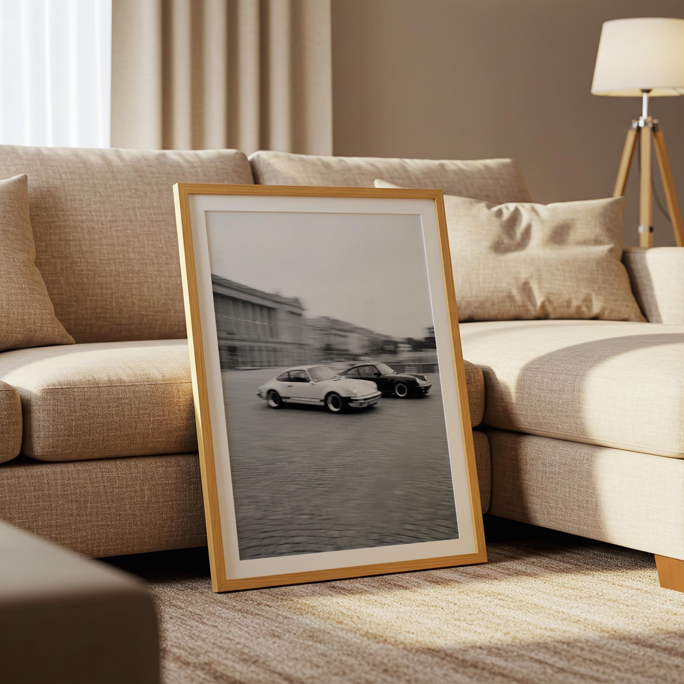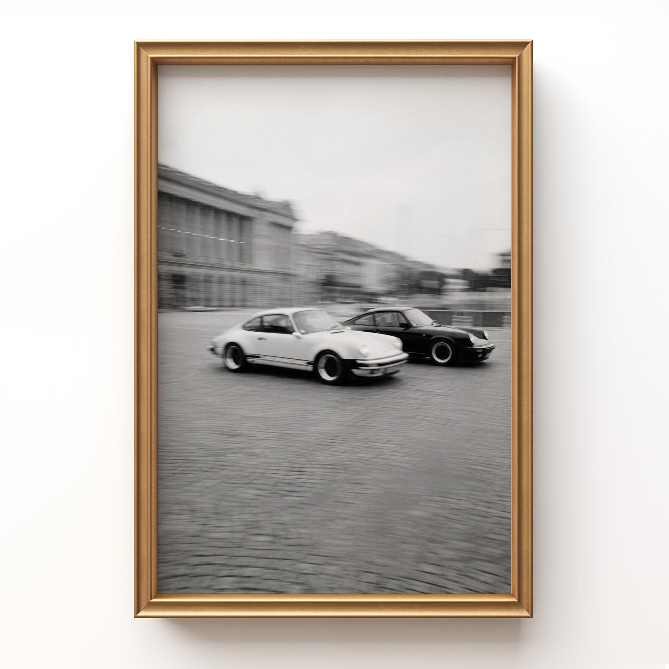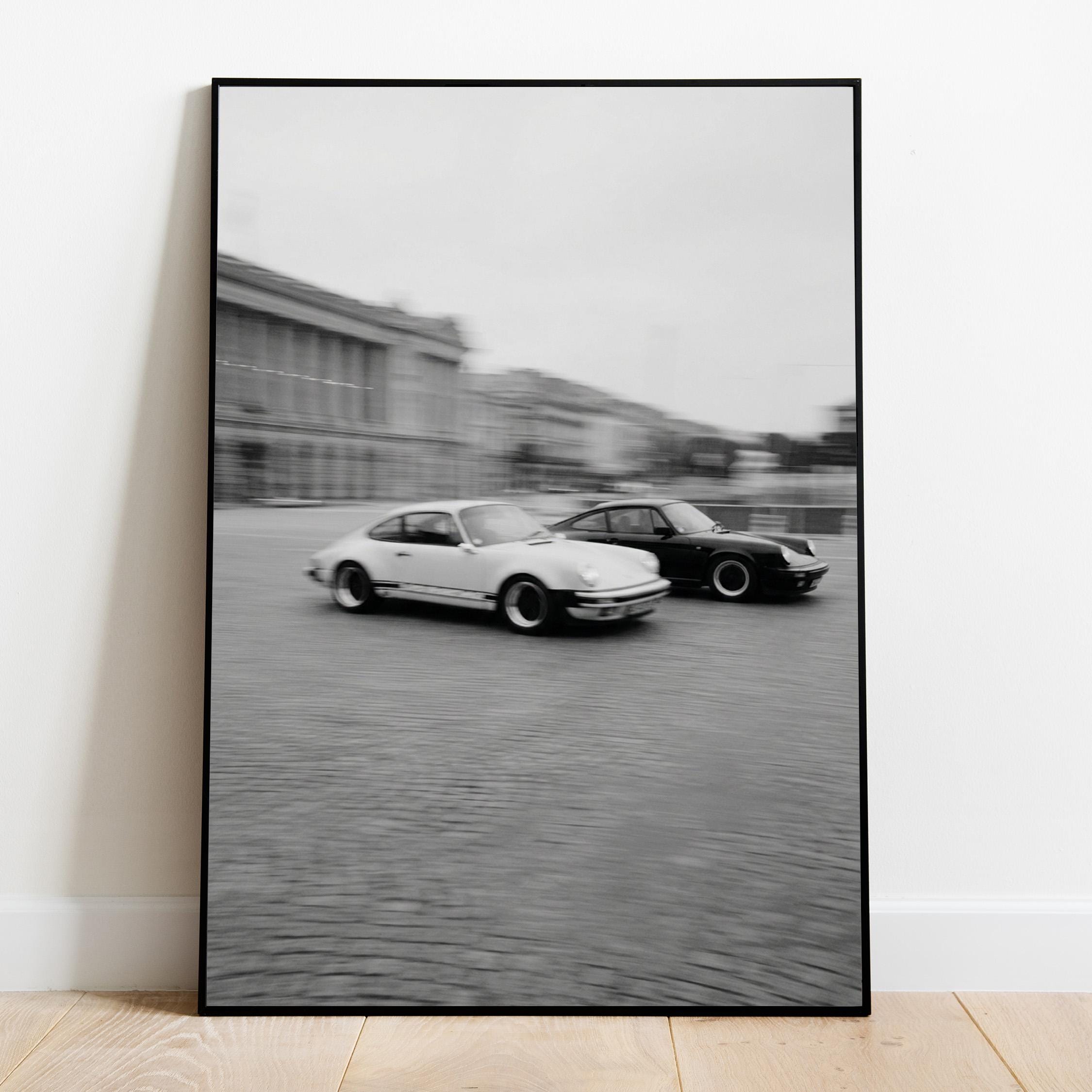 Porsche 911 wall art print with a vintage Carrera feel and clean black and white motion. Perfect for an office, garage, studio, or for anyone who loves classic cars and timeless design.