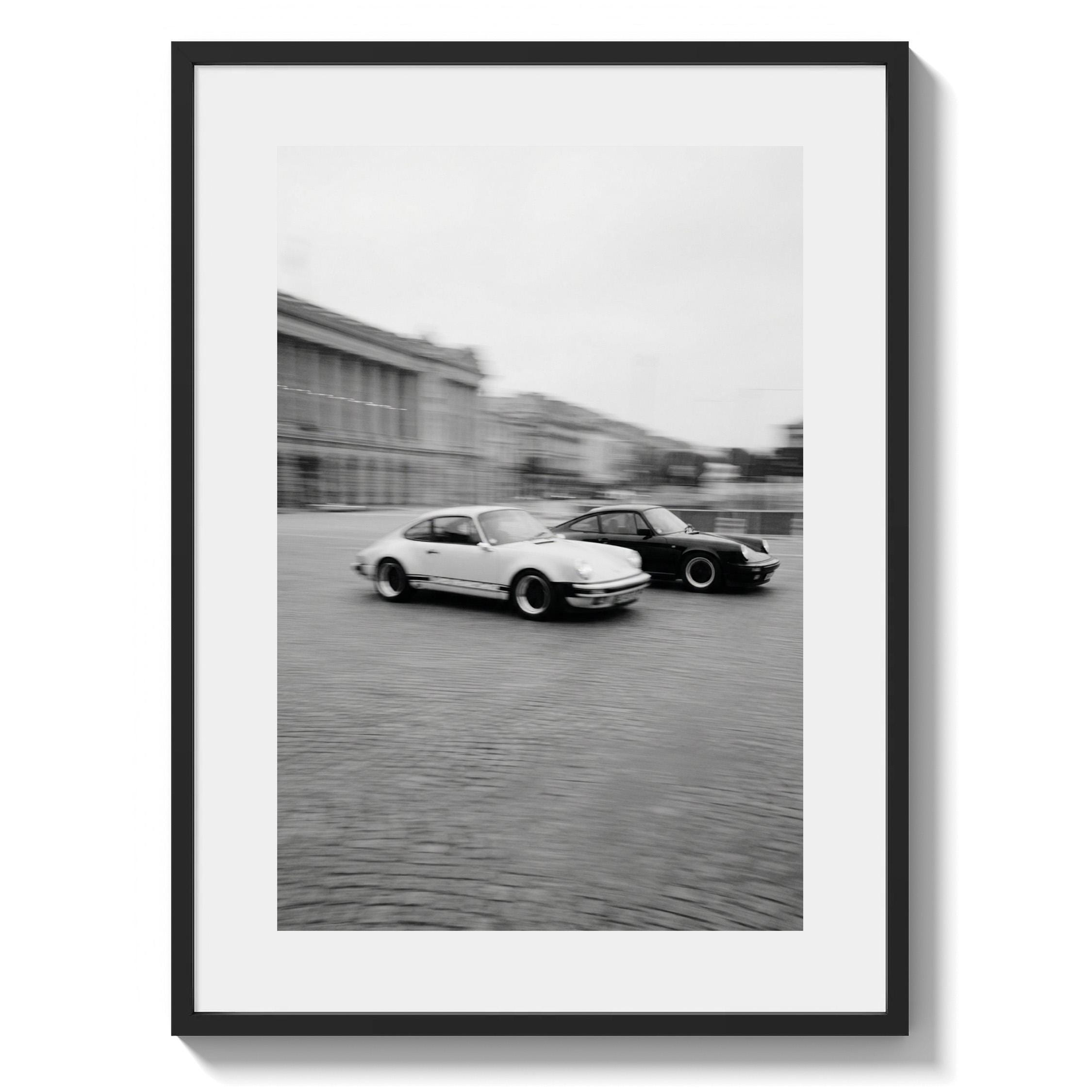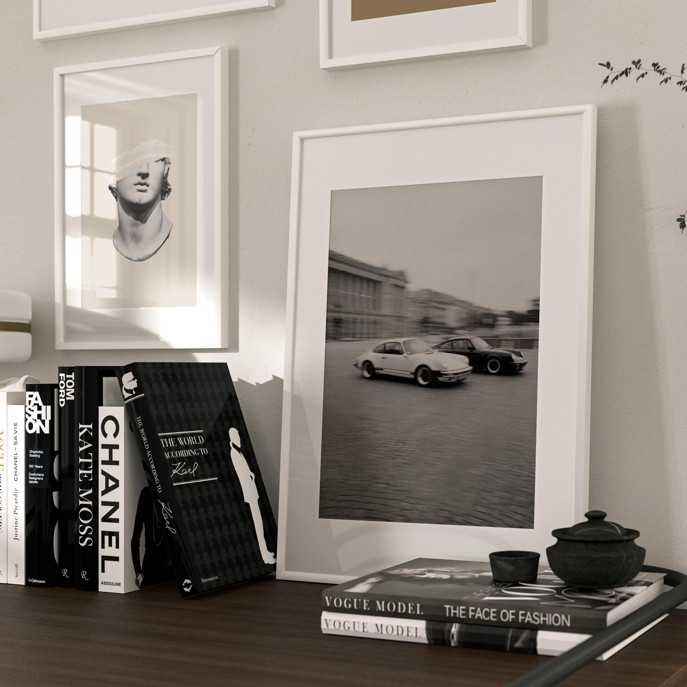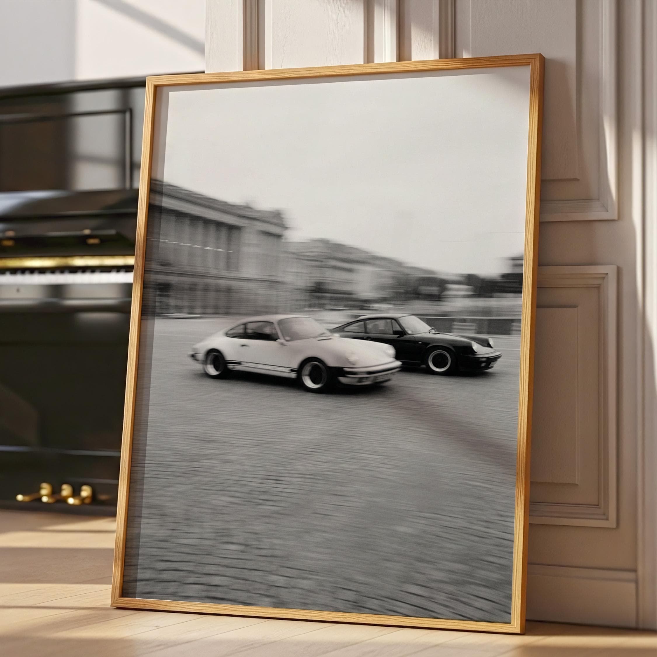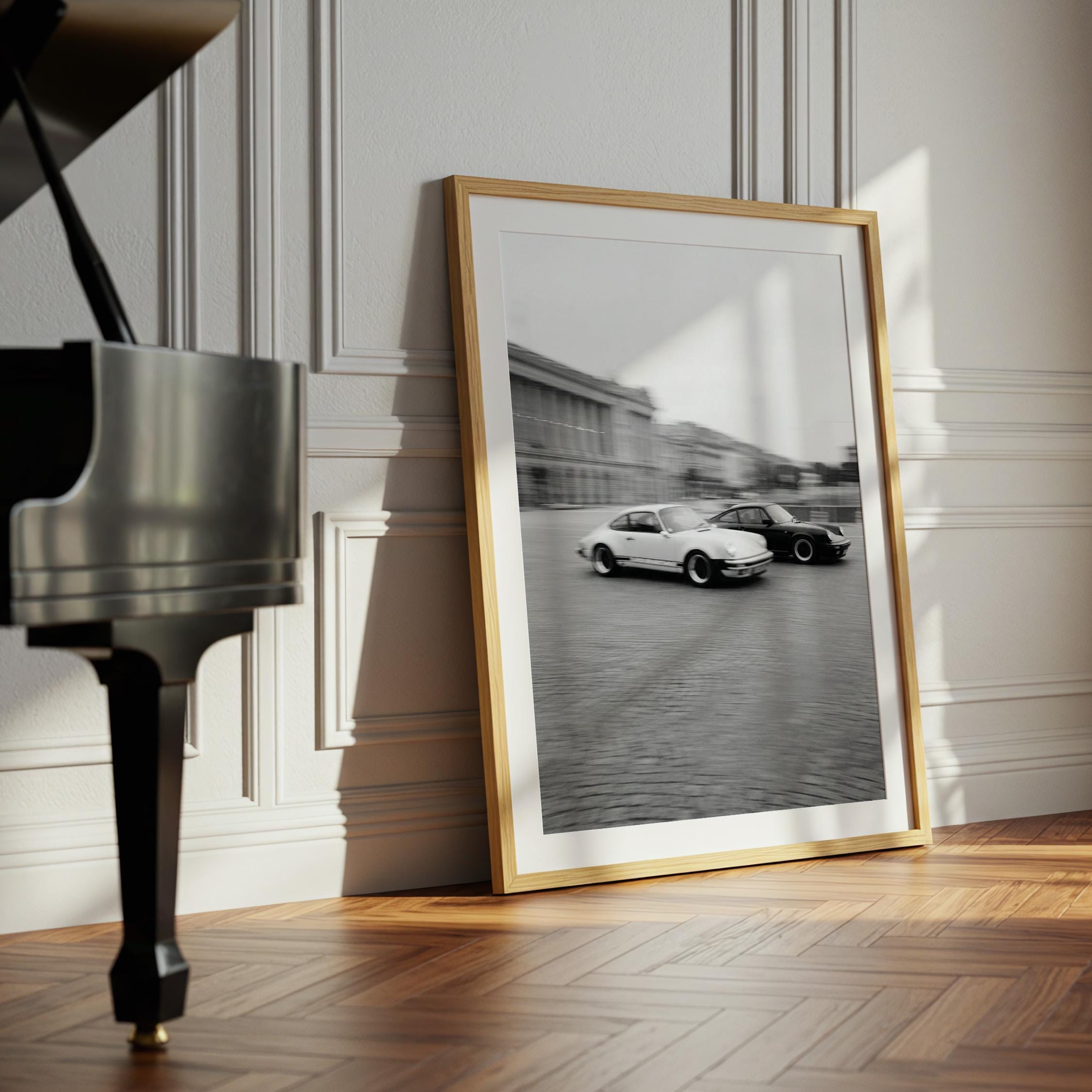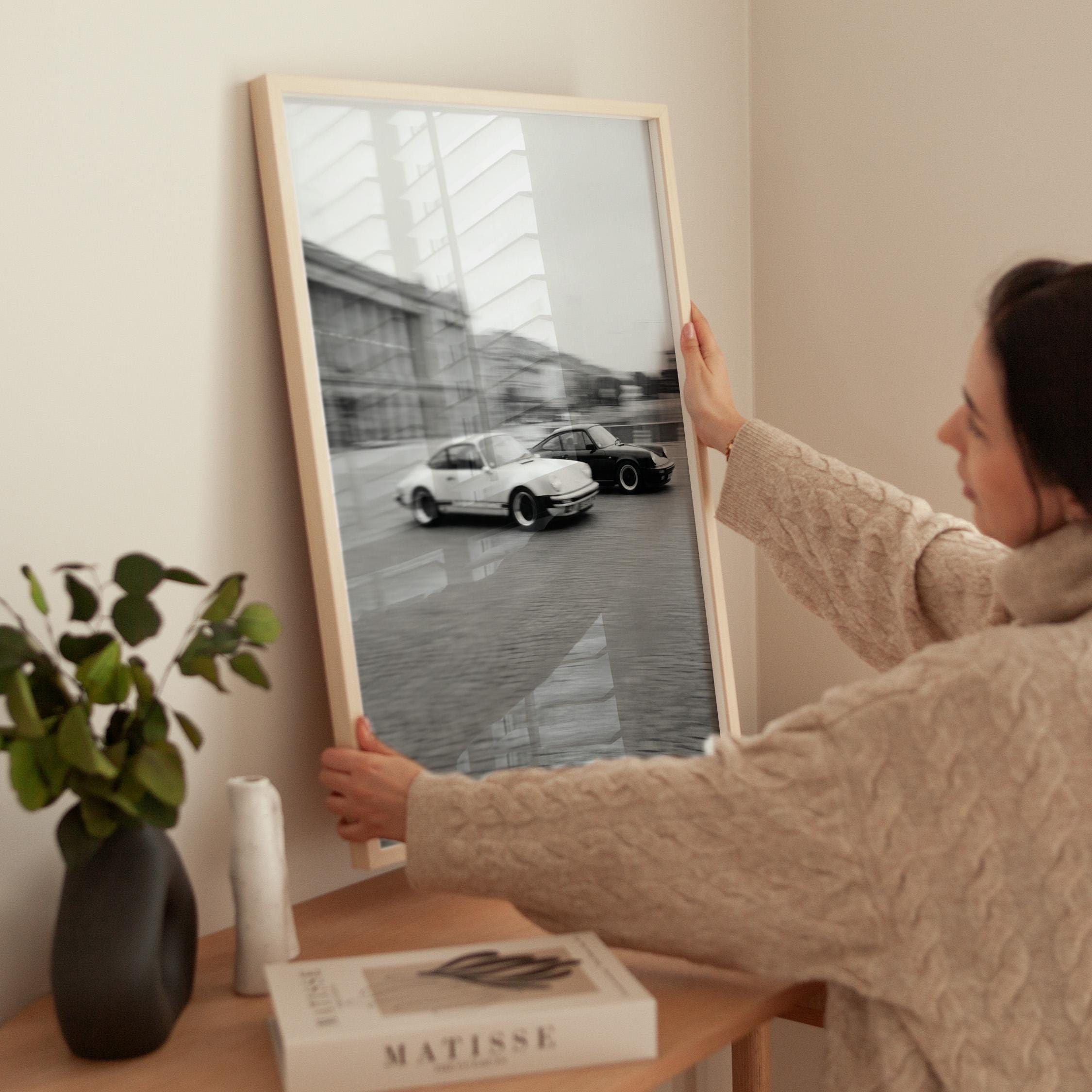 Porsche 911 wall art print with a vintage Carrera feel and clean black and white motion. Perfect for an office, garage, studio, or for anyone who loves classic cars and timeless design.