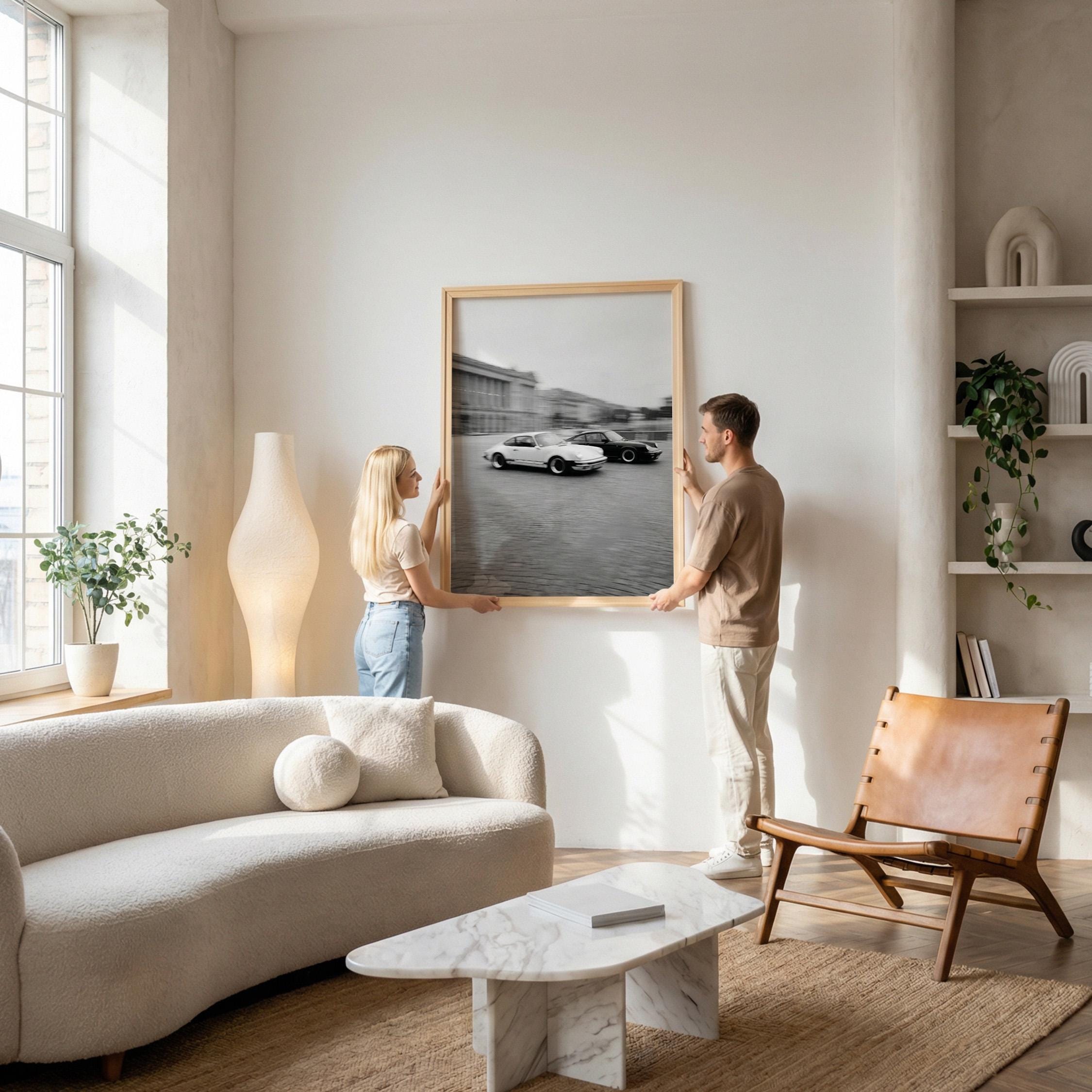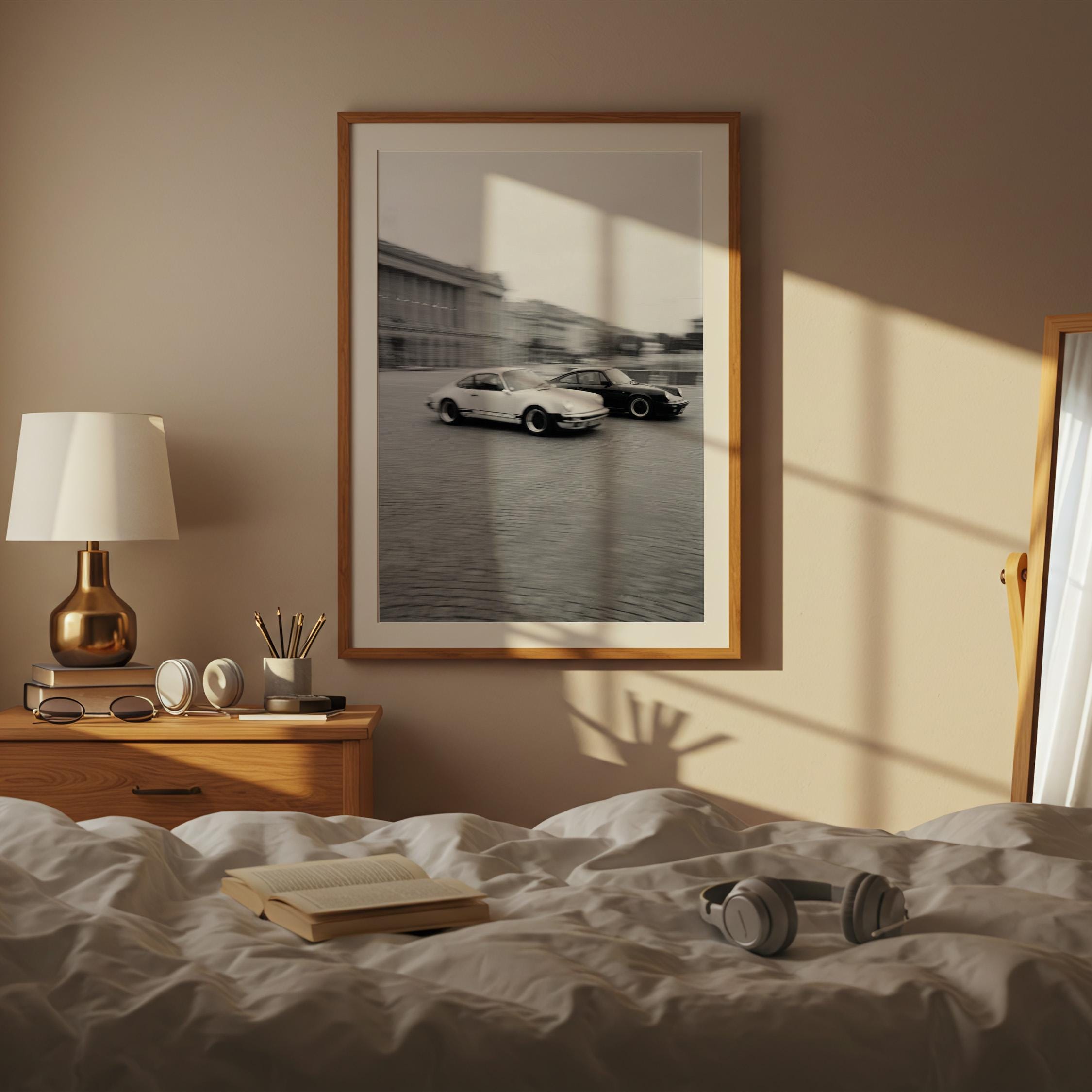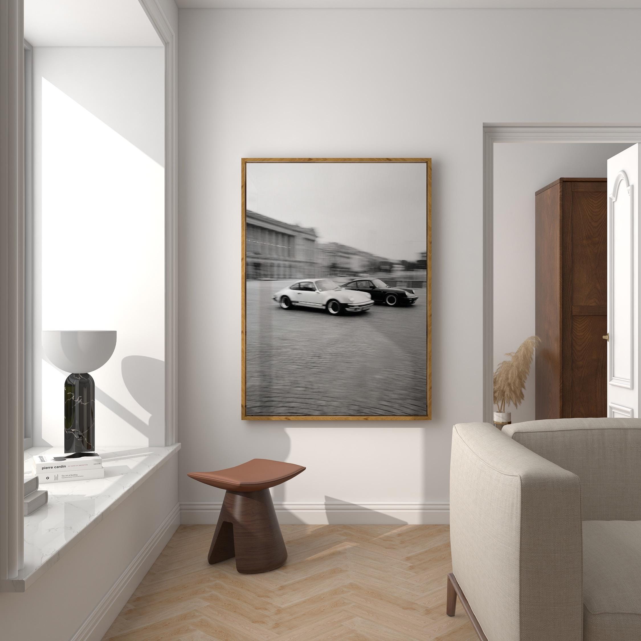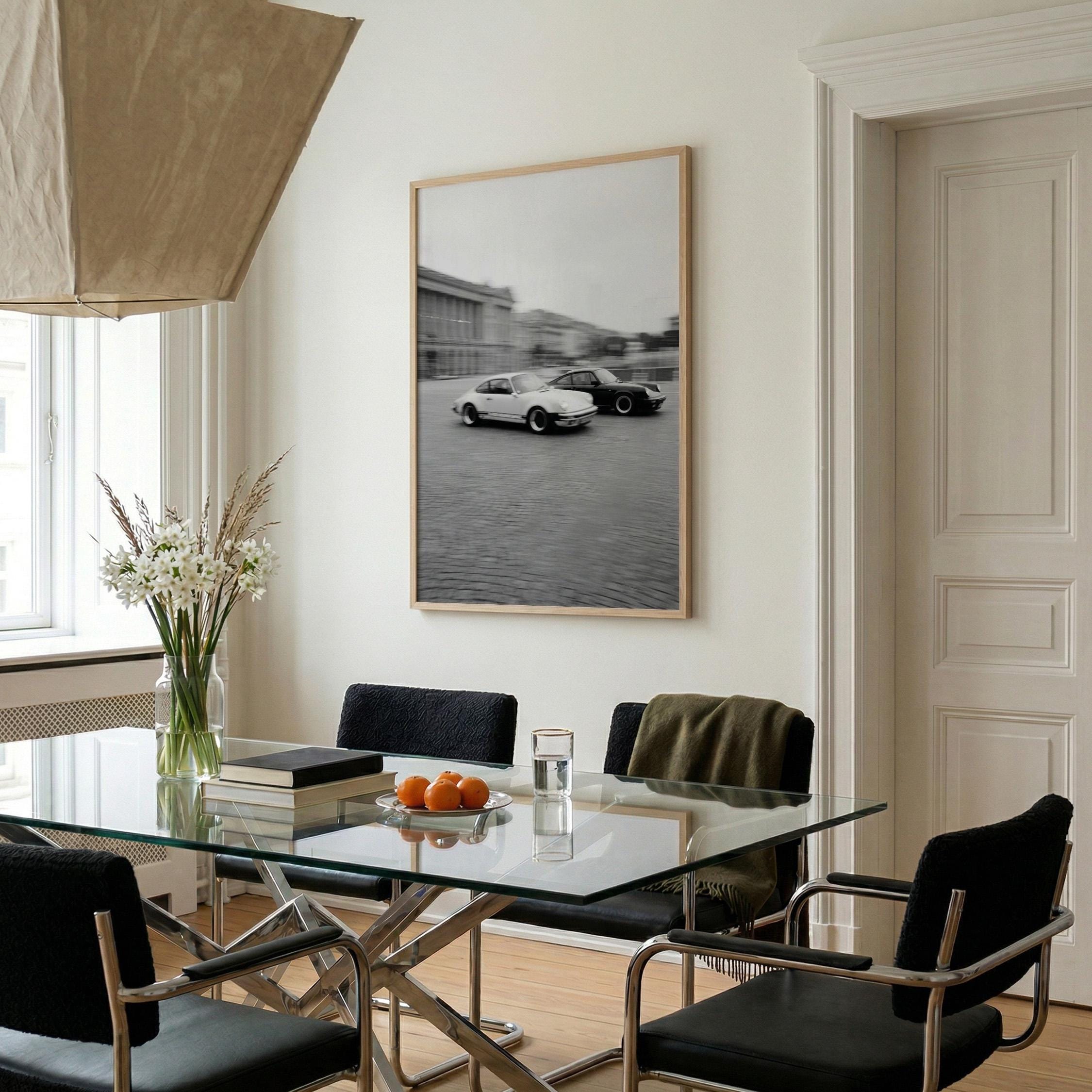Porsche 911 wall art print with a vintage Carrera feel and clean black and white motion. Perfect for an office, garage, studio, or for anyone who loves classic cars and timeless design.