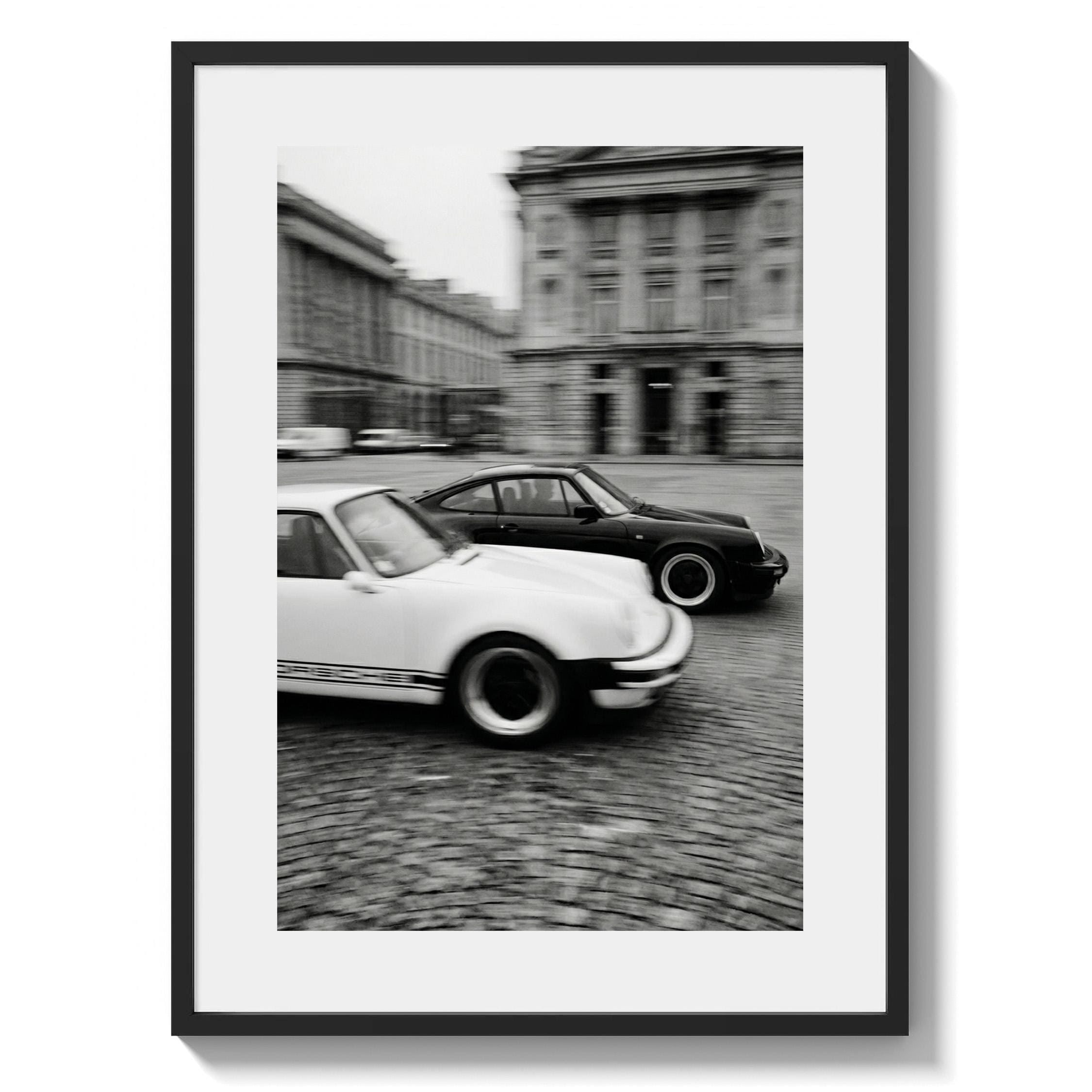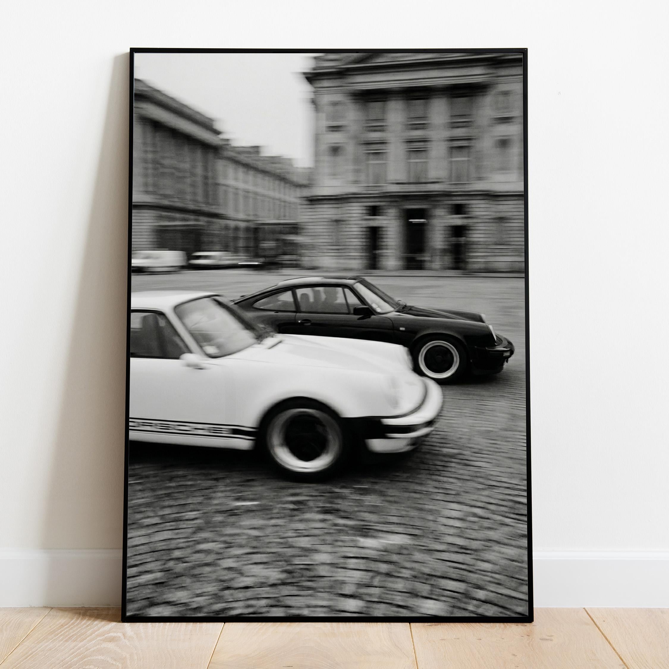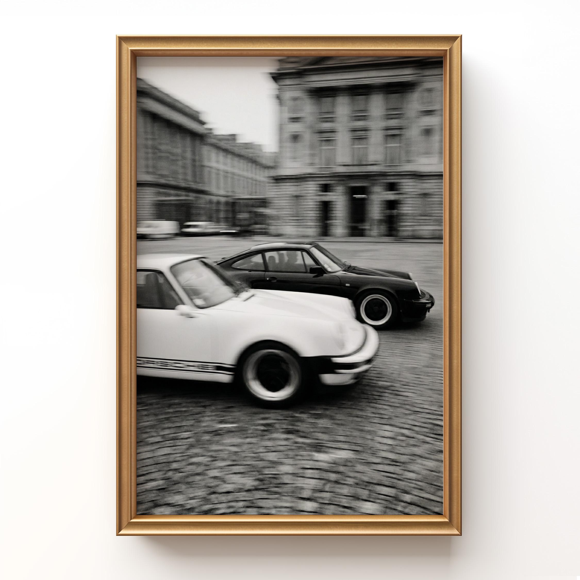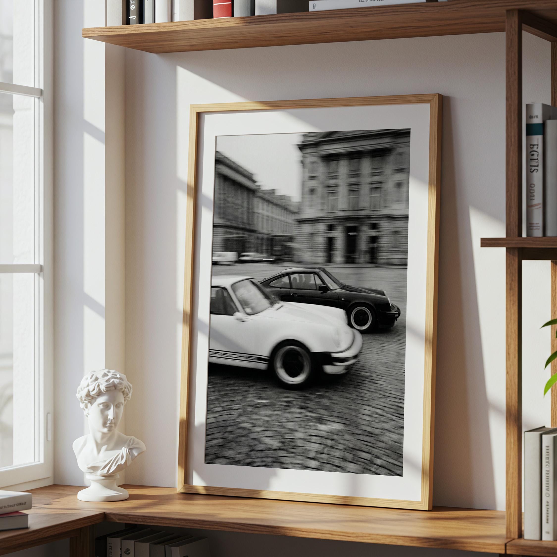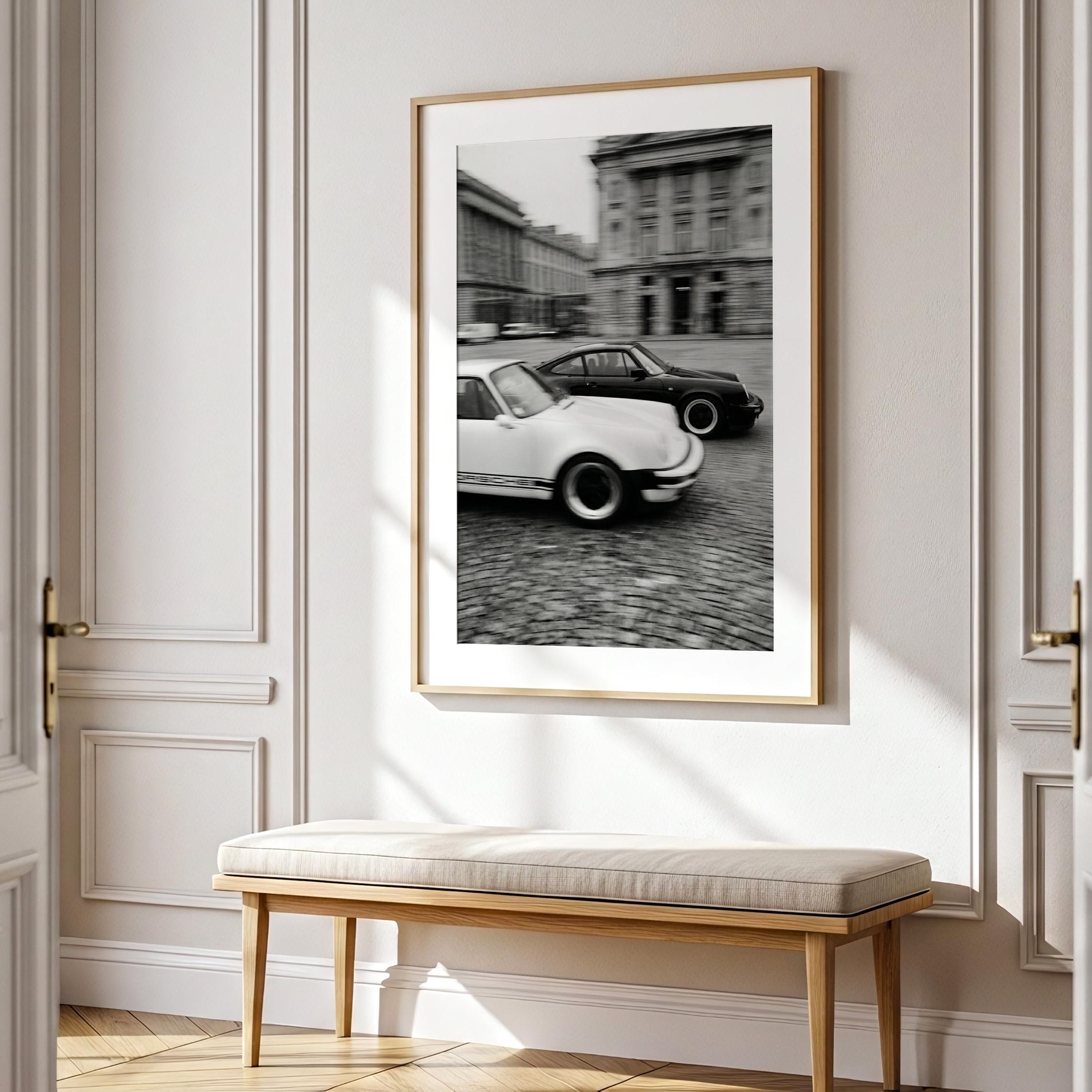 Porsche 911 wall art print captured in Paris with a clean black and white vintage look. Perfect for an office, garage, studio, or for anyone who loves classic cars, French city scenes, and timeless photography.
