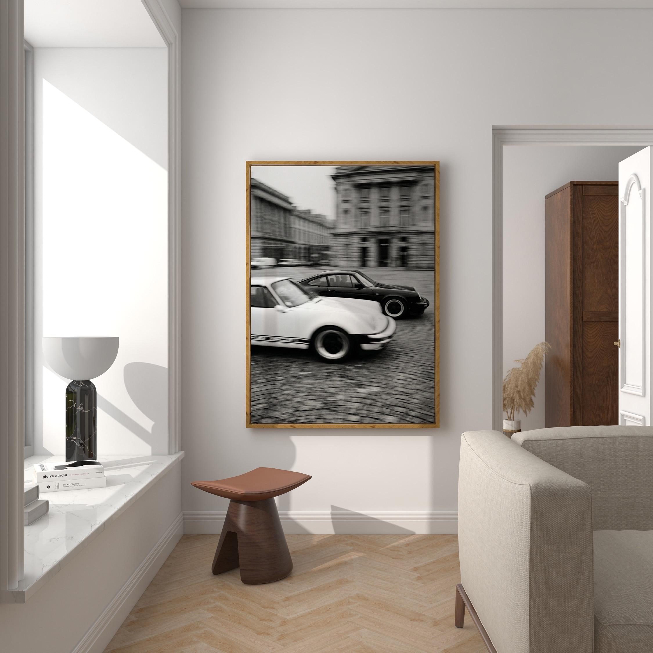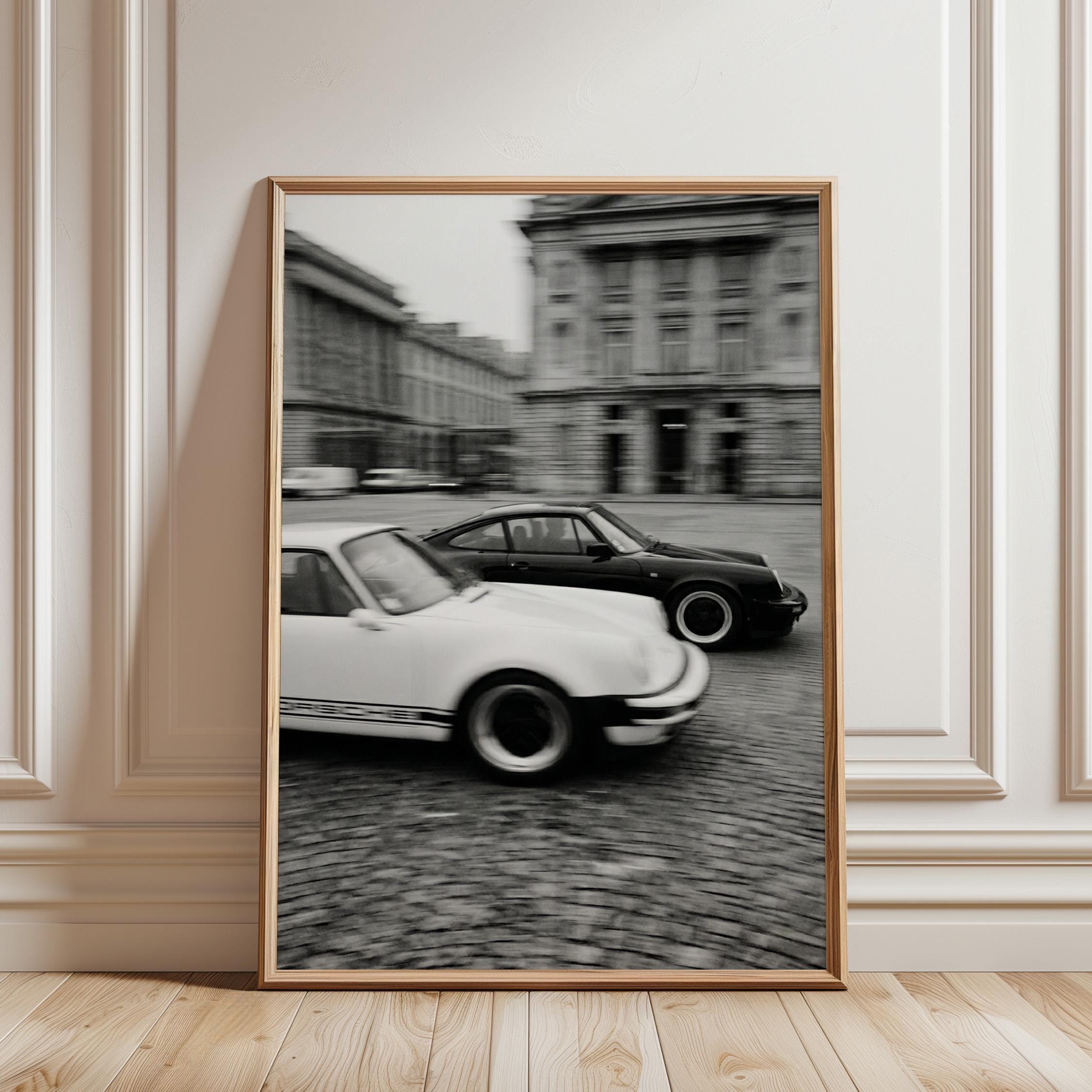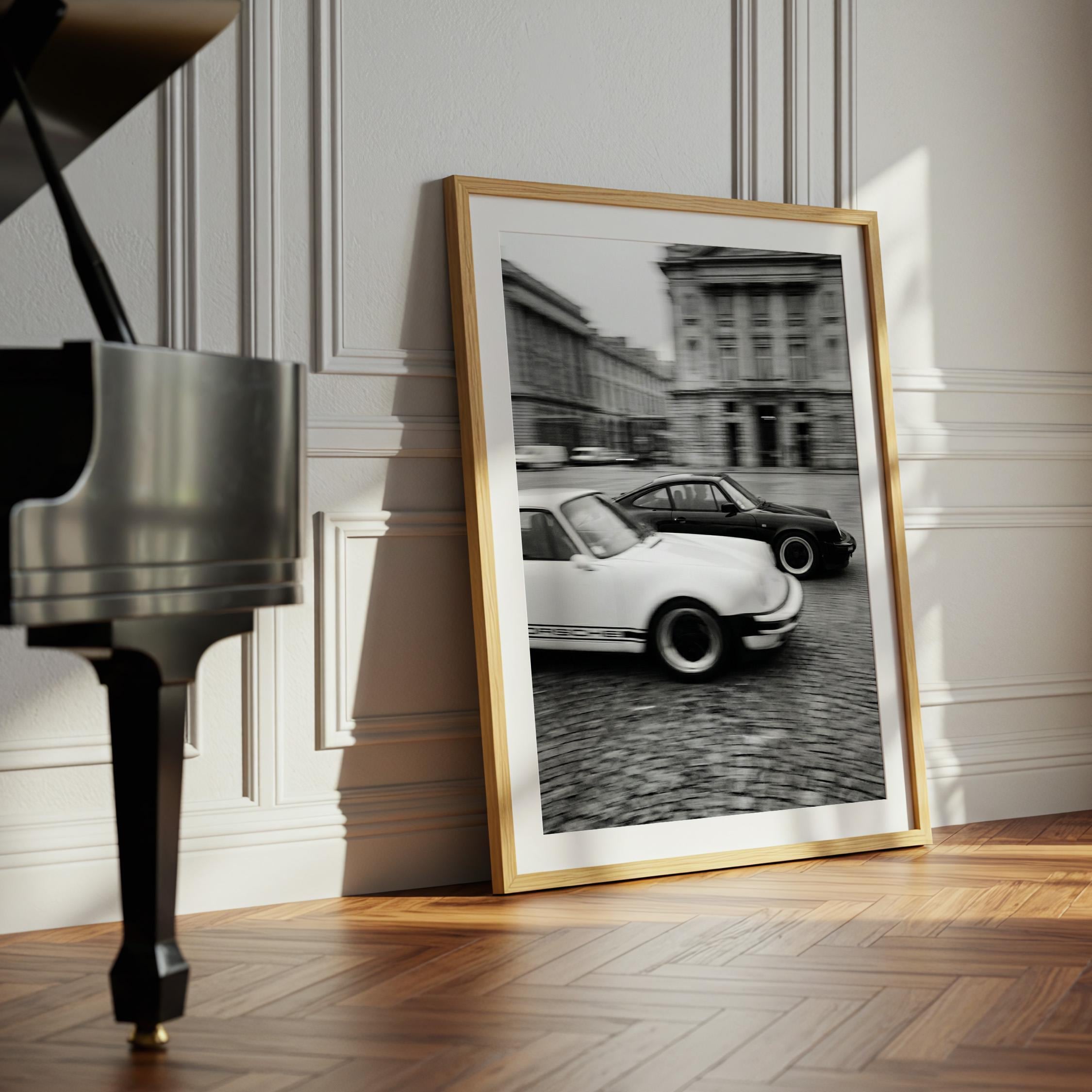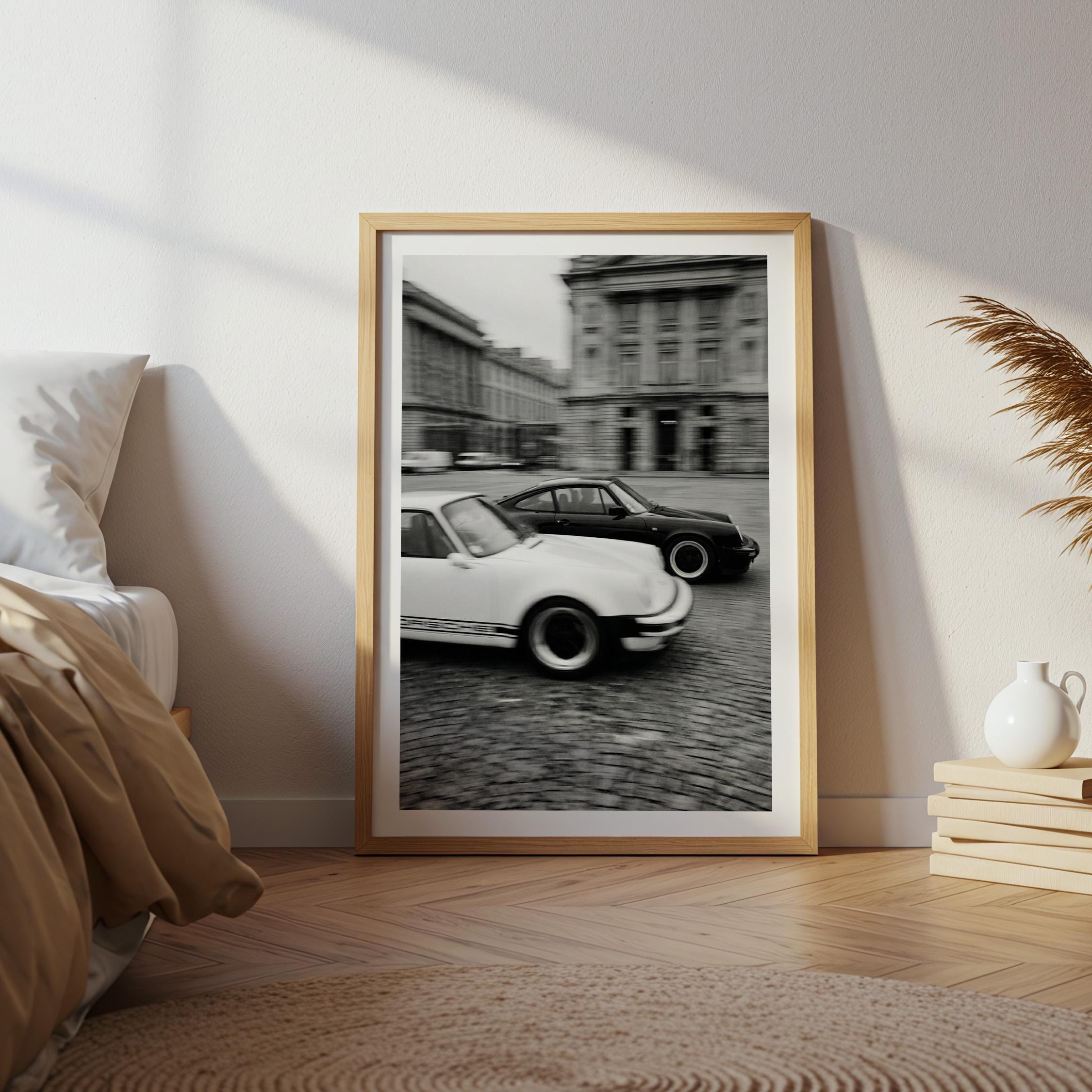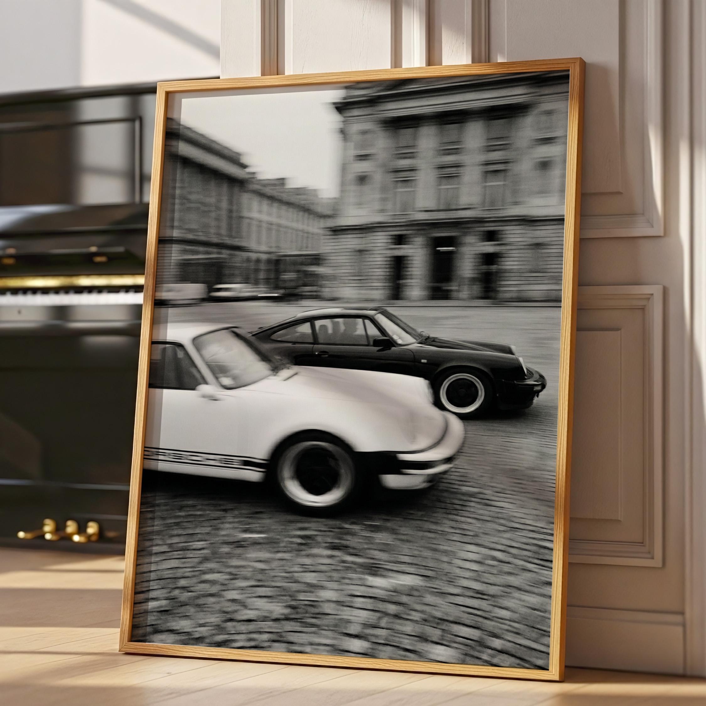 Porsche 911 wall art print captured in Paris with a clean black and white vintage look. Perfect for an office, garage, studio, or for anyone who loves classic cars, French city scenes, and timeless photography.