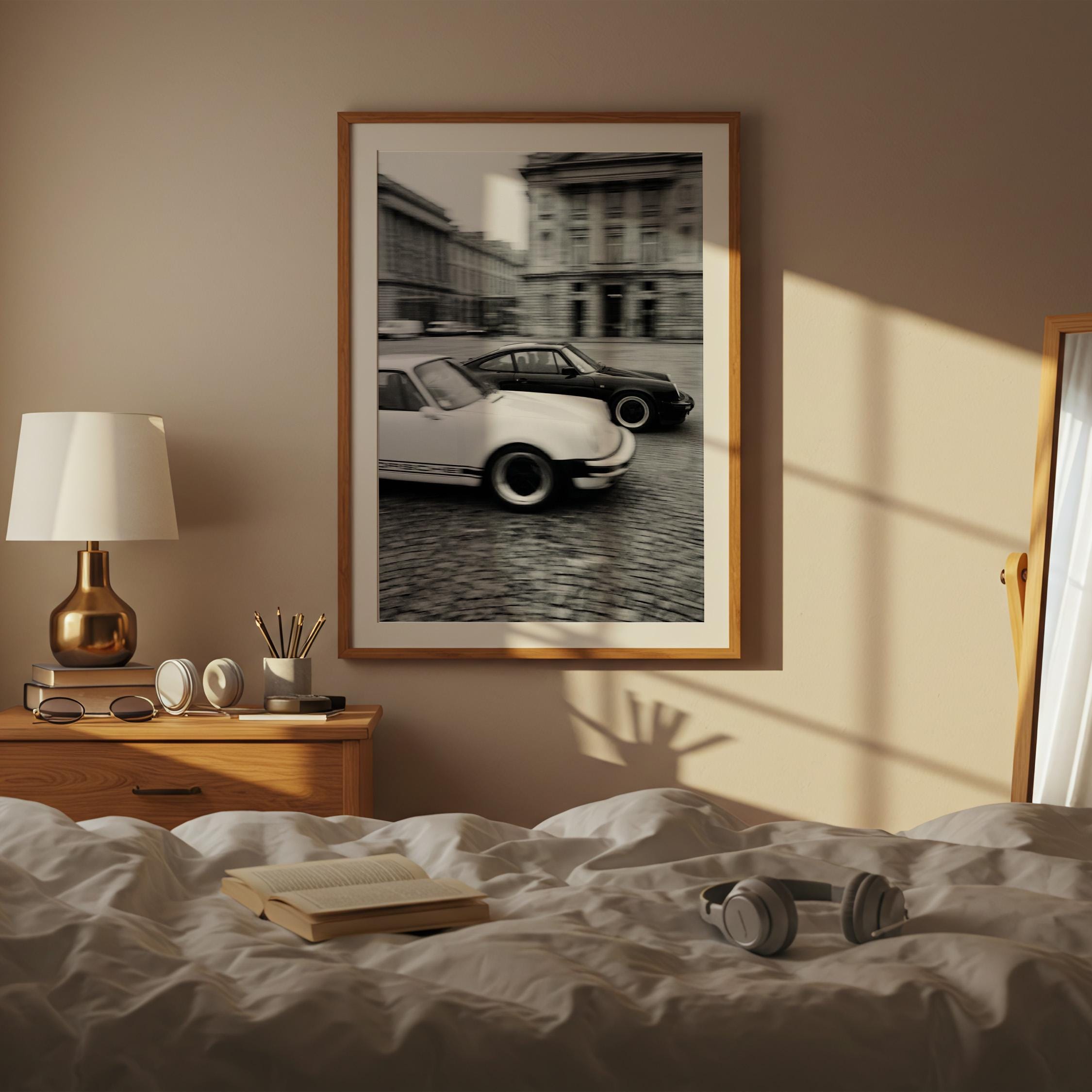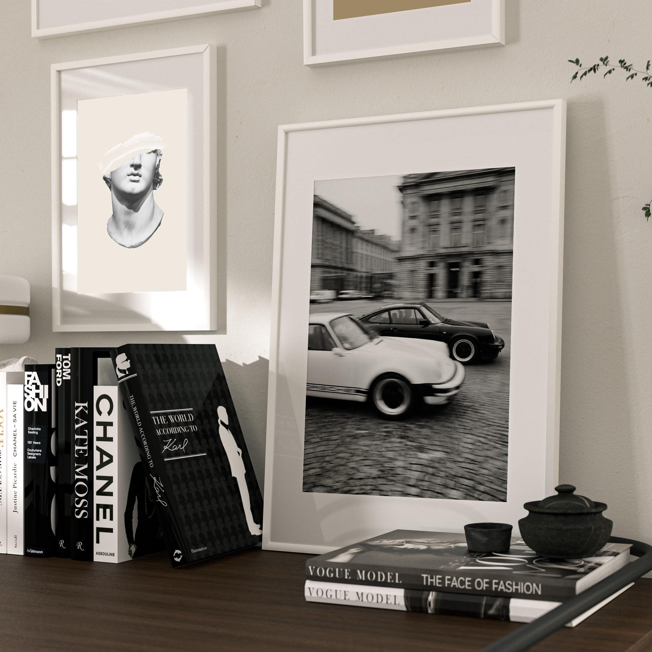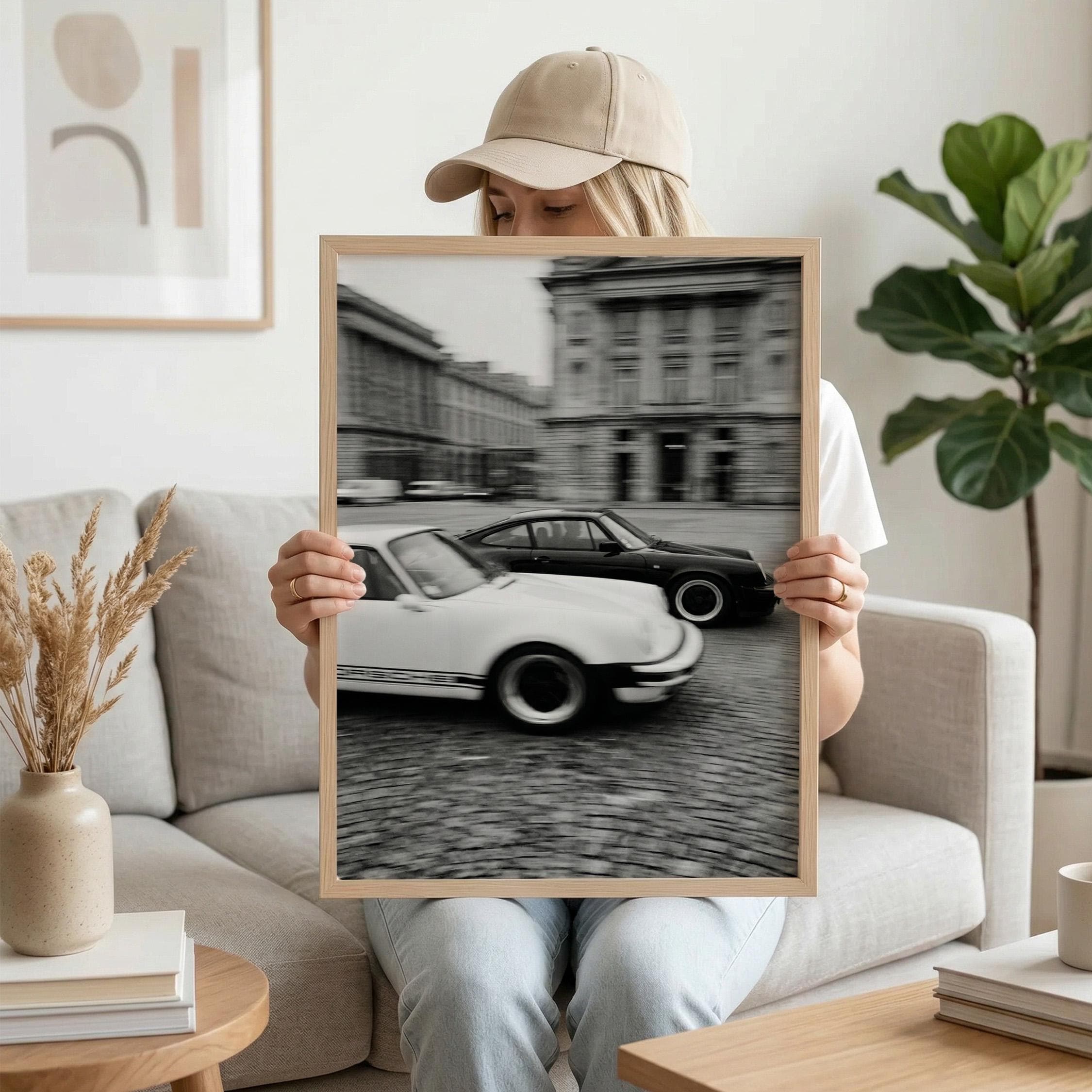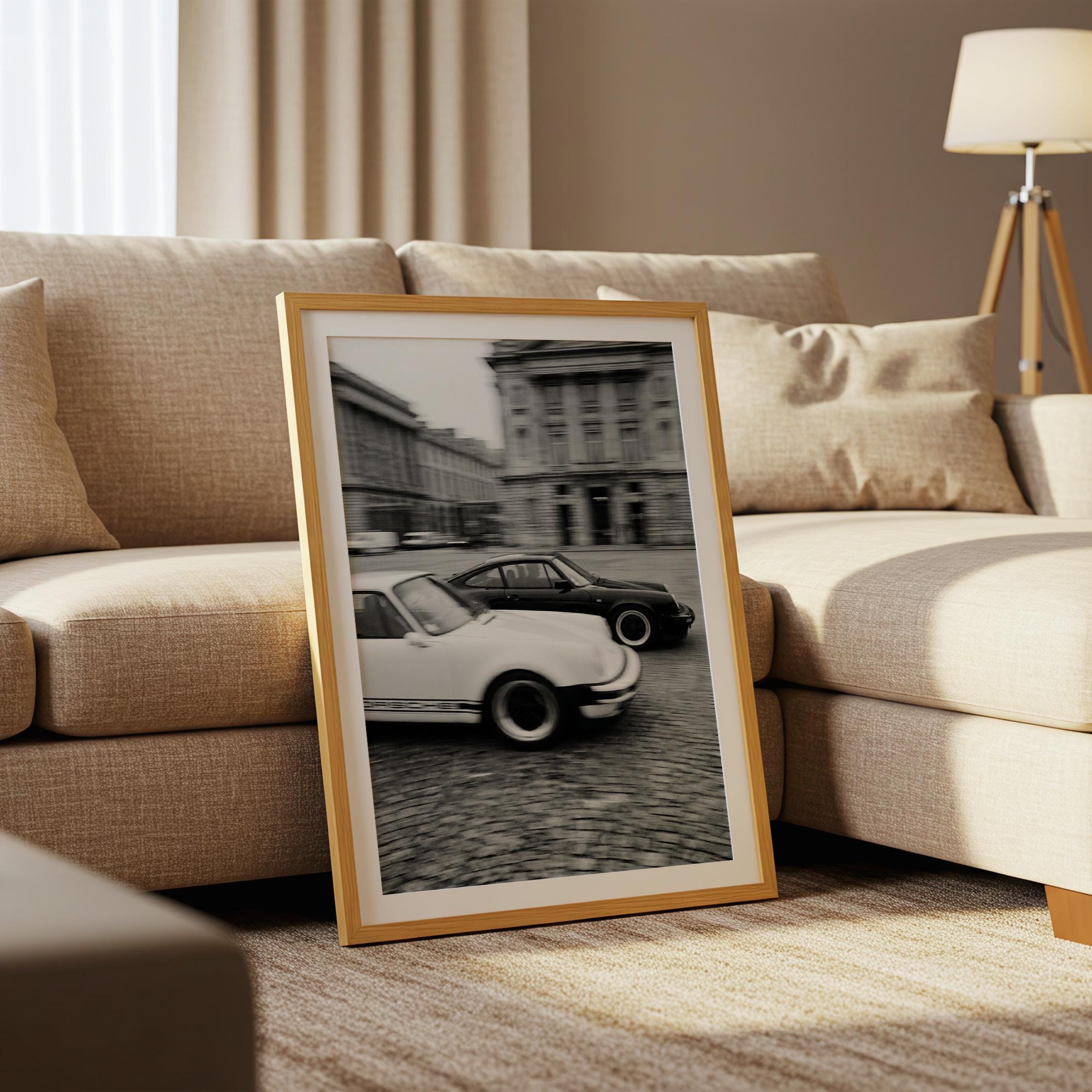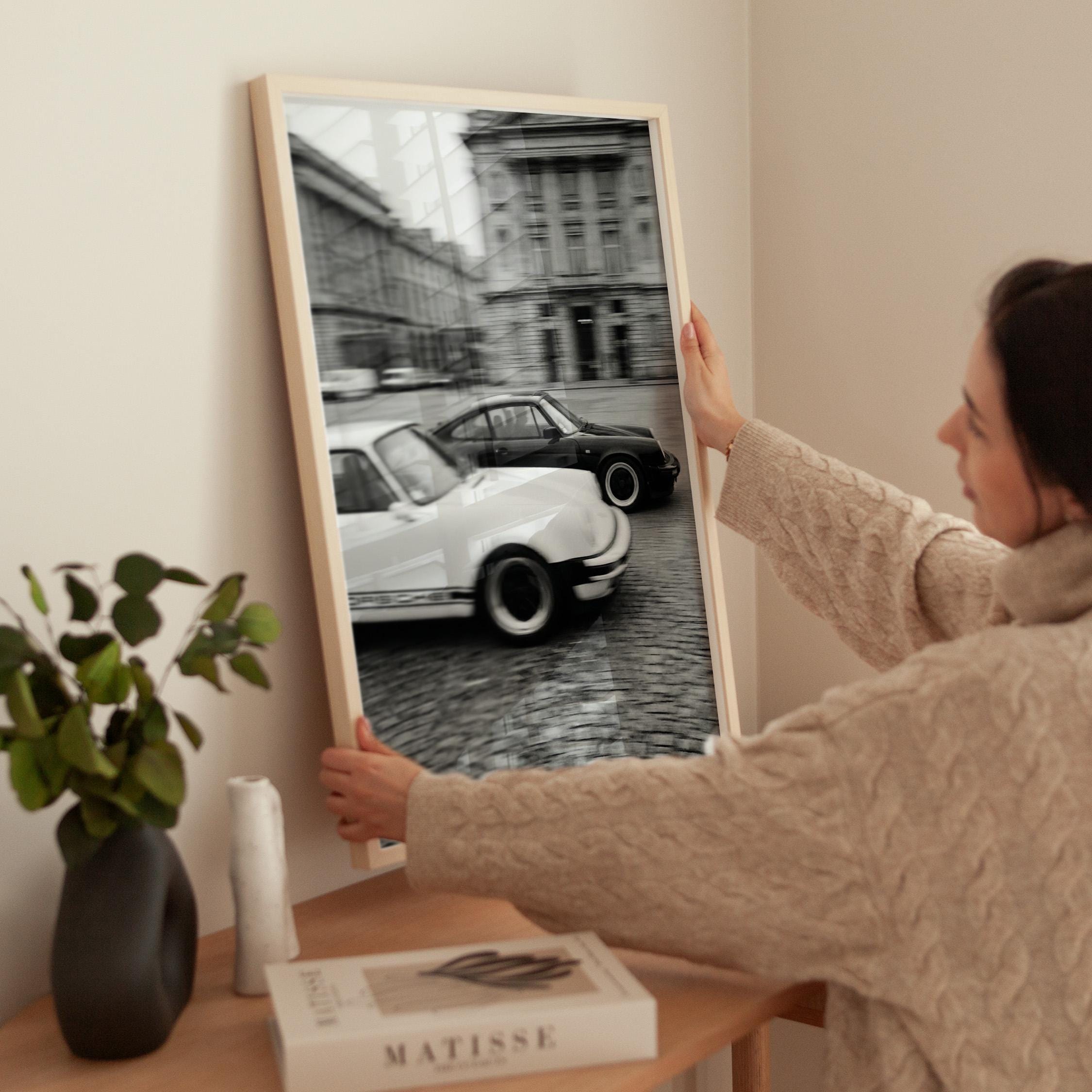 Porsche 911 wall art print captured in Paris with a clean black and white vintage look. Perfect for an office, garage, studio, or for anyone who loves classic cars, French city scenes, and timeless photography.