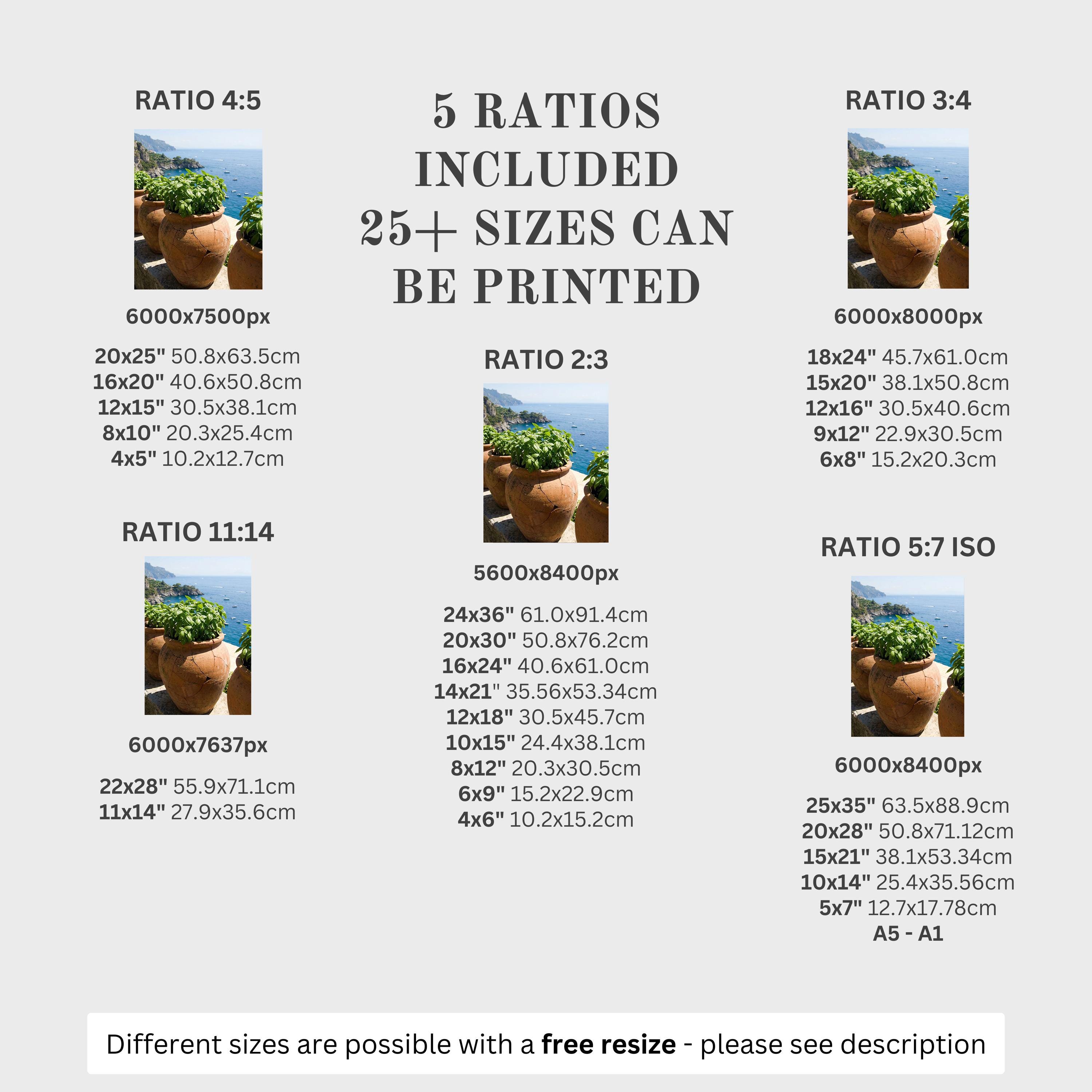 5 HIGH-QUALITY 300 DPI JPGs sized to fit +25 different frames in size and diverse ratios: