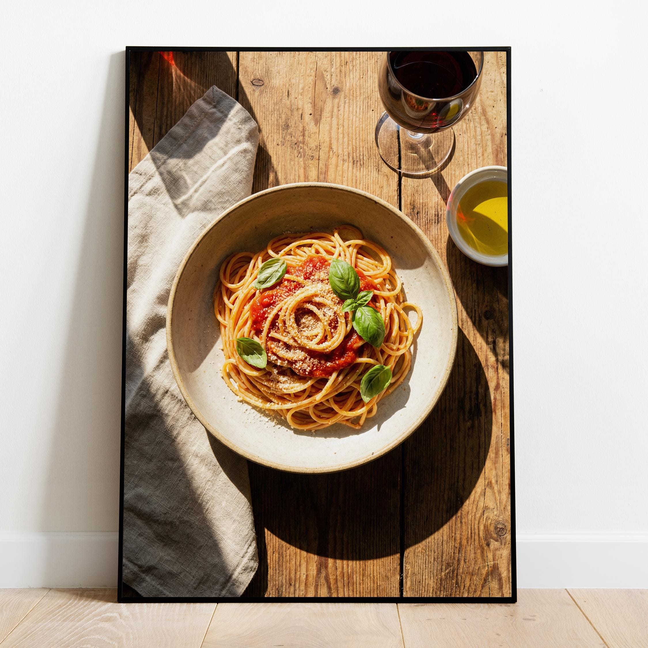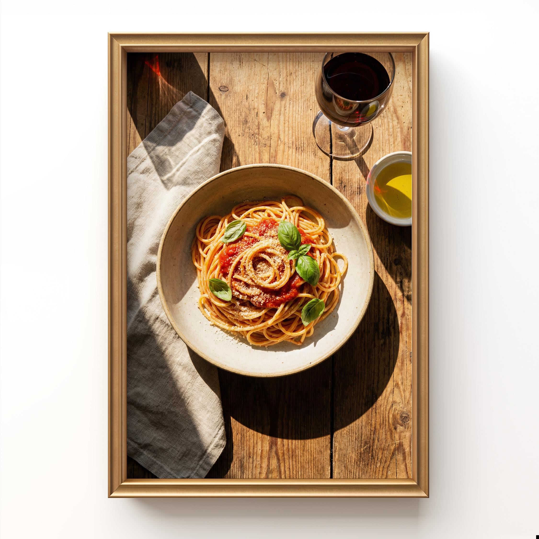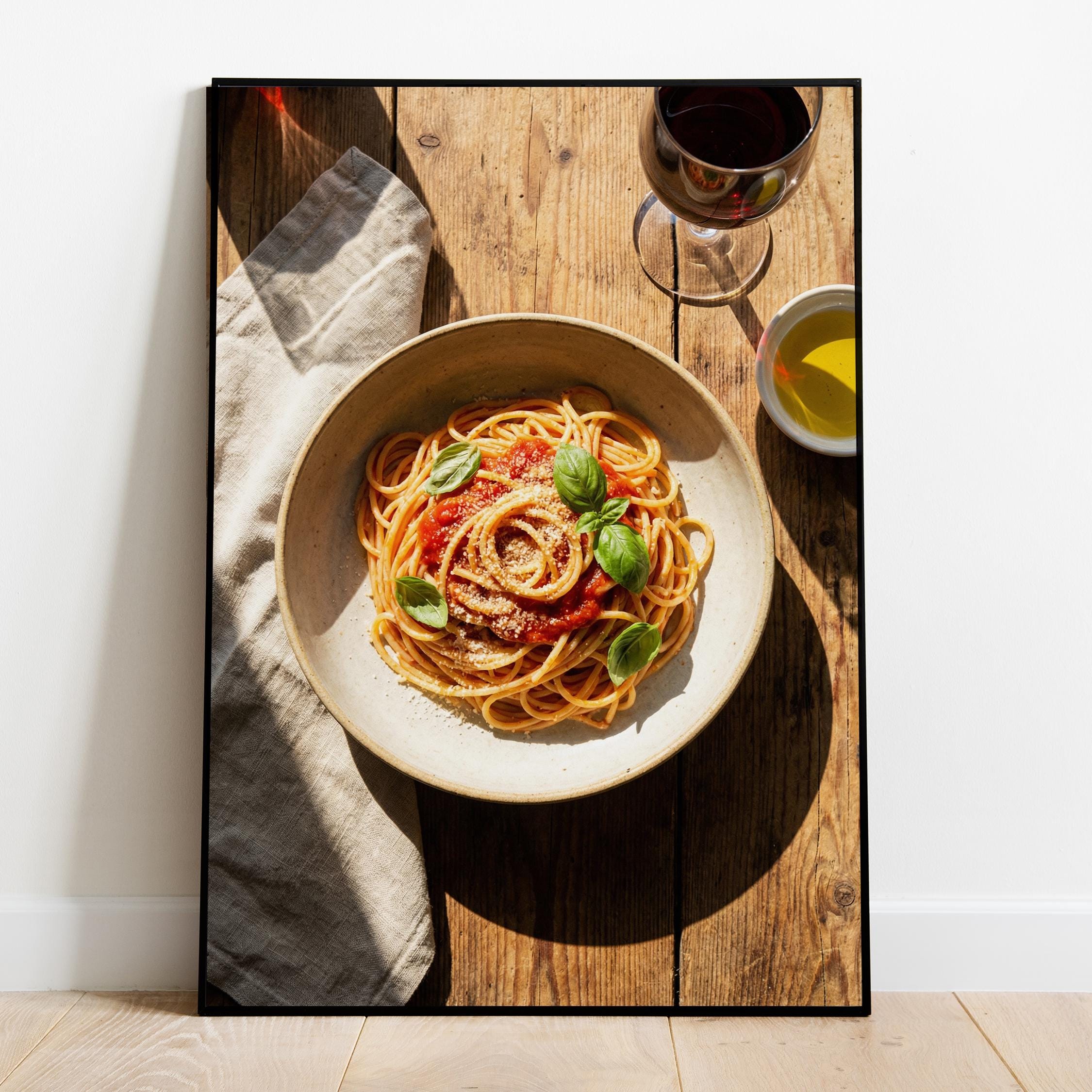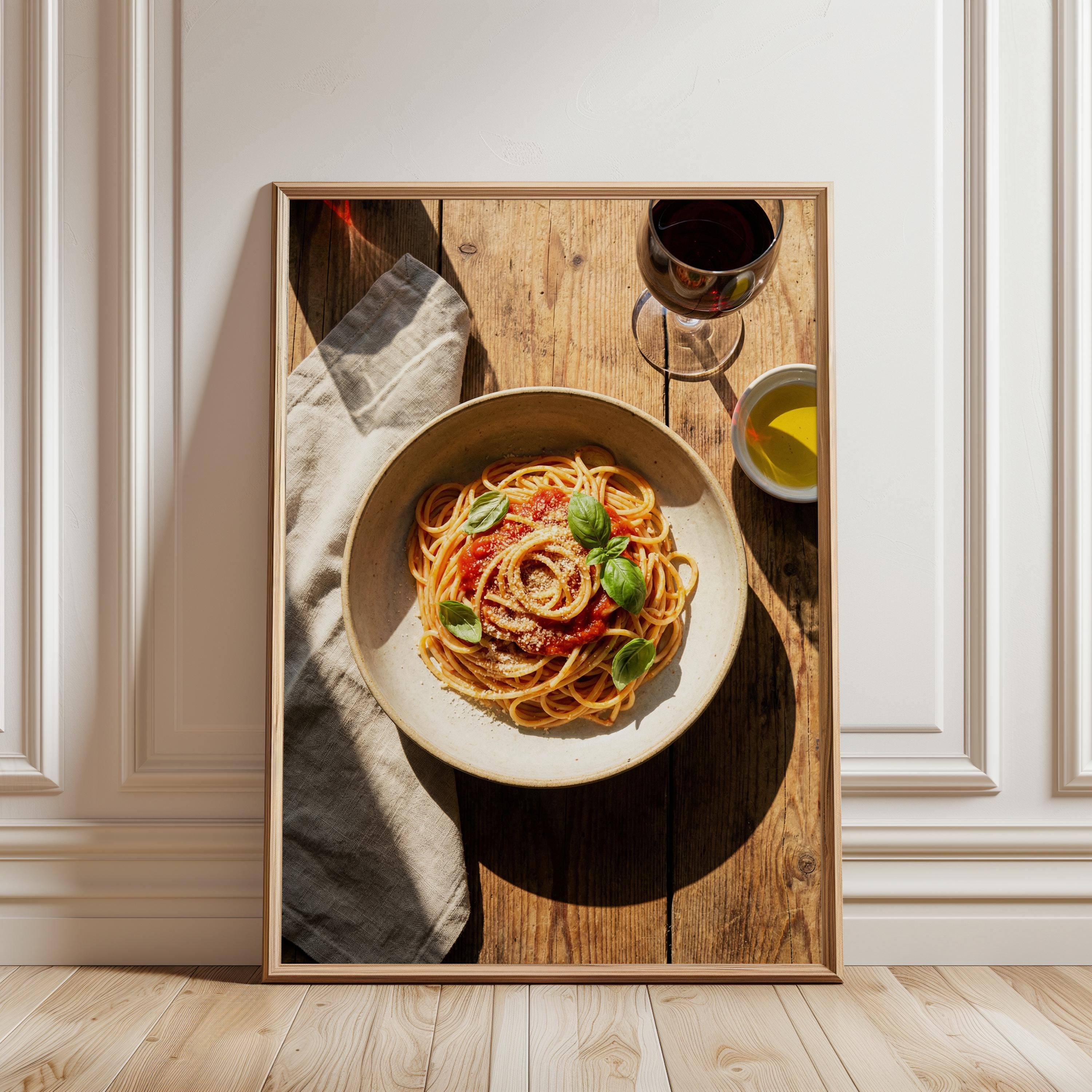 warm earth tones with vibrant greens a rustic bowl of spaghetti topped with fresh basil, perfect for your kitchen or dining area and a great gift for a housewarming gift or culinary celebration digital wall art
