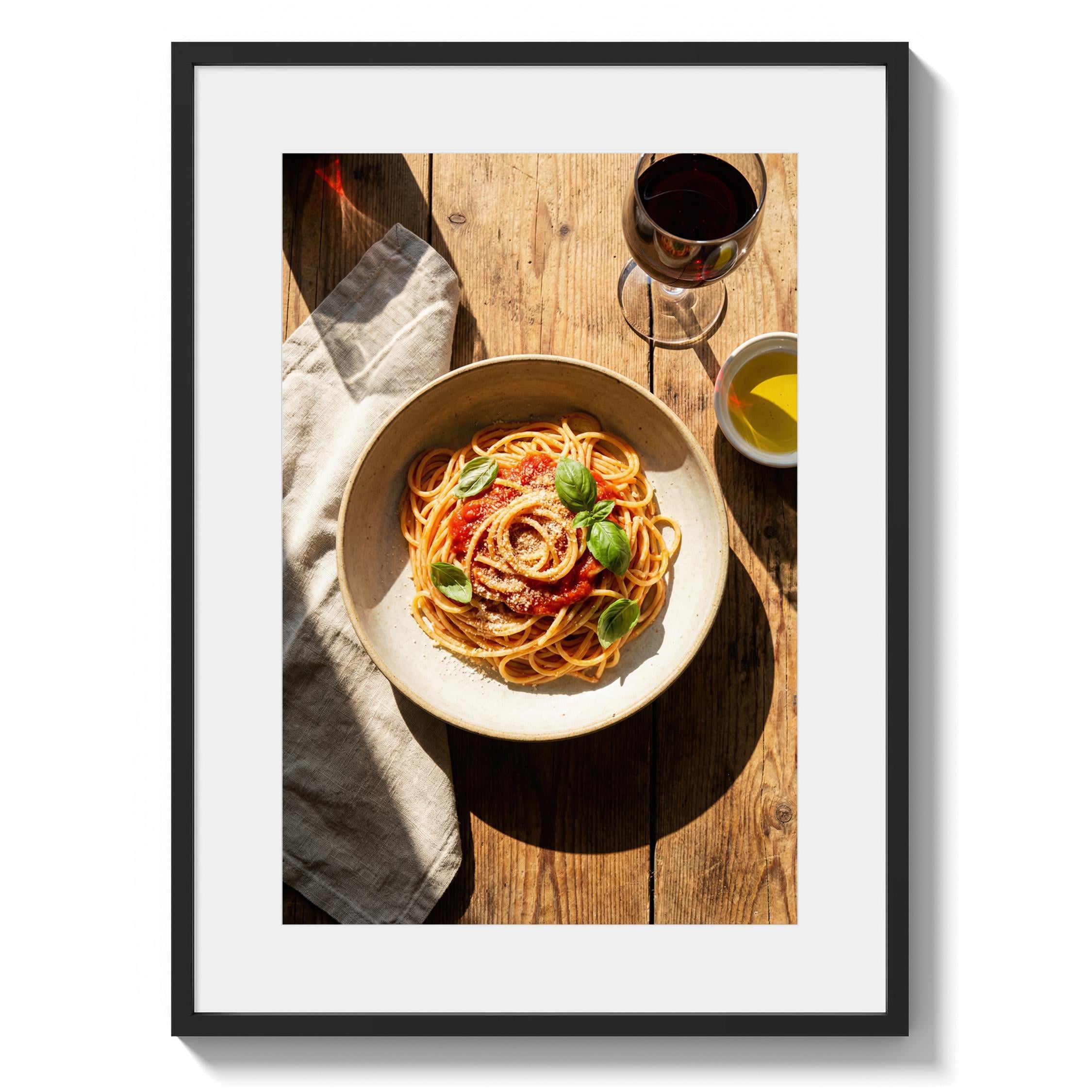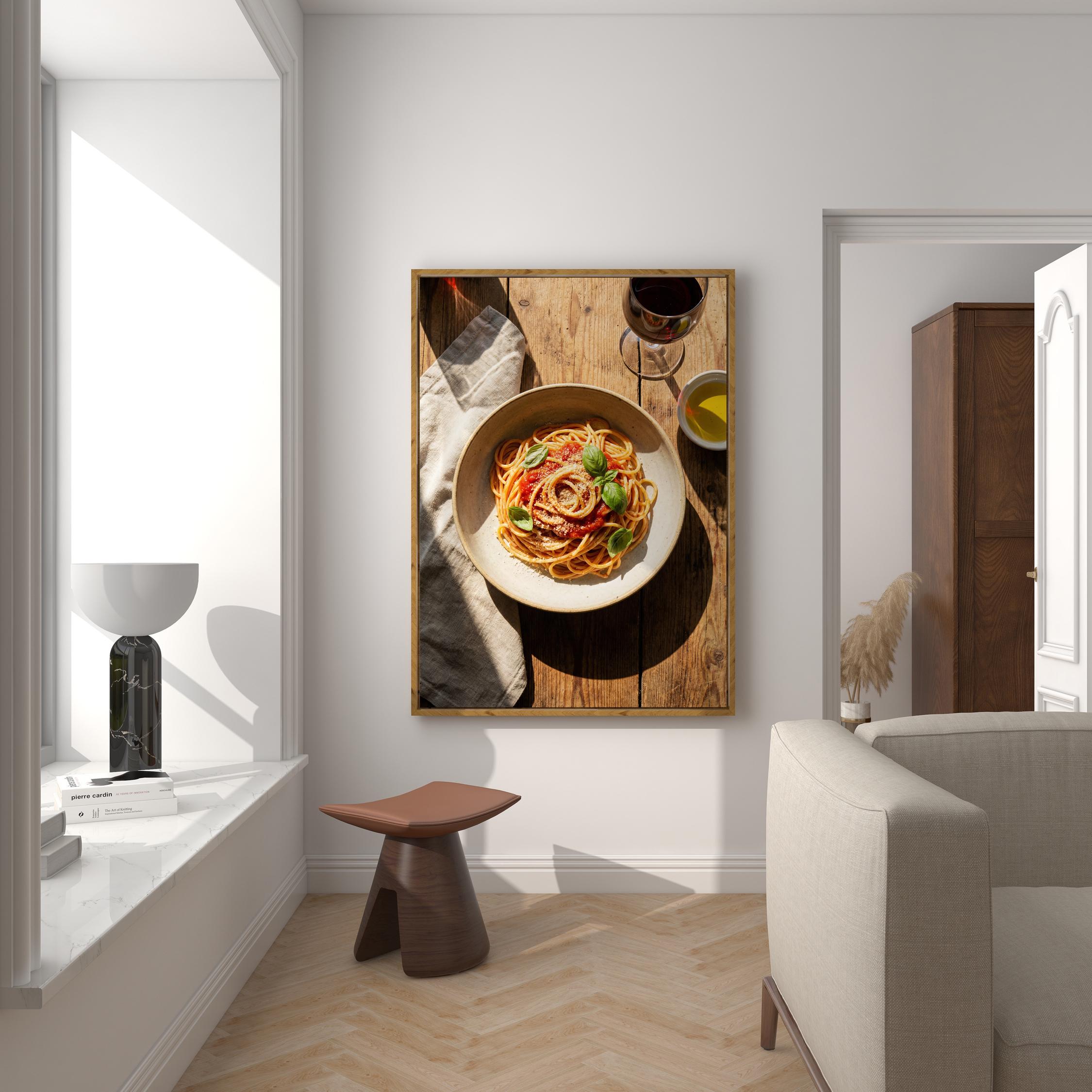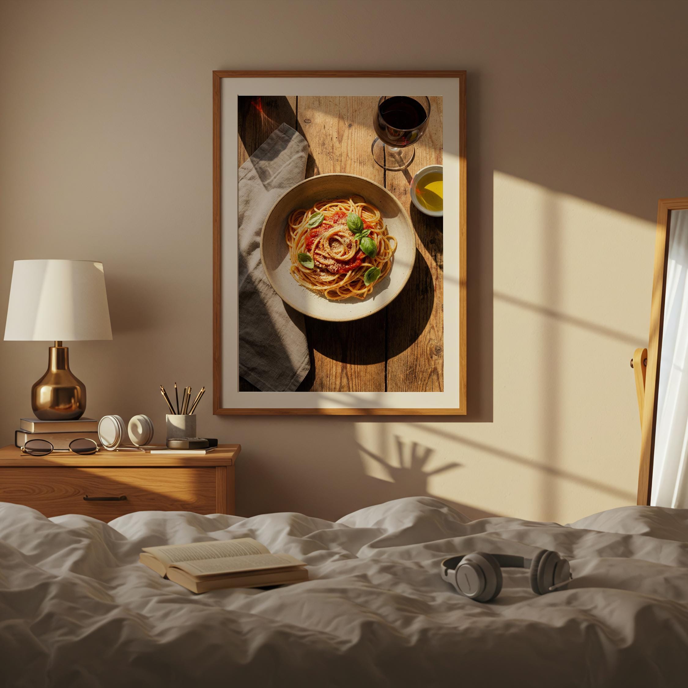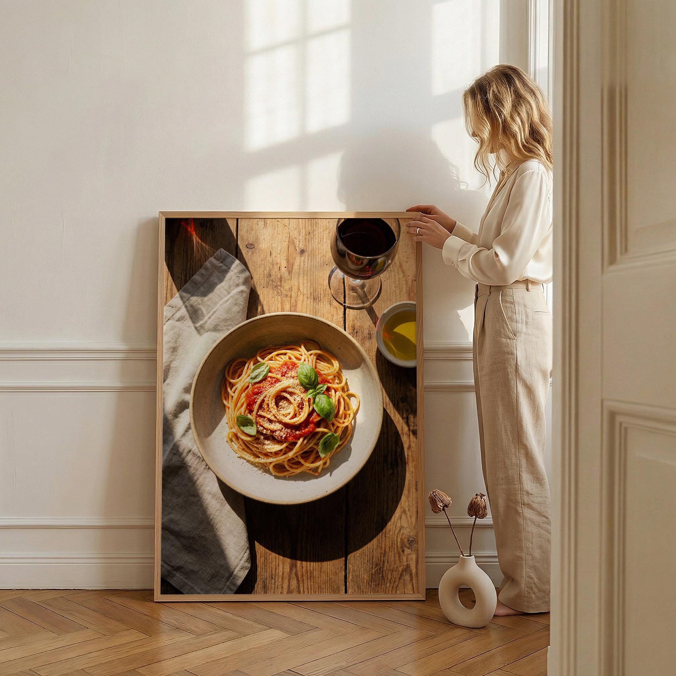 warm earth tones with vibrant greens a rustic bowl of spaghetti topped with fresh basil, perfect for your kitchen or dining area and a great gift for a housewarming gift or culinary celebration digital wall art