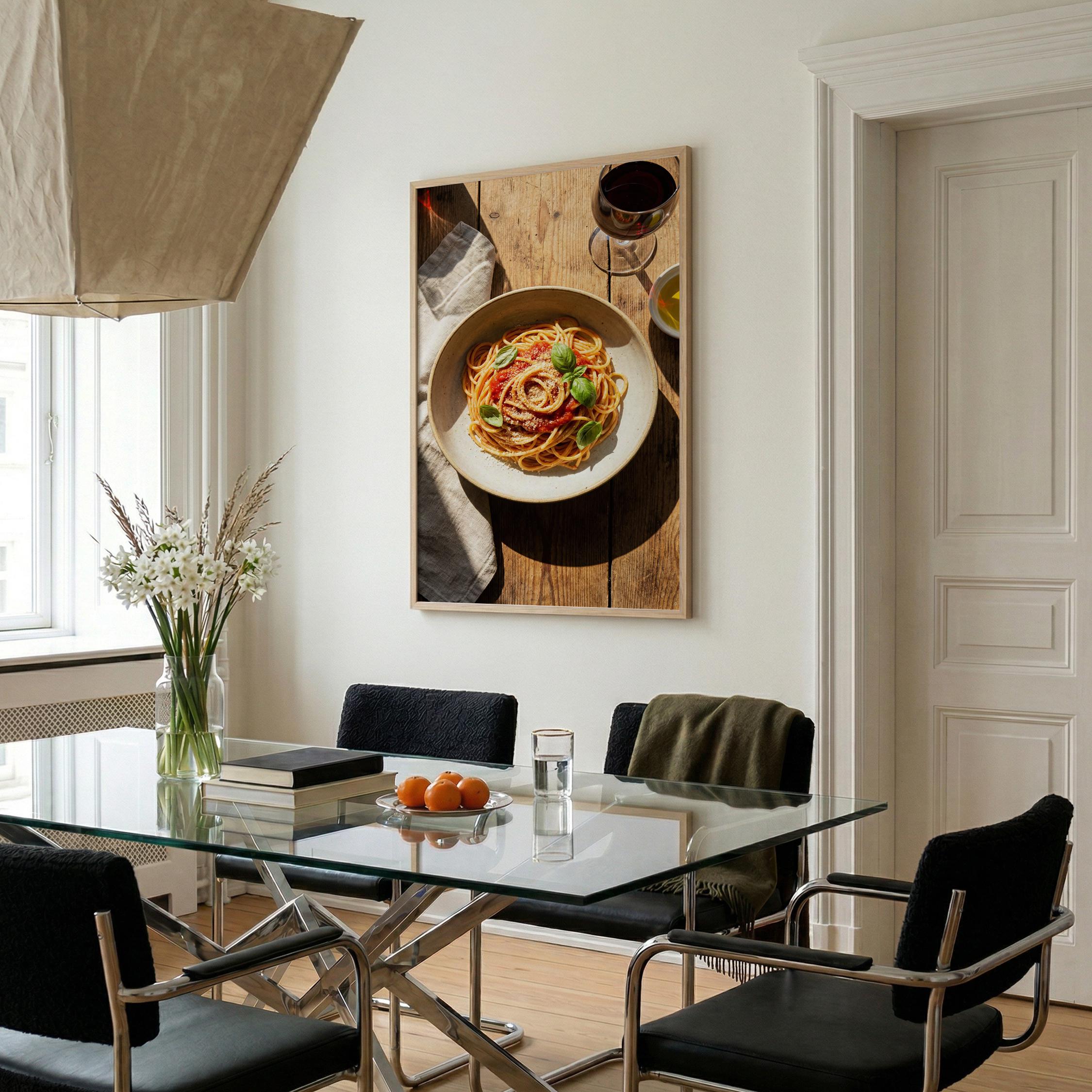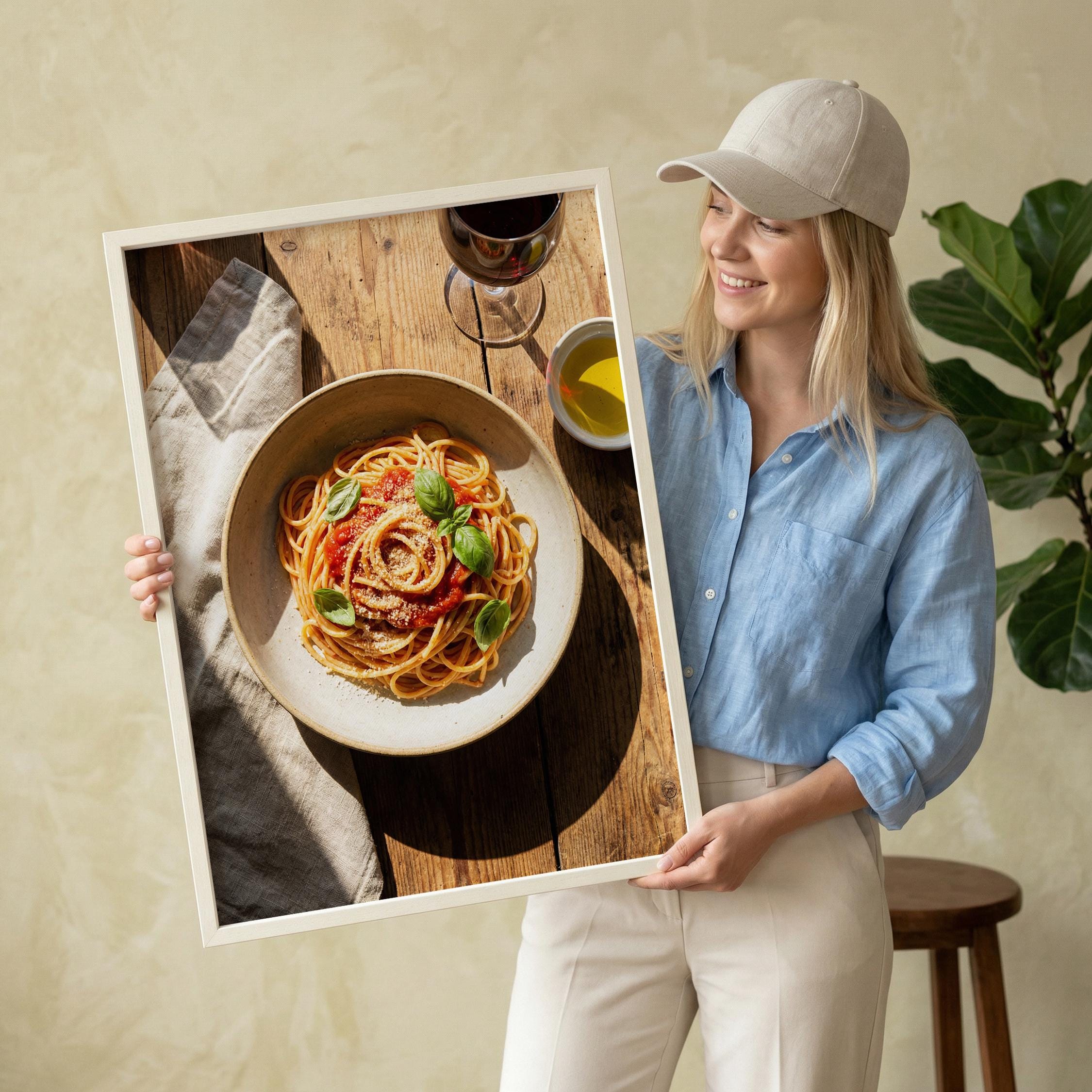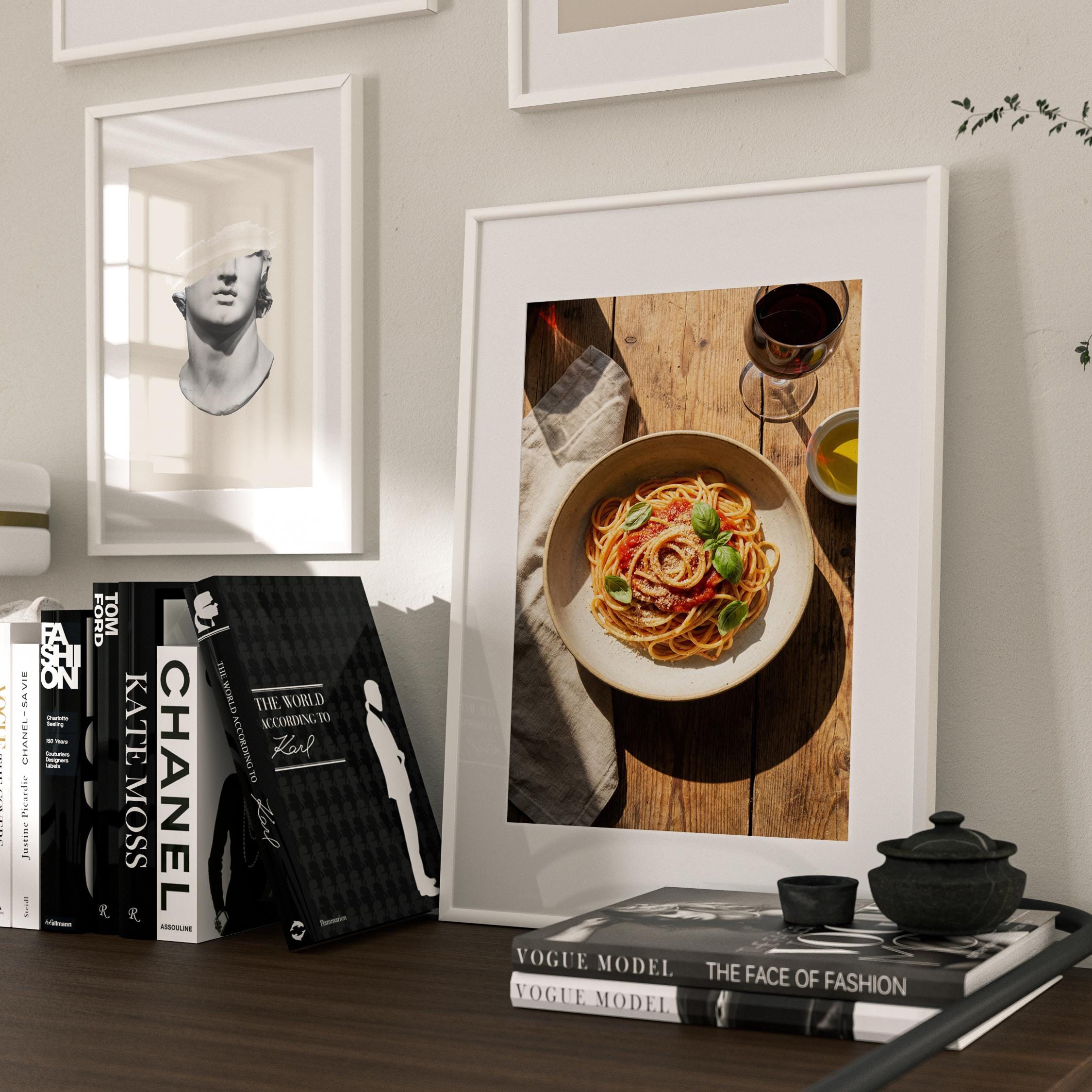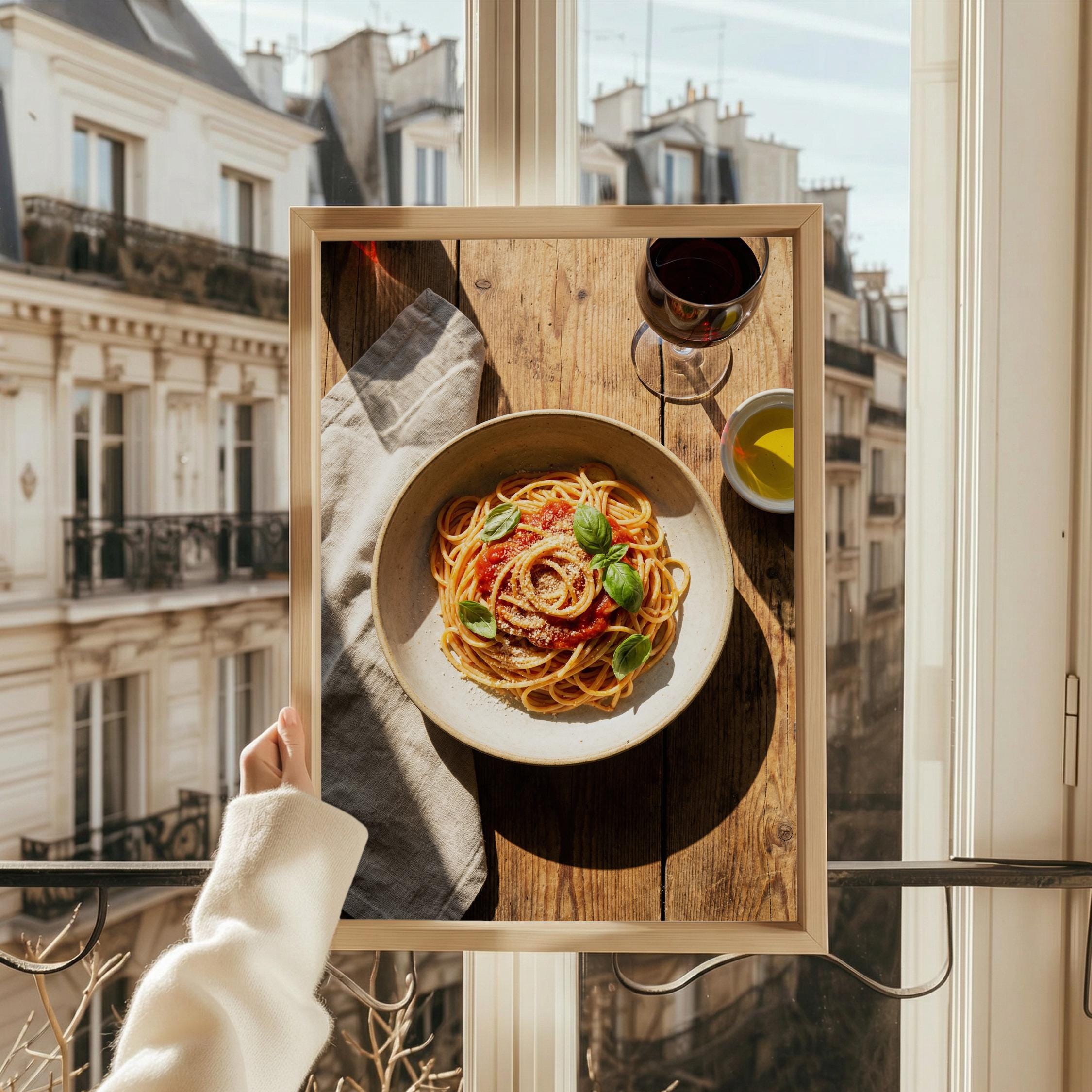 warm earth tones with vibrant greens a rustic bowl of spaghetti topped with fresh basil, perfect for your kitchen or dining area and a great gift for a housewarming gift or culinary celebration digital wall art