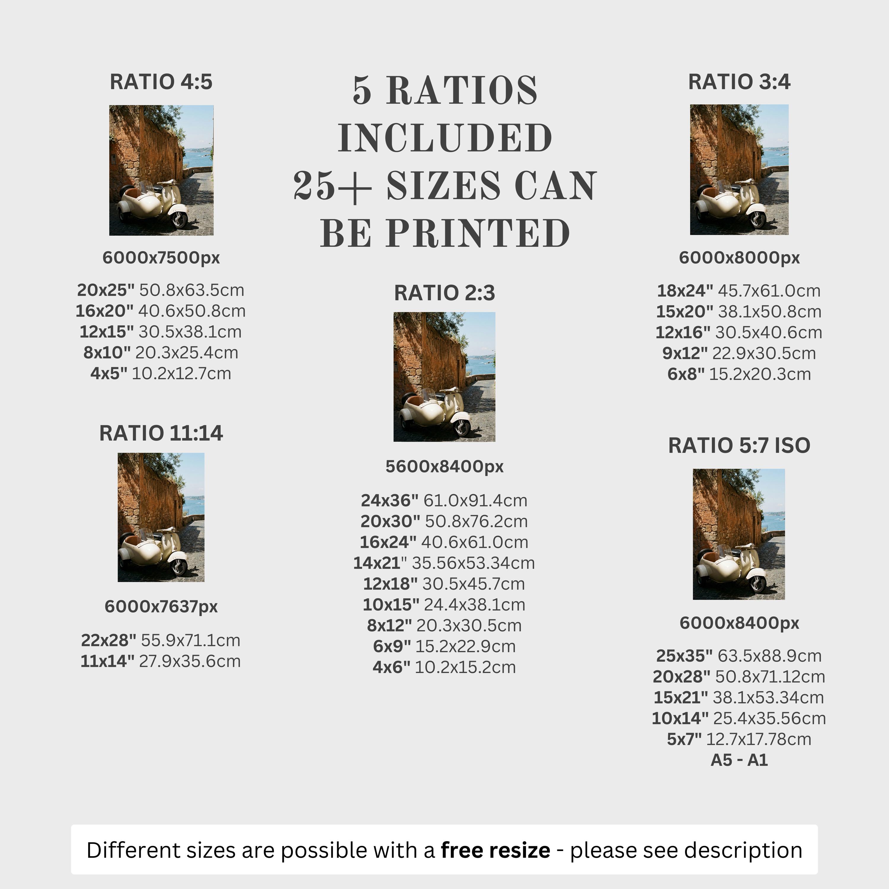 5 HIGH-QUALITY 300 DPI JPGs sized to fit +25 different frames in size and diverse ratios: