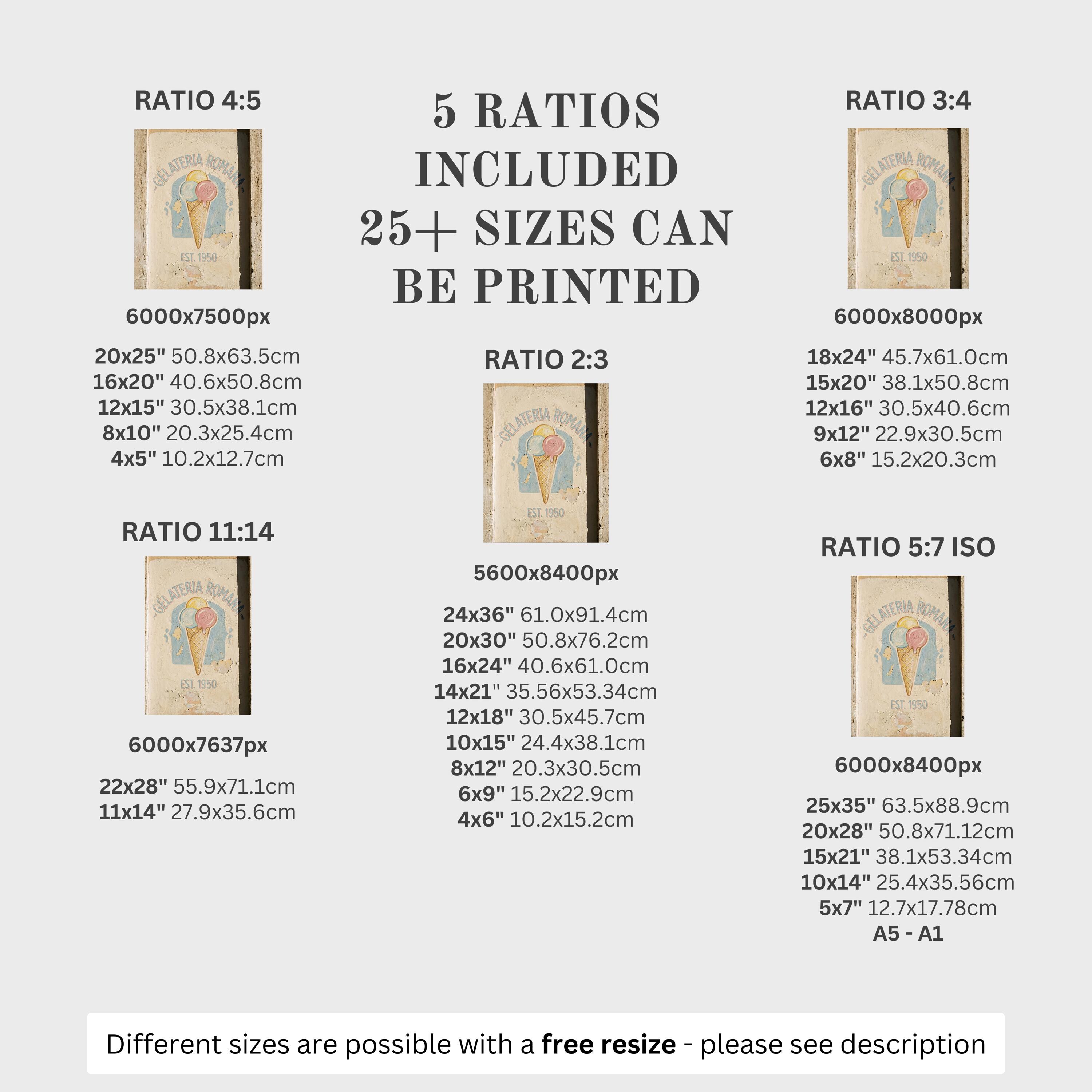 5 HIGH-QUALITY 300 DPI JPGs sized to fit +25 different frames in size and diverse ratios: