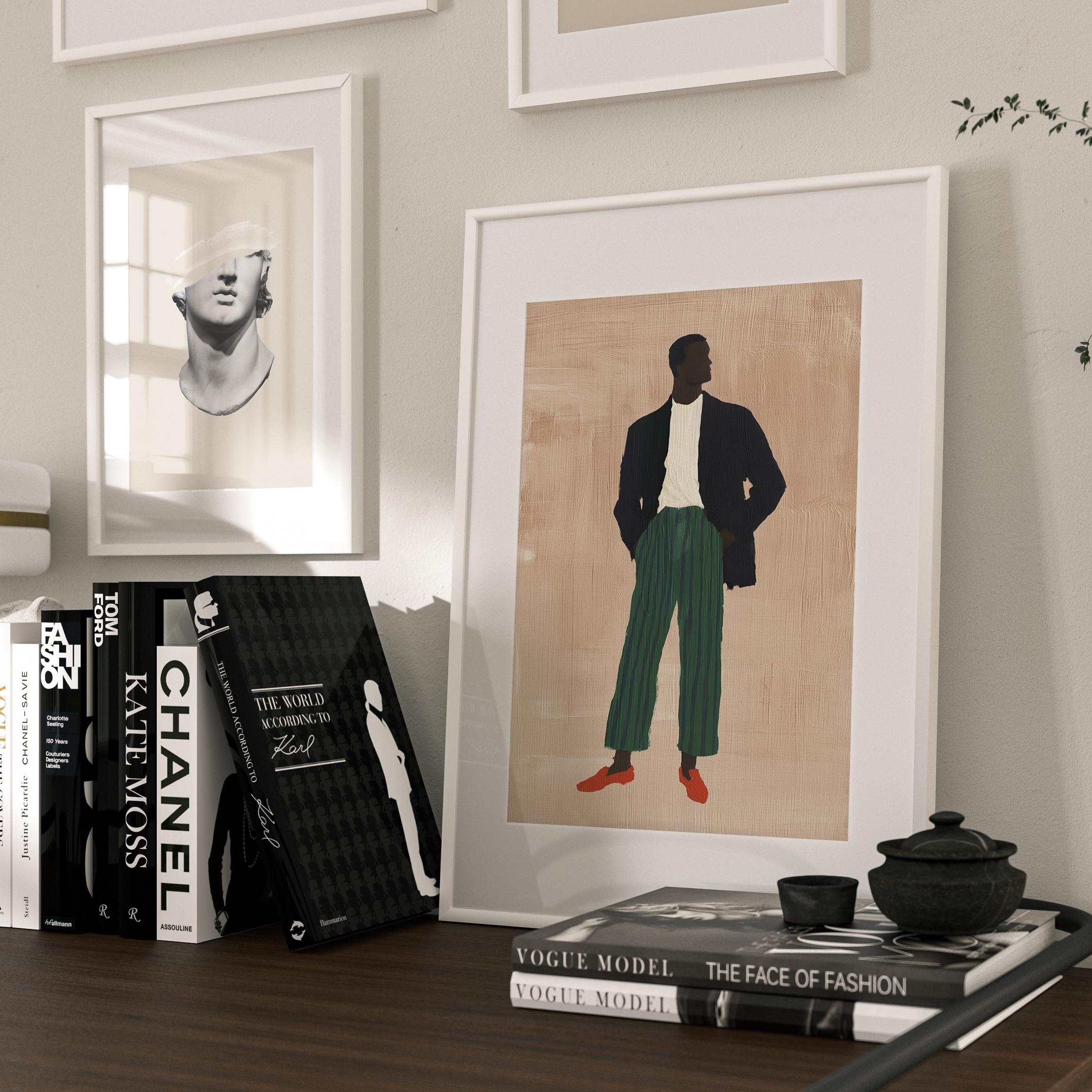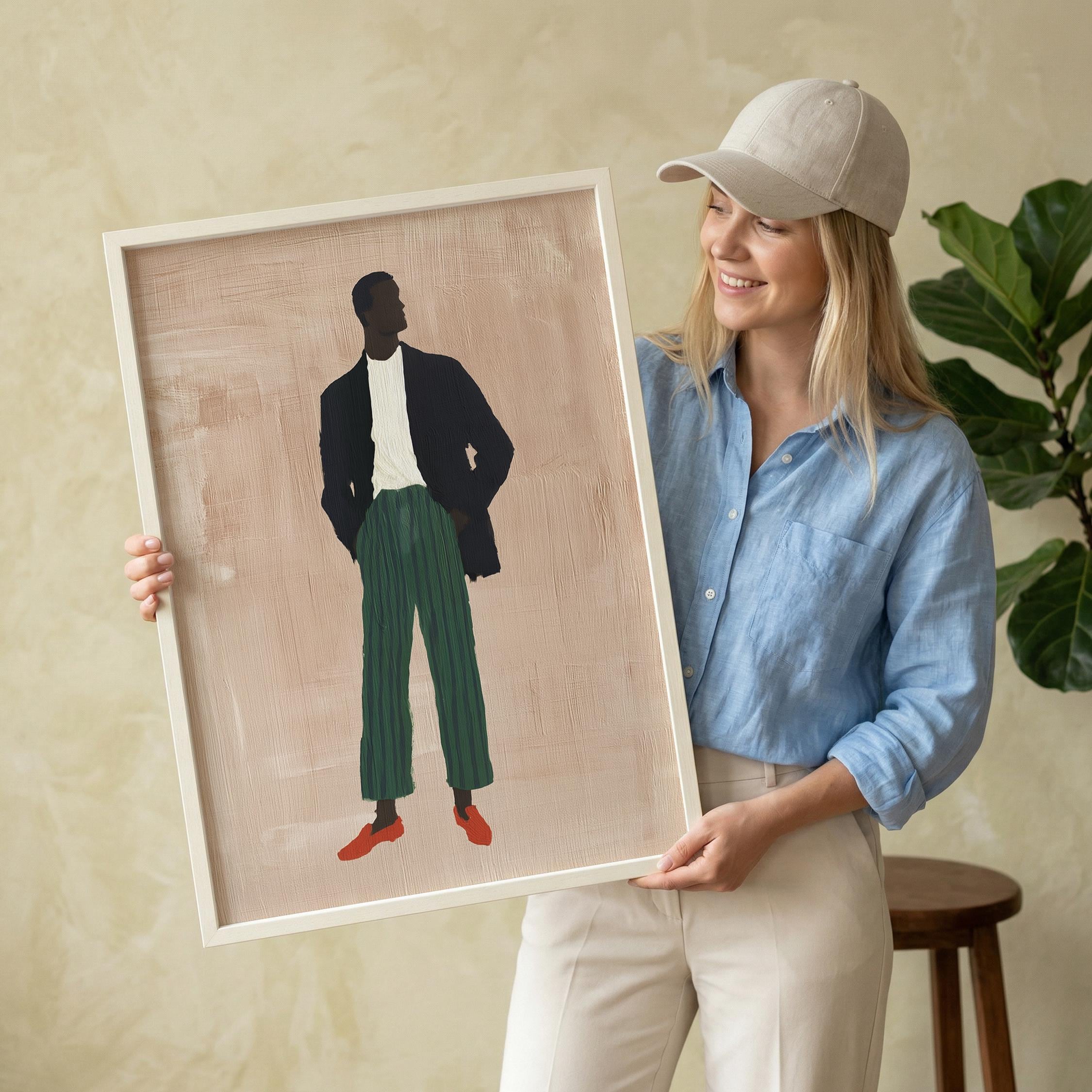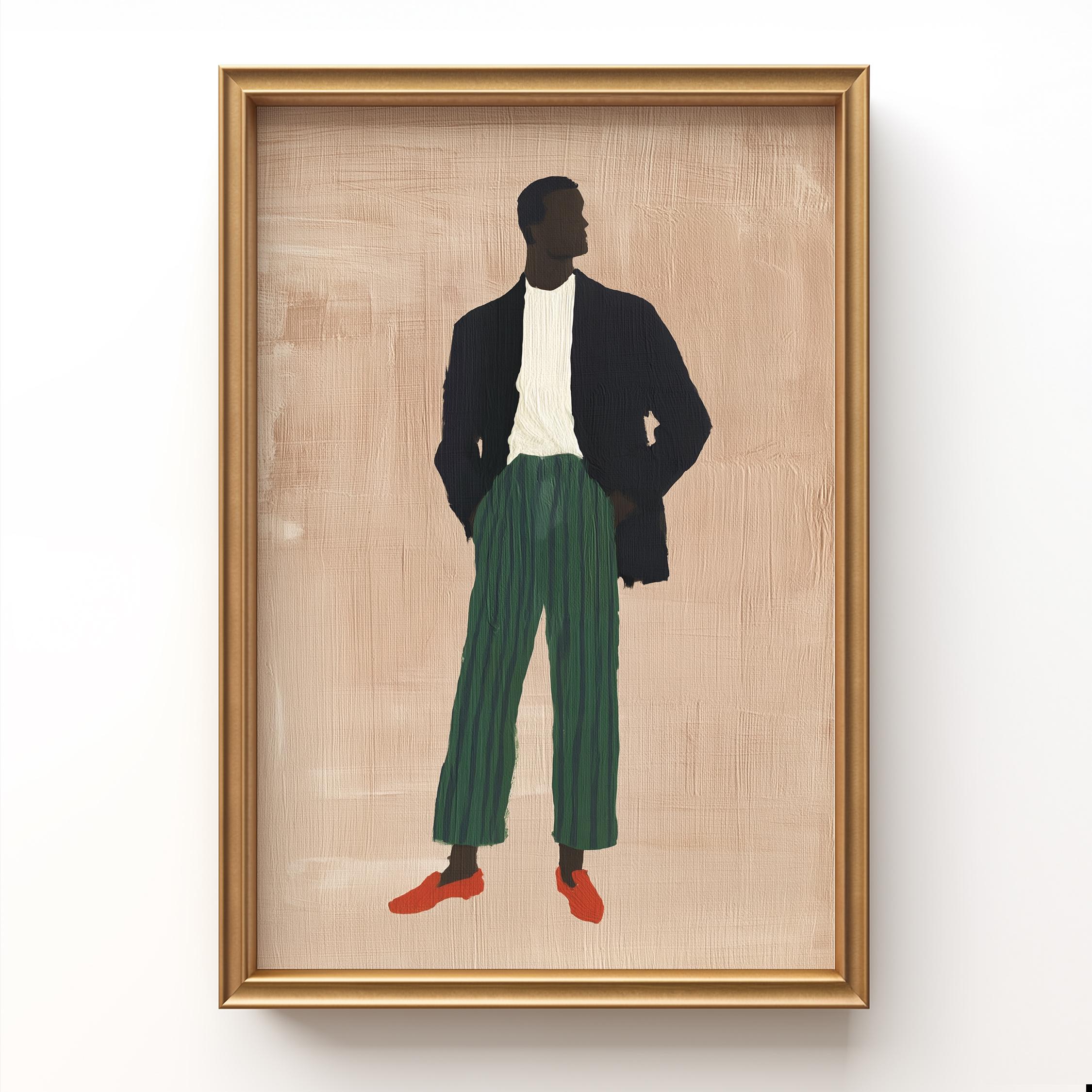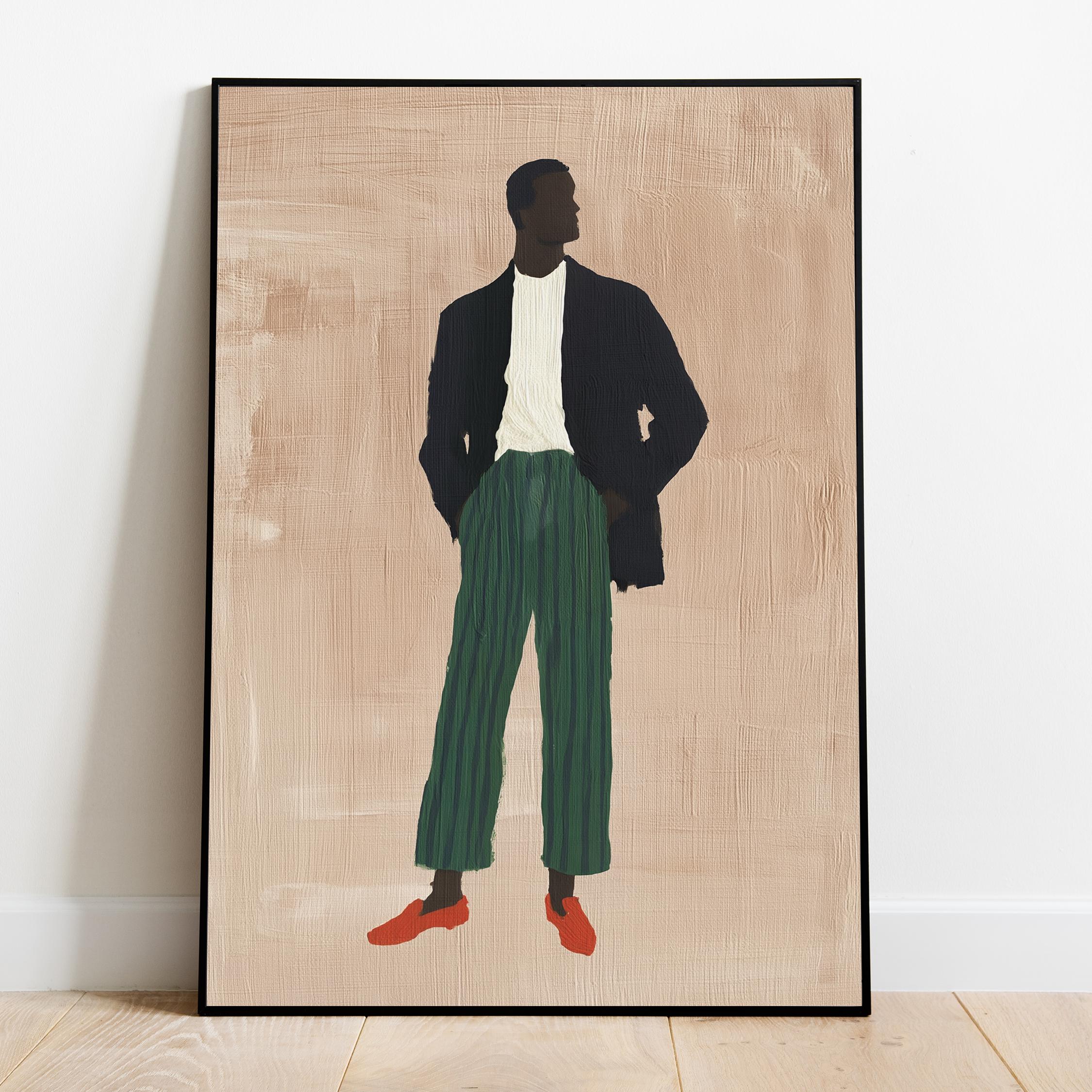 a stylish depiction of a fashionable Black man, perfect for a modern living room and a great gift for a housewarming gift.
