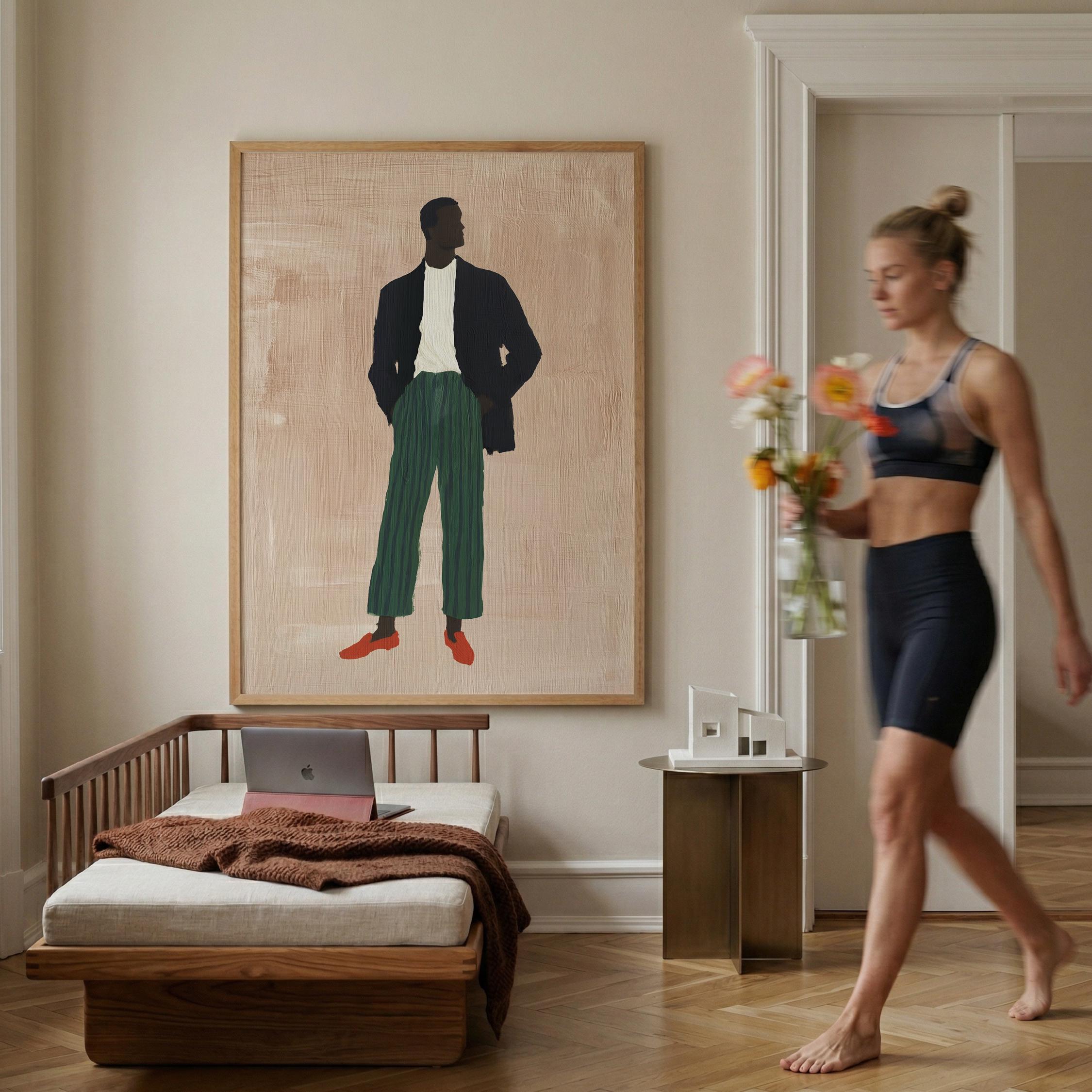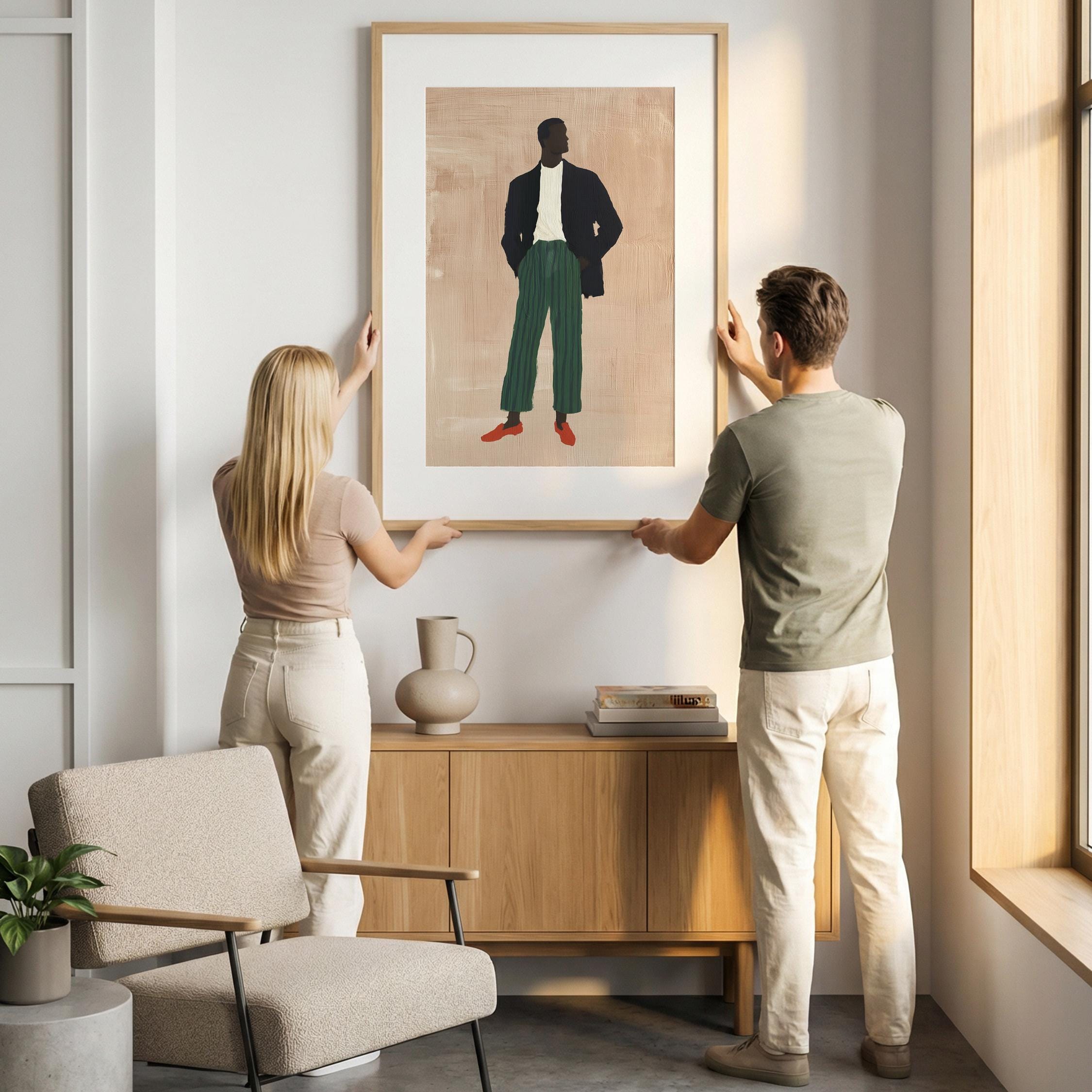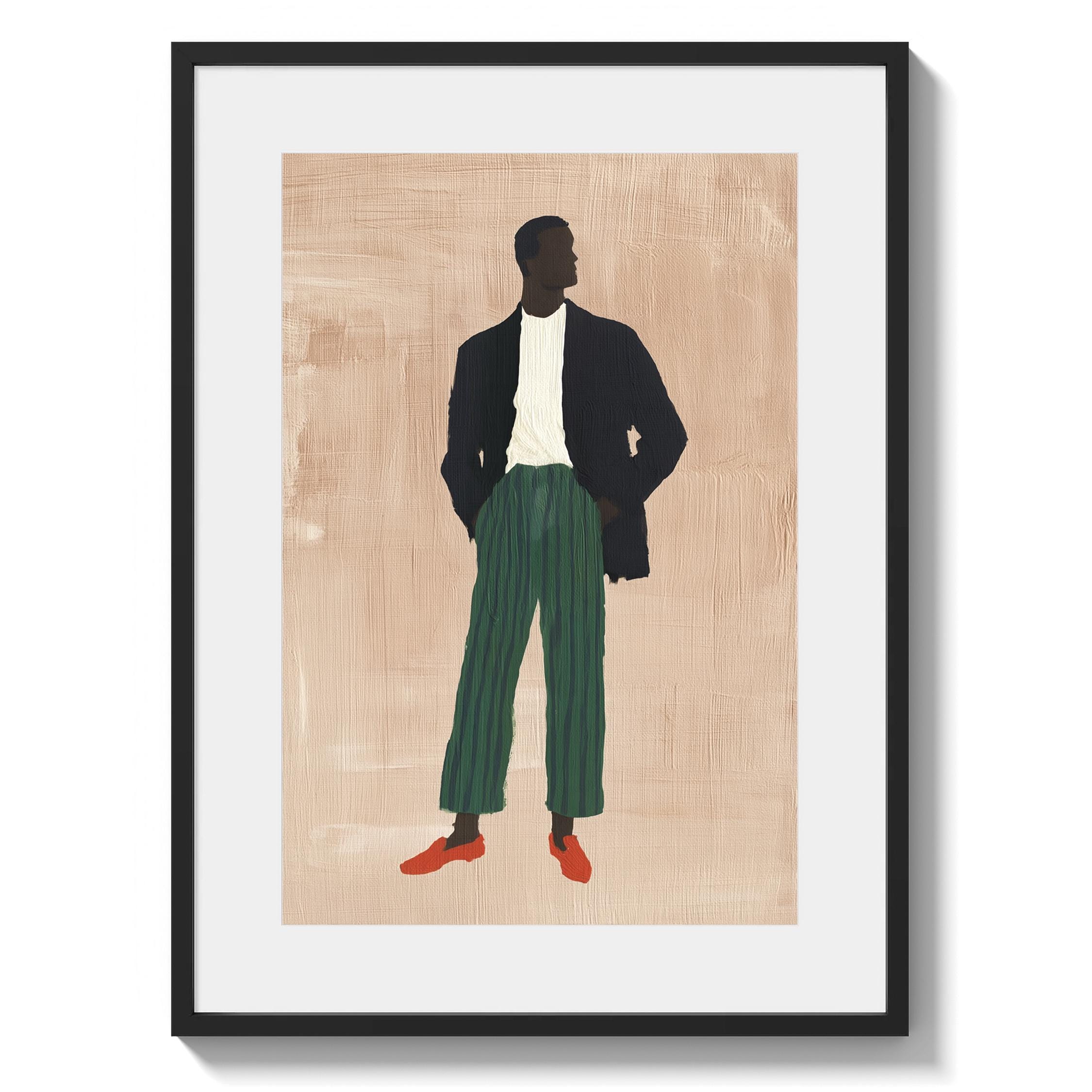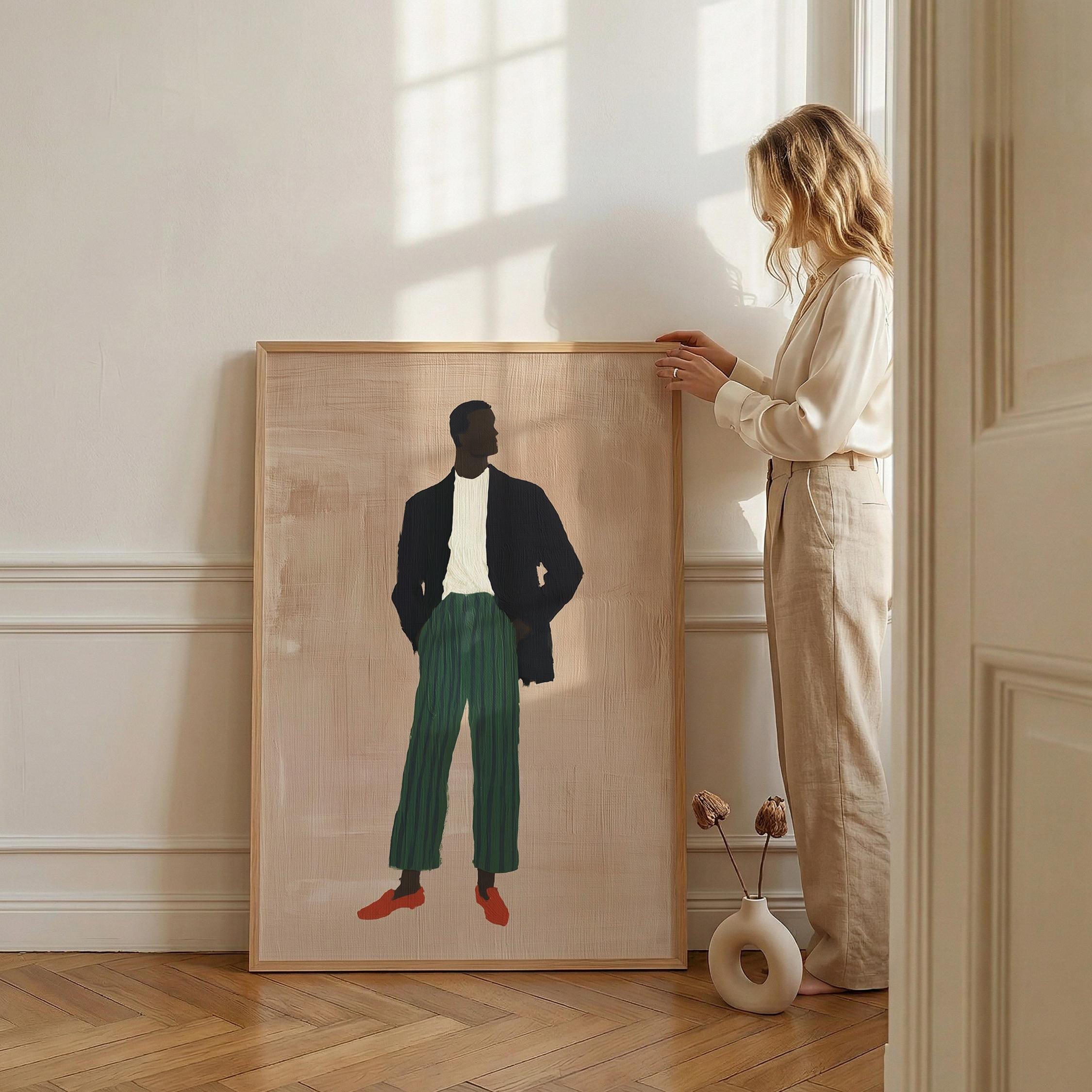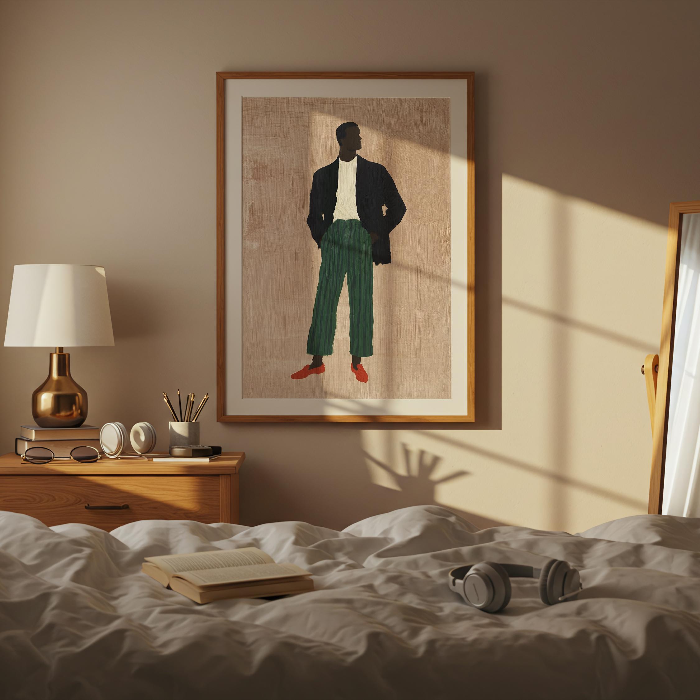 a stylish depiction of a fashionable Black man, perfect for a modern living room and a great gift for a housewarming gift.