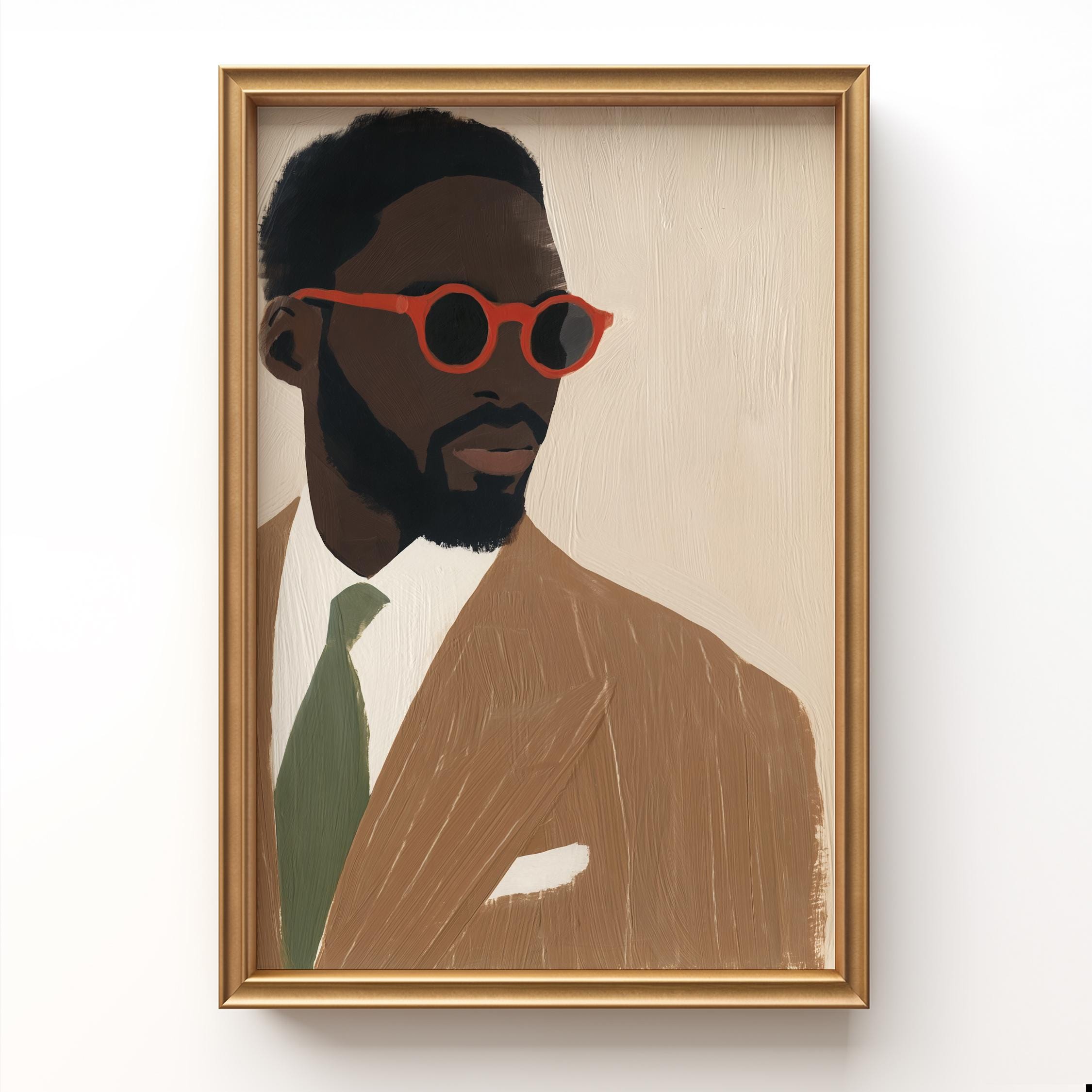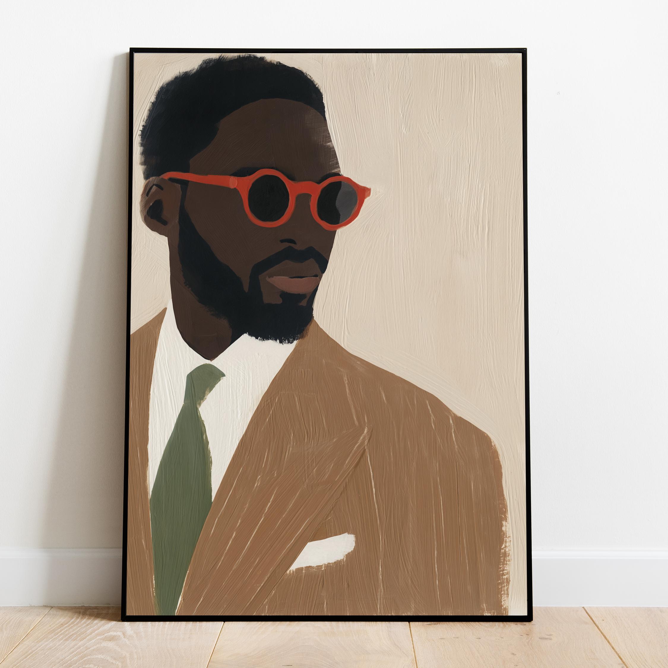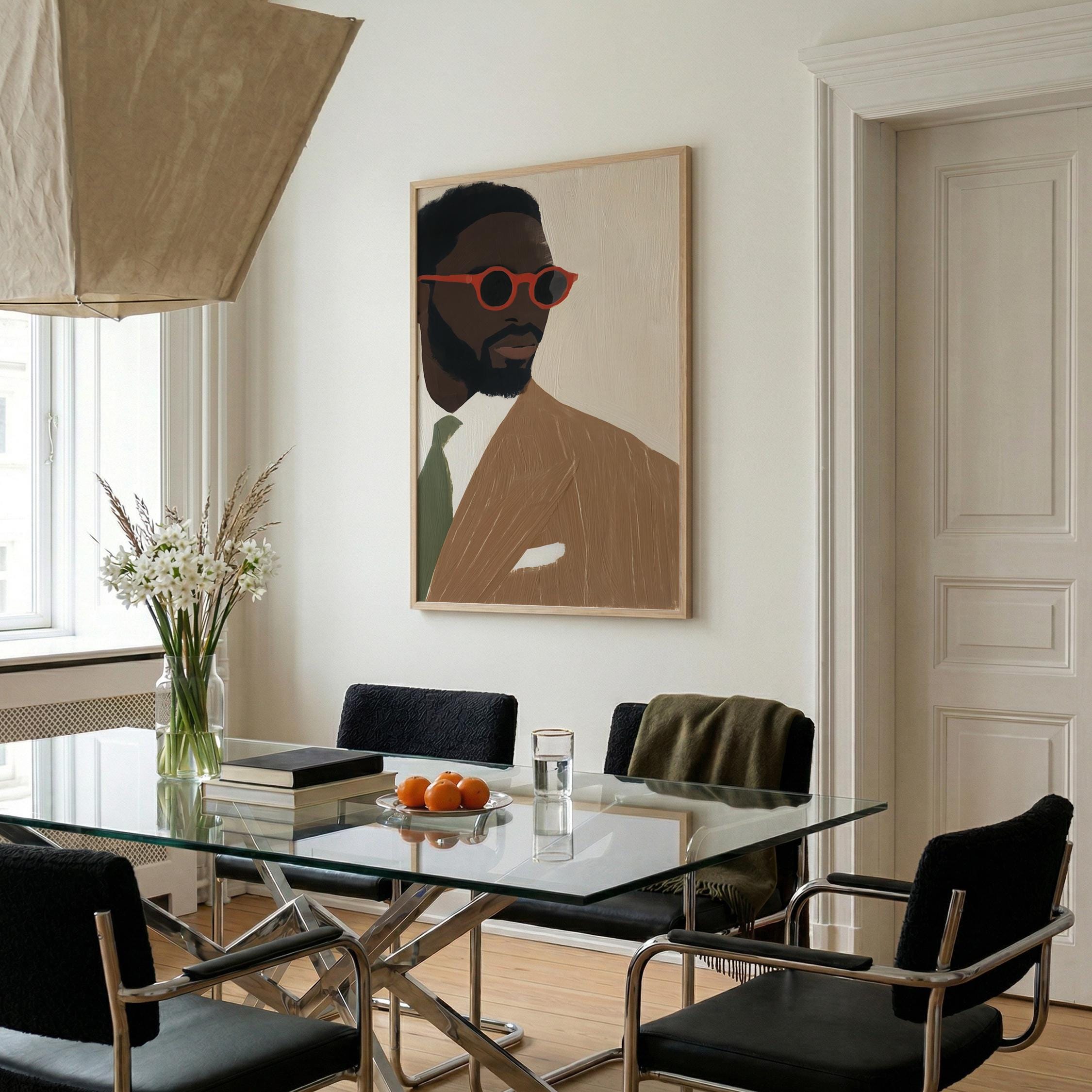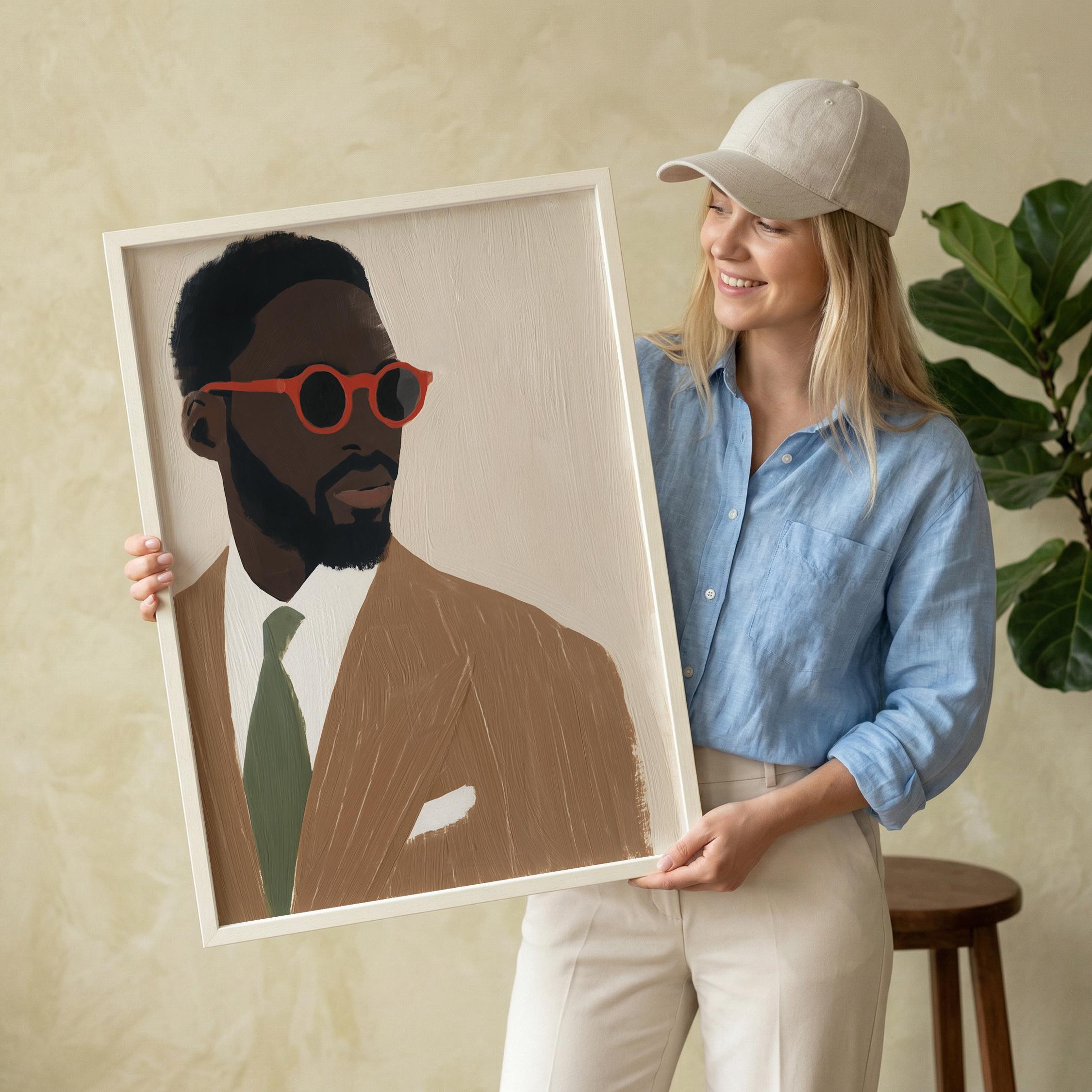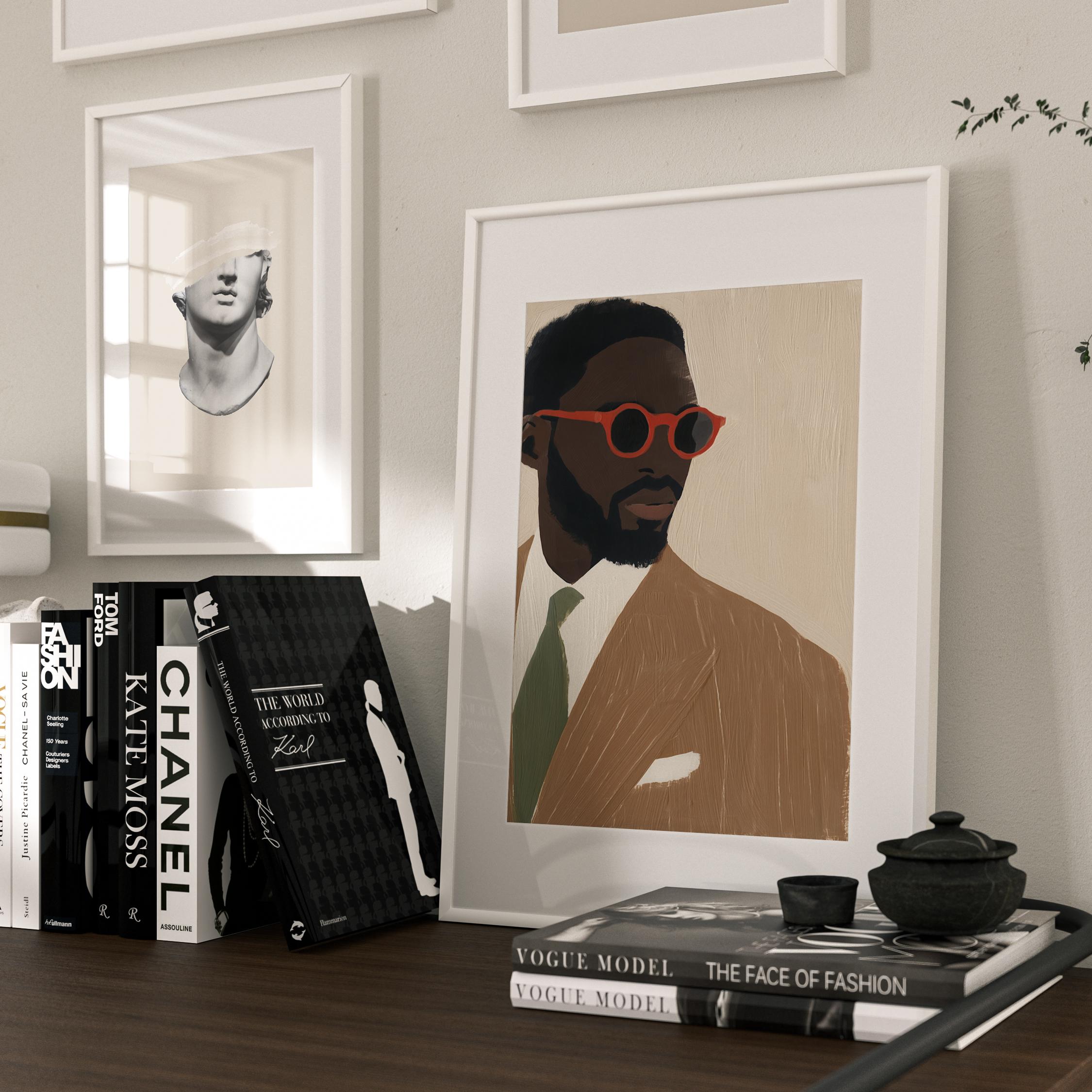 a fashionable Black man illustration, perfect for a modern living room and a great gift for a birthday celebration.