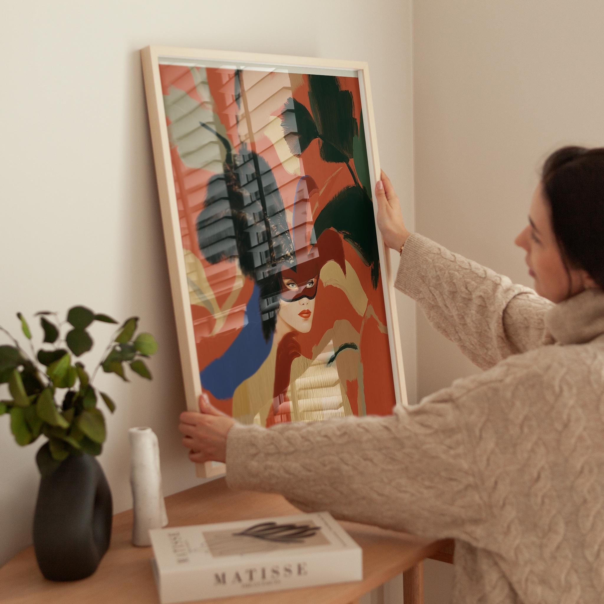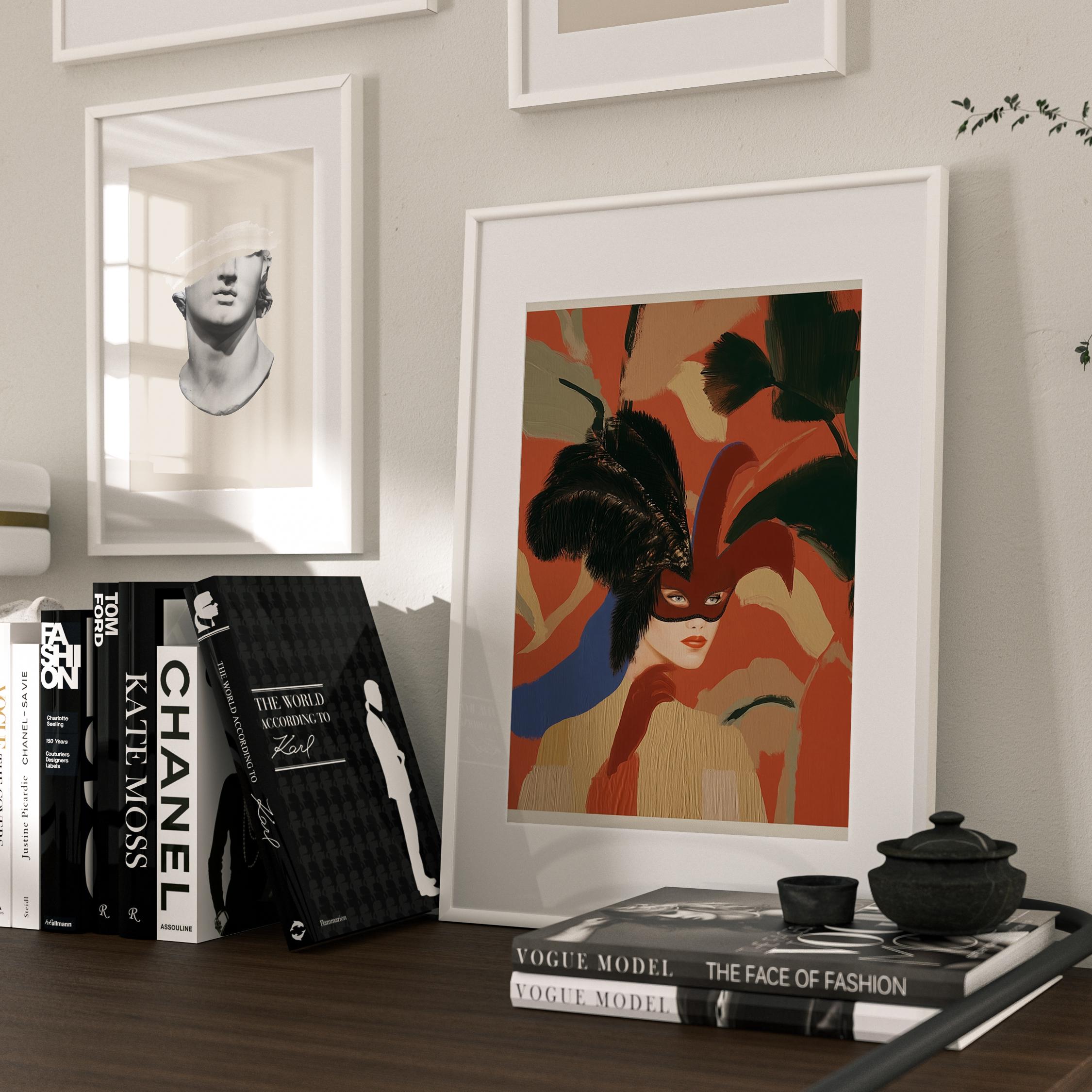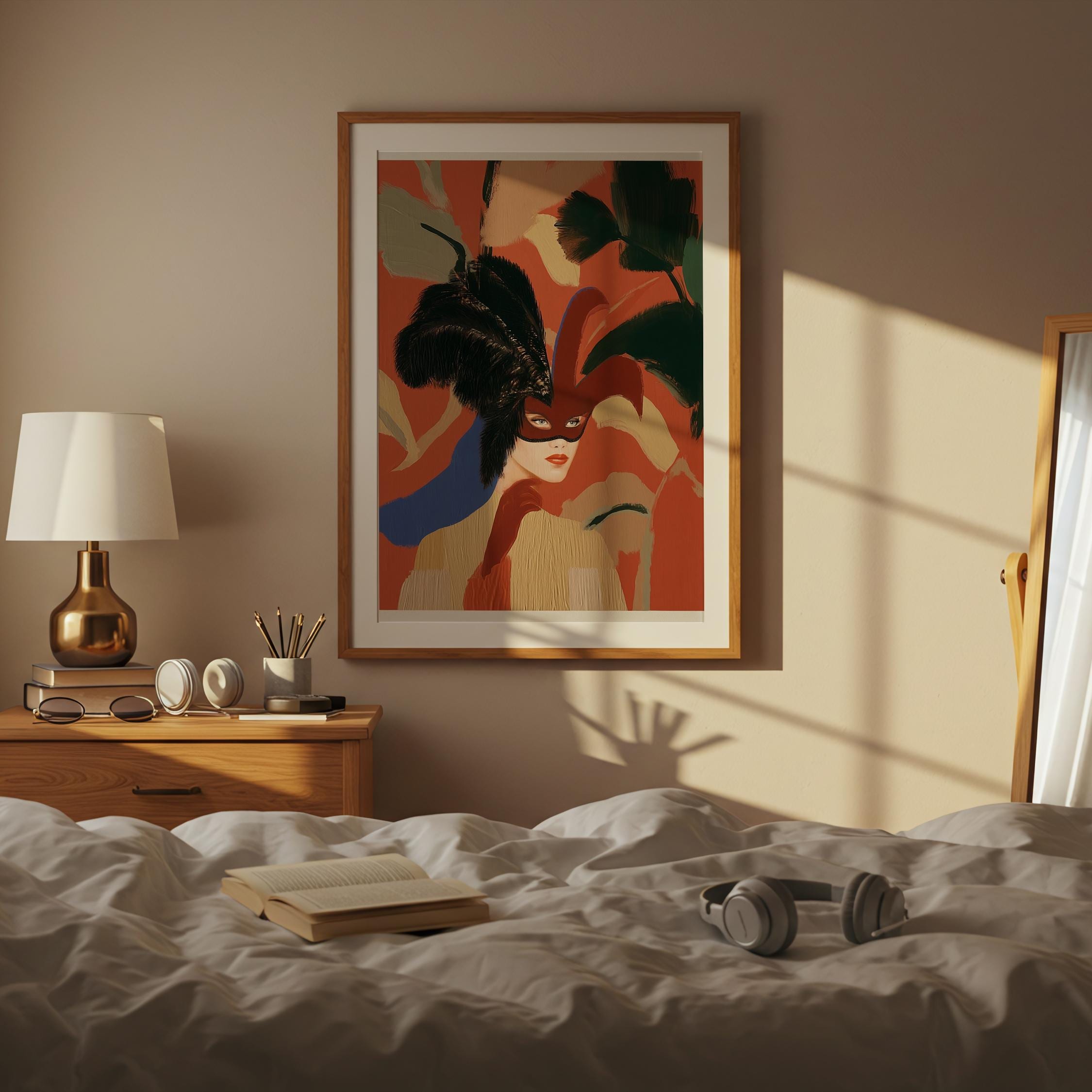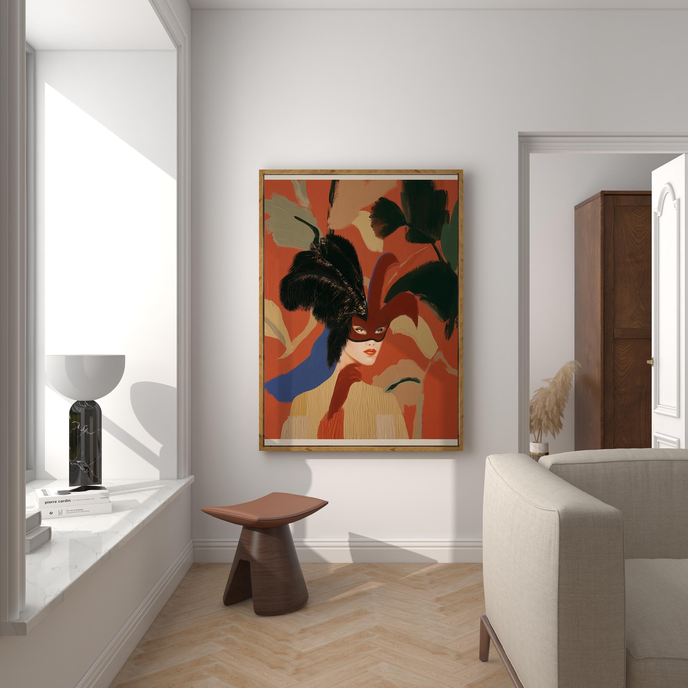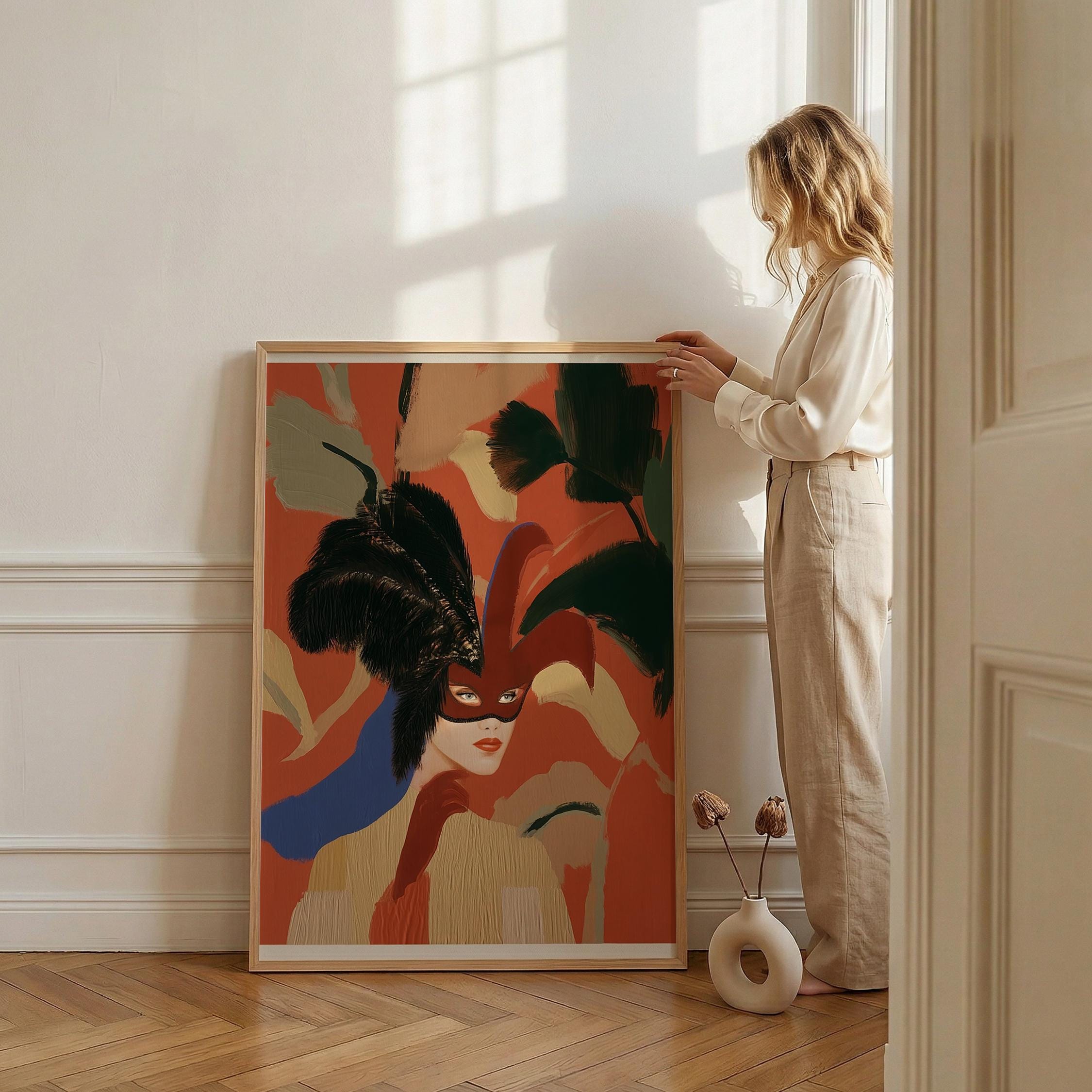 a striking portrait of a masked woman, perfect for a stylish living room and a great gift for a masquerade ball.