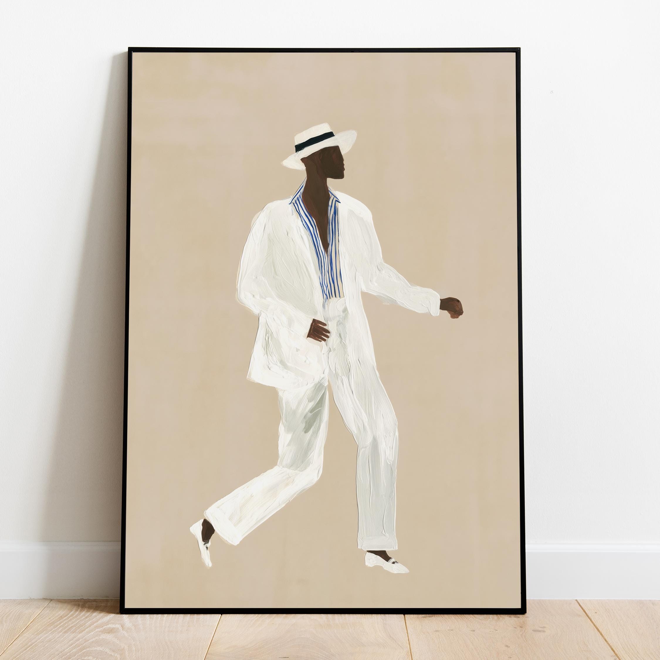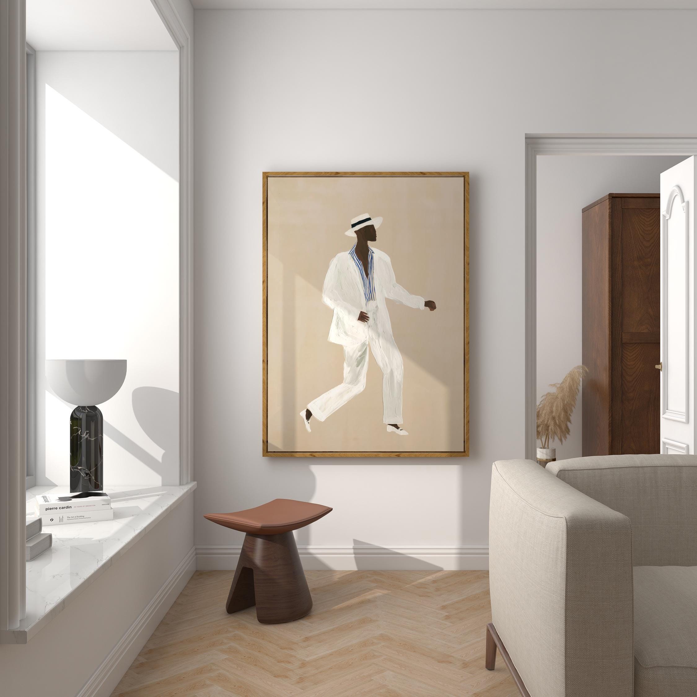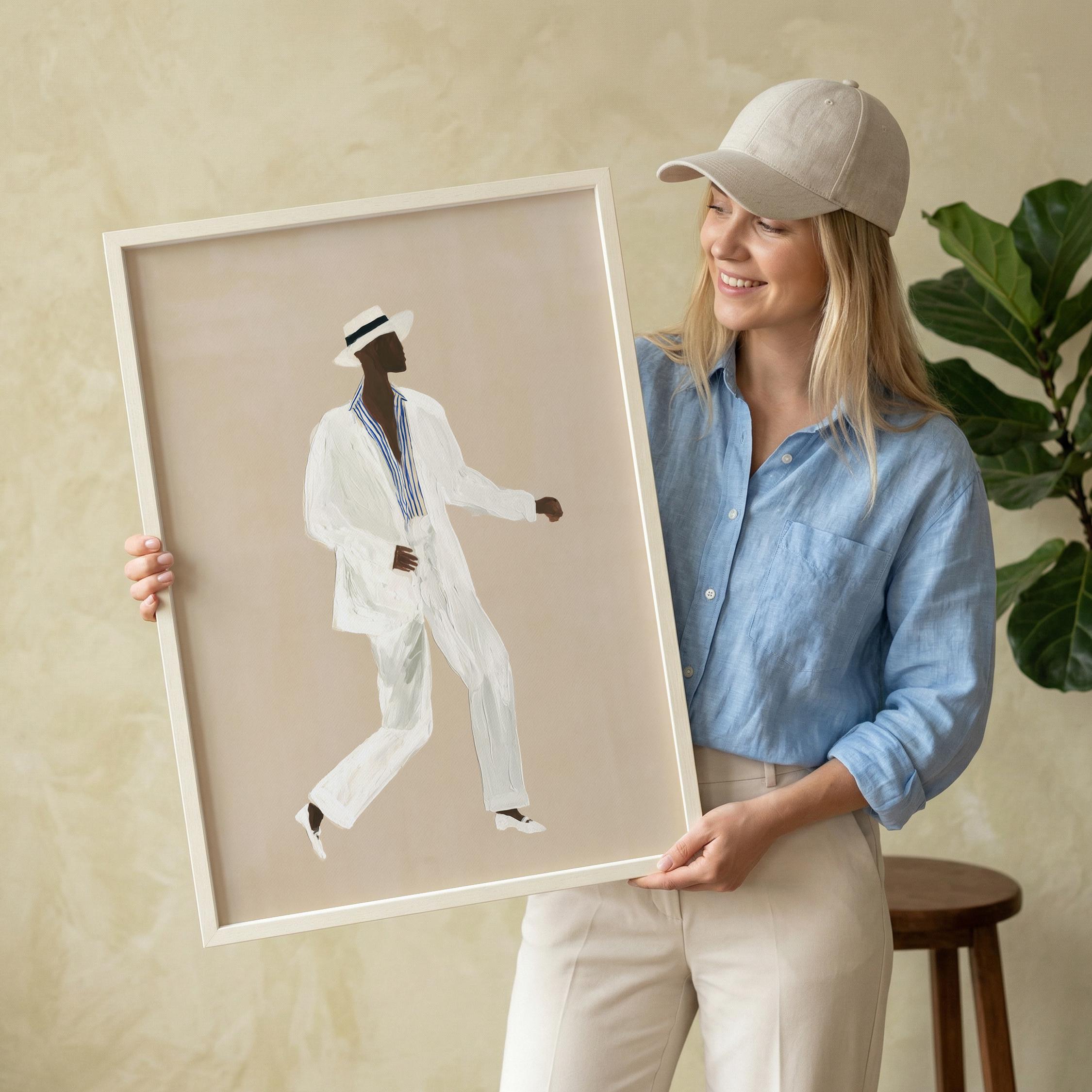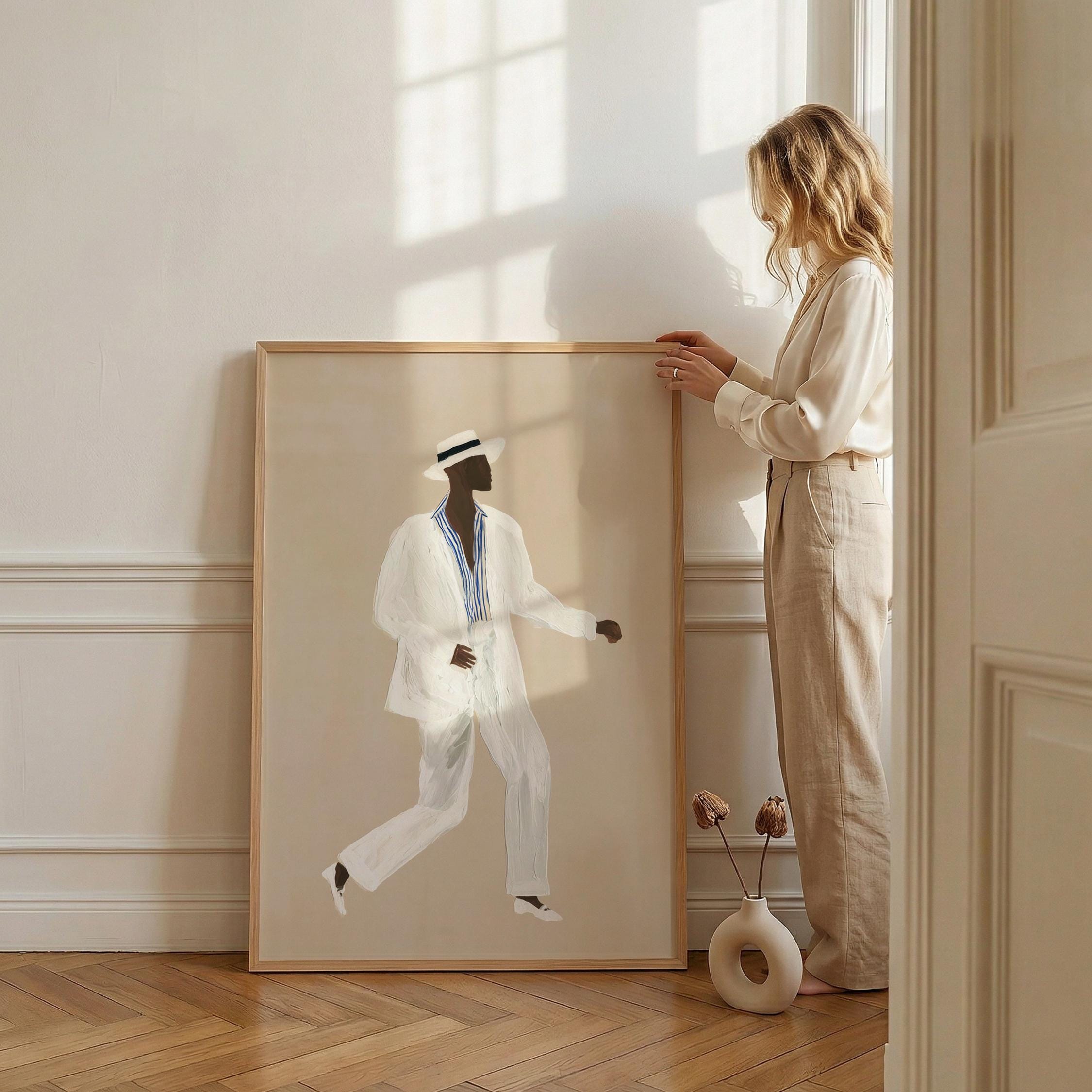a stylish Black man in a white suit, perfect for a modern living room and a great gift for a housewarming party.