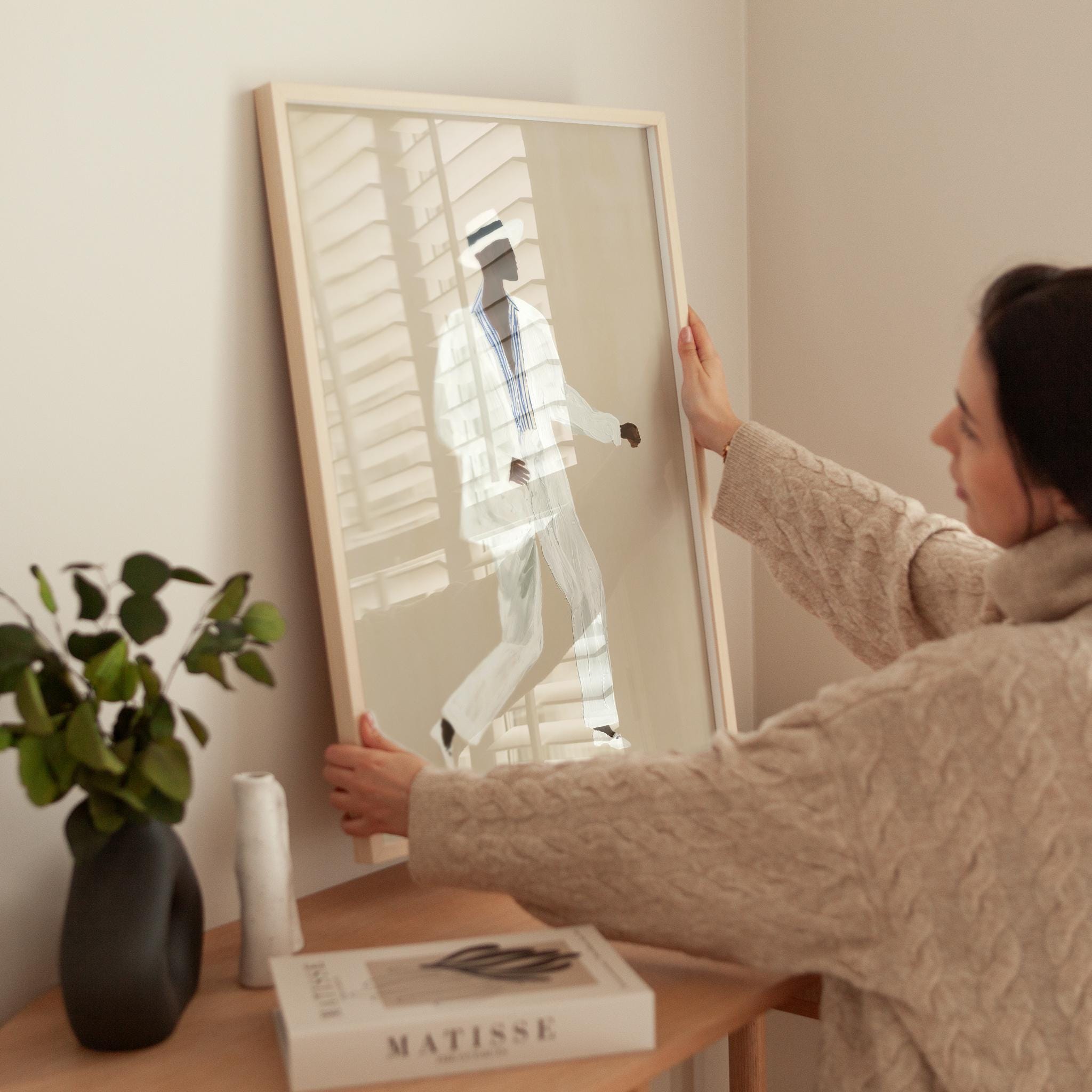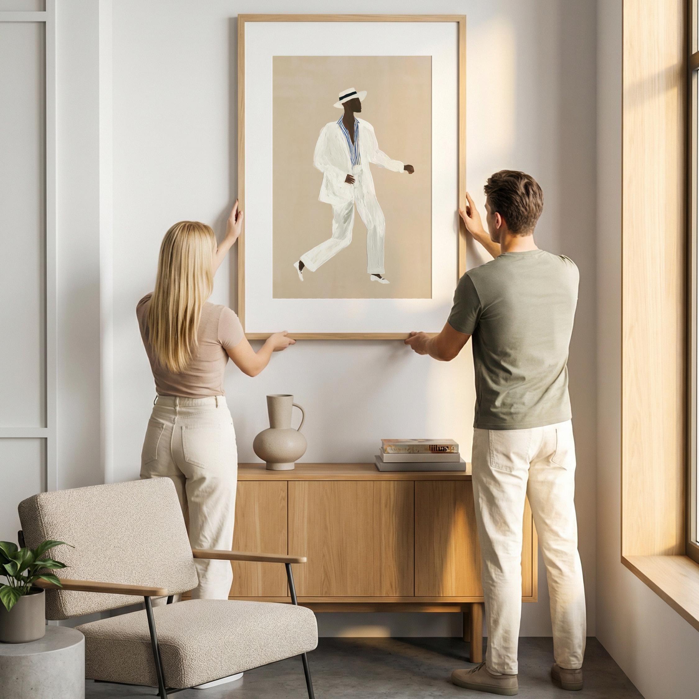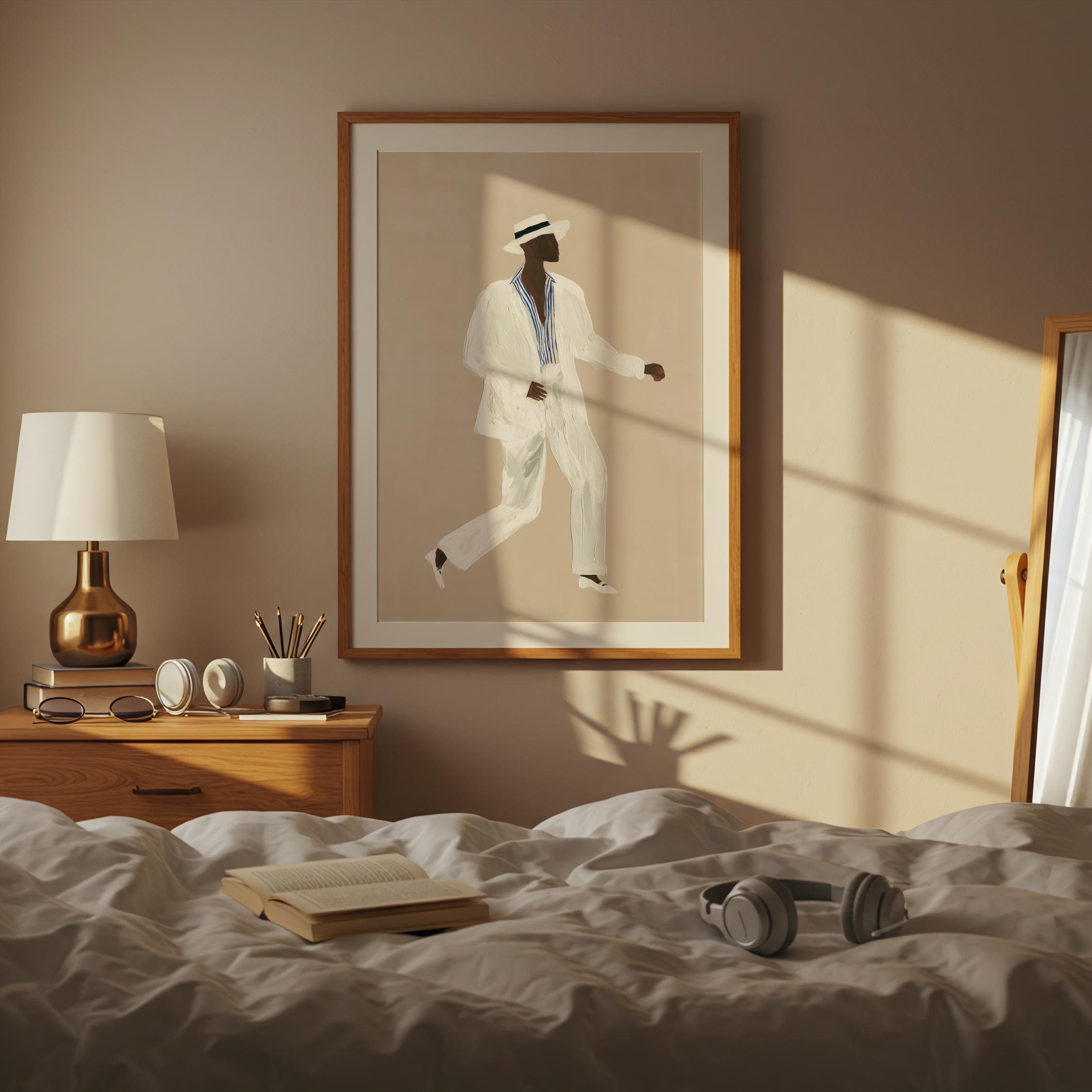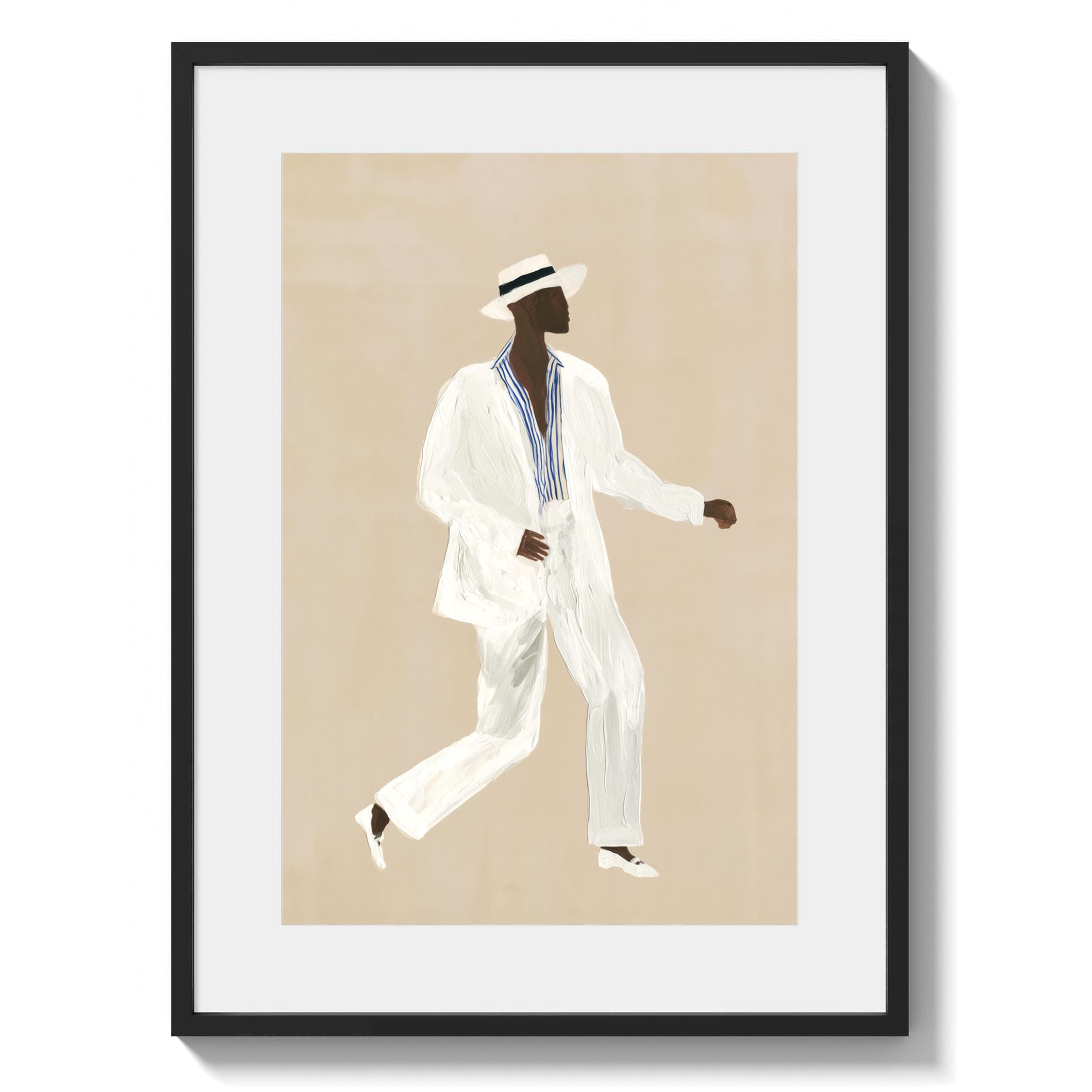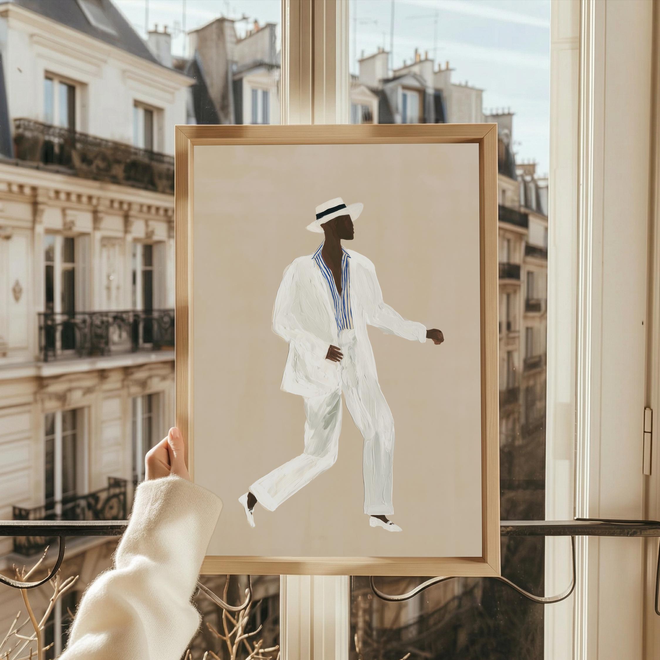 a stylish Black man in a white suit, perfect for a modern living room and a great gift for a housewarming party.