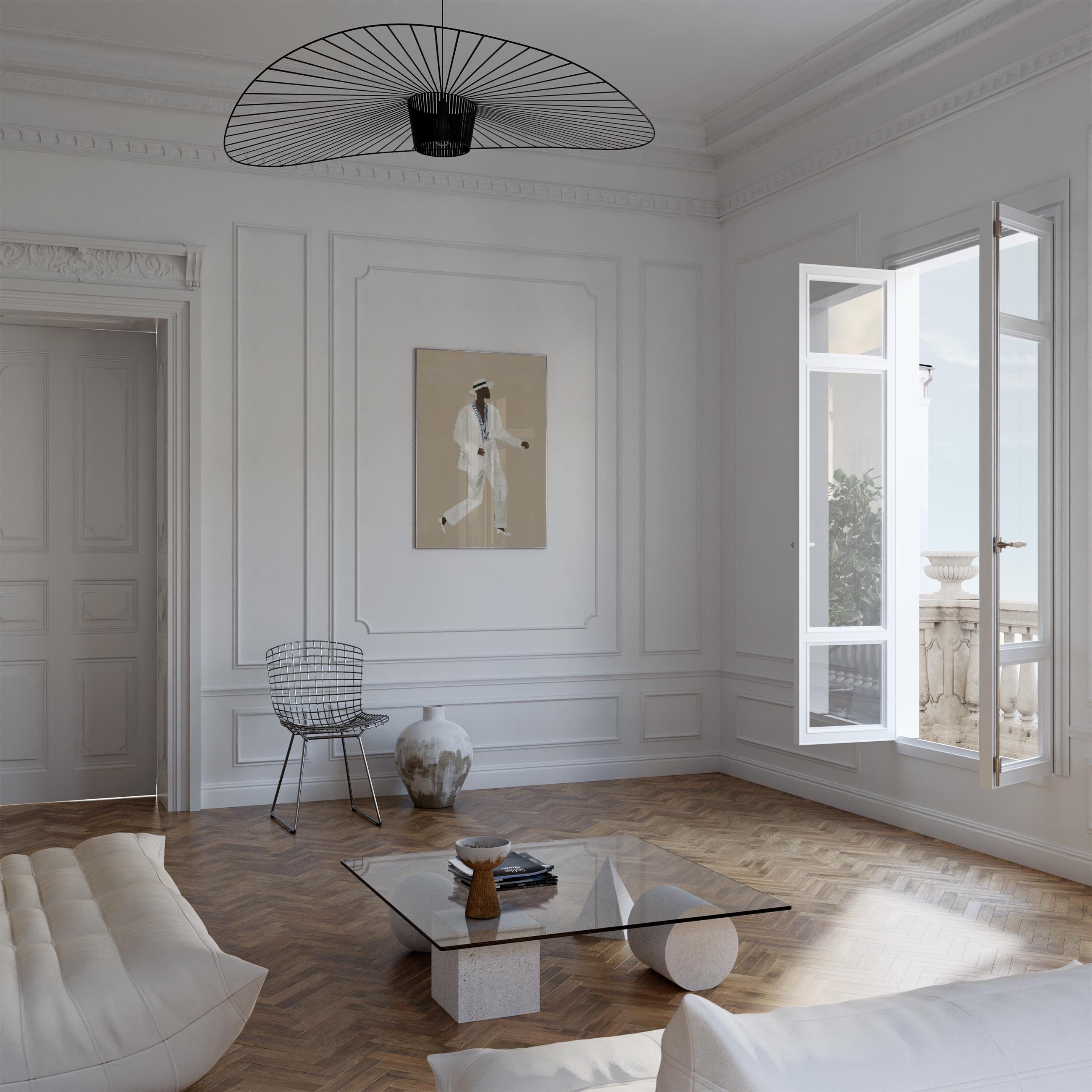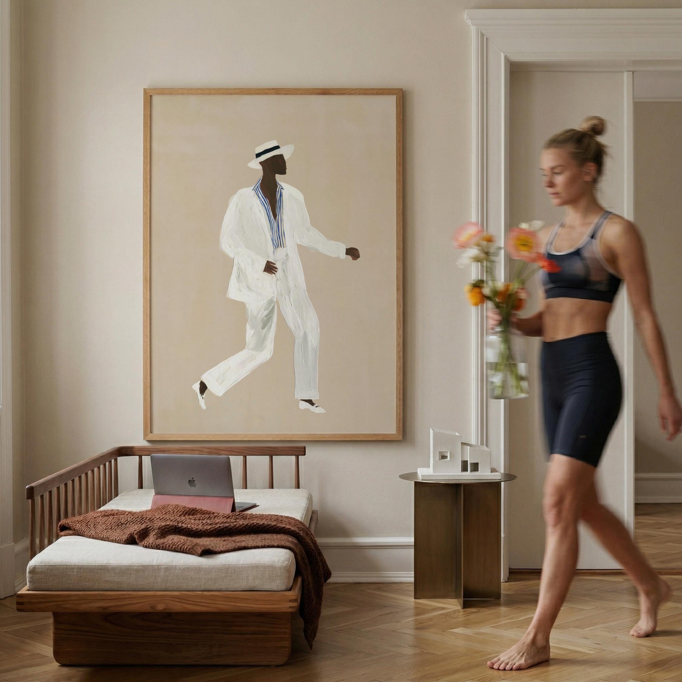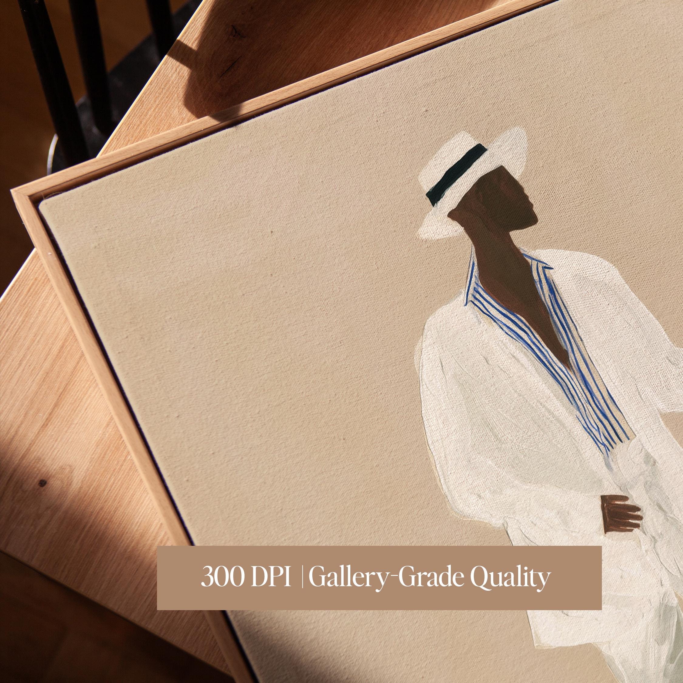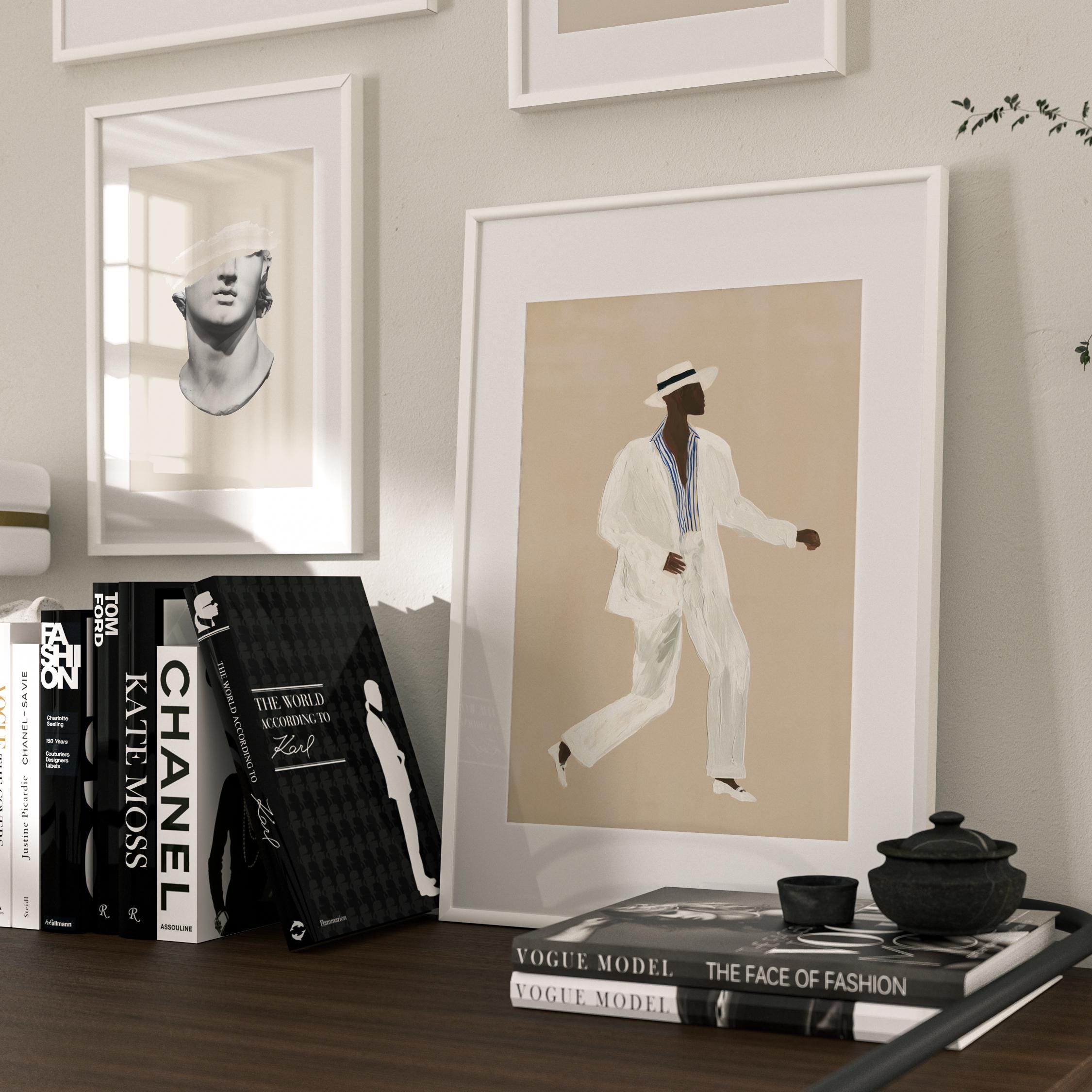 a stylish Black man in a white suit, perfect for a modern living room and a great gift for a housewarming party.