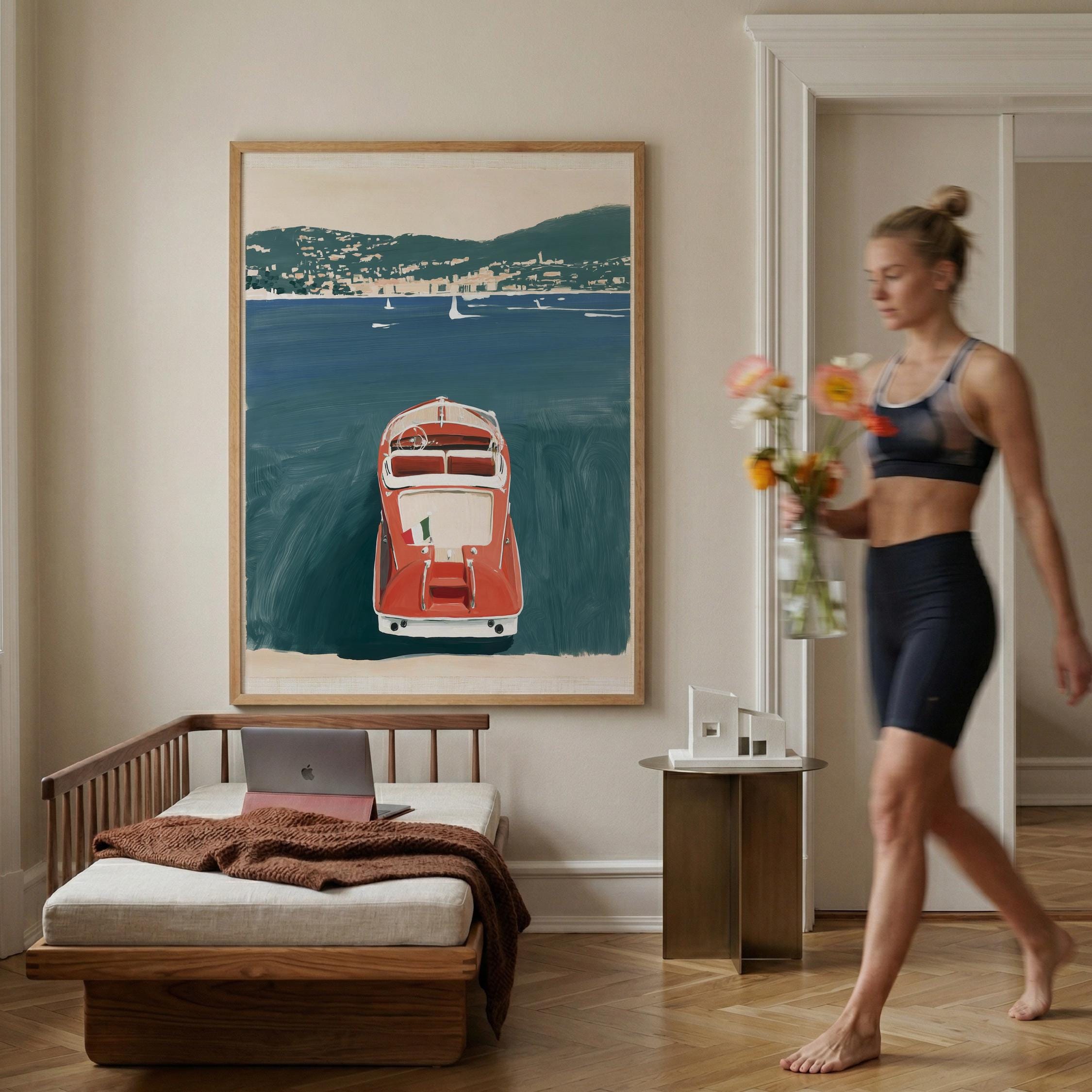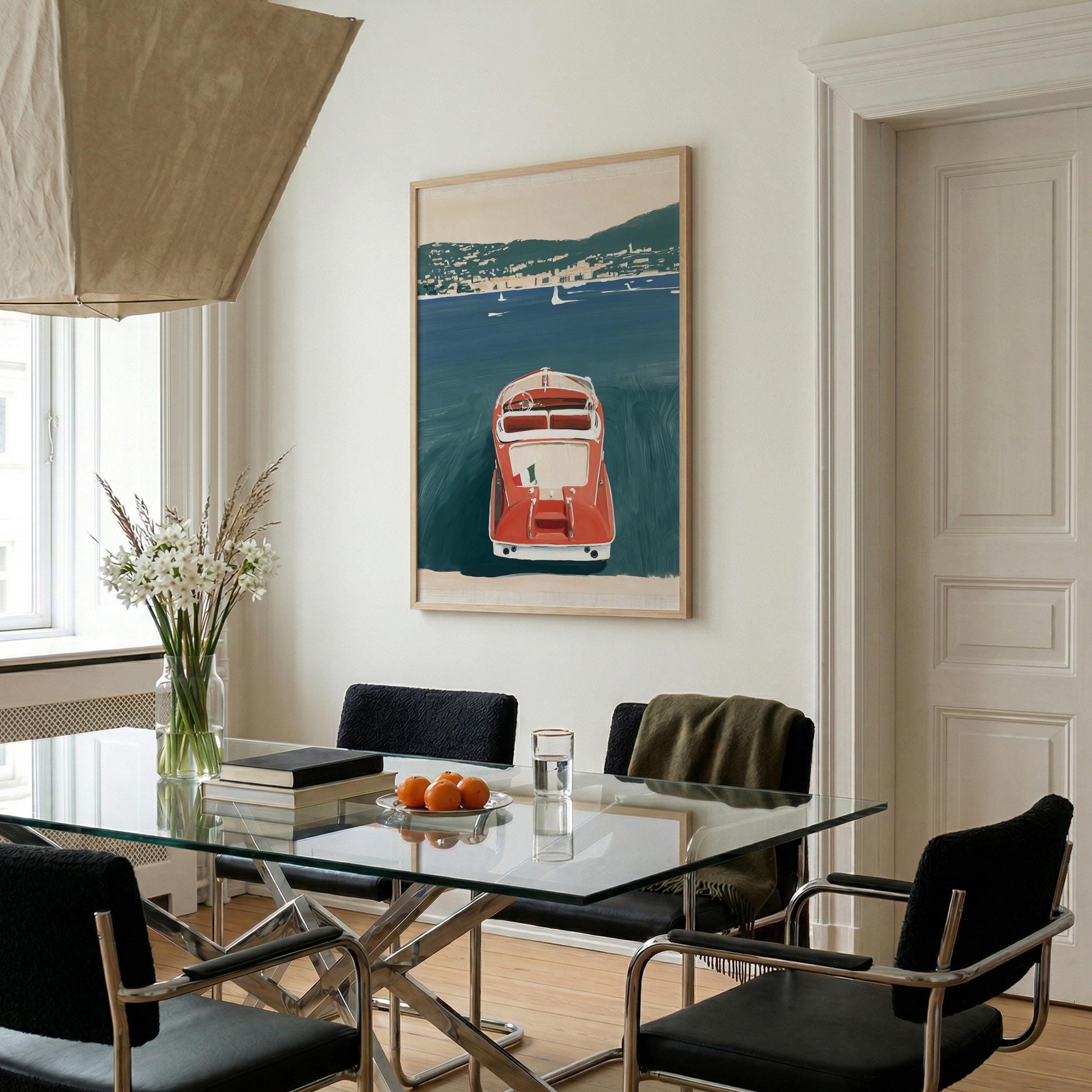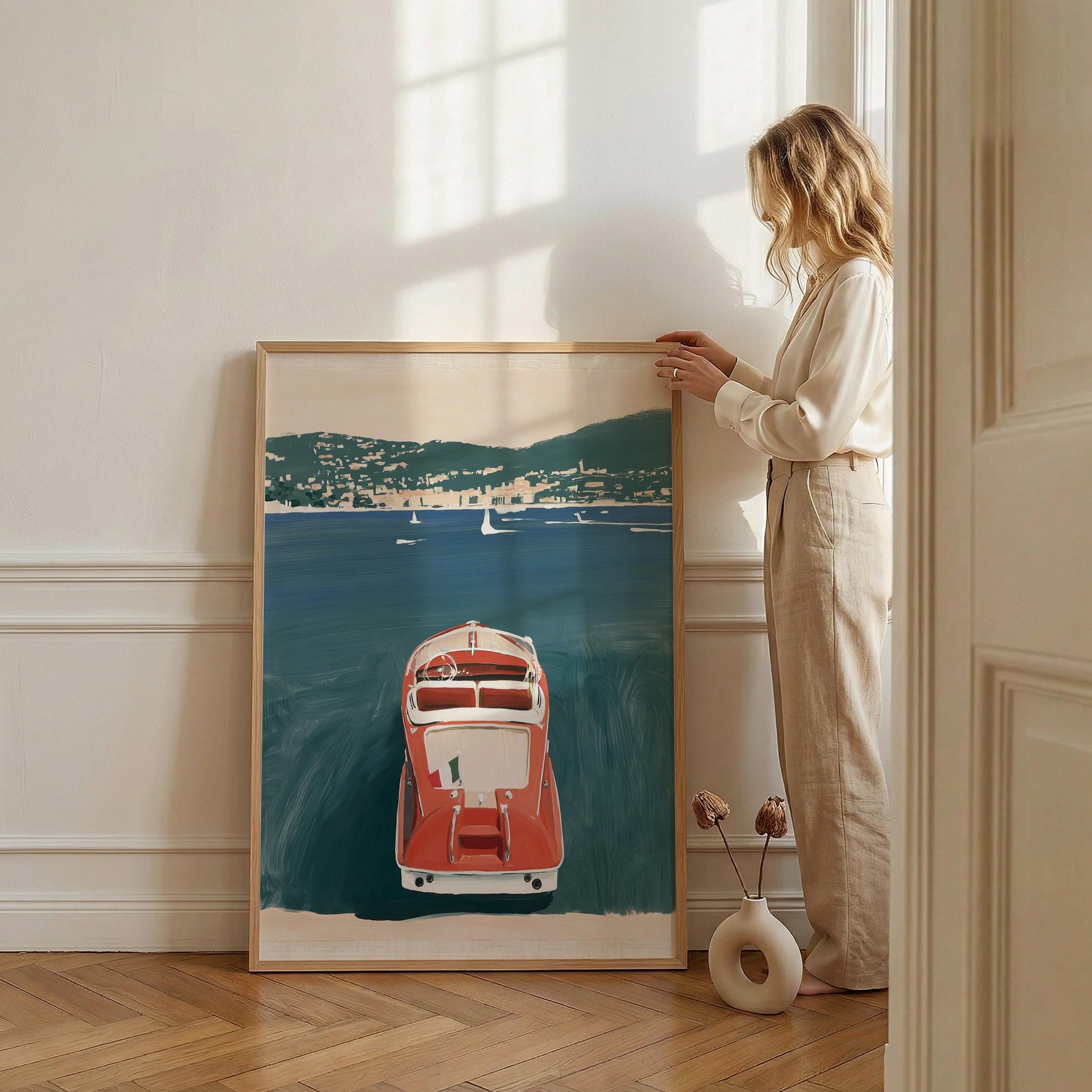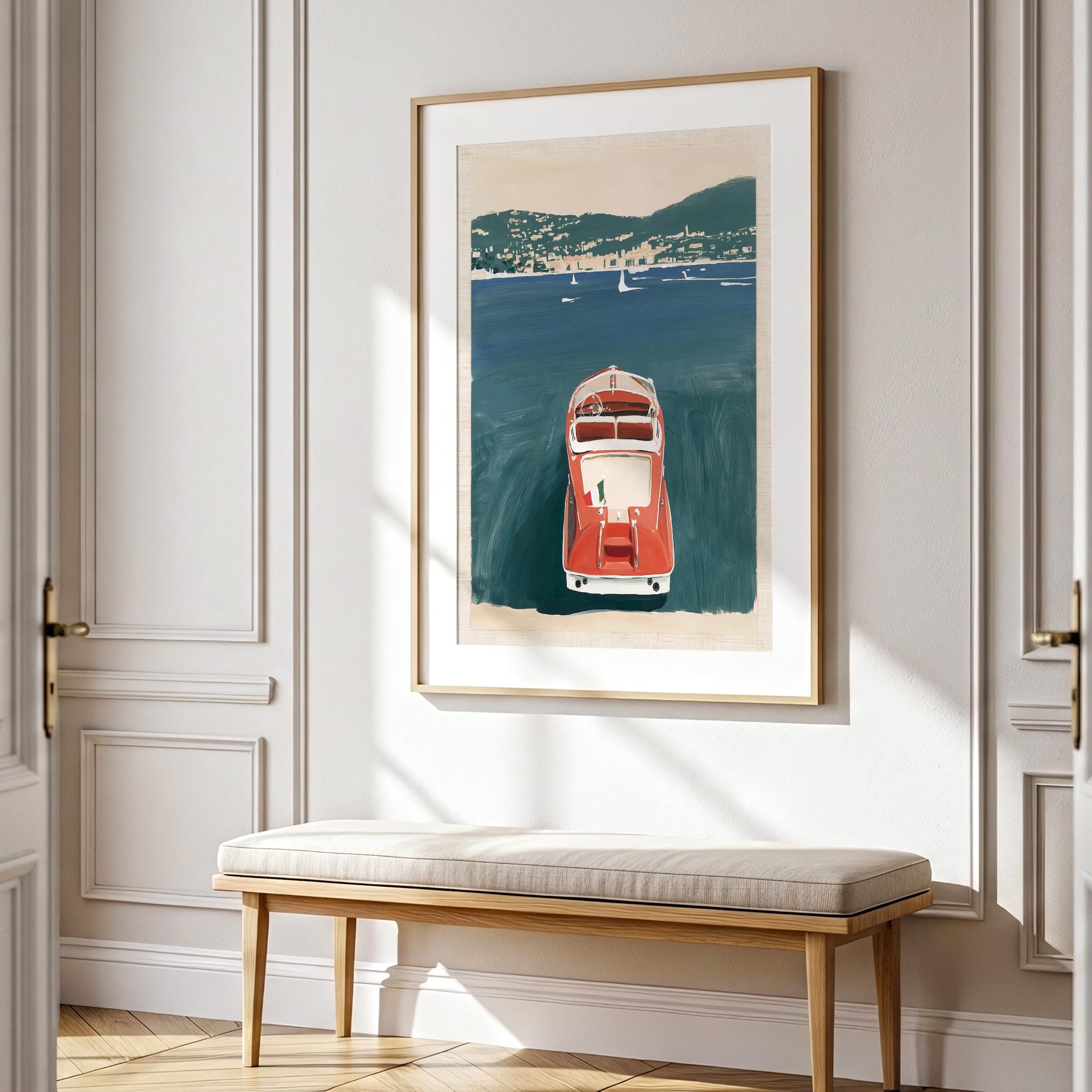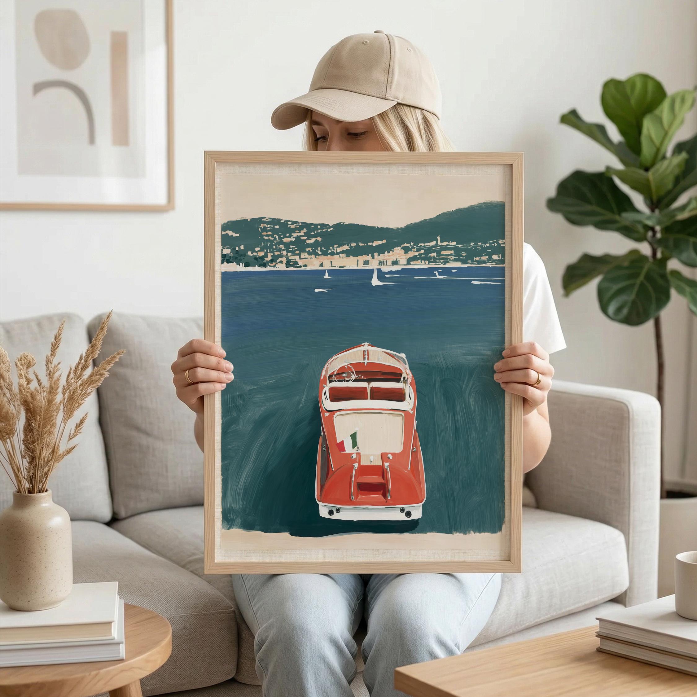 a vintage Riva speedboat, perfect for a coastal living room and a great gift for a nautical-themed birthday.