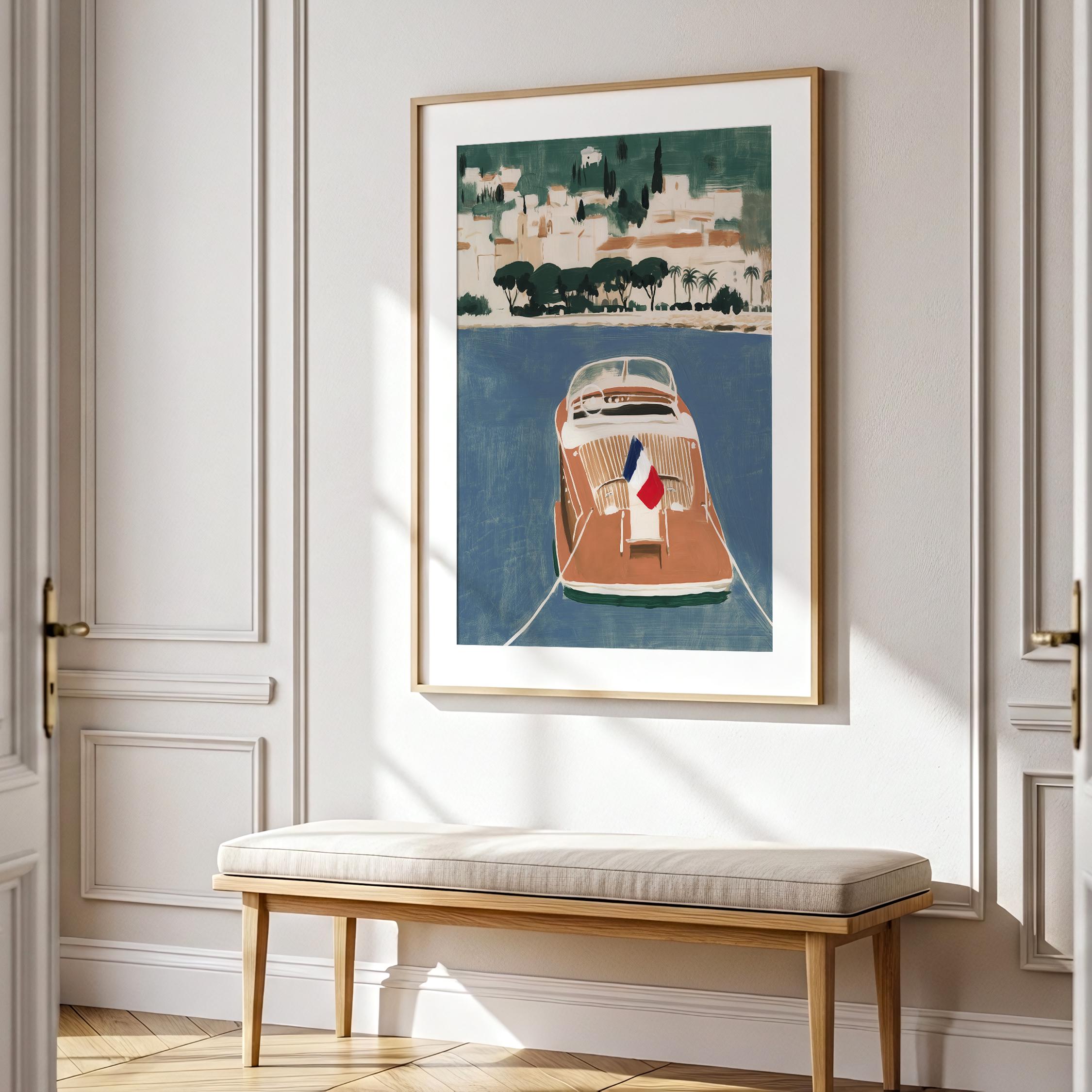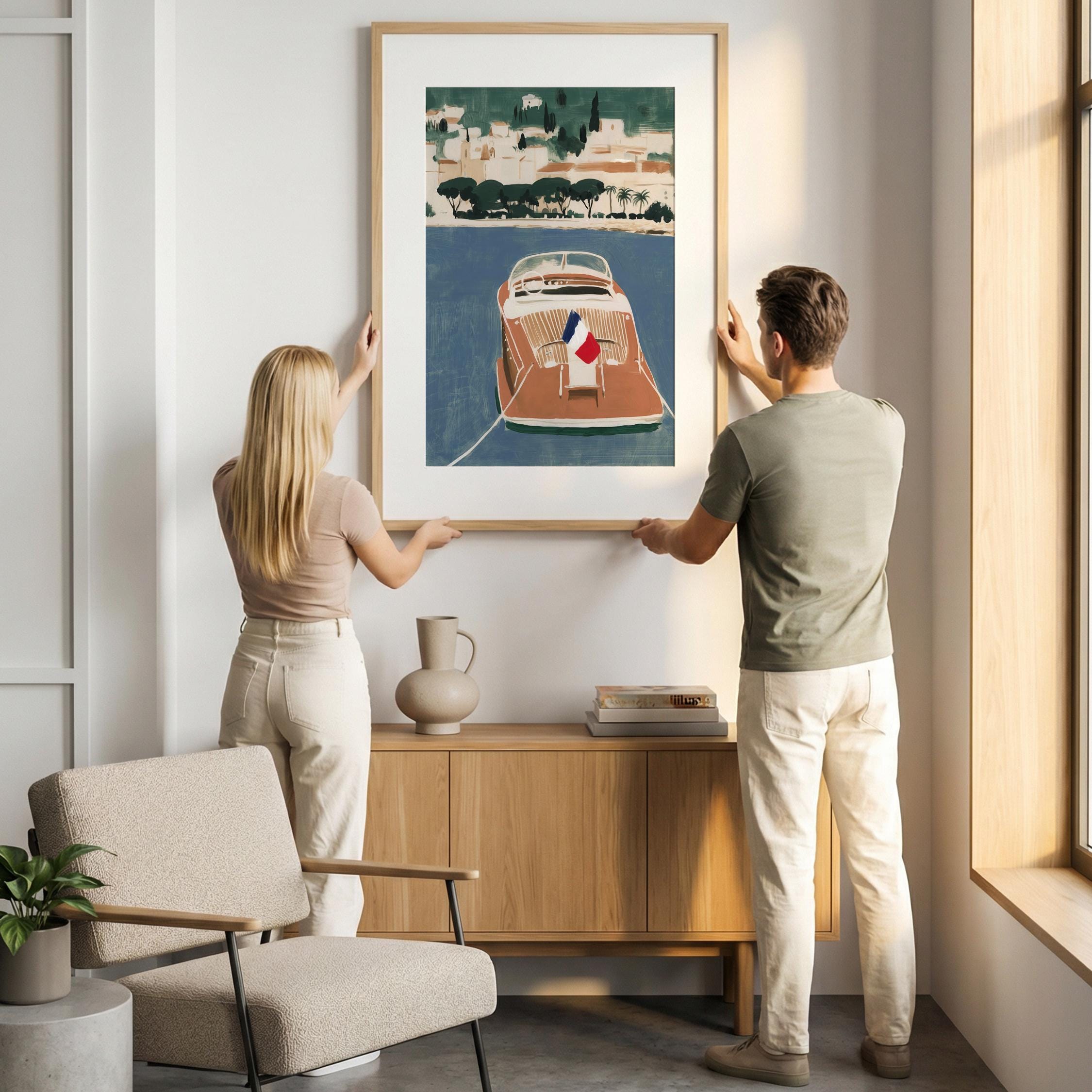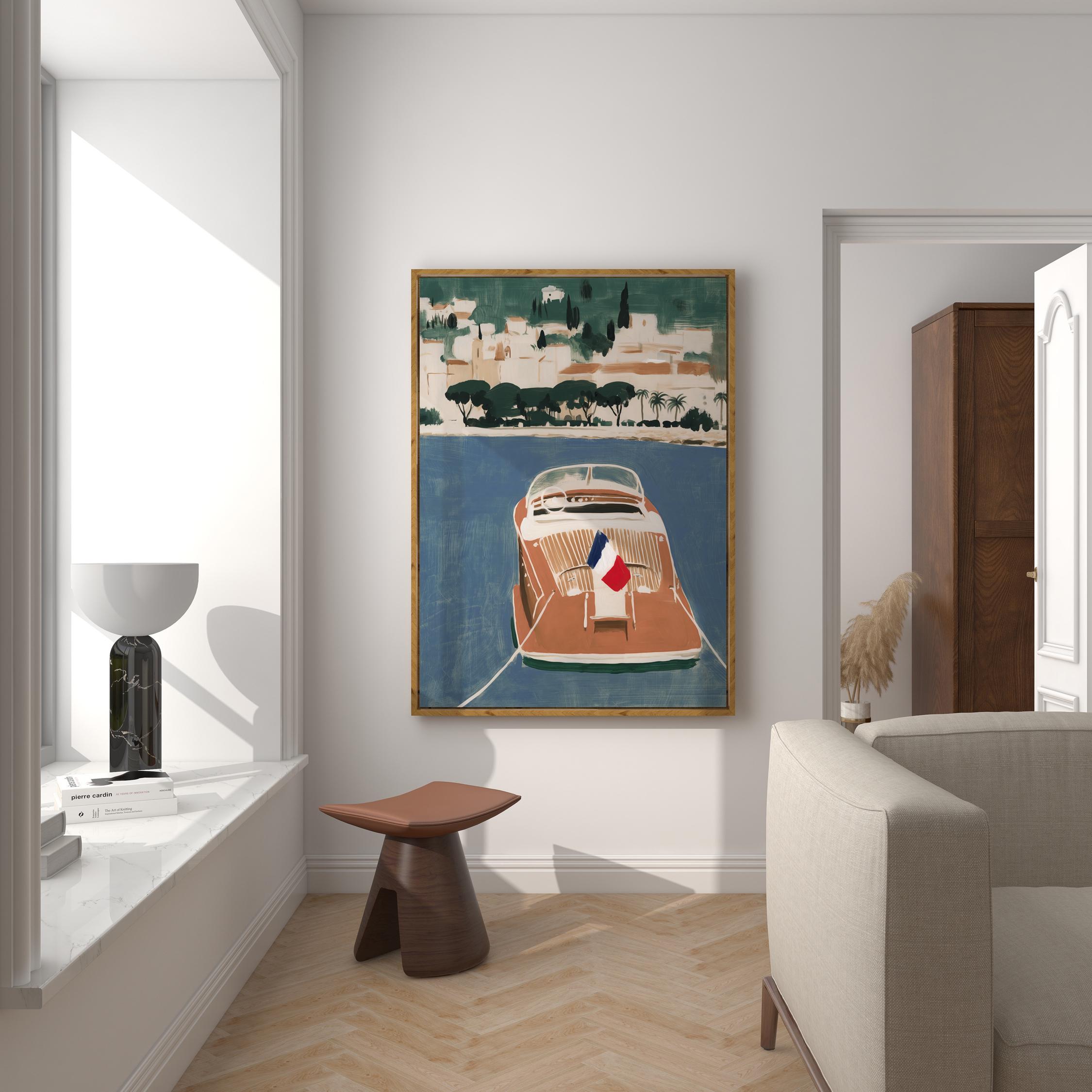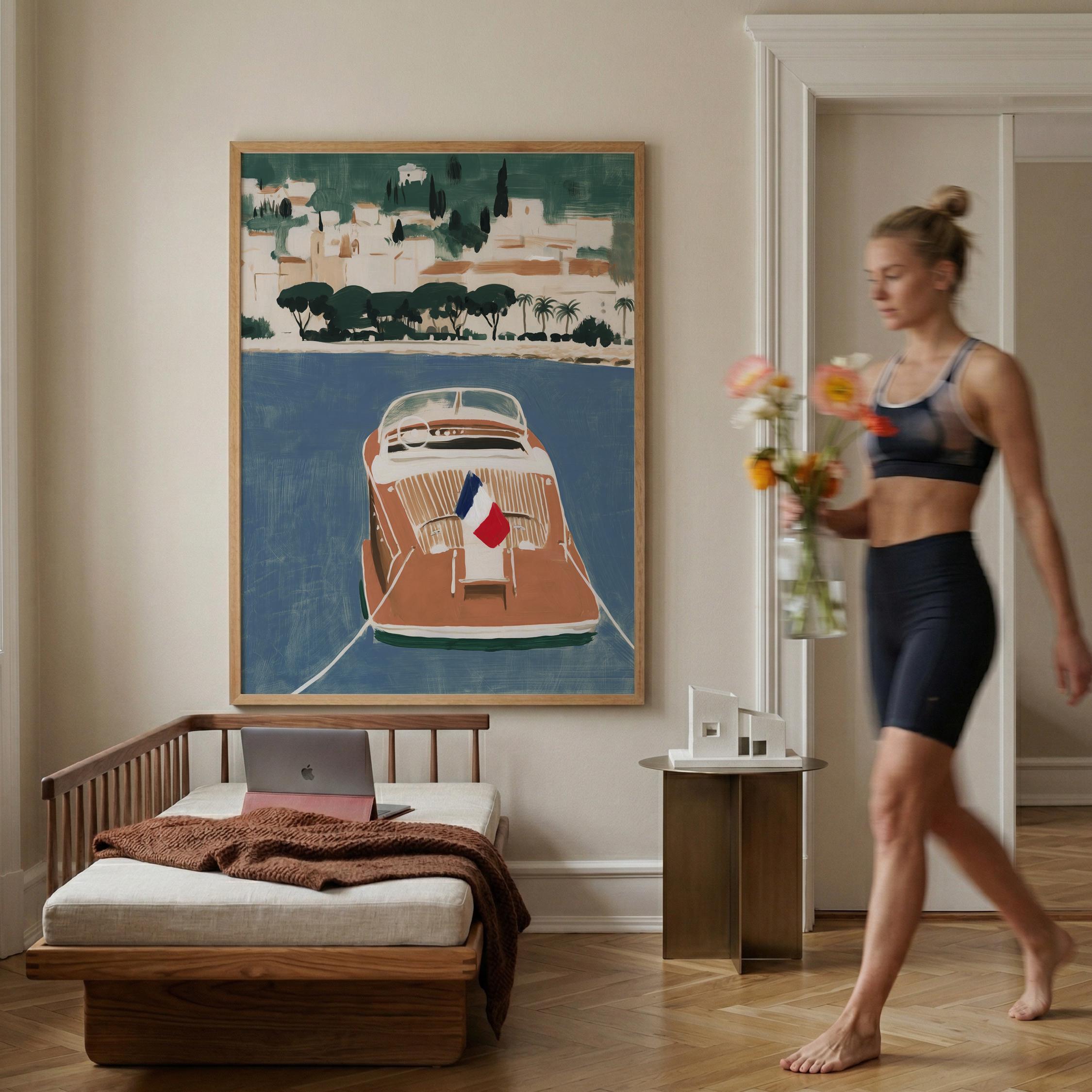 vintage Riva boat painting, perfect for a coastal living room and a great gift for a housewarming celebration.