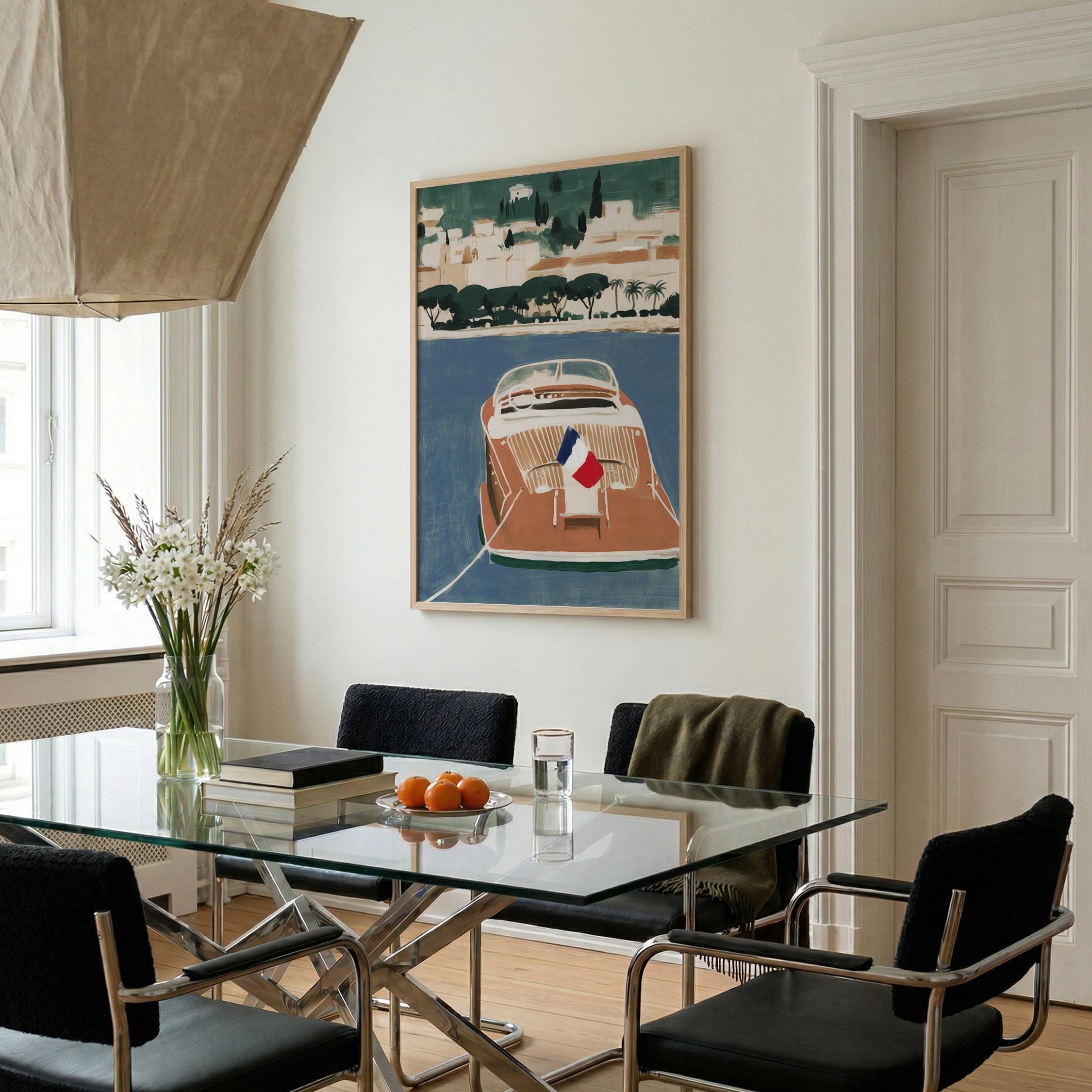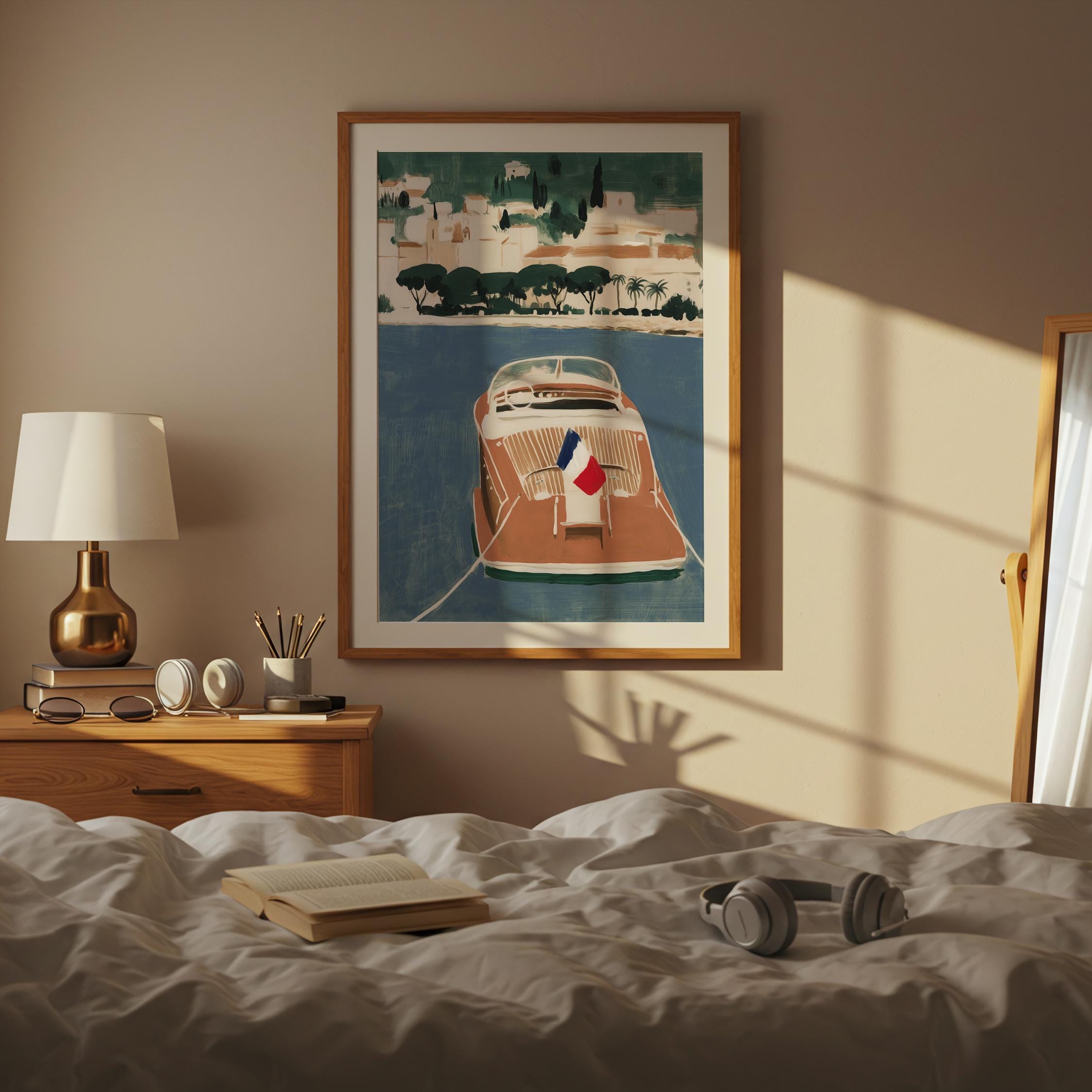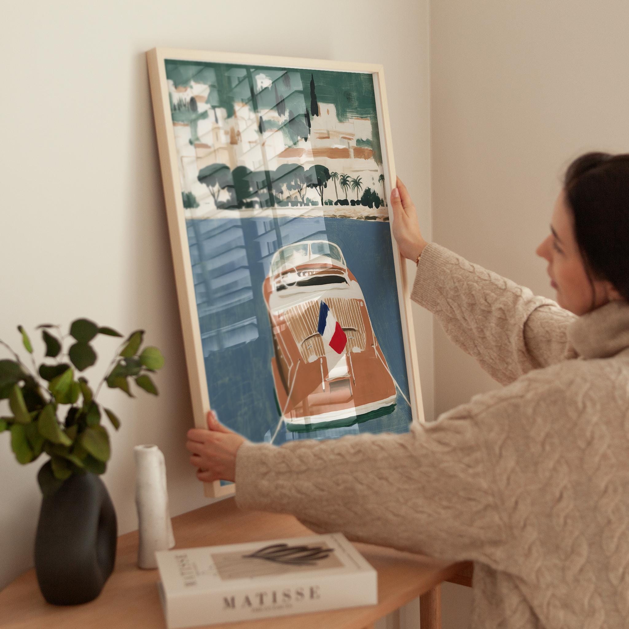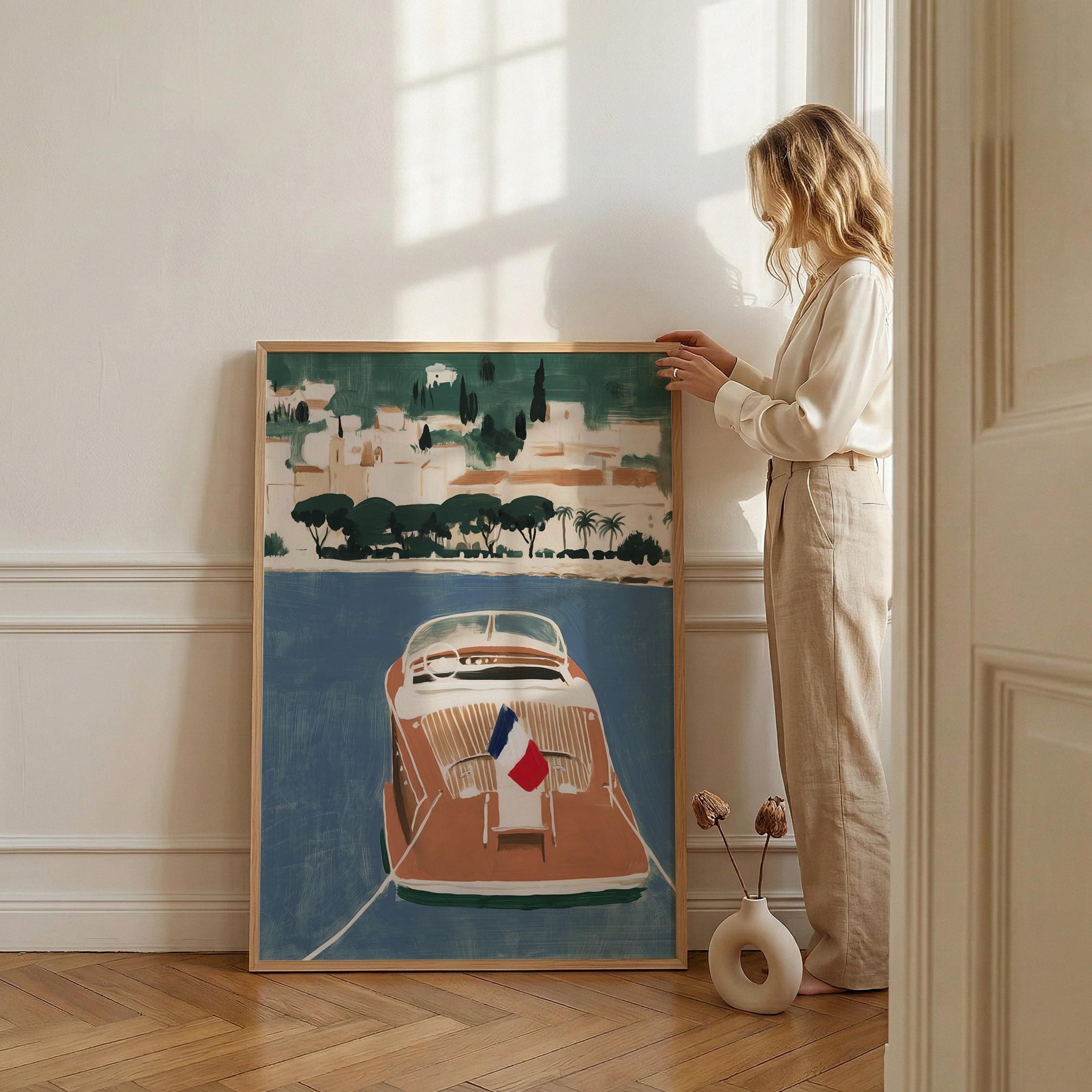 vintage Riva boat painting, perfect for a coastal living room and a great gift for a housewarming celebration.