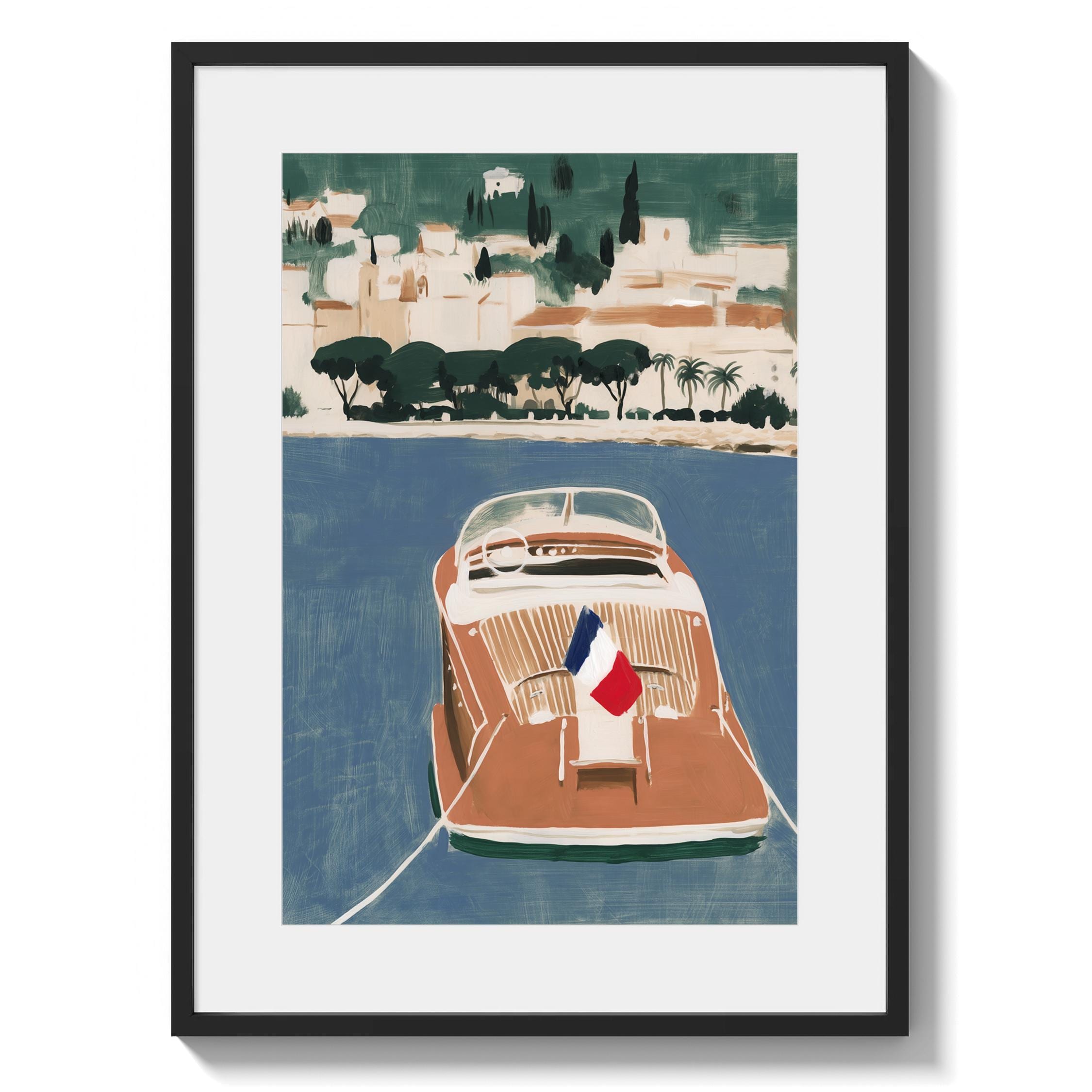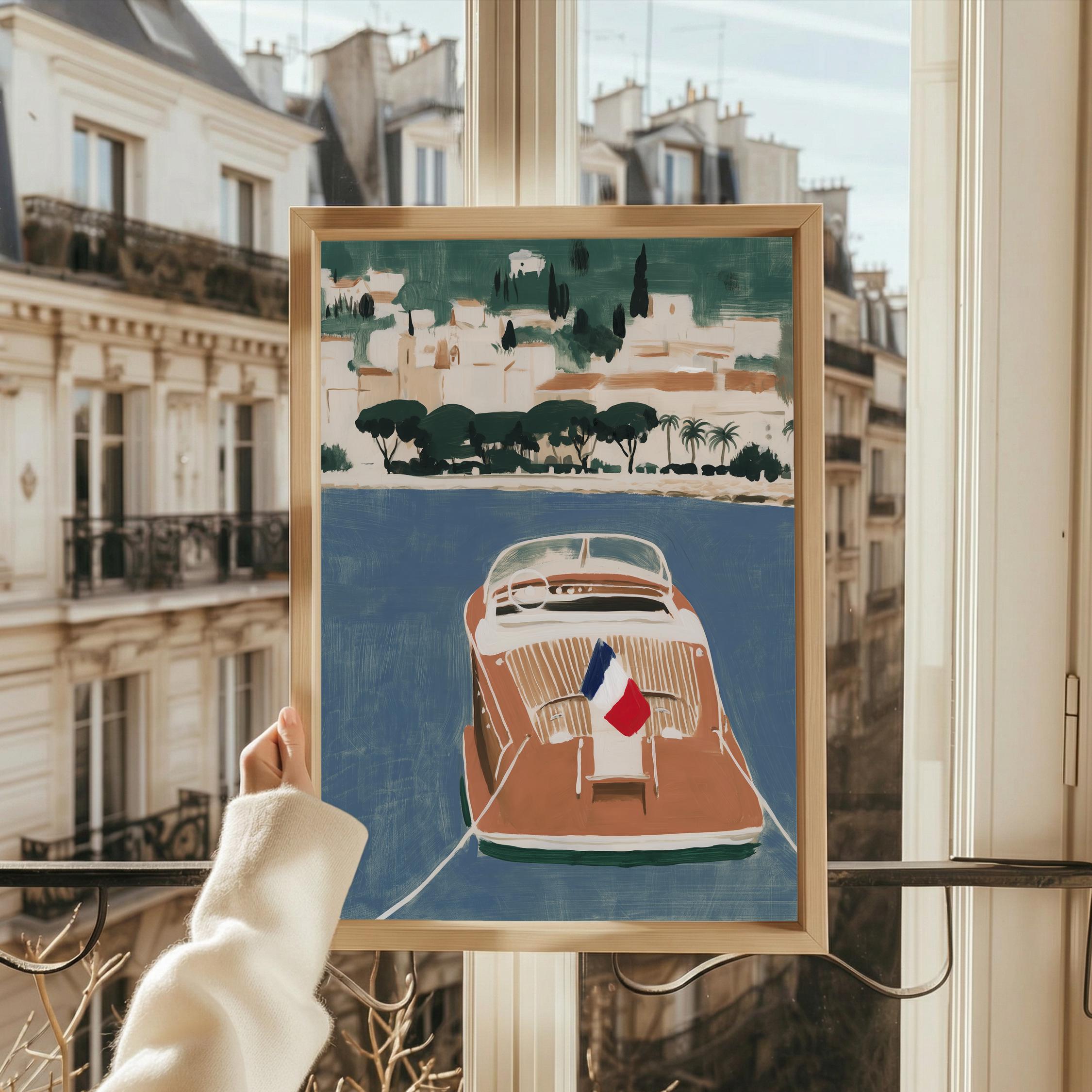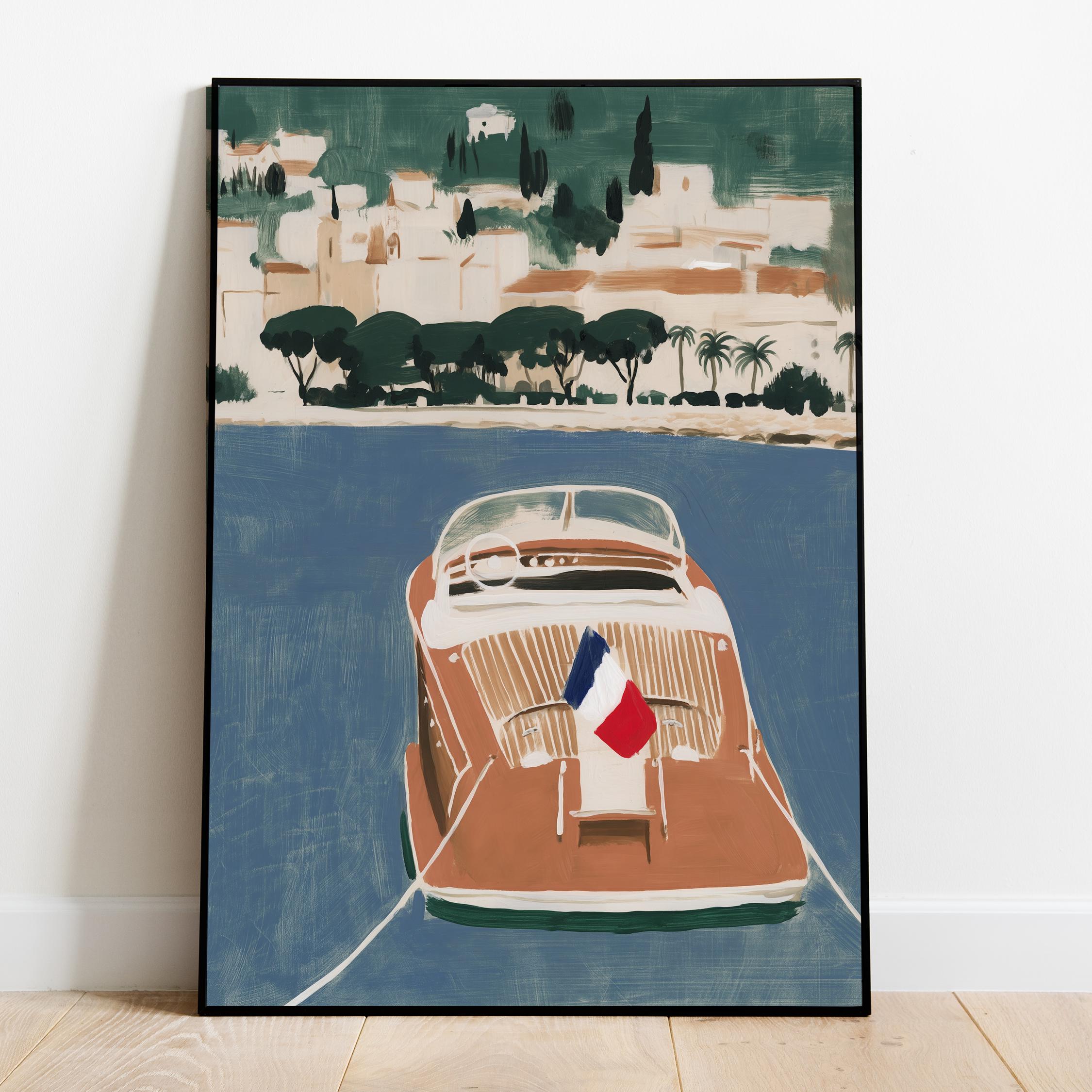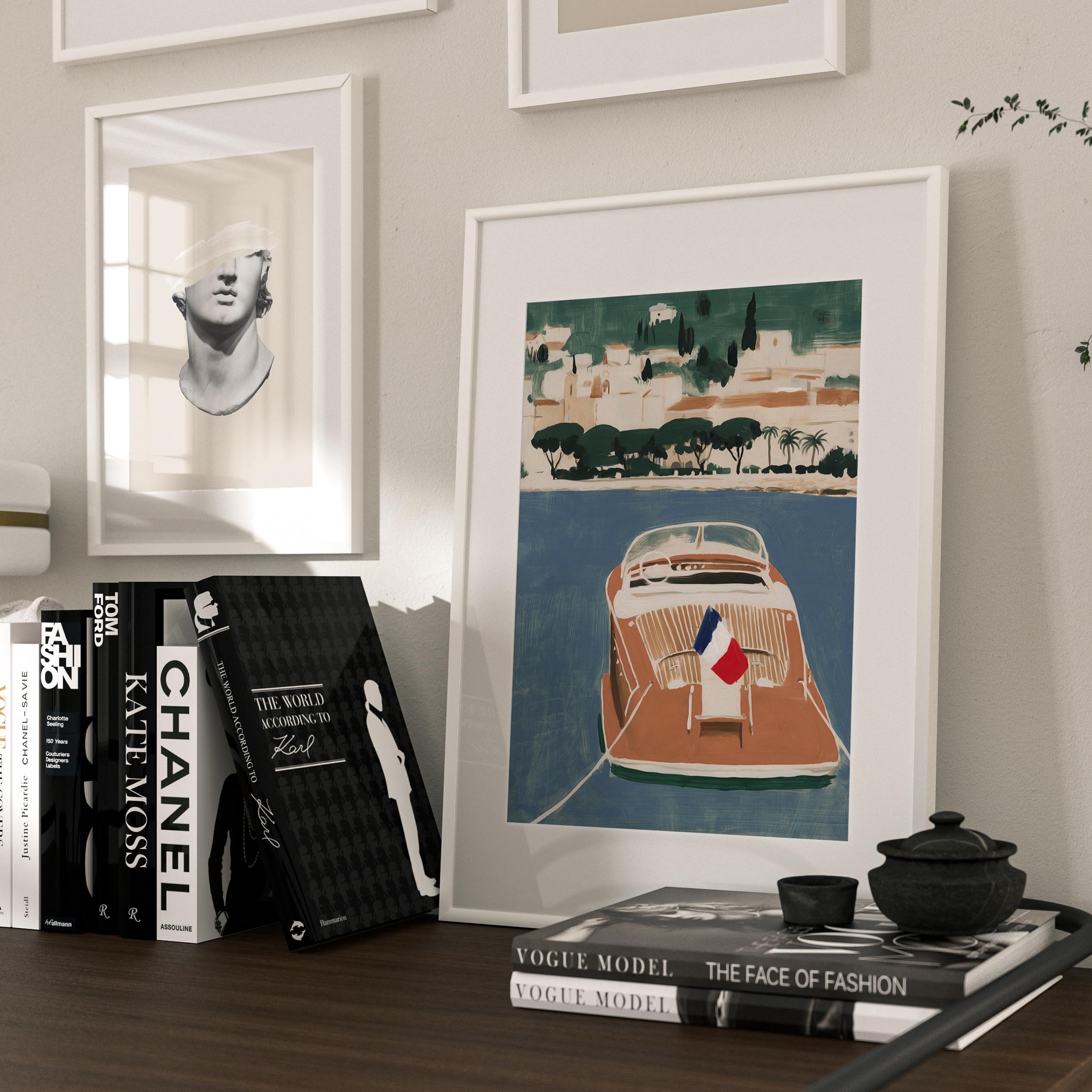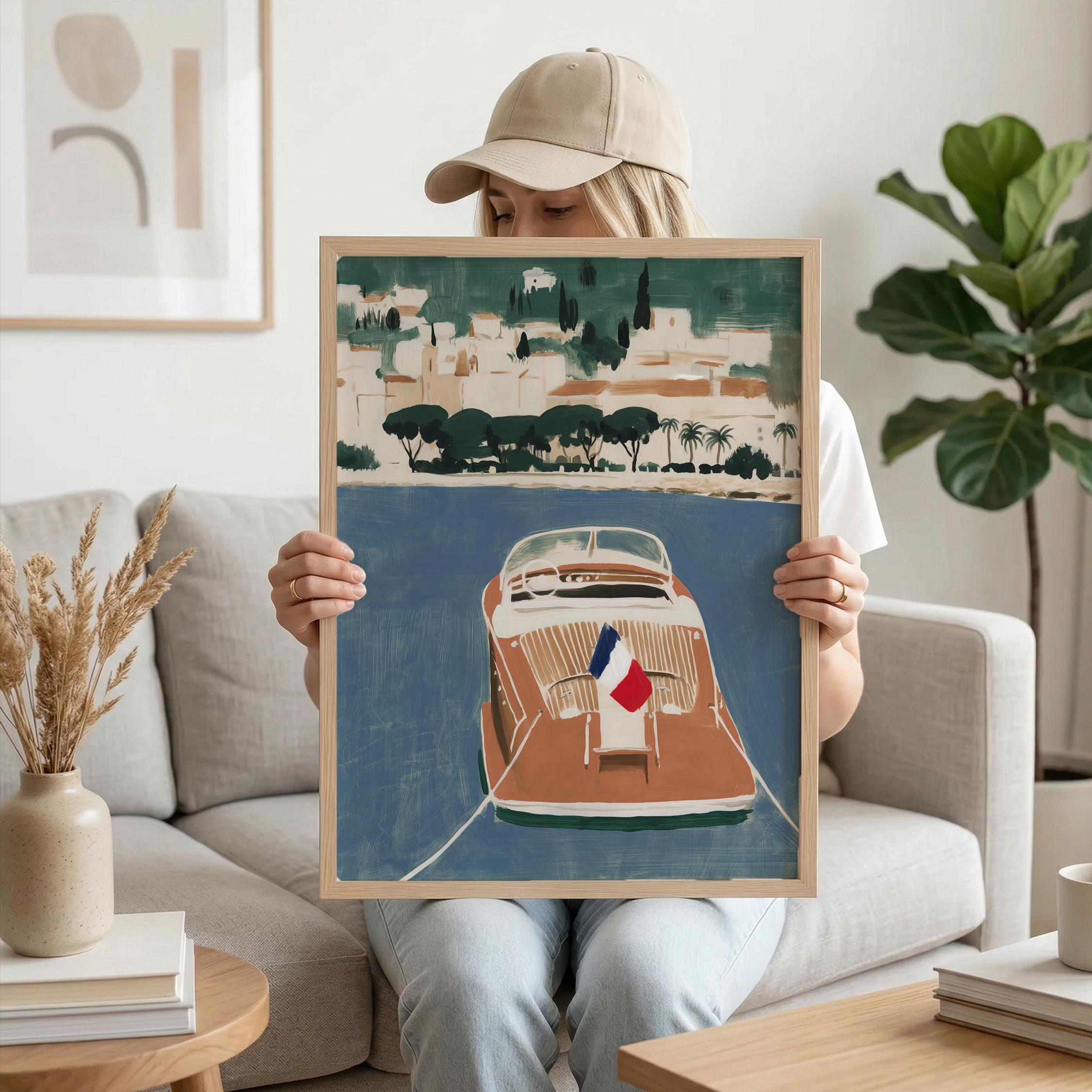 vintage Riva boat painting, perfect for a coastal living room and a great gift for a housewarming celebration.