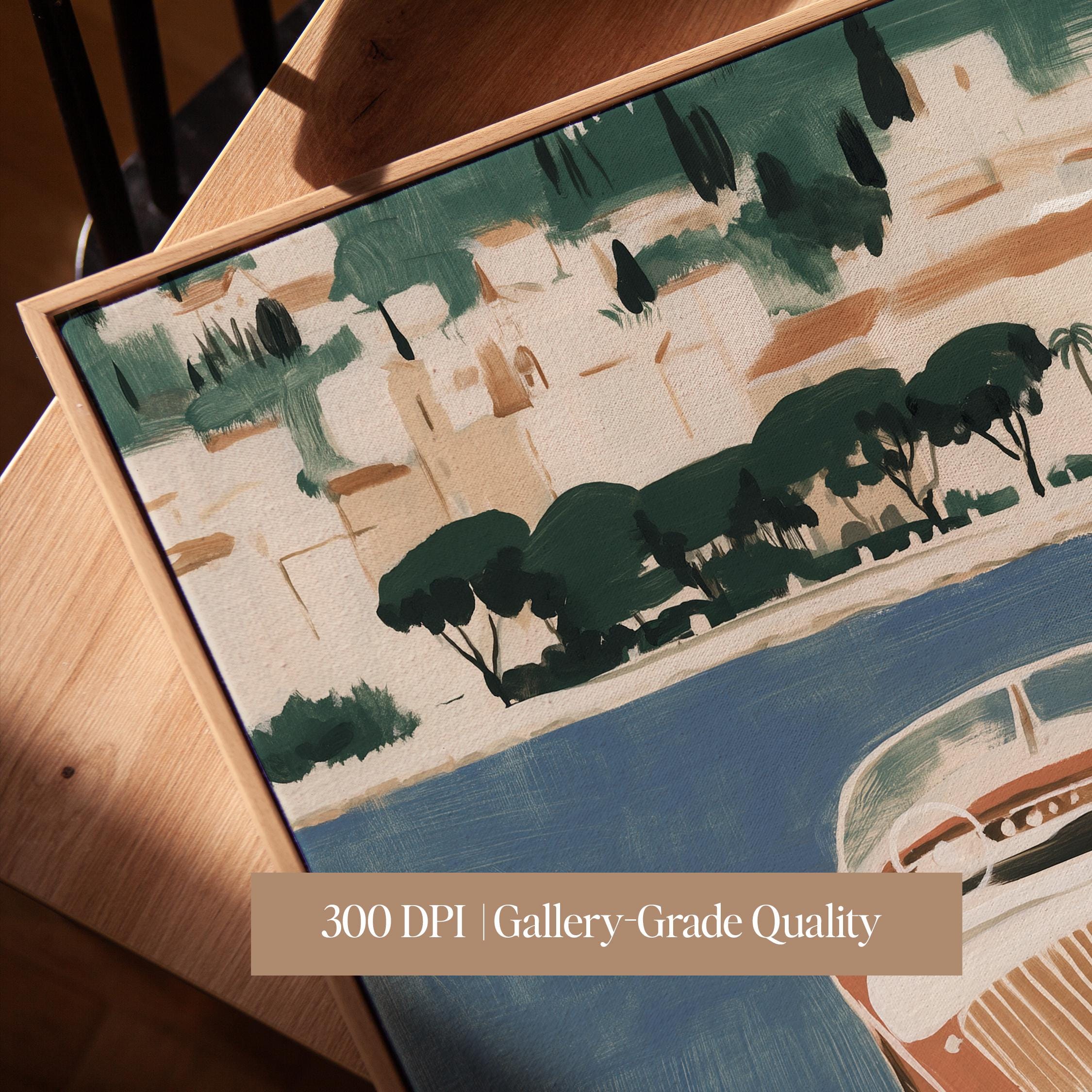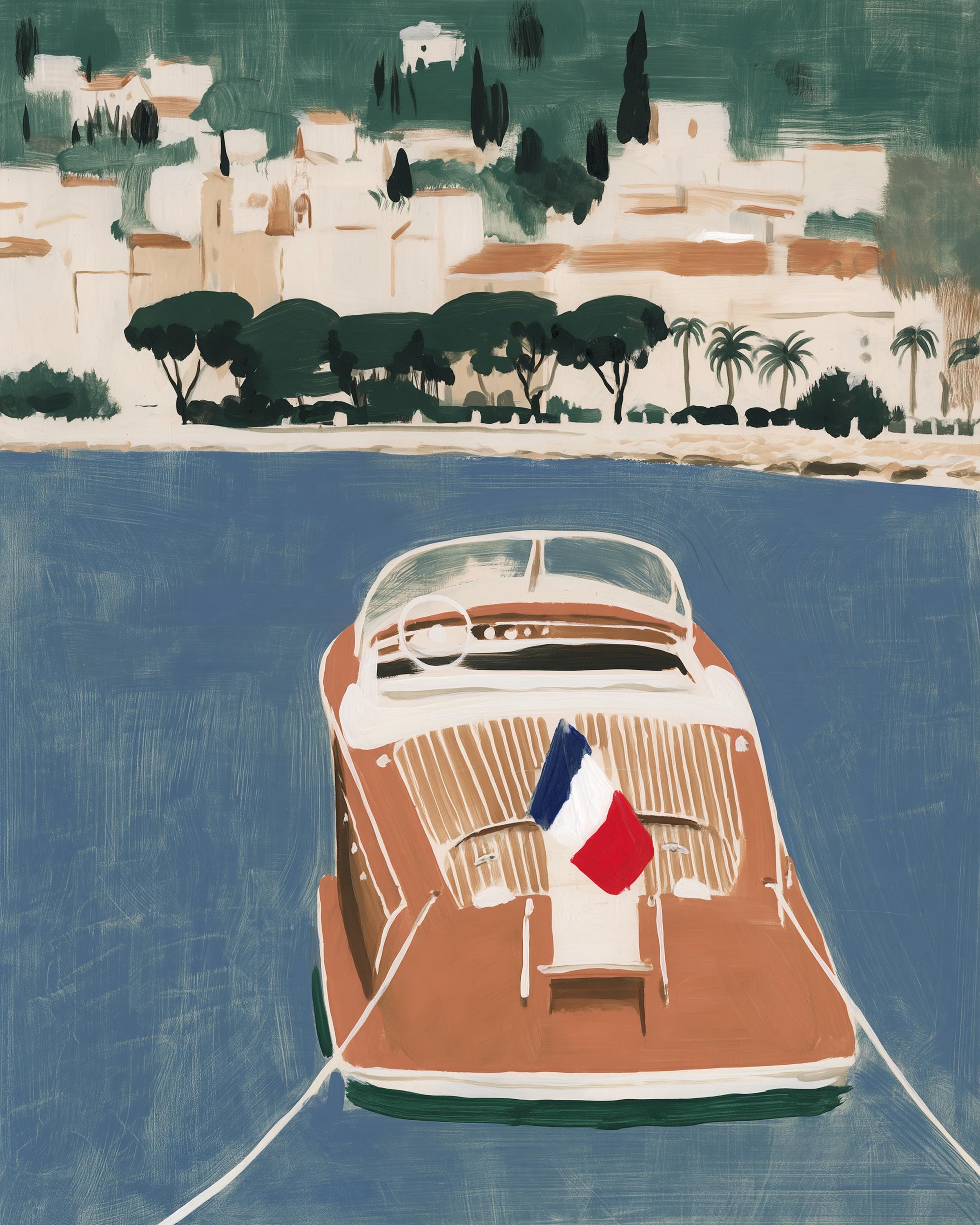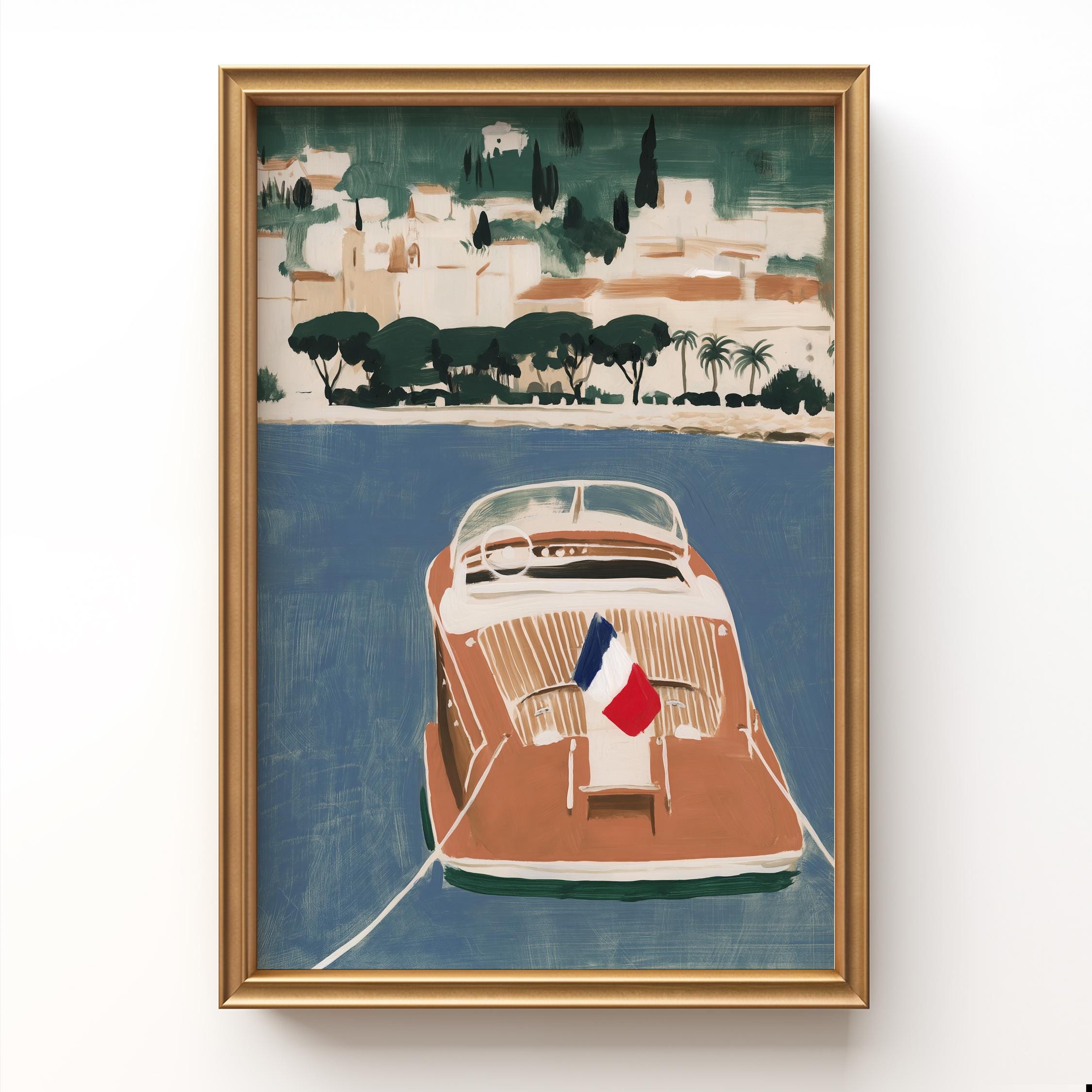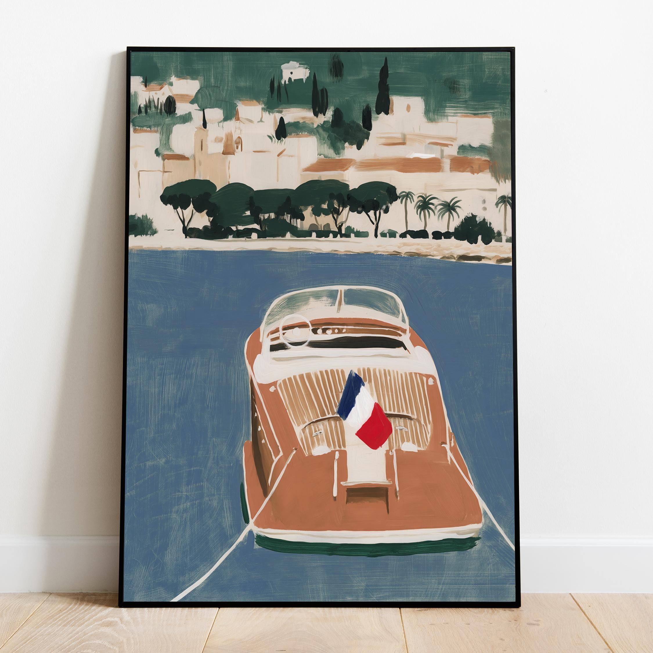 vintage Riva boat painting, perfect for a coastal living room and a great gift for a housewarming celebration.