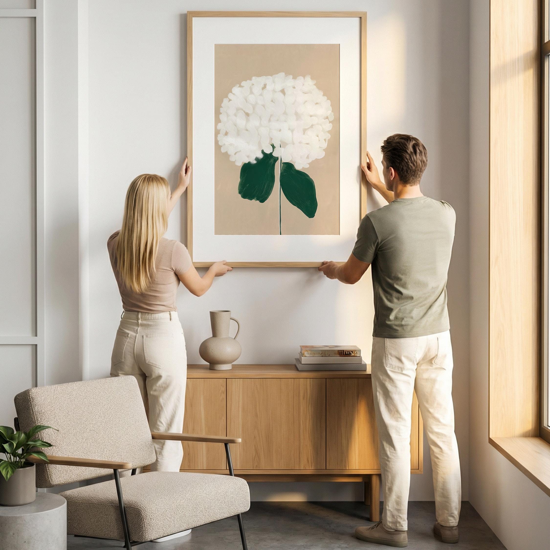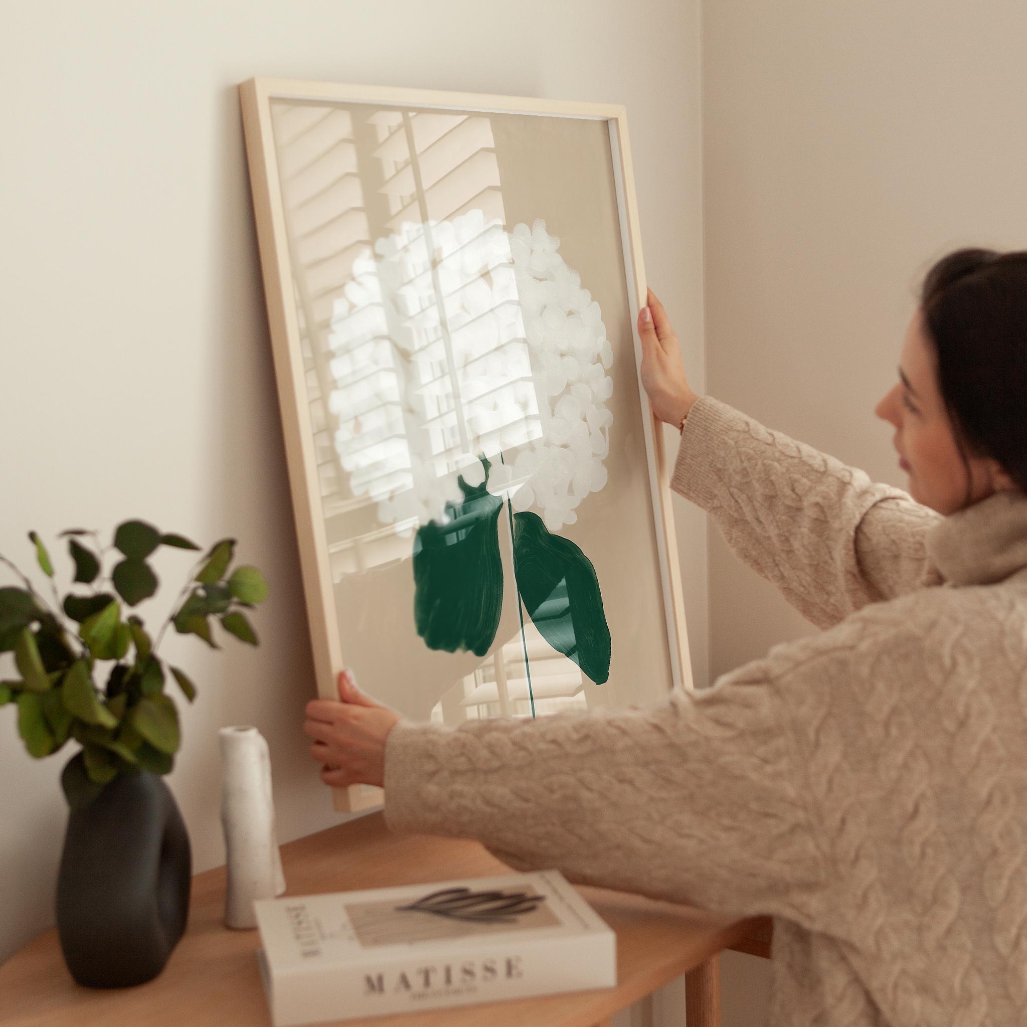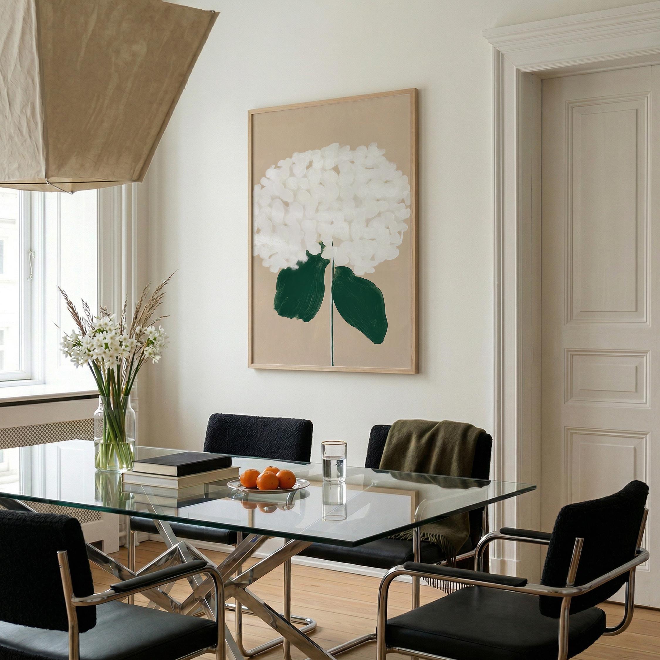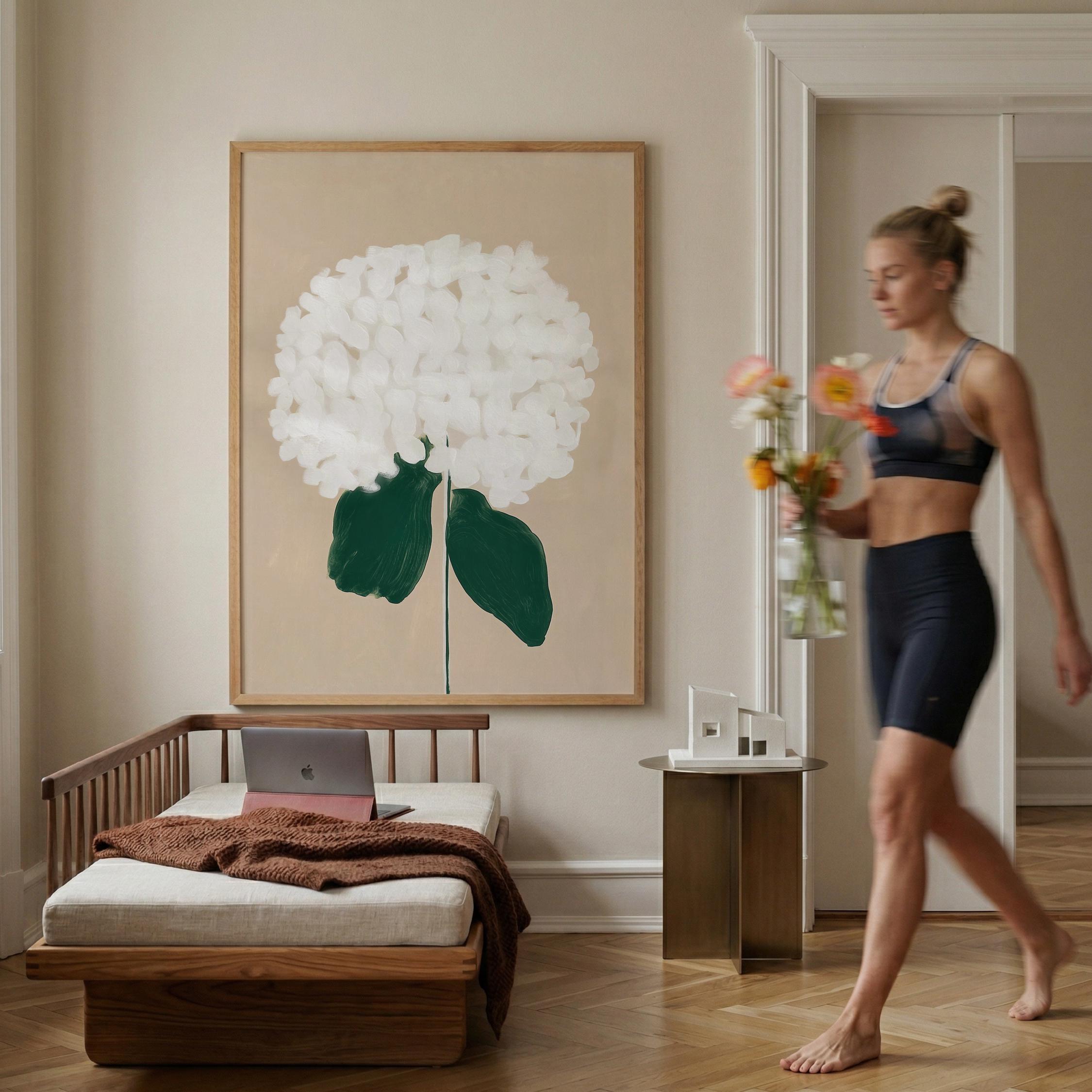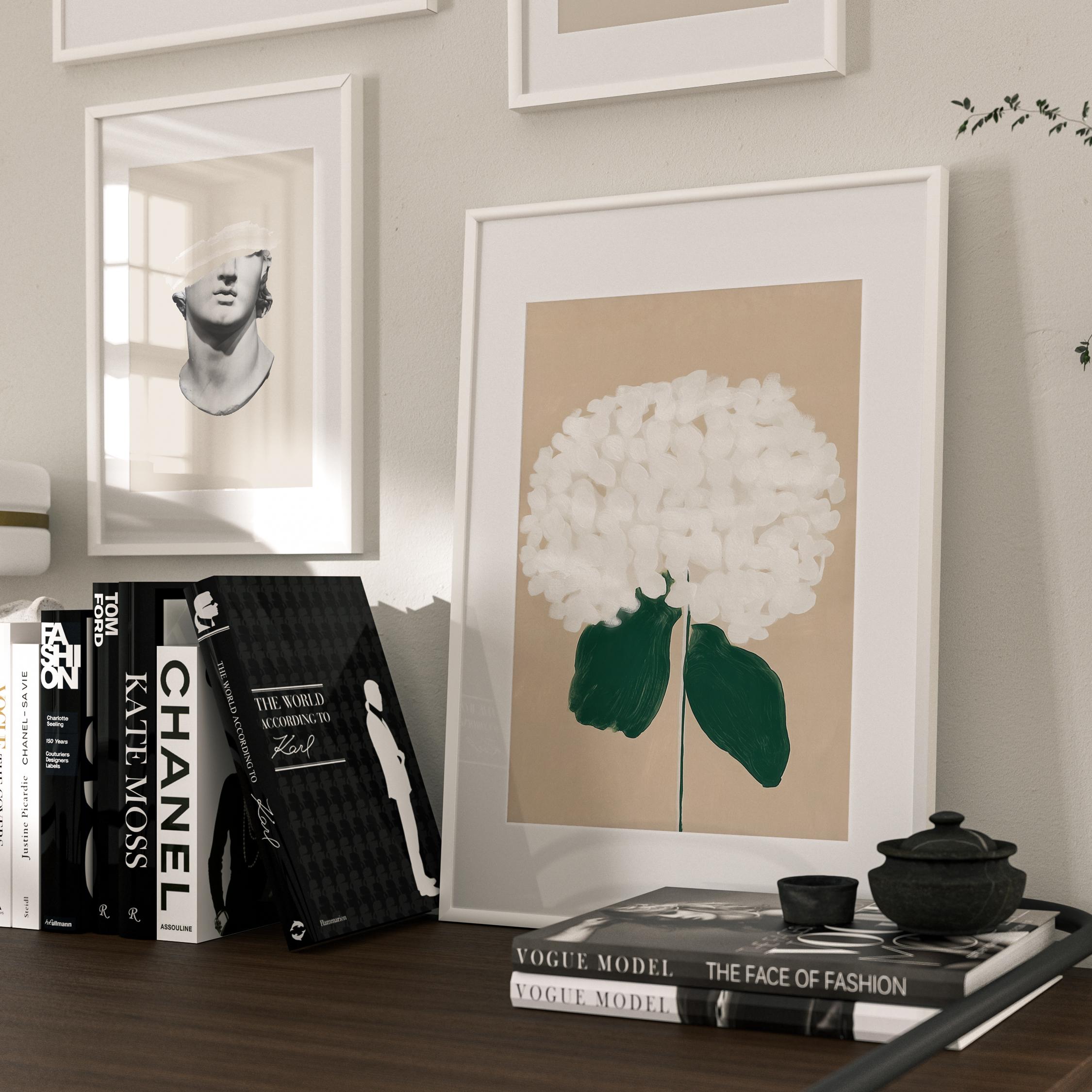 a serene white hydrangea painting, perfect for a cozy bedroom and a great gift for a housewarming gift.