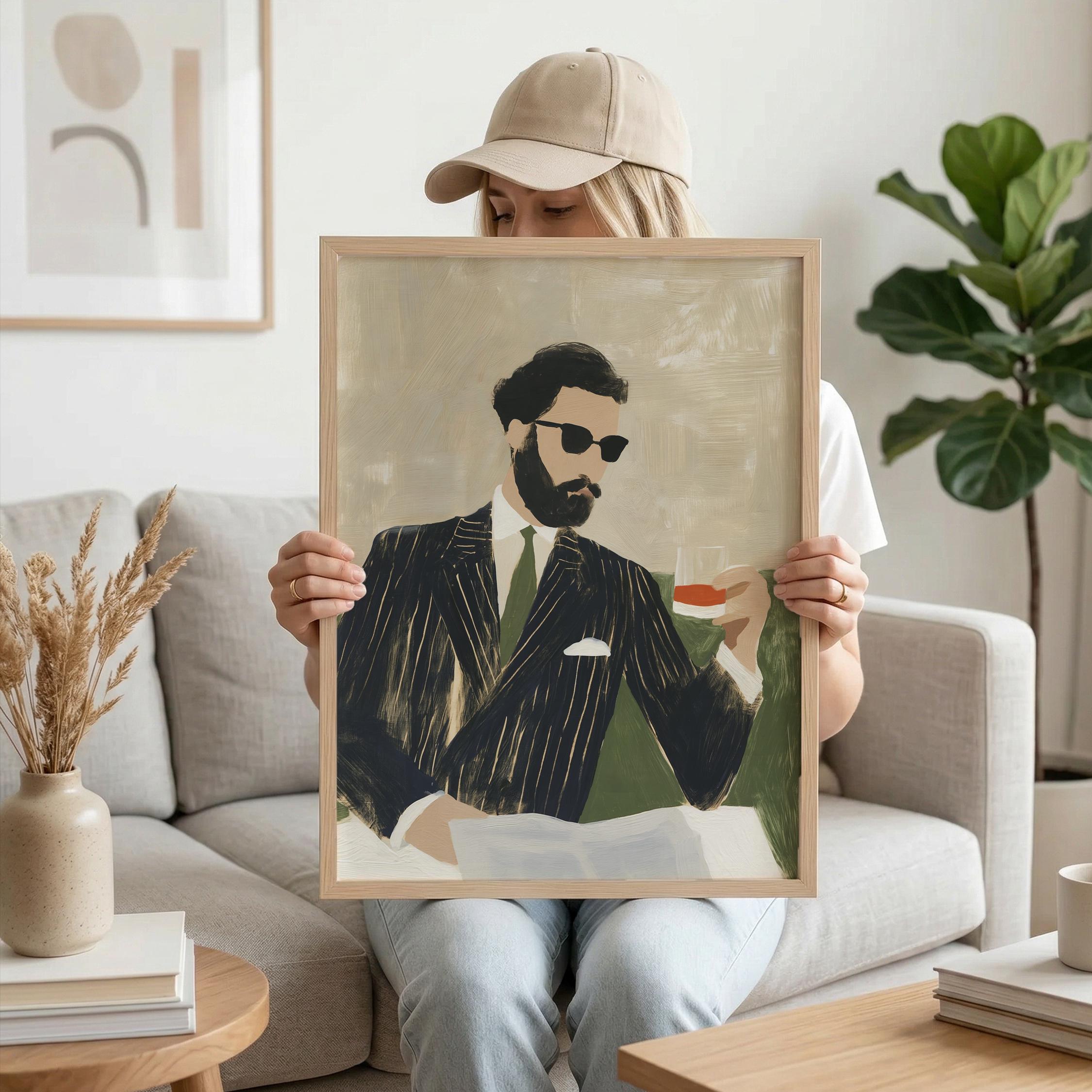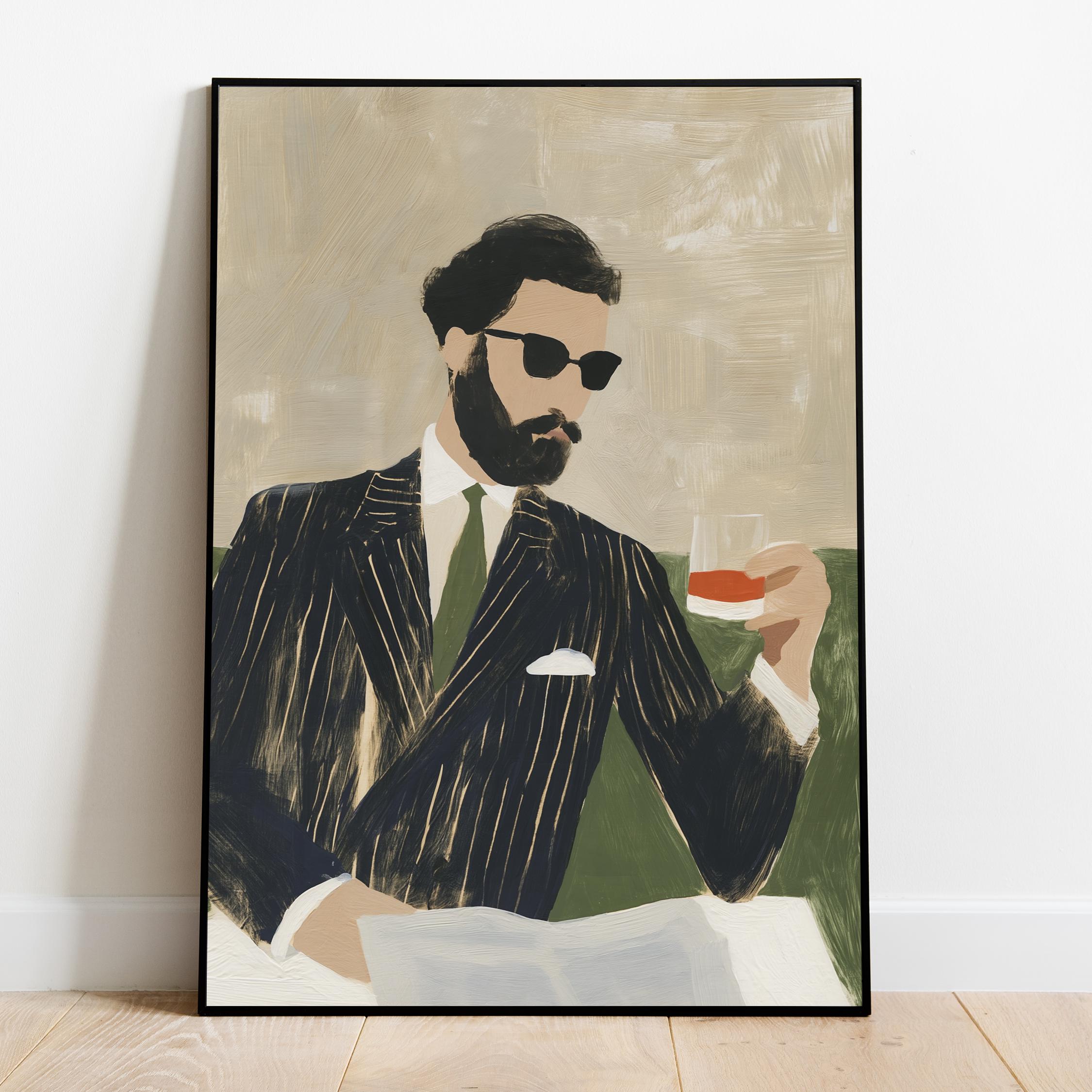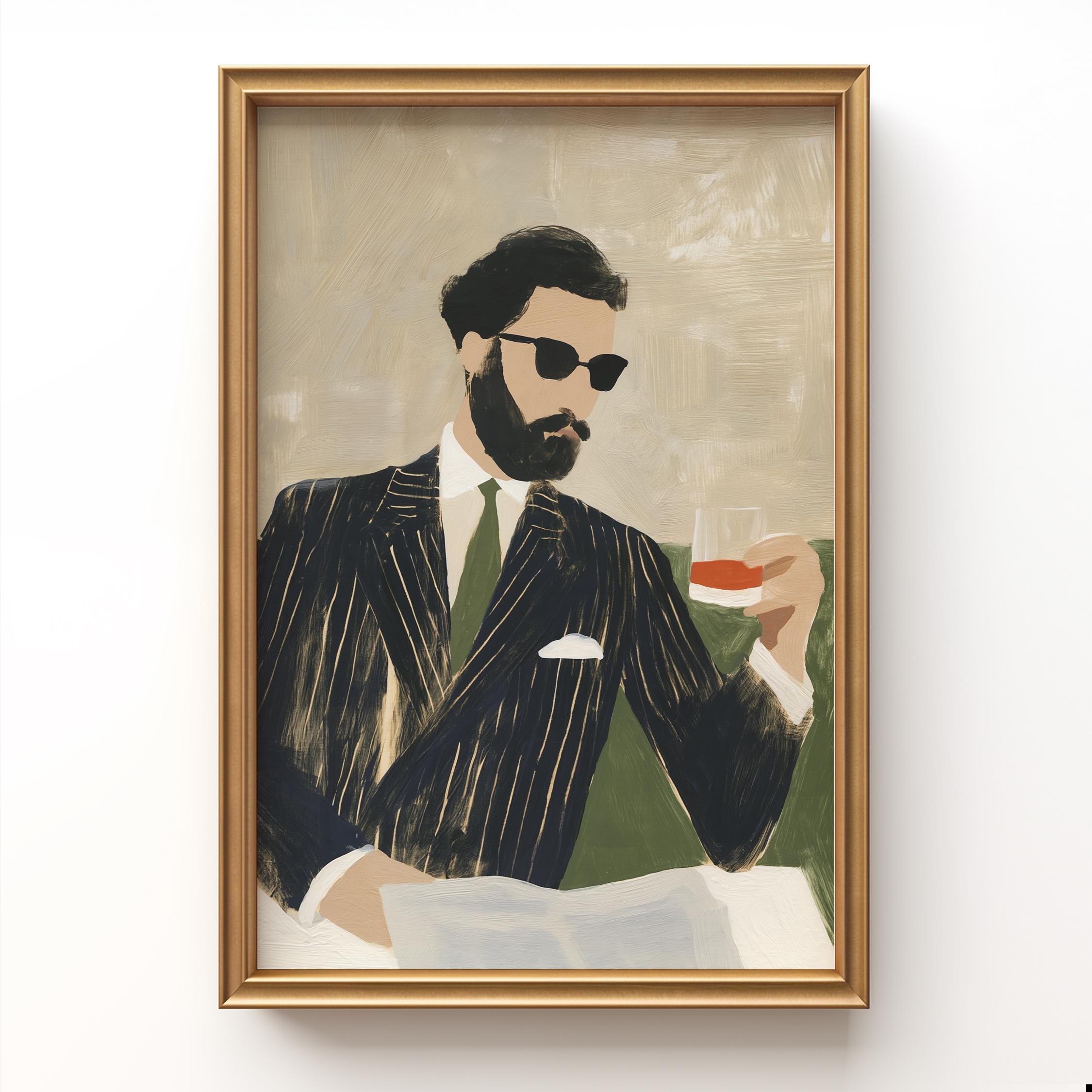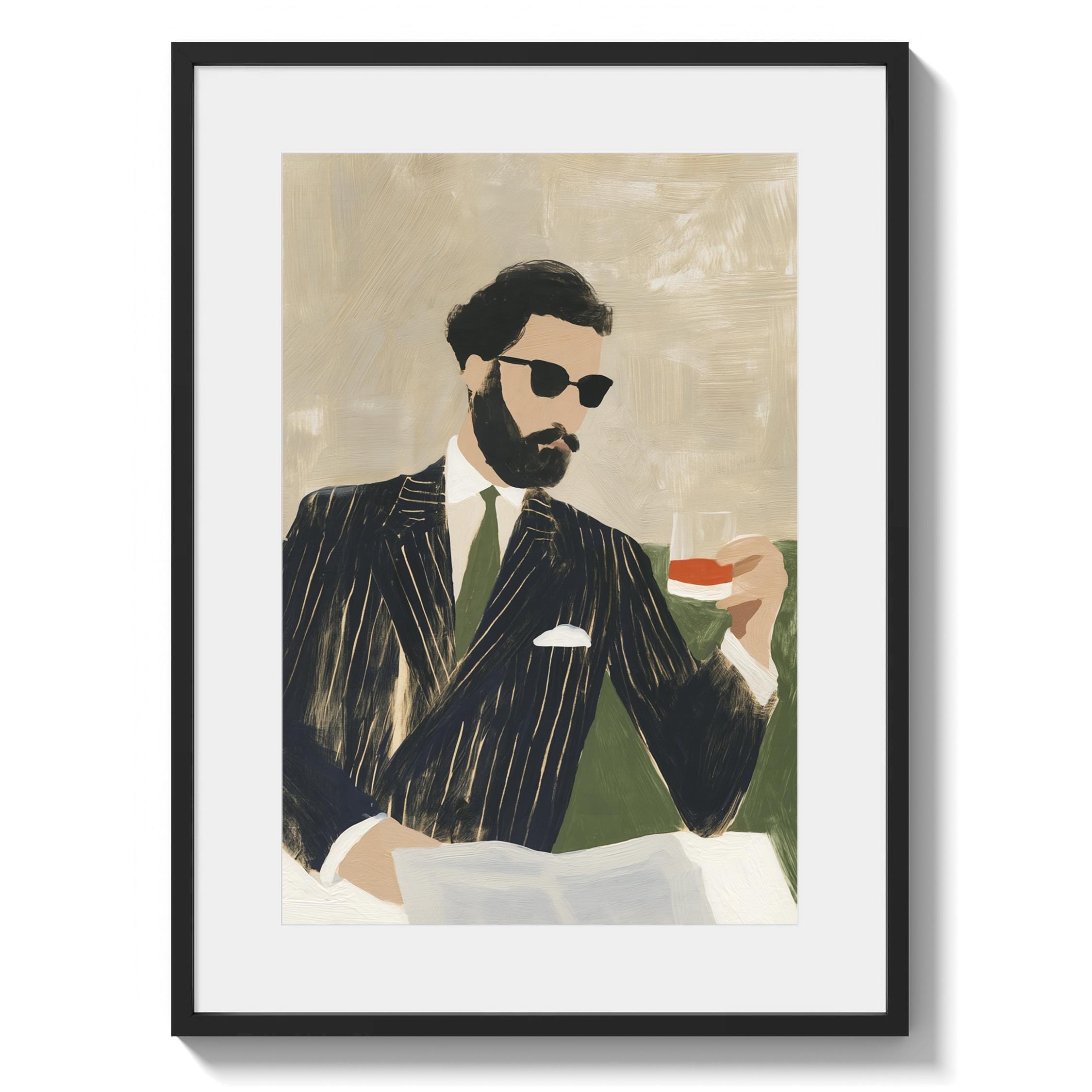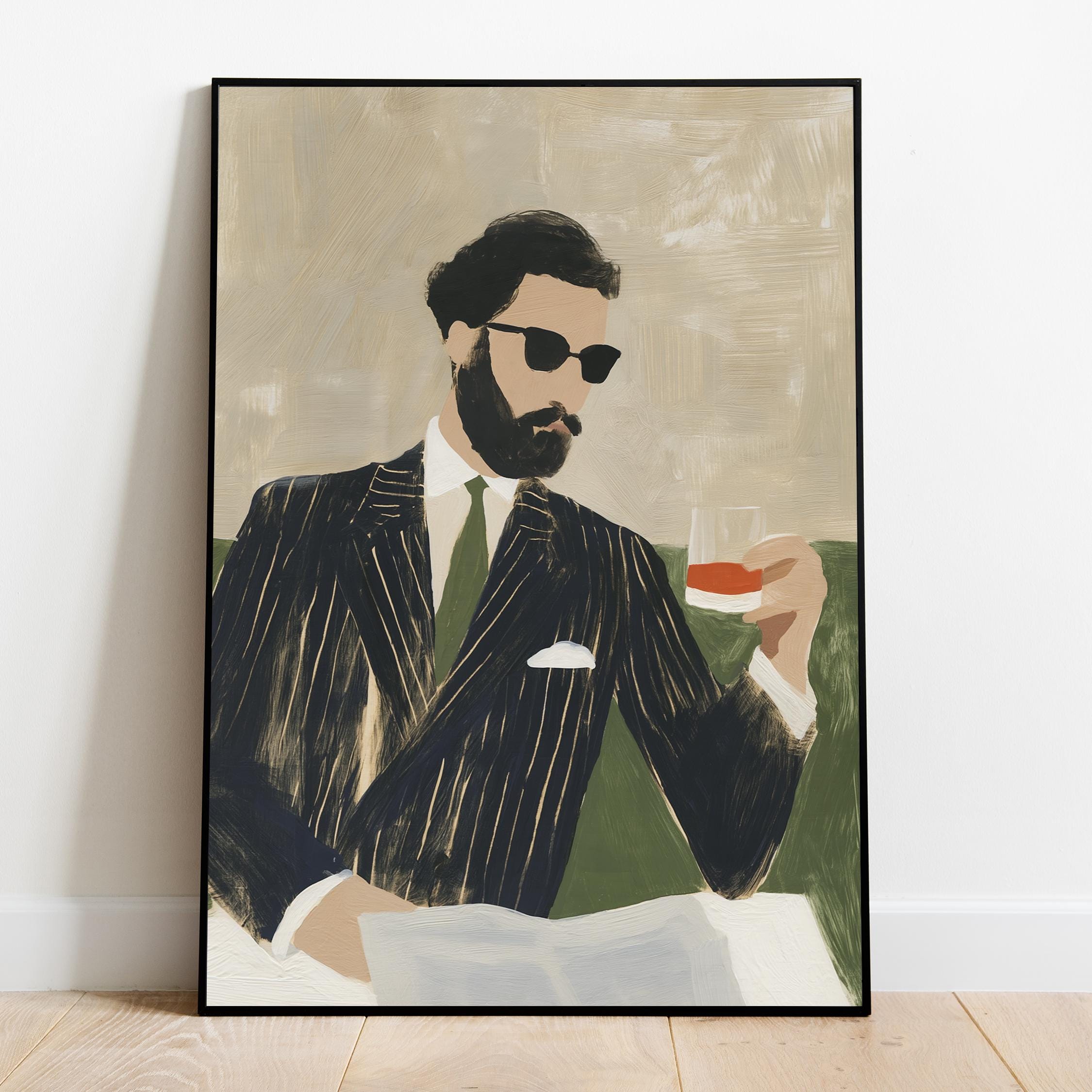a stylish gentleman enjoying a fine whisky, perfect for a living room or home bar and a great gift for a birthday or housewarming celebration.