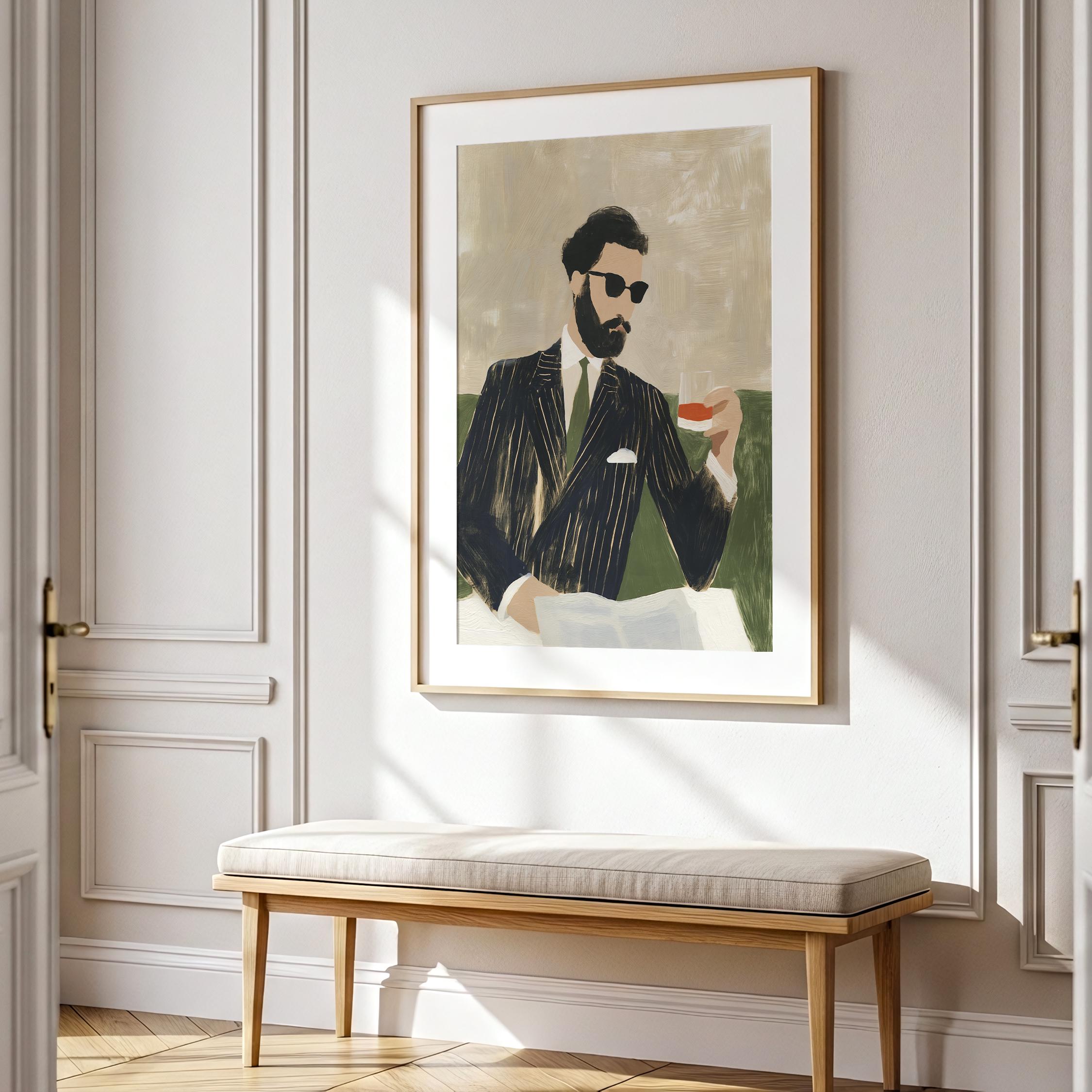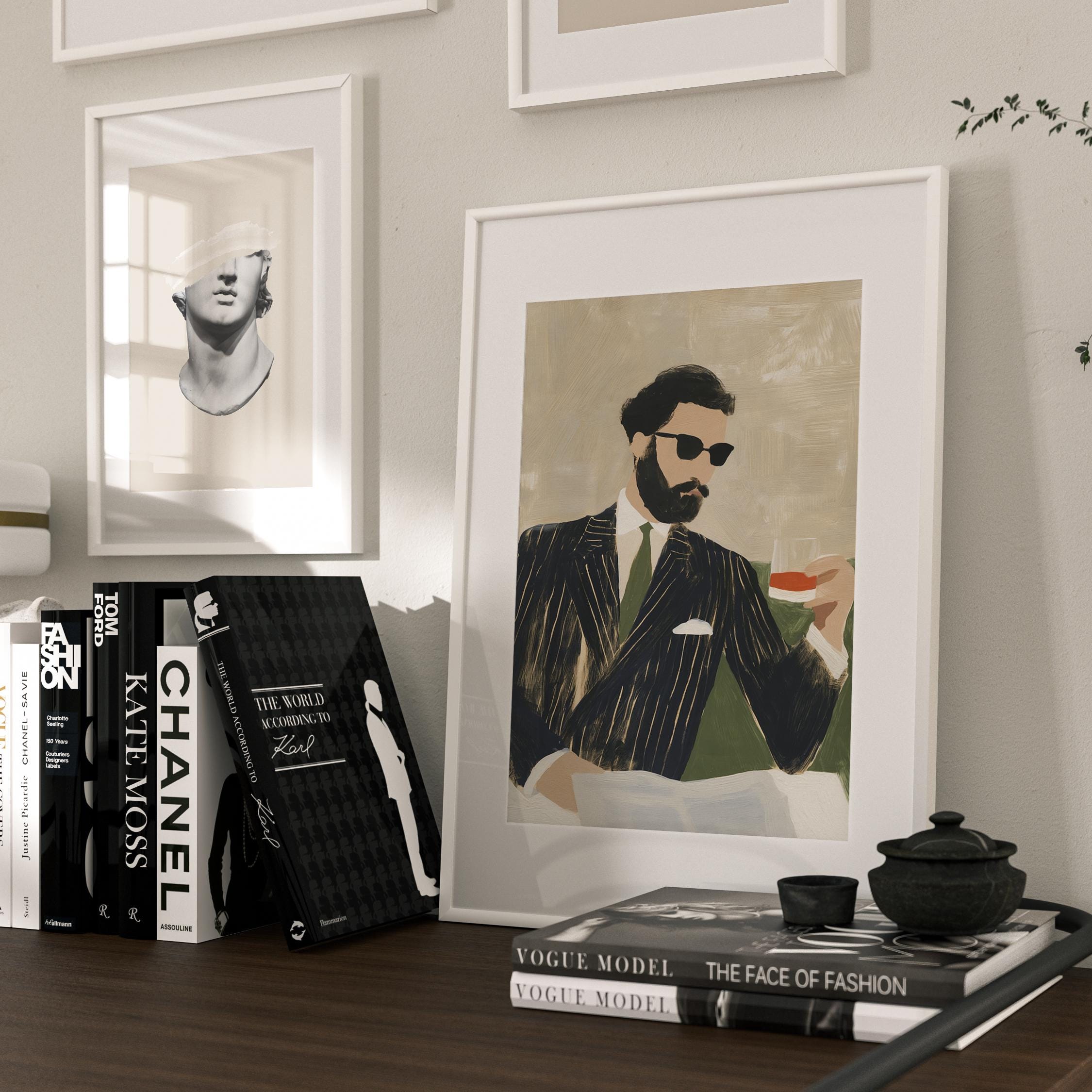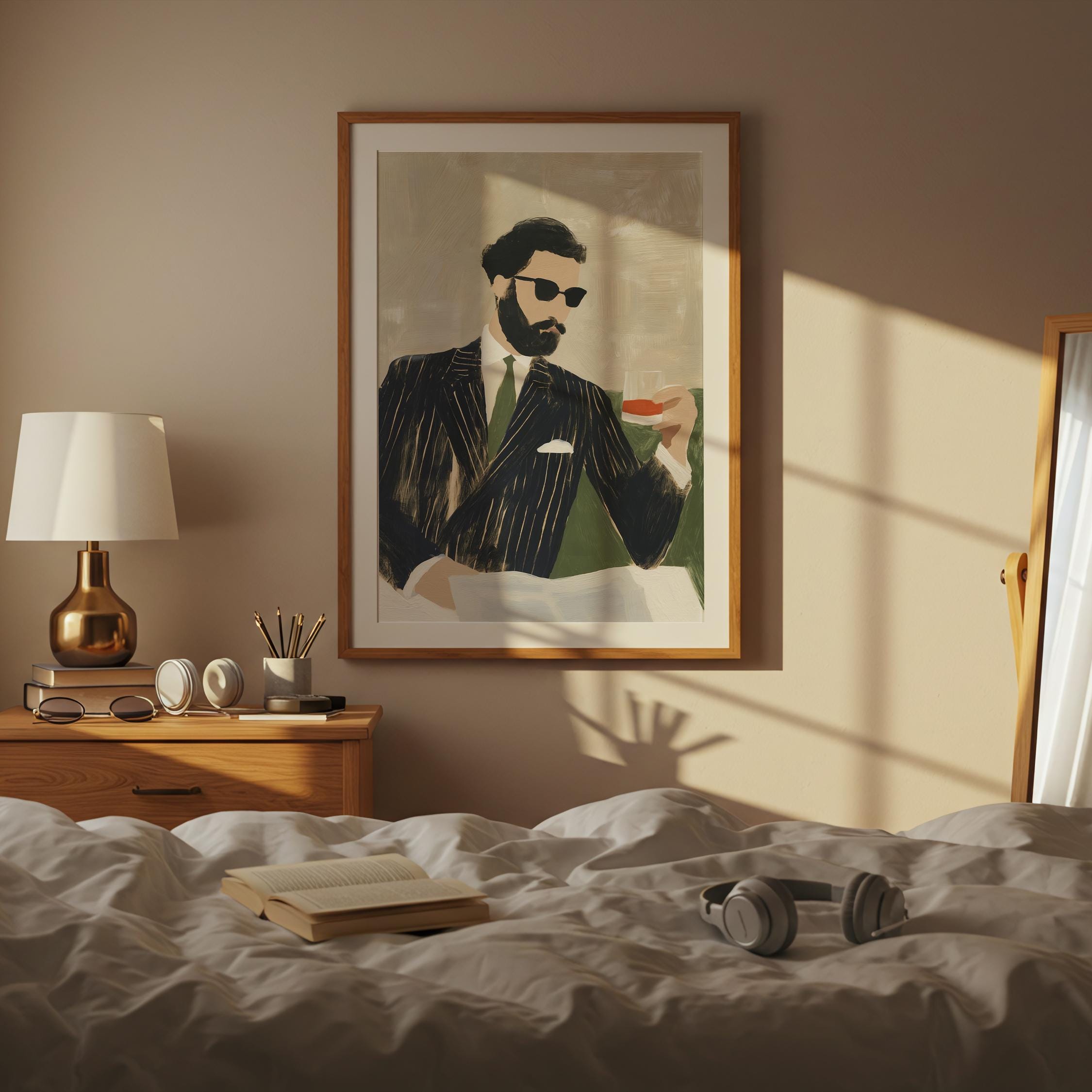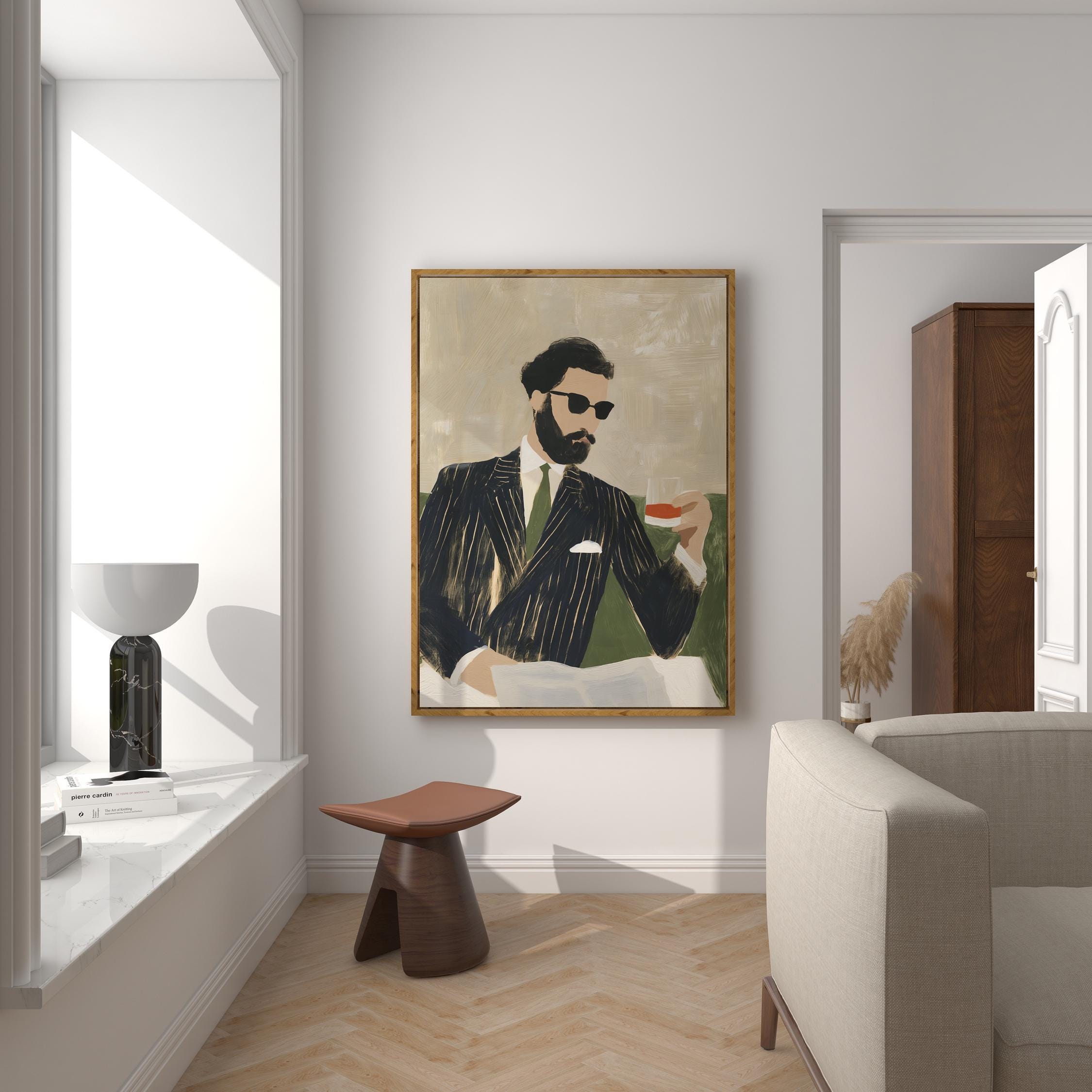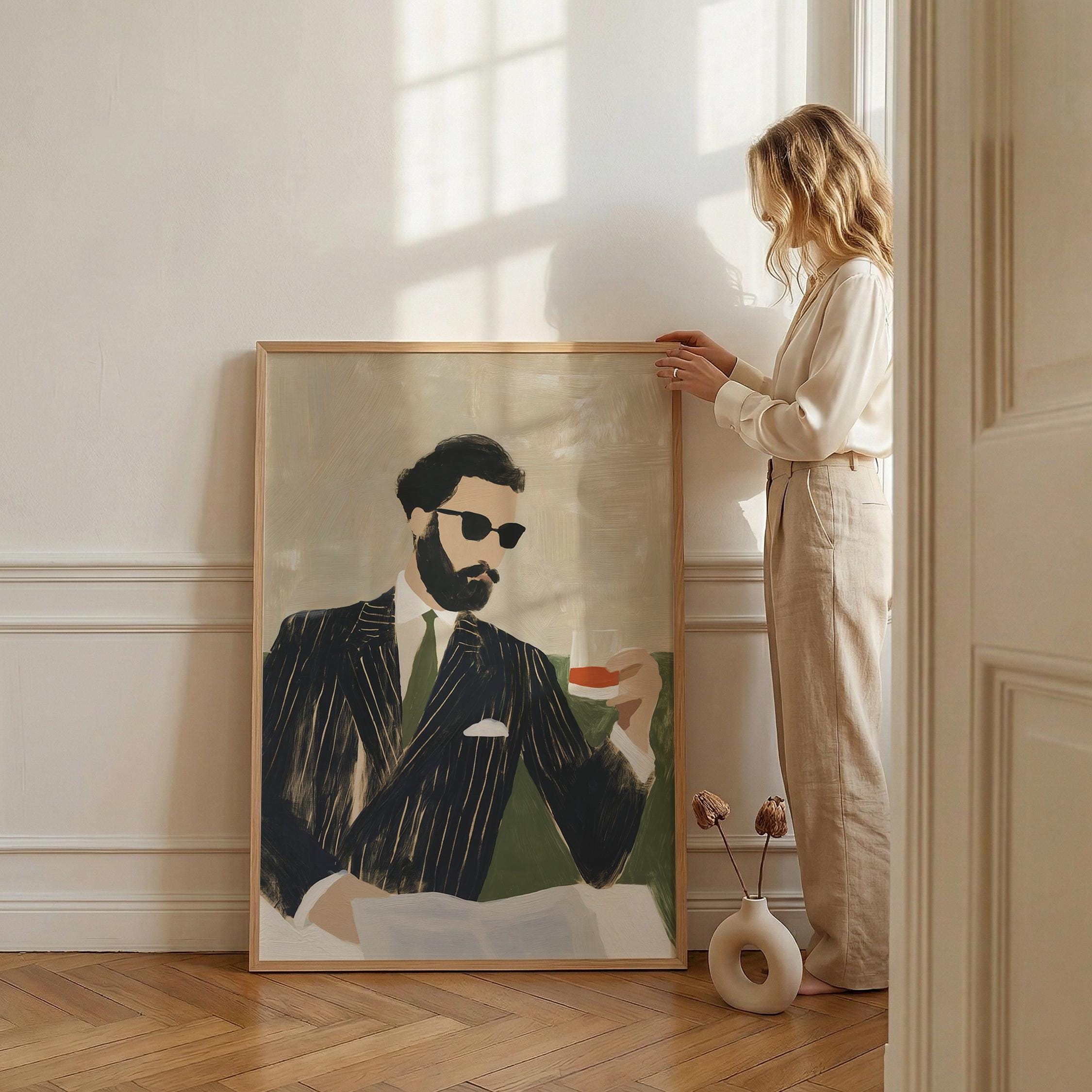 a stylish gentleman enjoying a fine whisky, perfect for a living room or home bar and a great gift for a birthday or housewarming celebration.