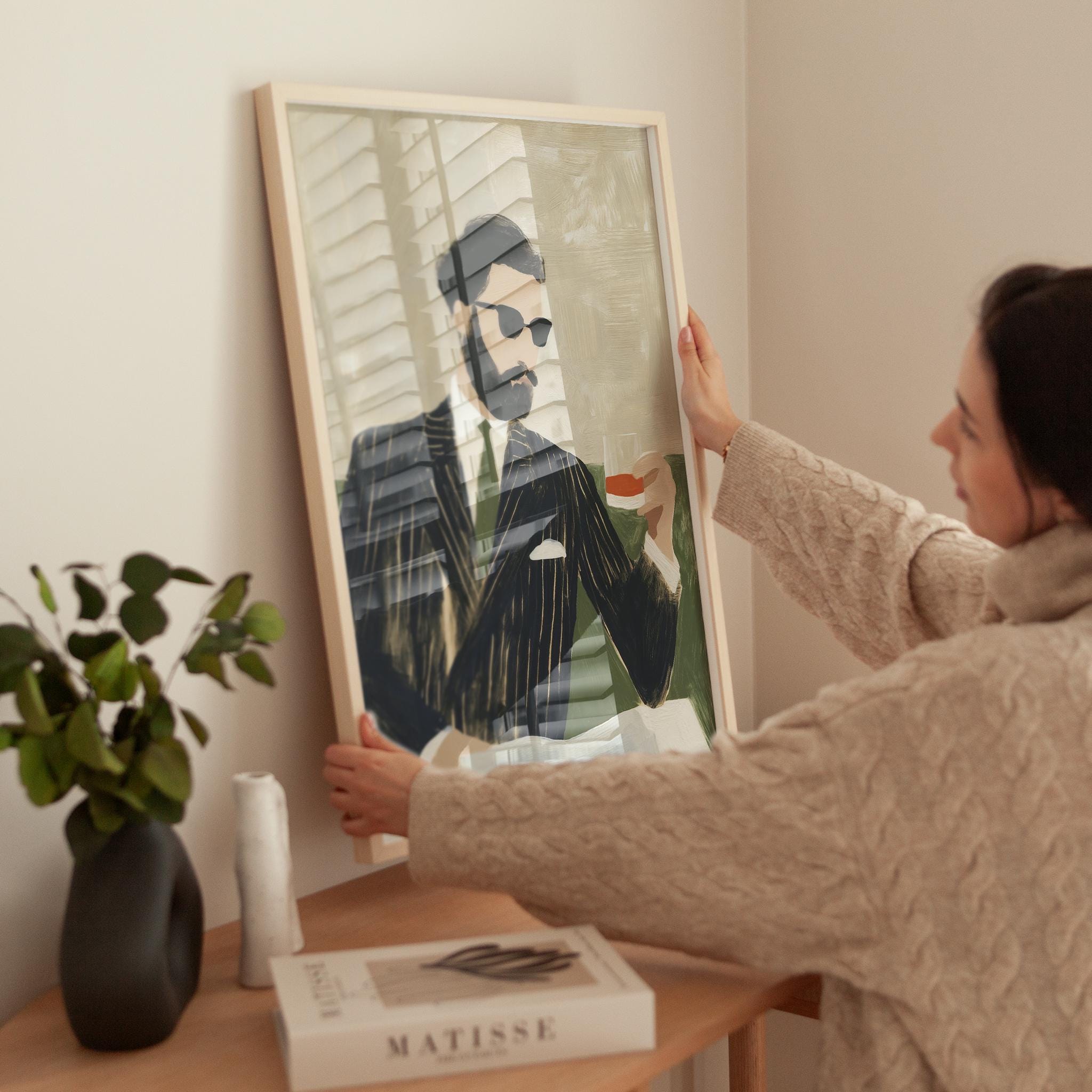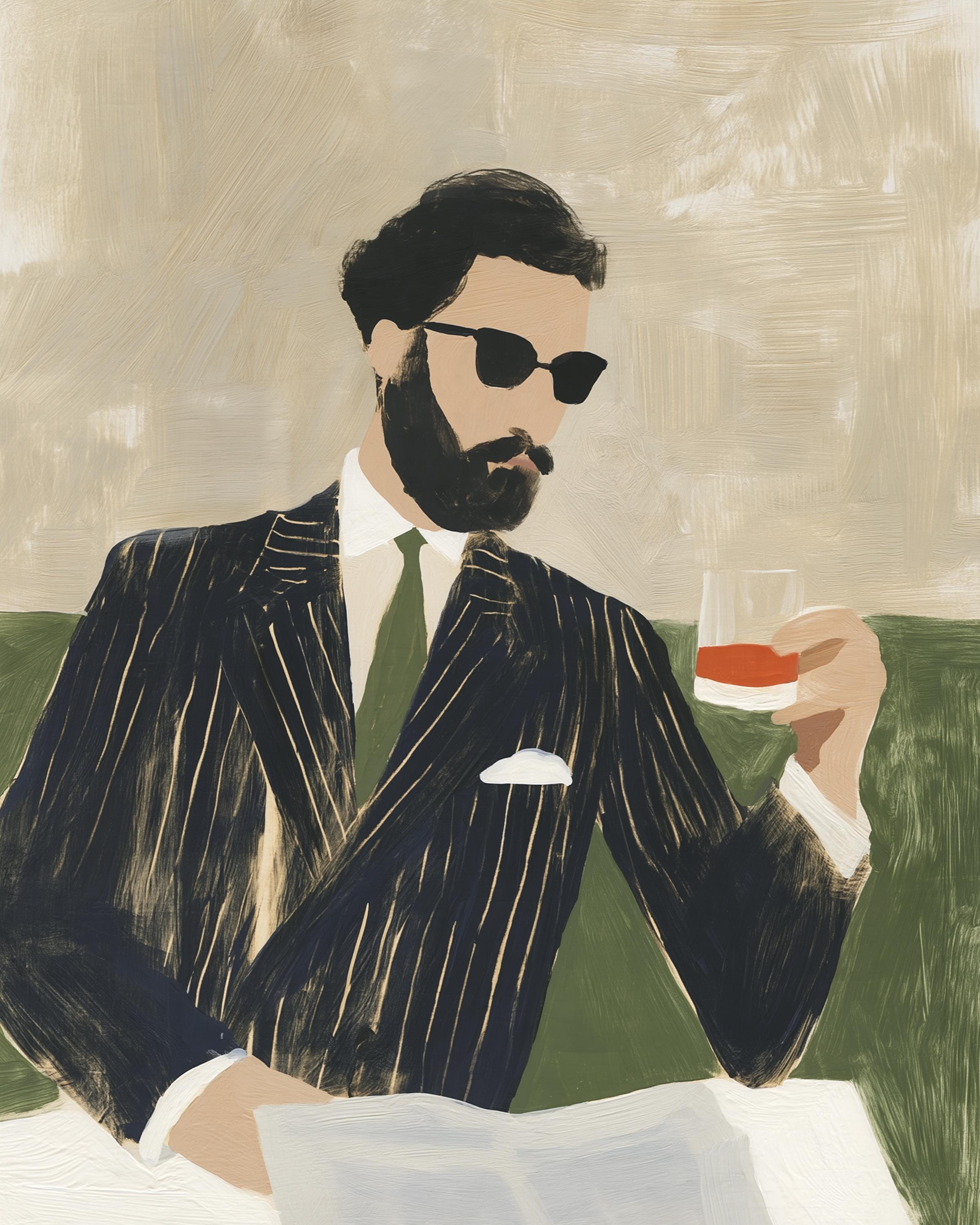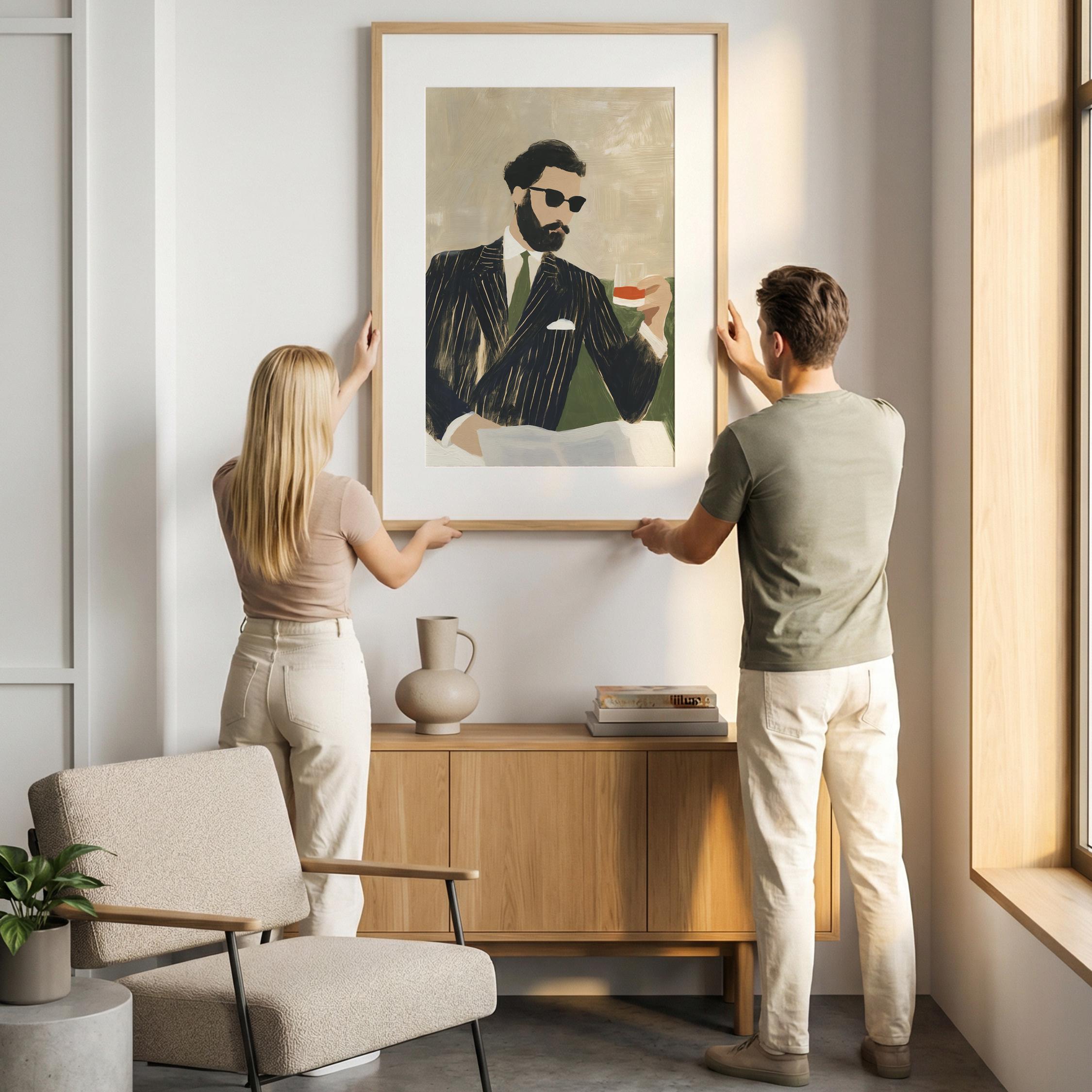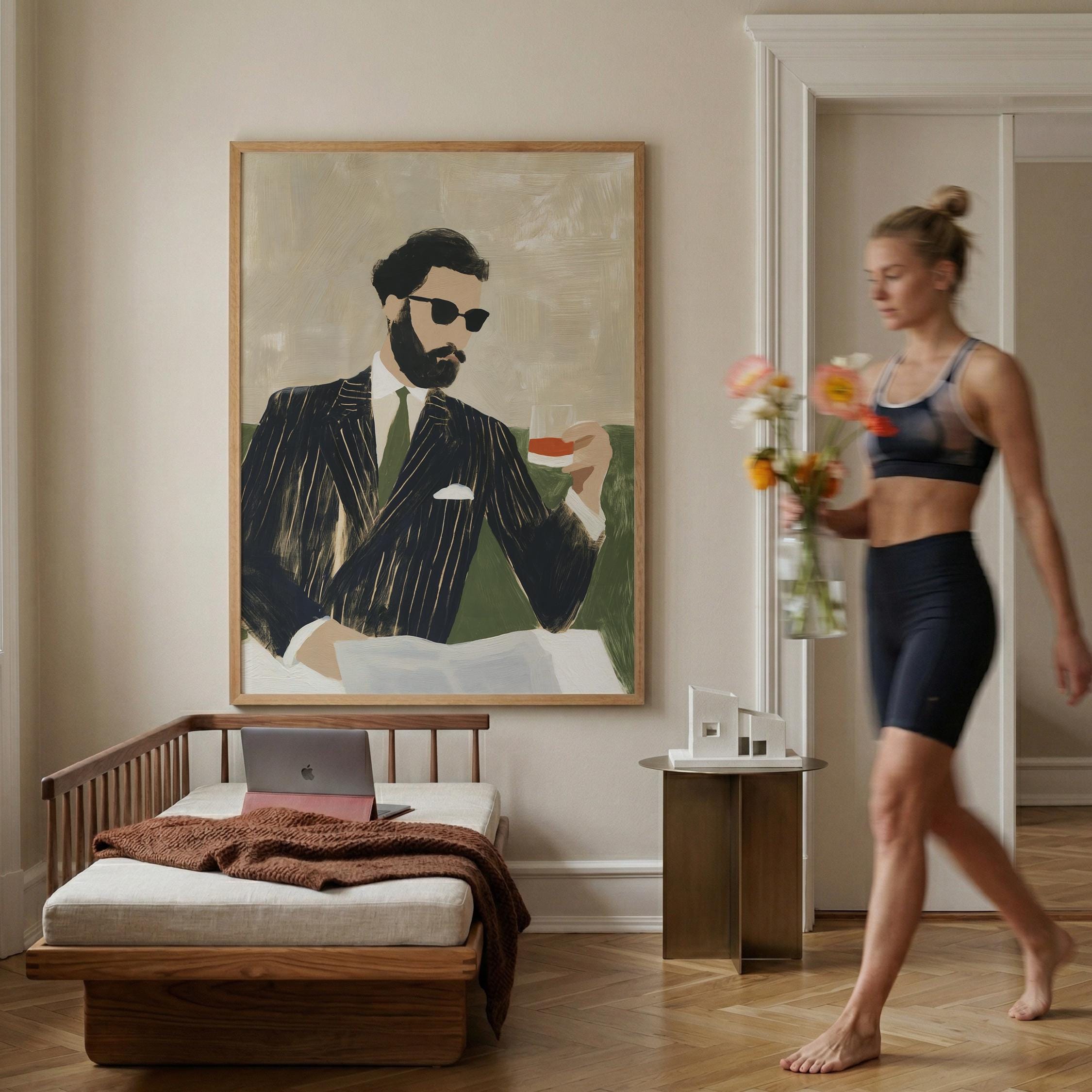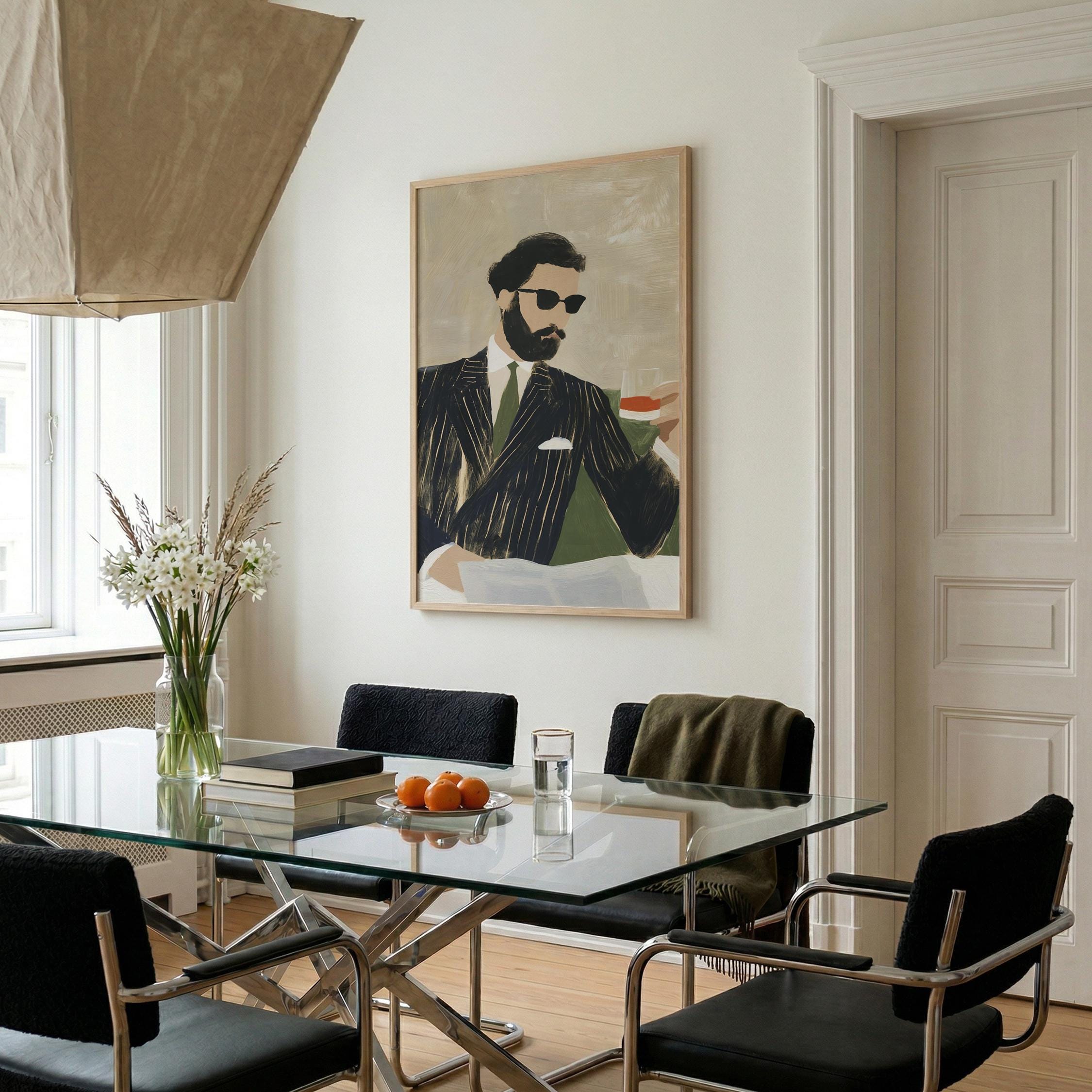 a stylish gentleman enjoying a fine whisky, perfect for a living room or home bar and a great gift for a birthday or housewarming celebration.