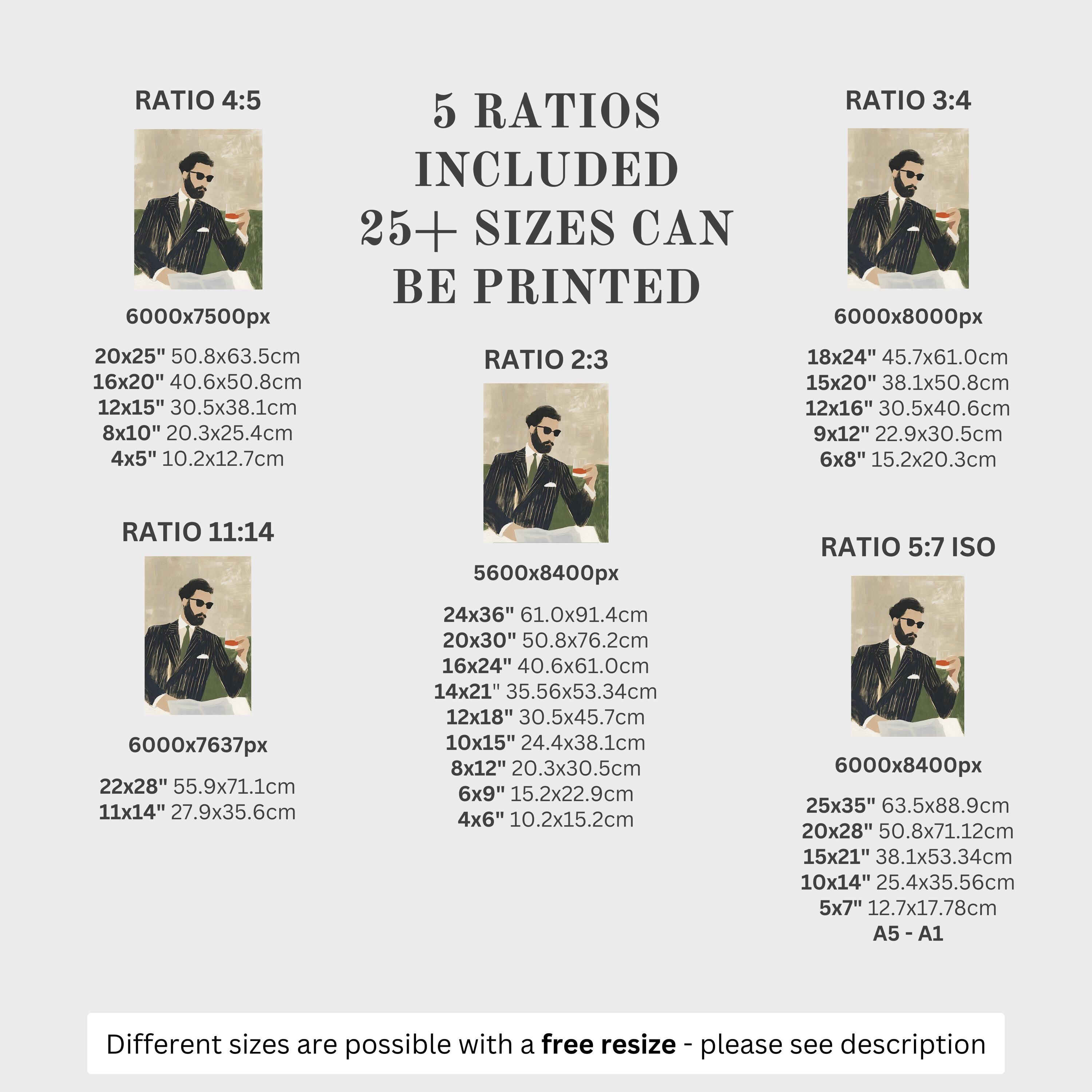 5 HIGH-QUALITY 300 DPI JPGs sized to fit +25 different frames in size and diverse ratios:
