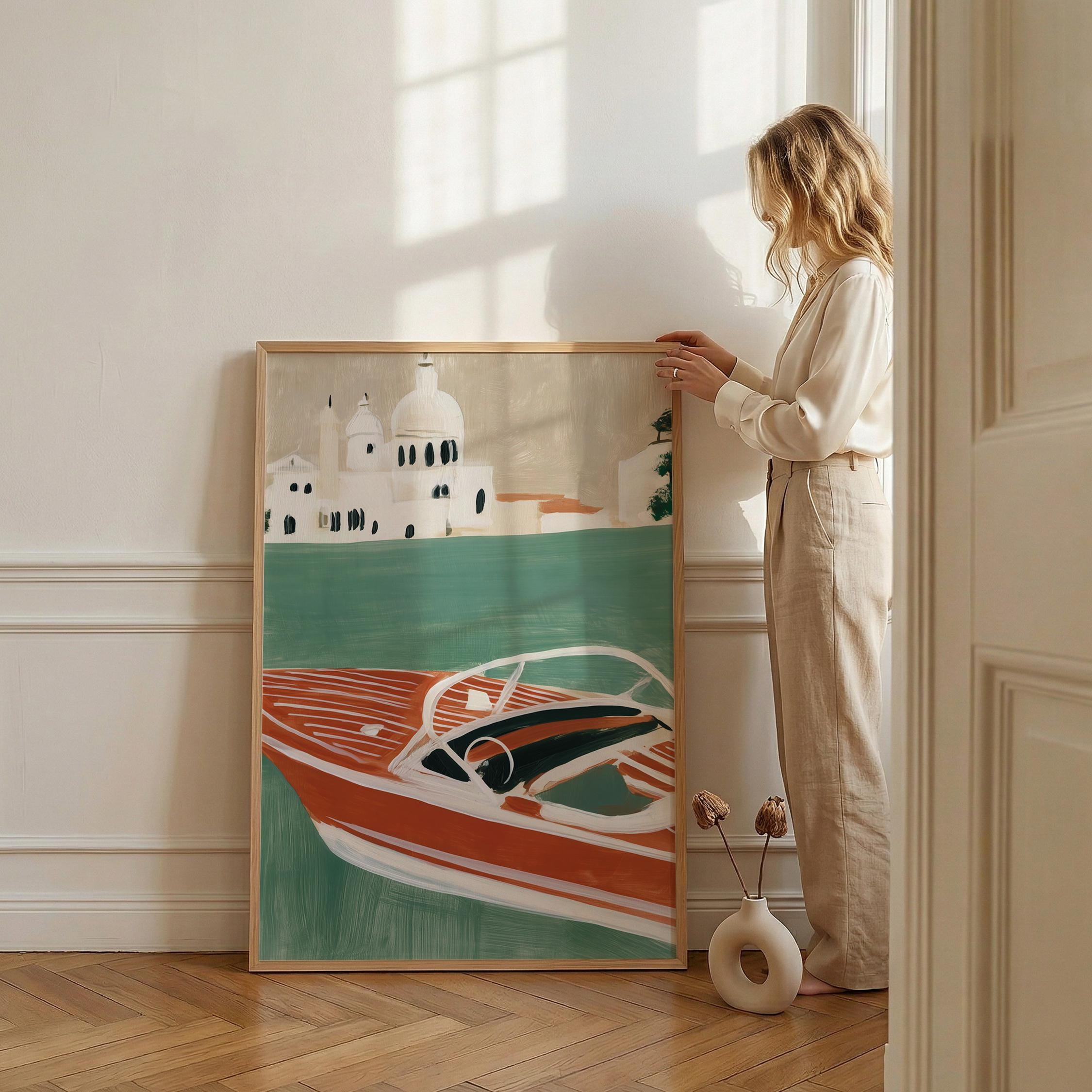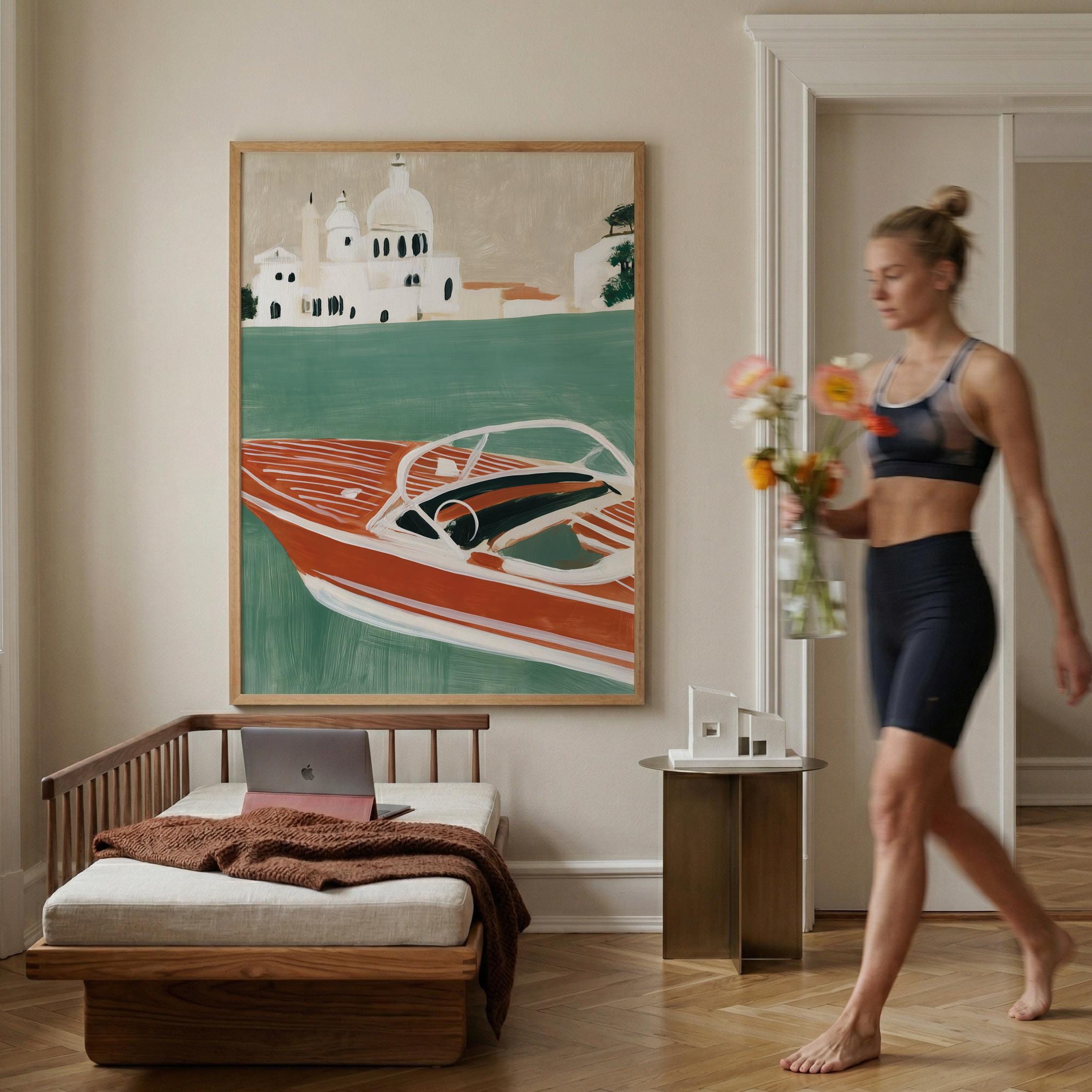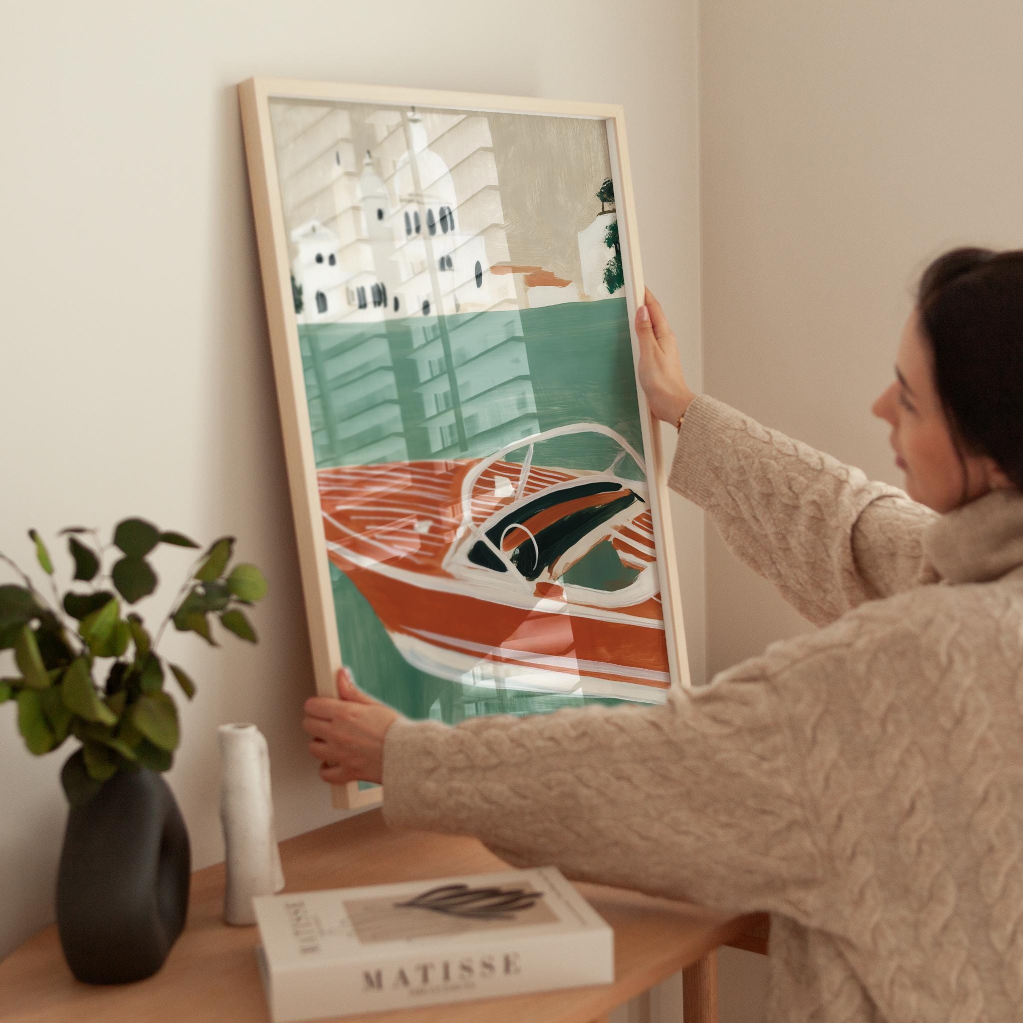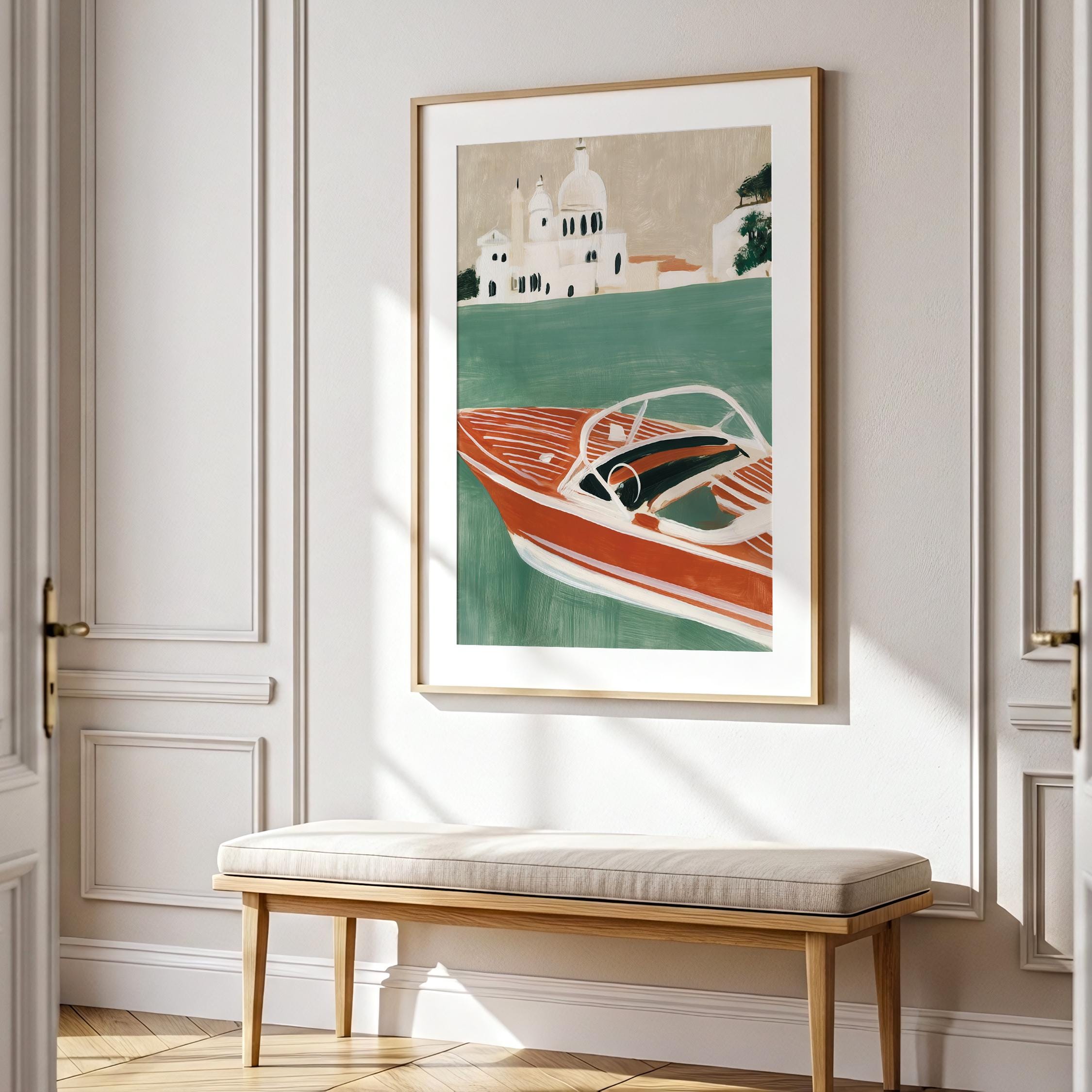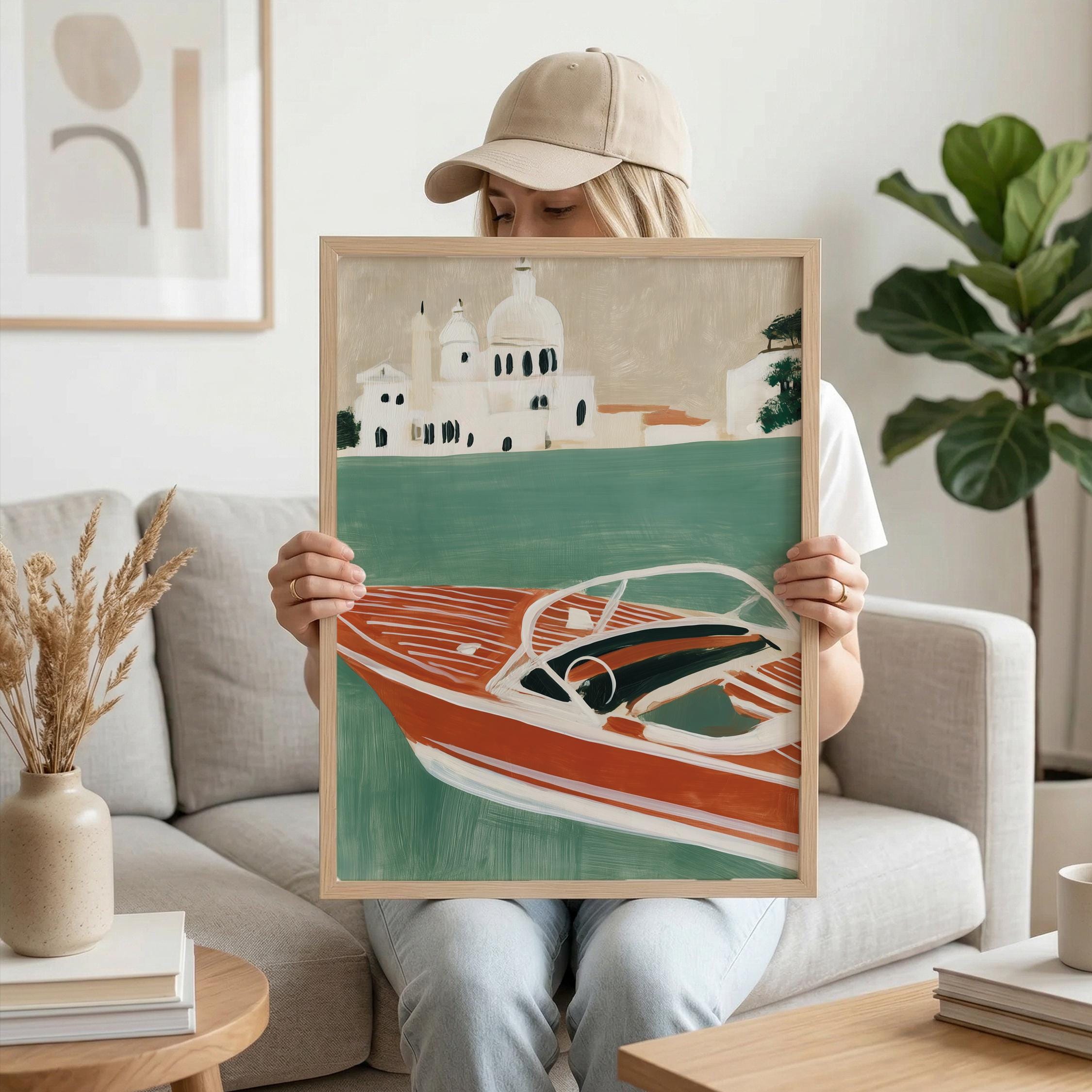 a stunning depiction of a Riva boat, perfect for a coastal-themed living room and a great gift for a summer housewarming gift.