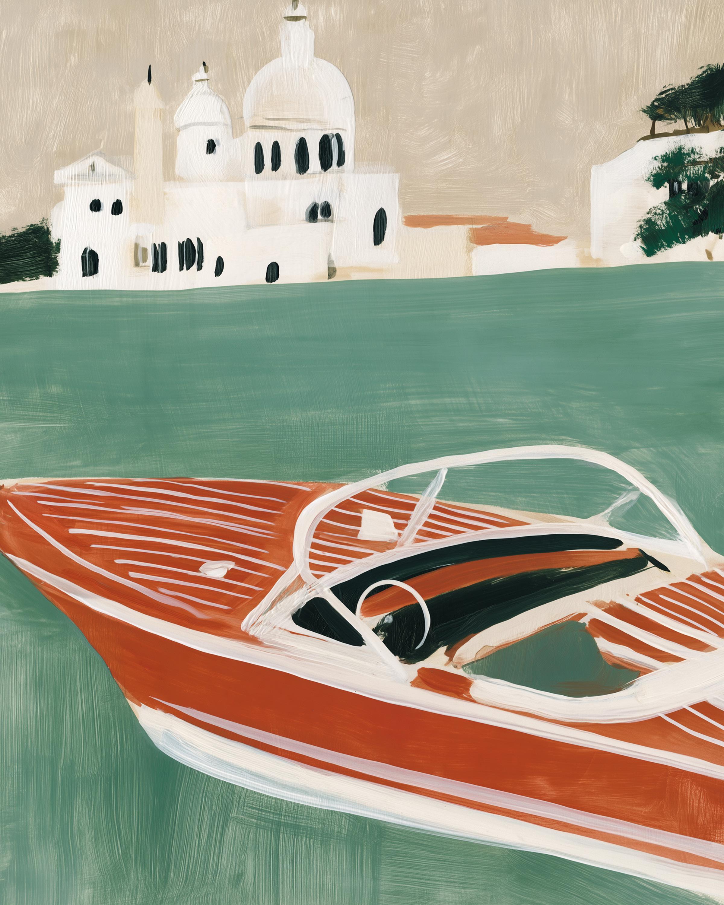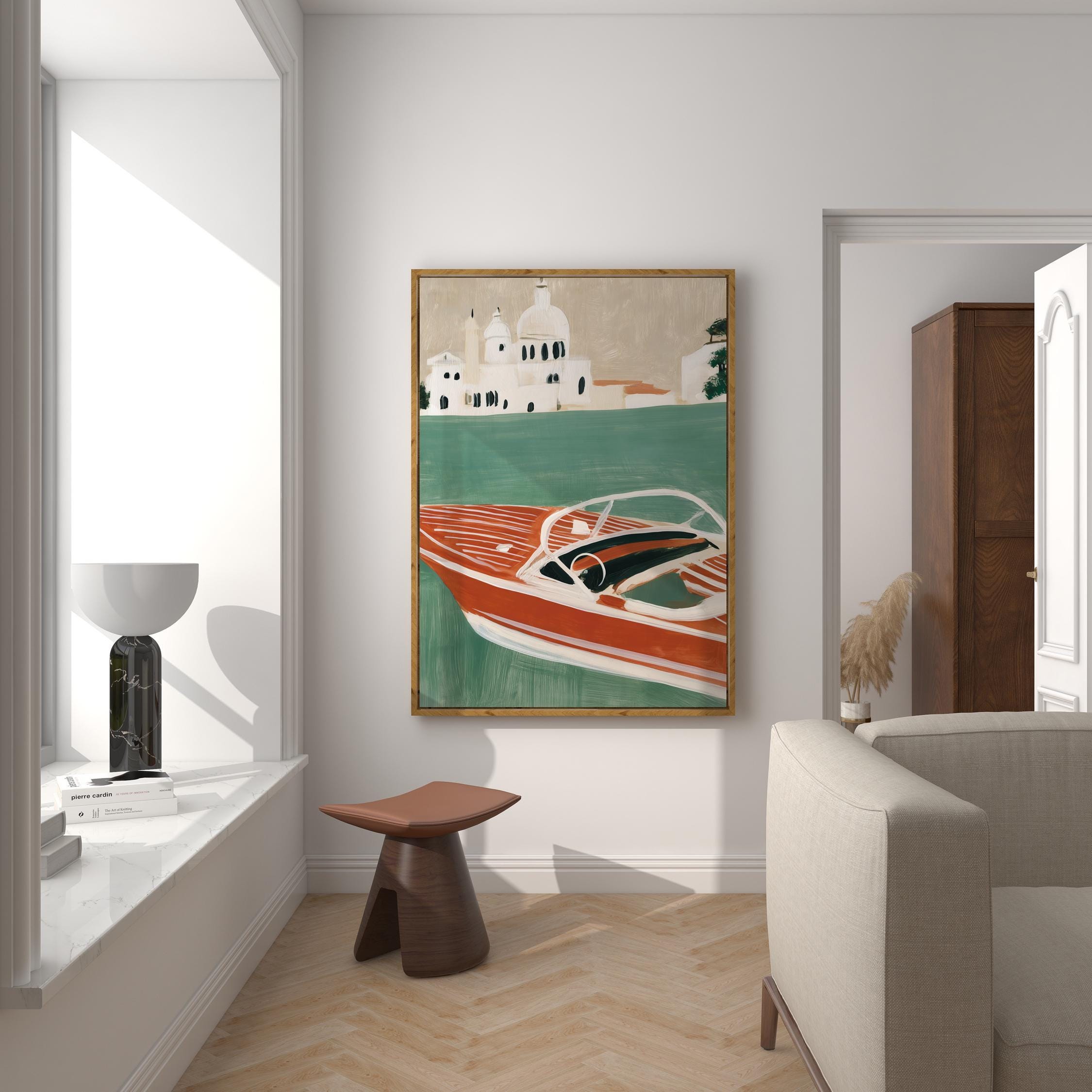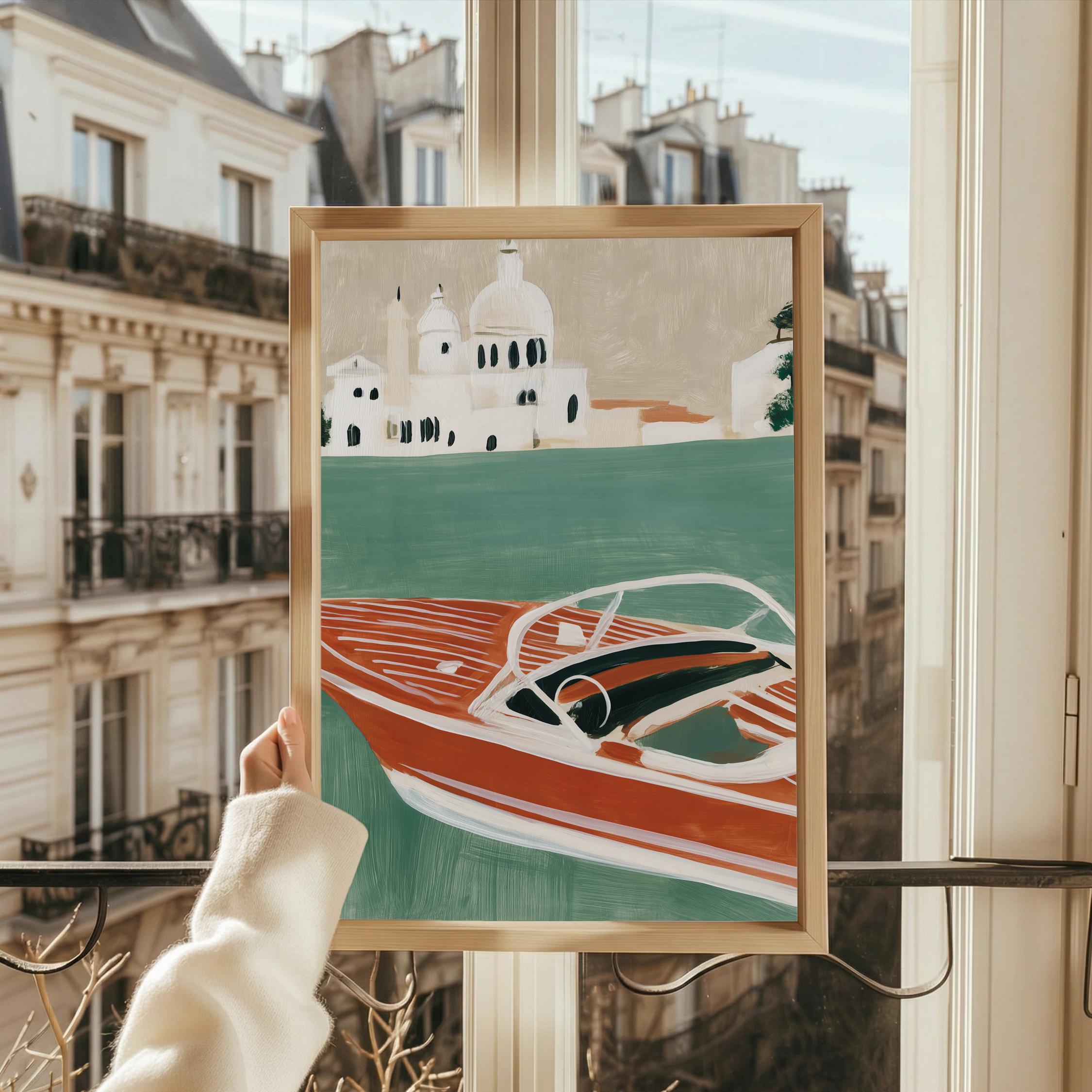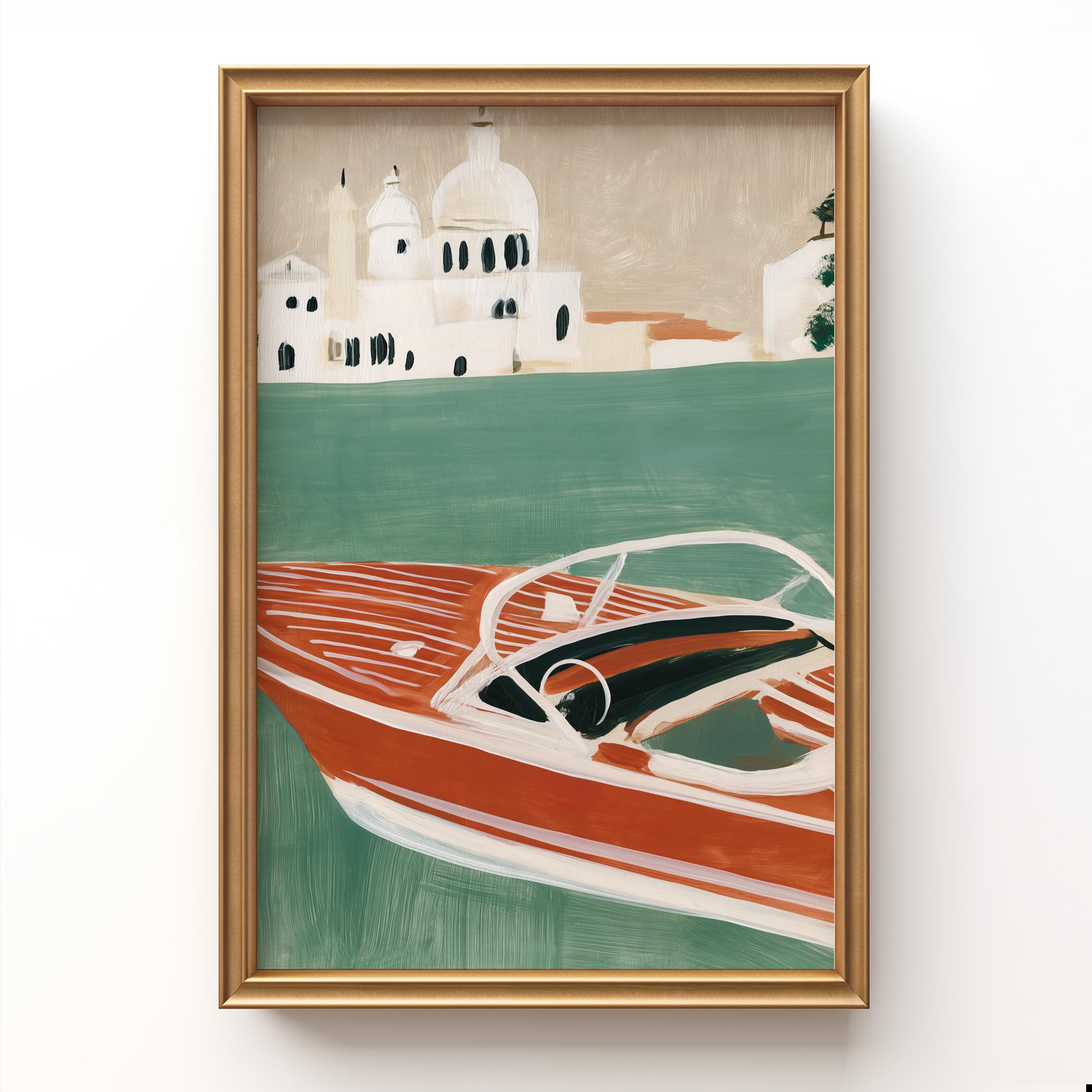 a stunning depiction of a Riva boat, perfect for a coastal-themed living room and a great gift for a summer housewarming gift.