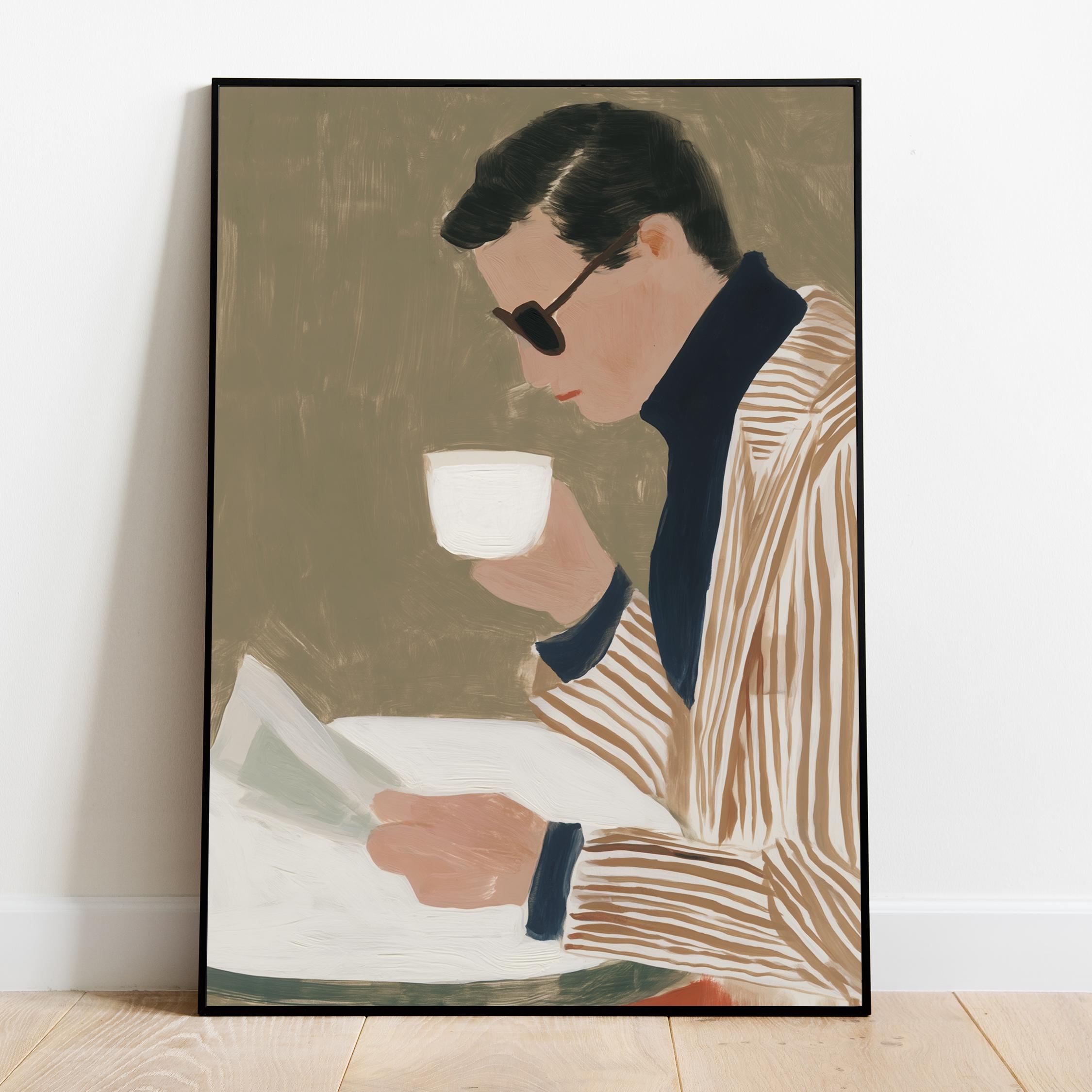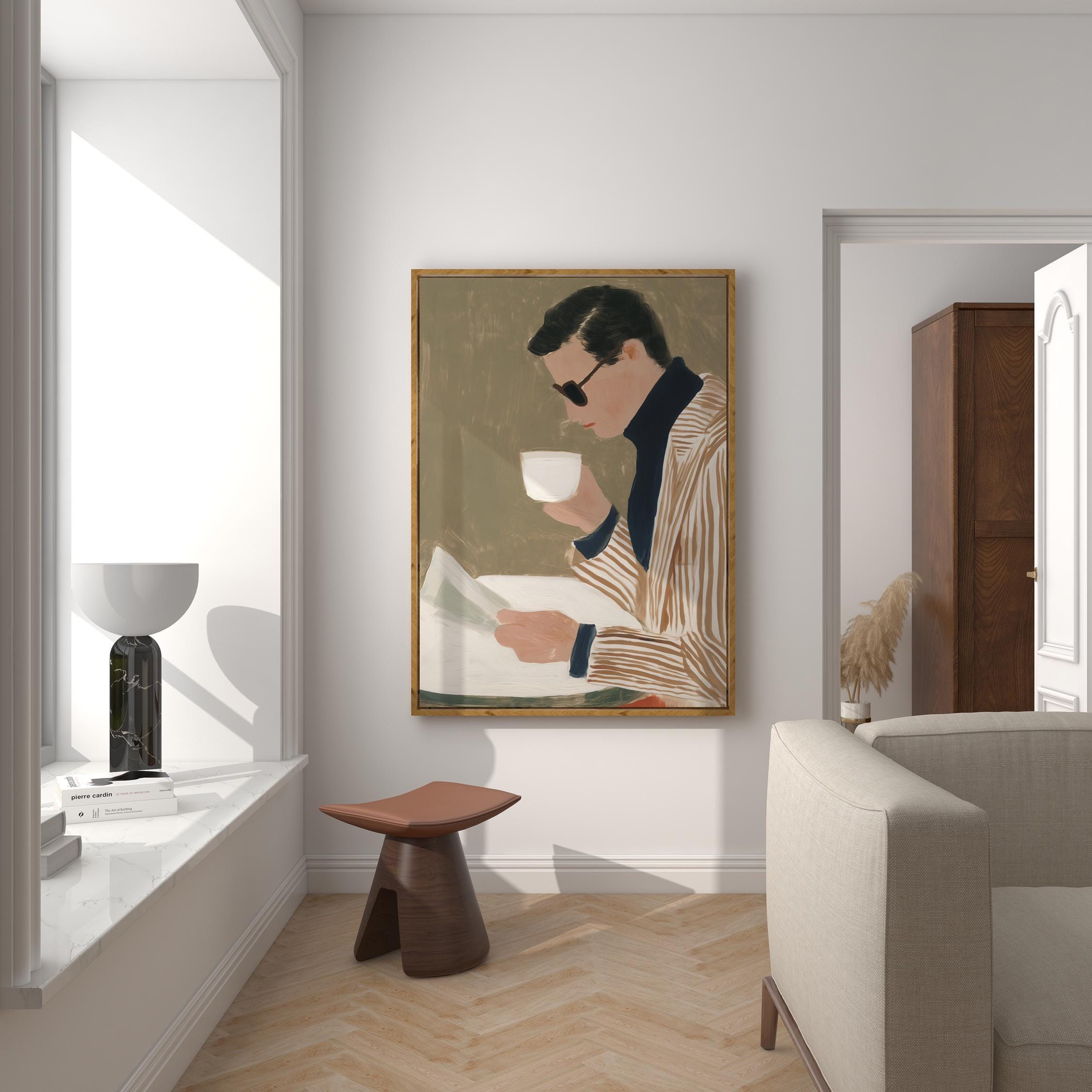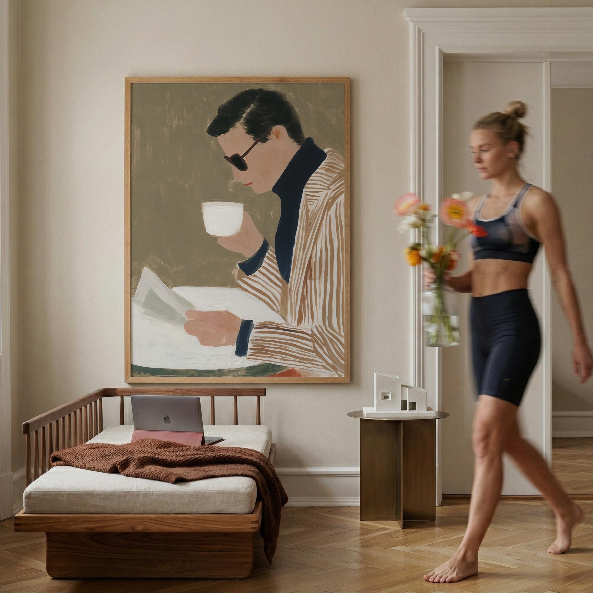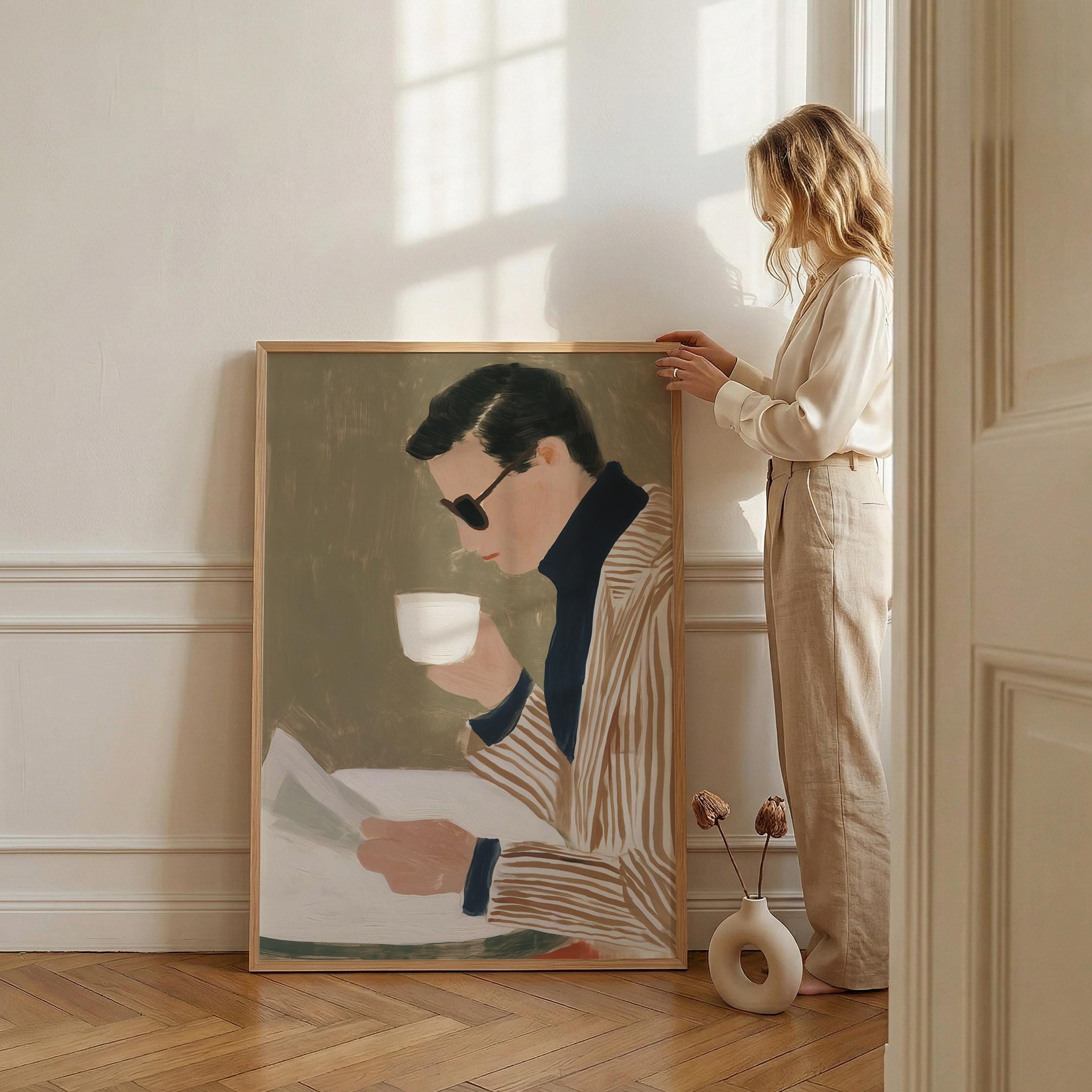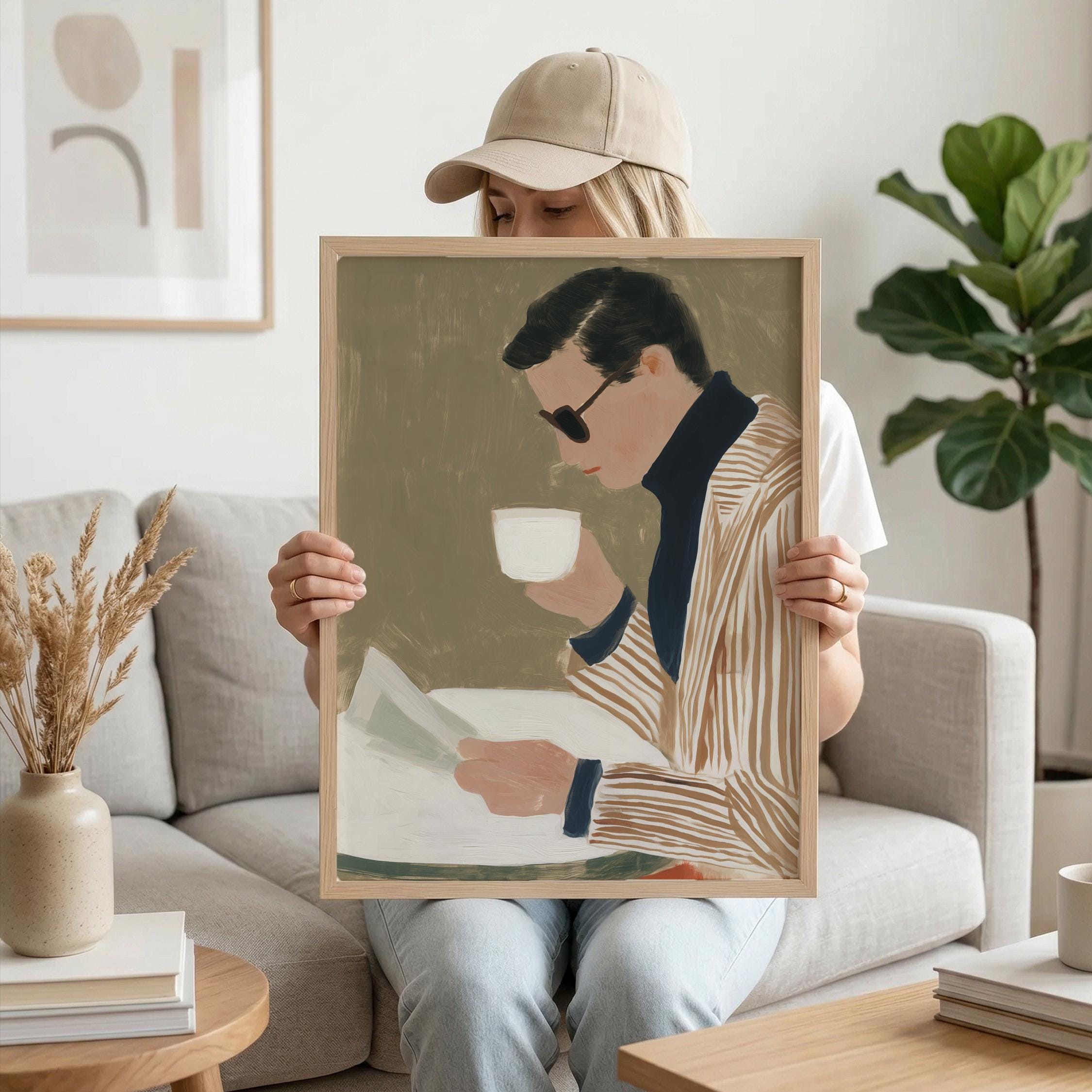 a stylish man enjoying his morning brew, perfect for a chic living room and a great gift for a housewarming celebration.