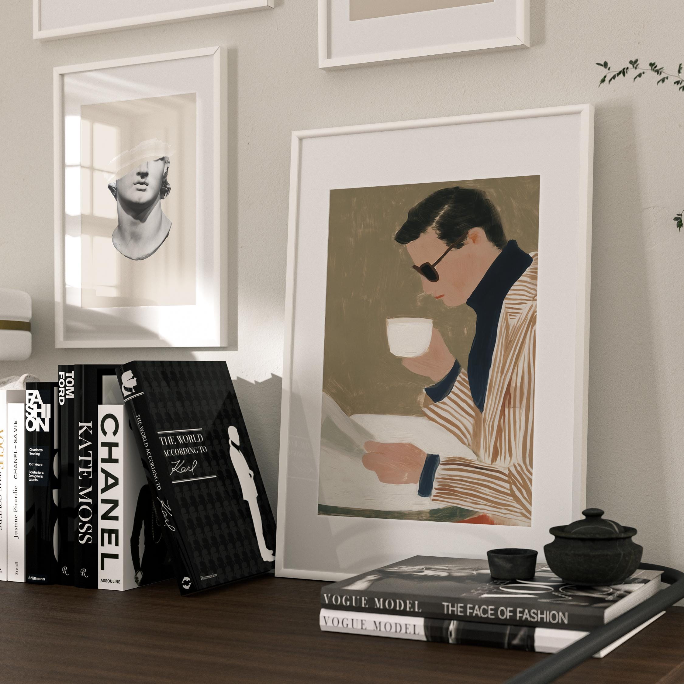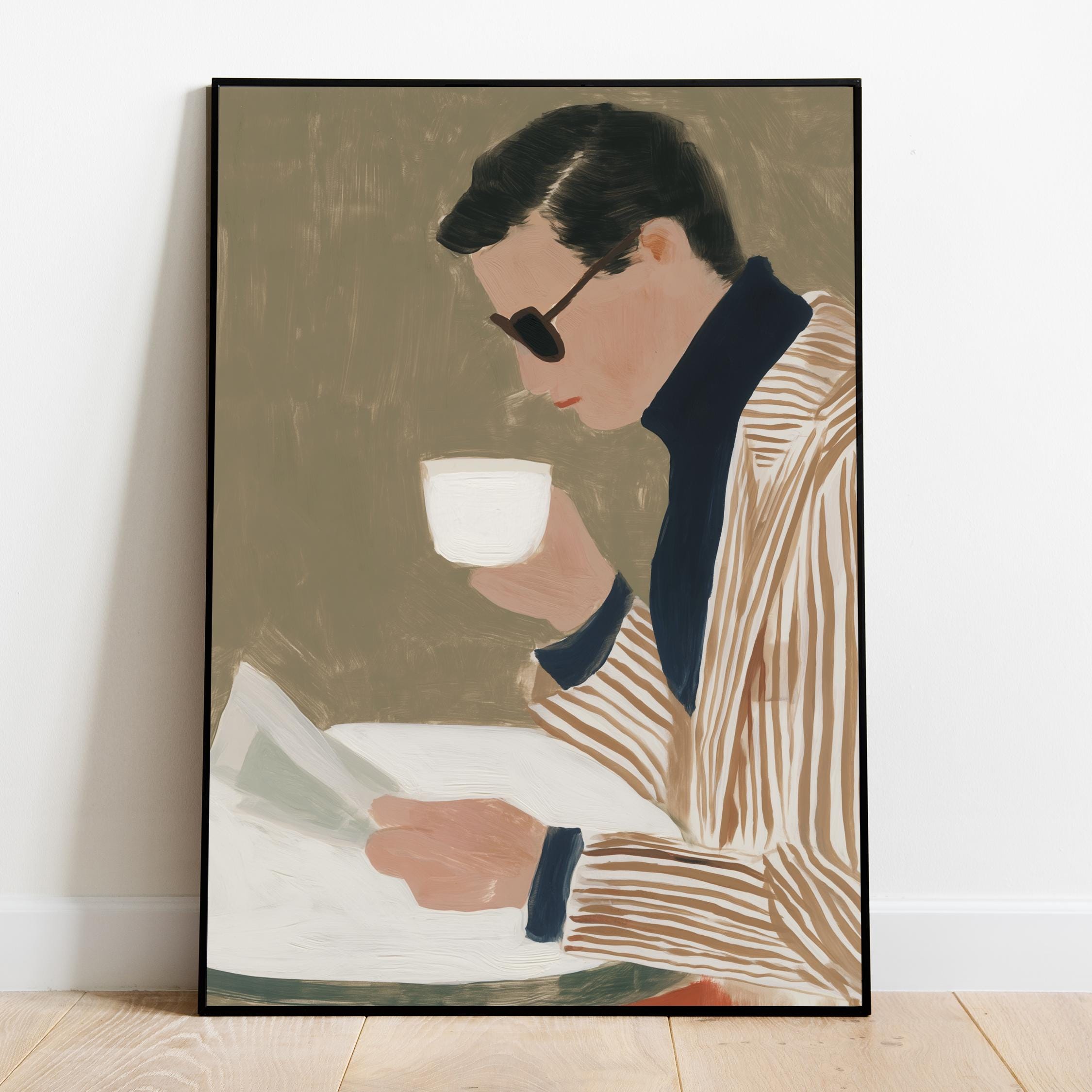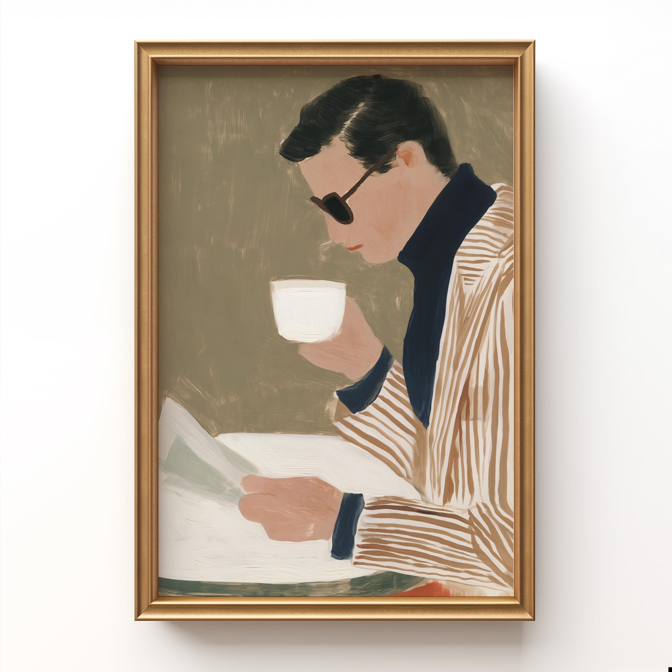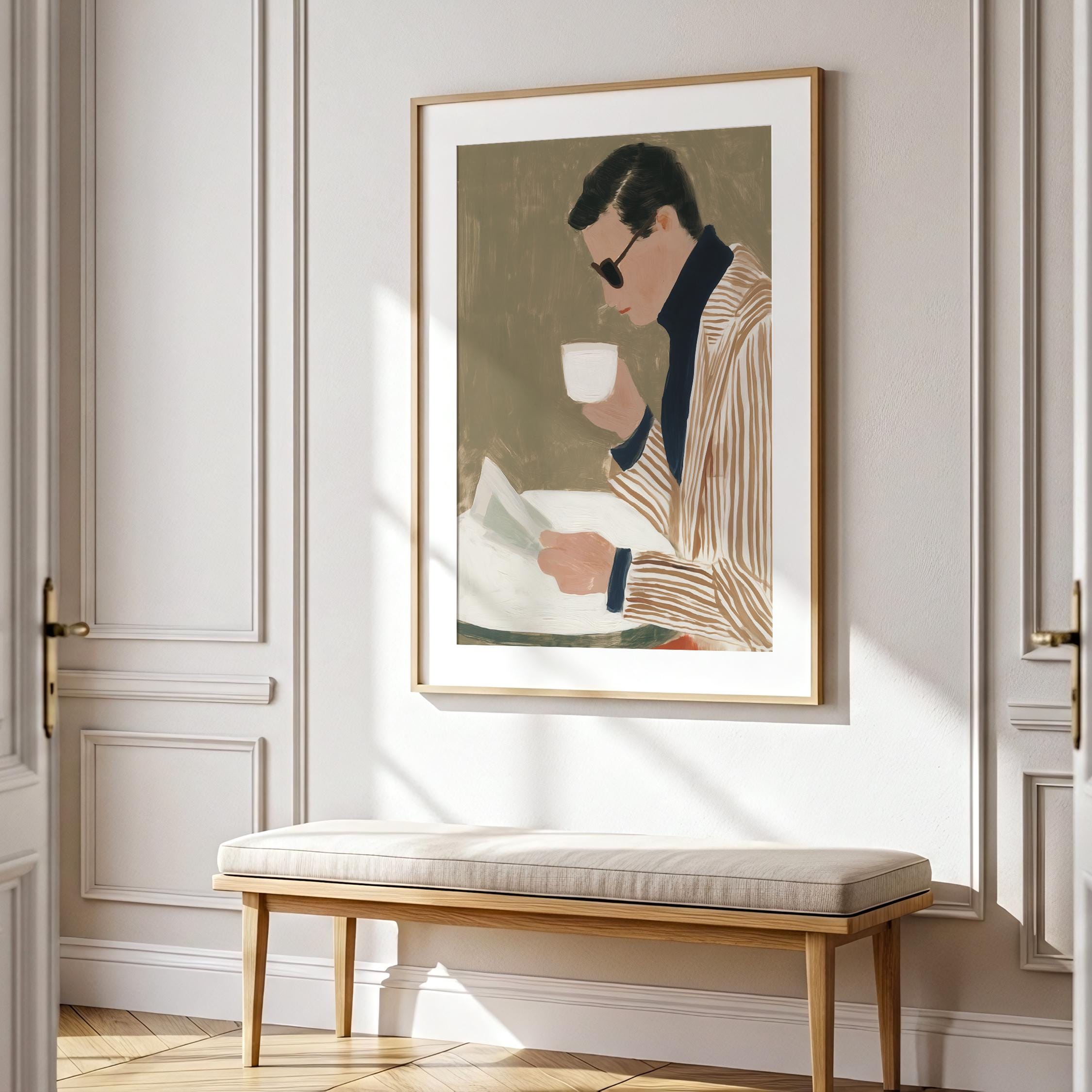 a stylish man enjoying his morning brew, perfect for a chic living room and a great gift for a housewarming celebration.