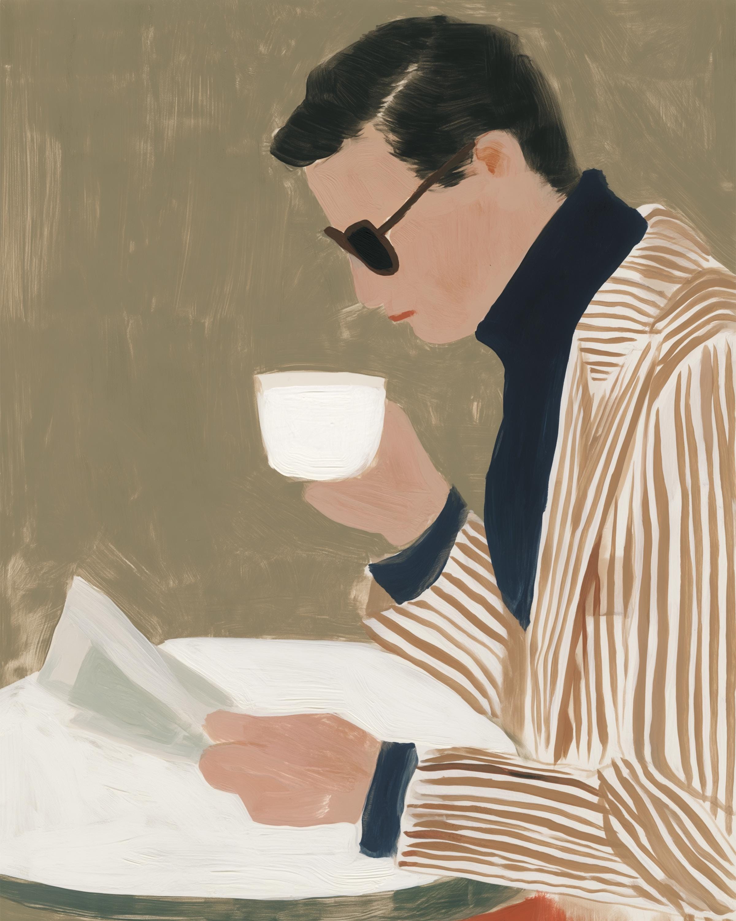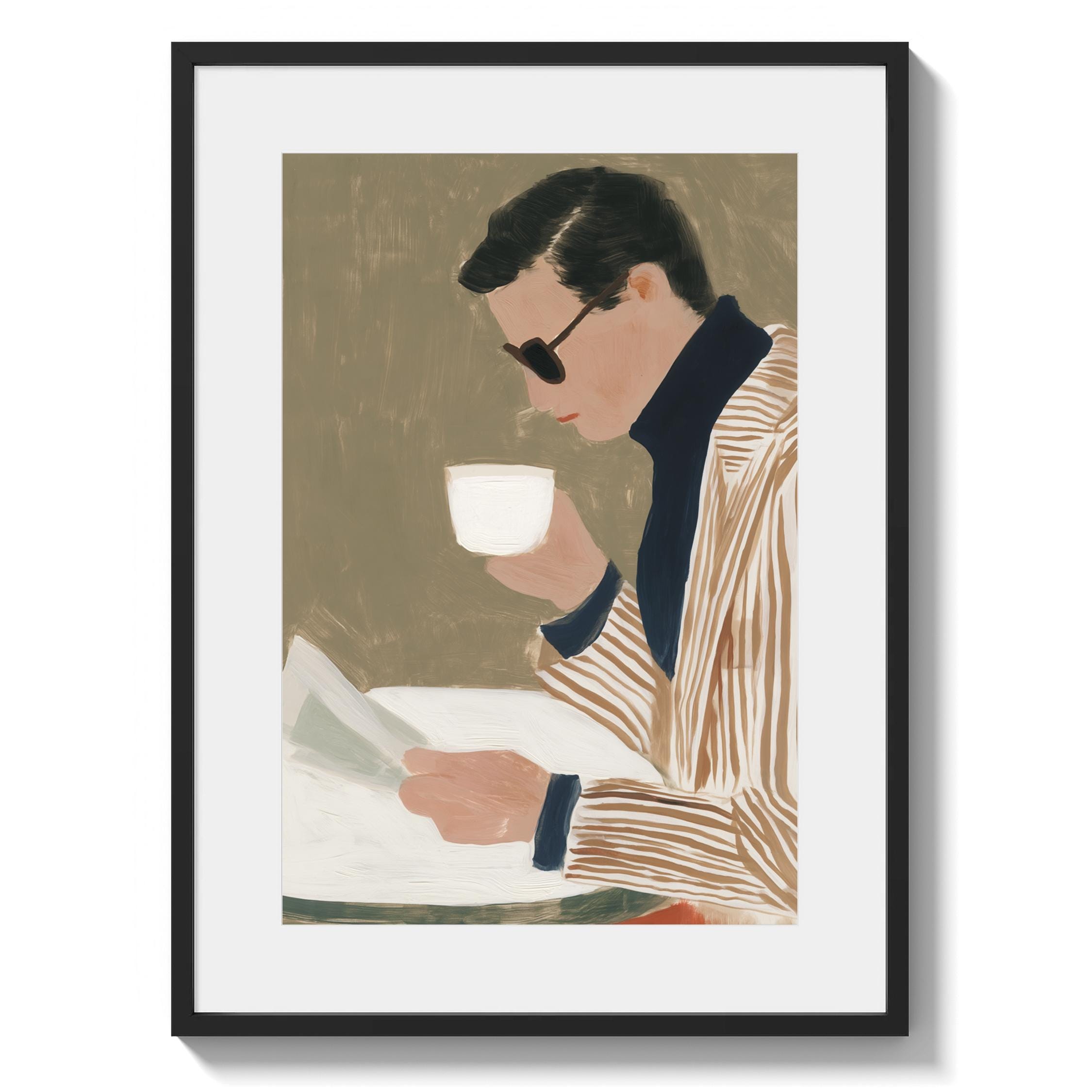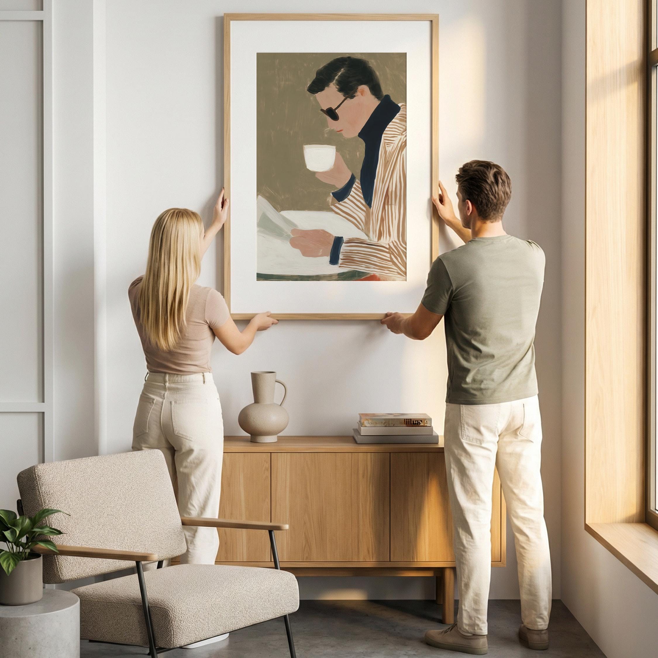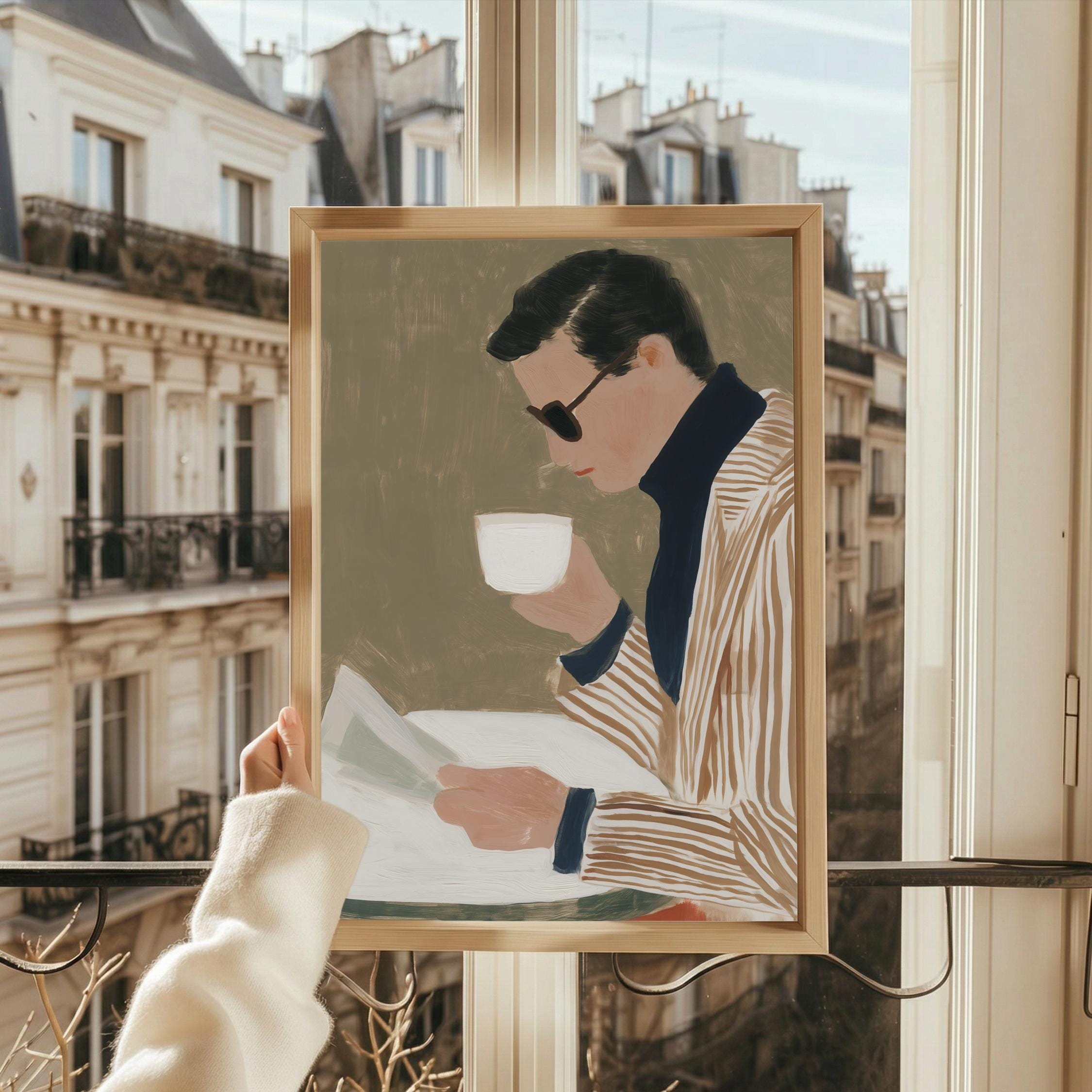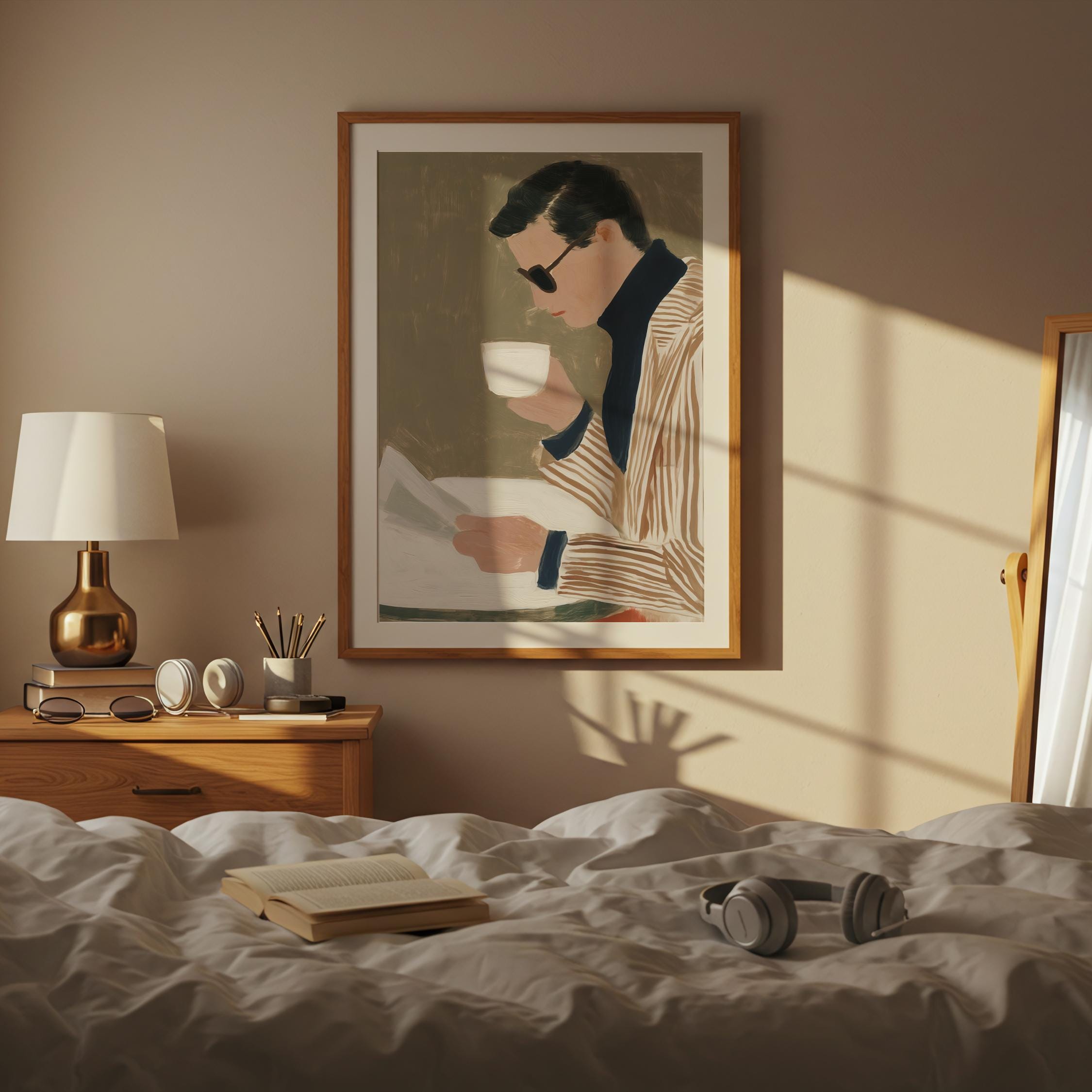 a stylish man enjoying his morning brew, perfect for a chic living room and a great gift for a housewarming celebration.
