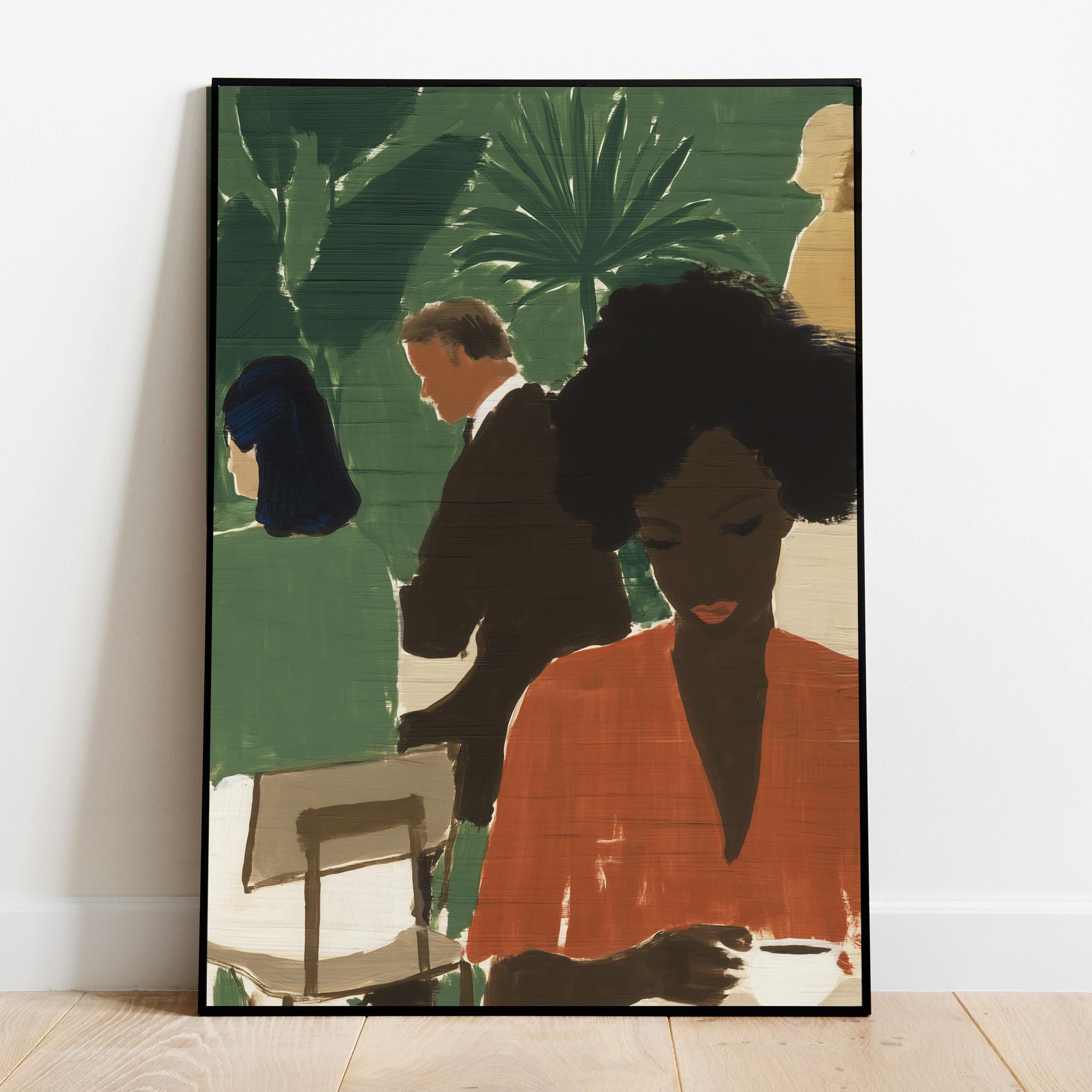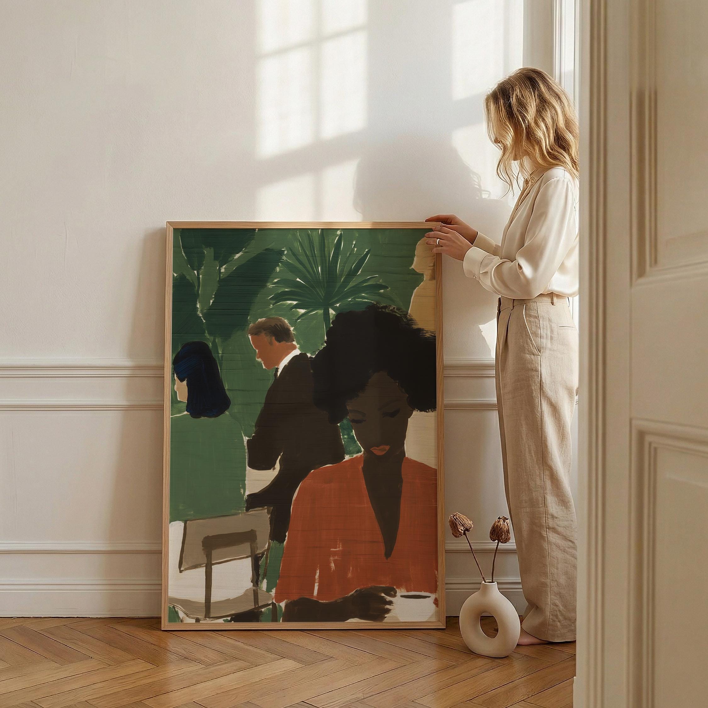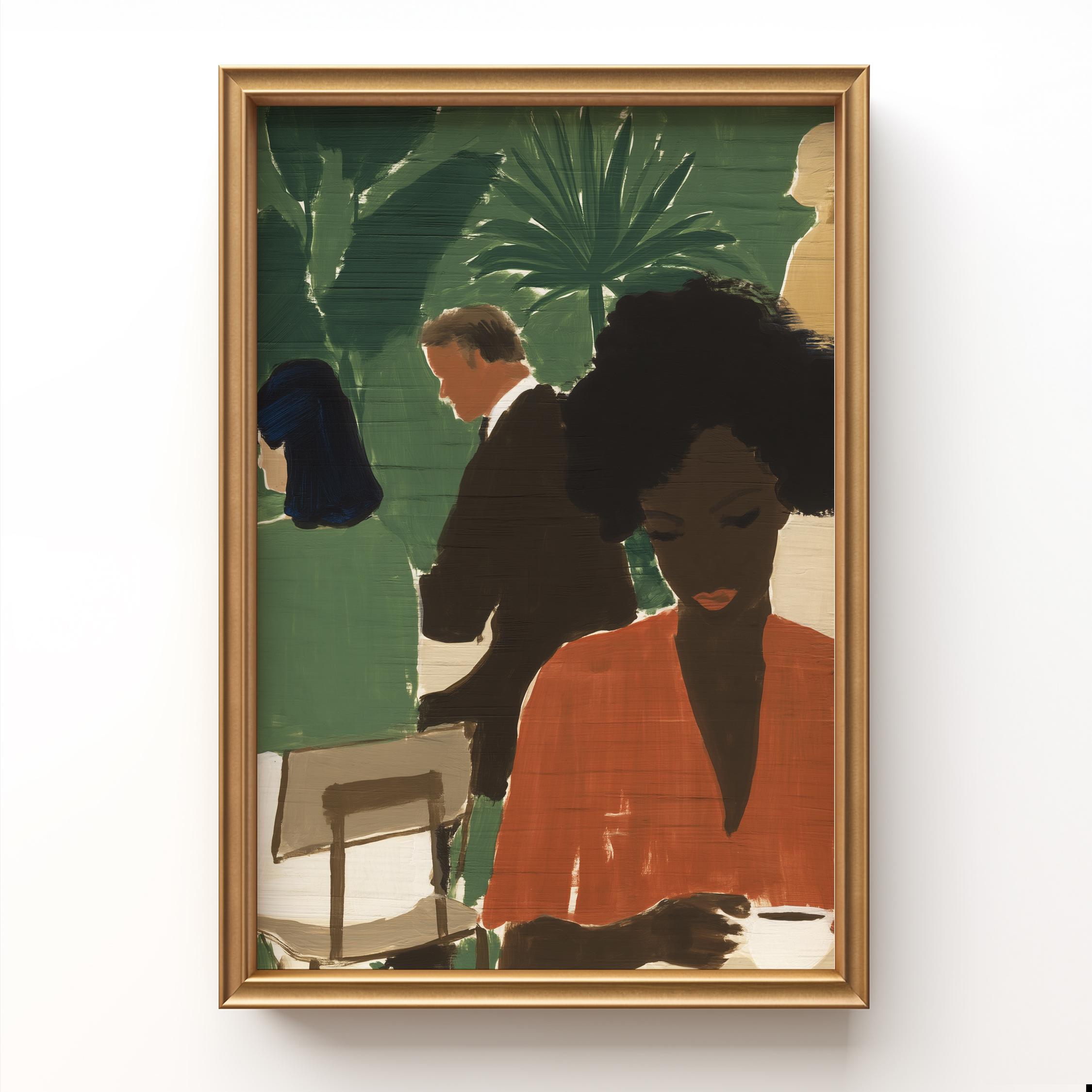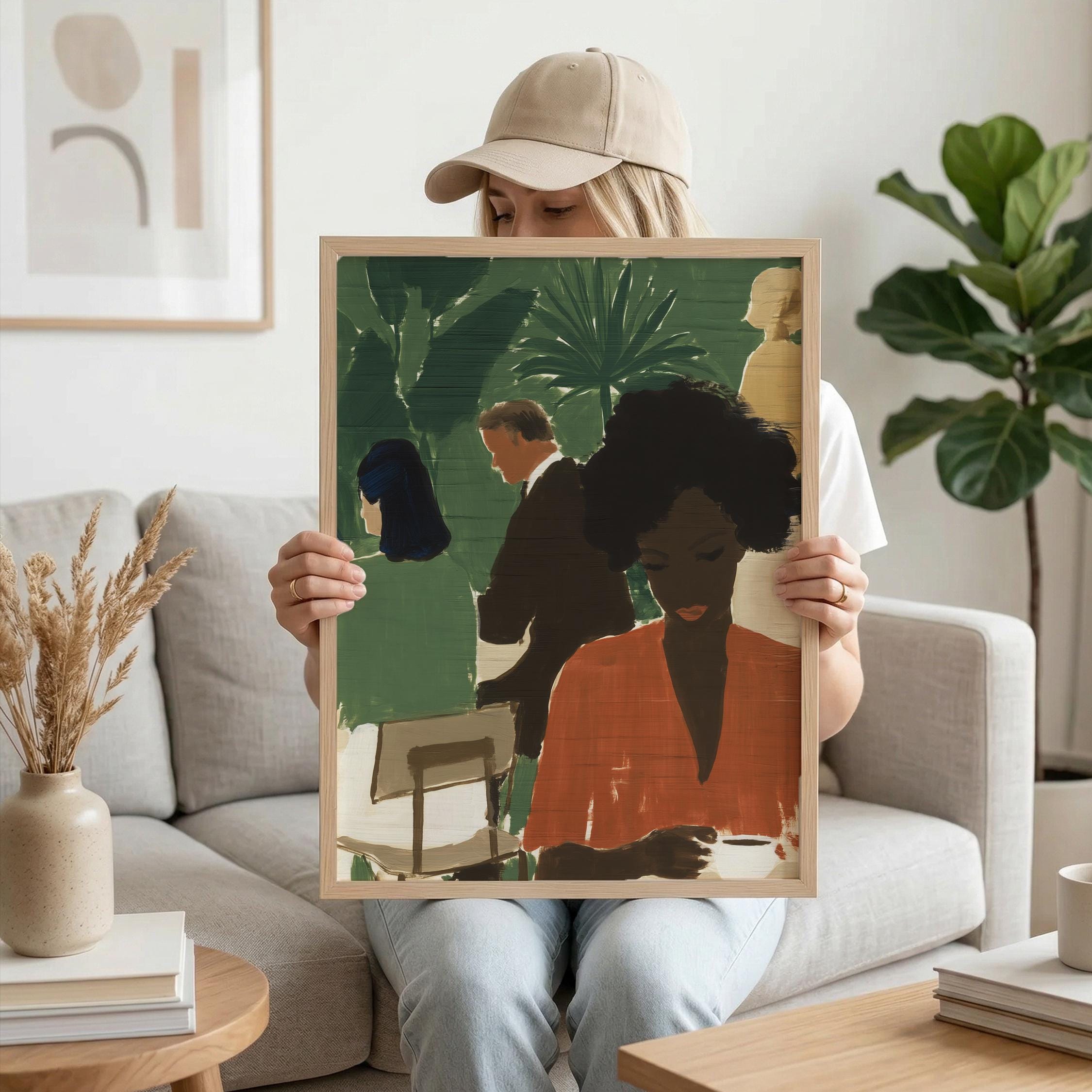 a serene portrait of an Afrohemian woman enjoying coffee, perfect for a cozy cafe or living room and a great gift for a housewarming gift or birthday surprise.
