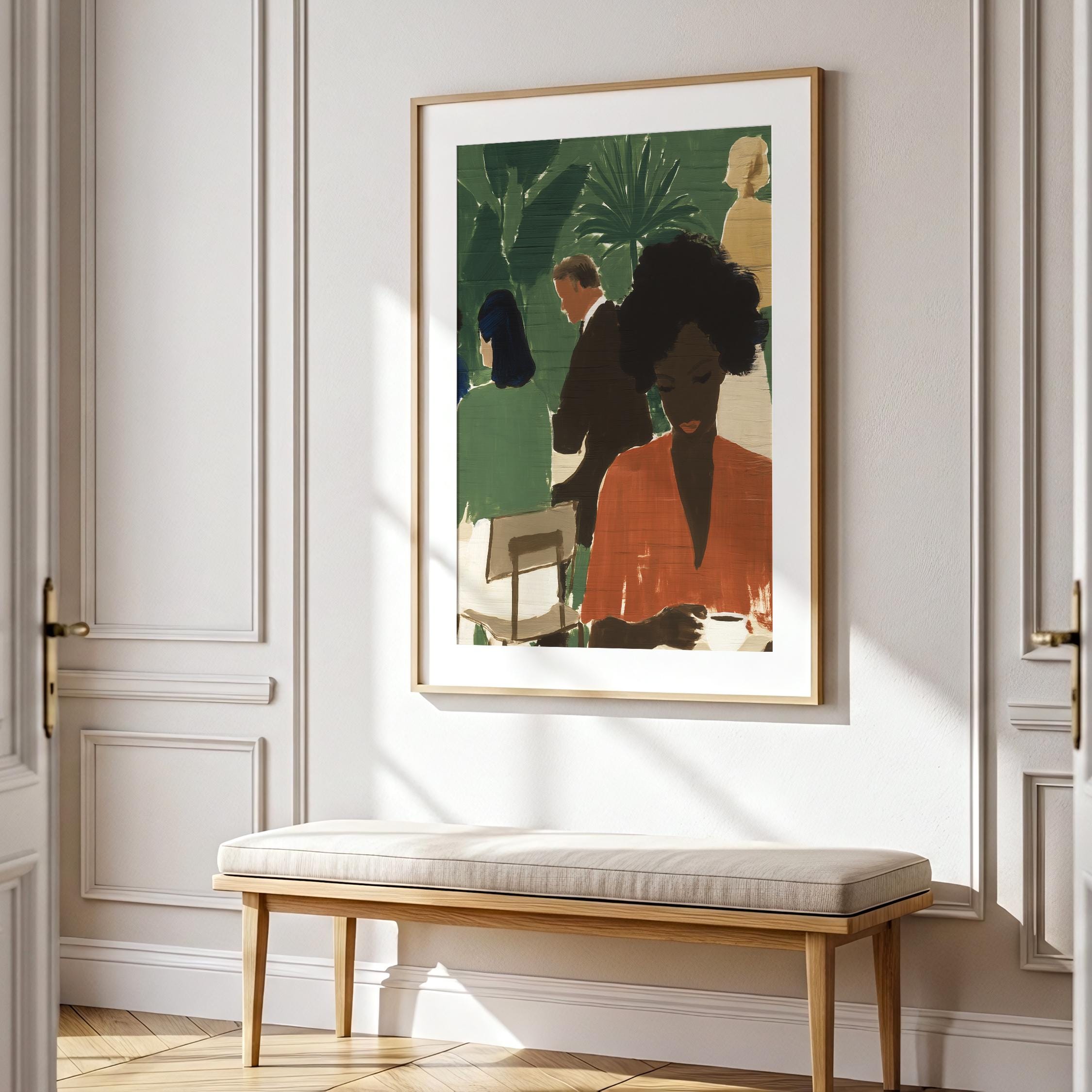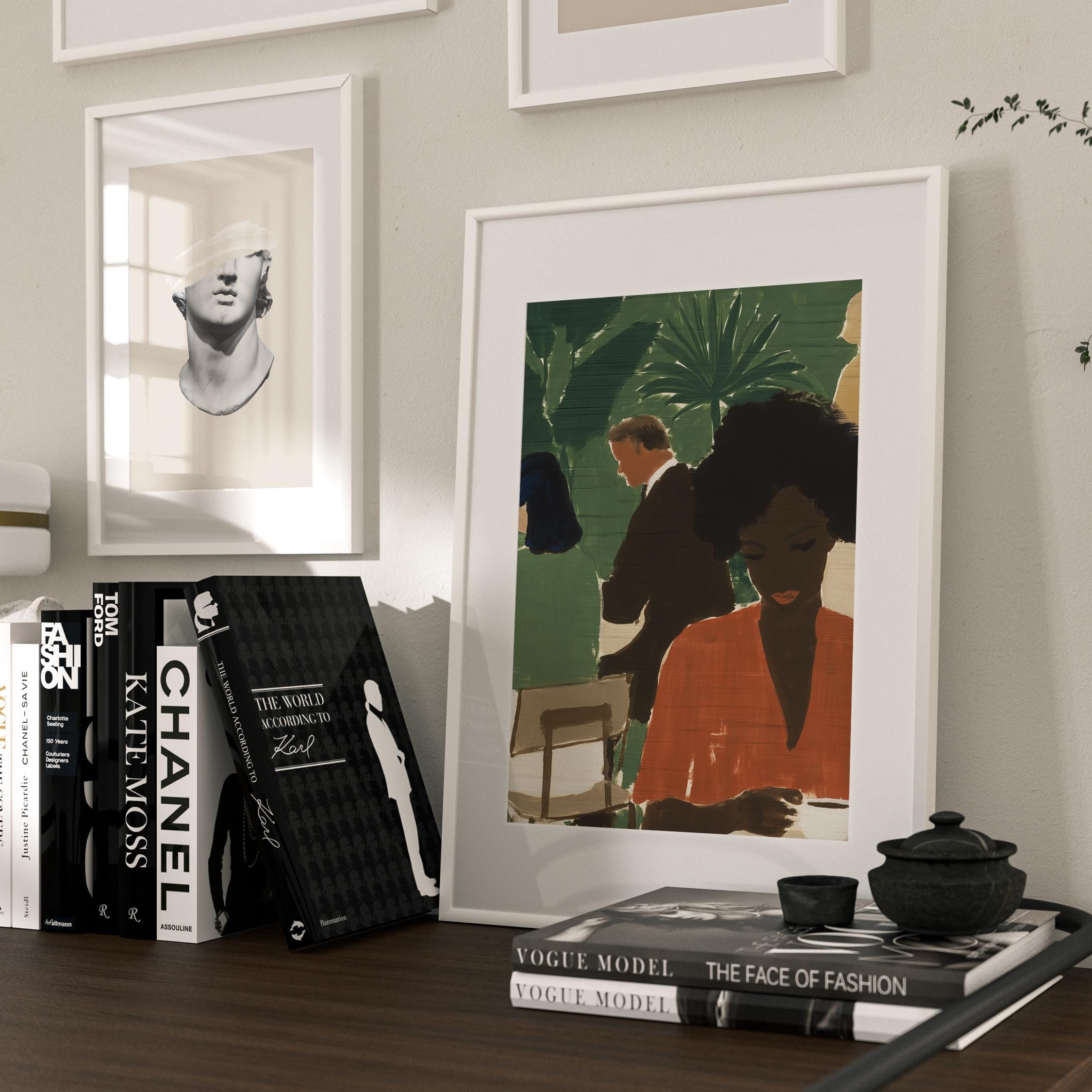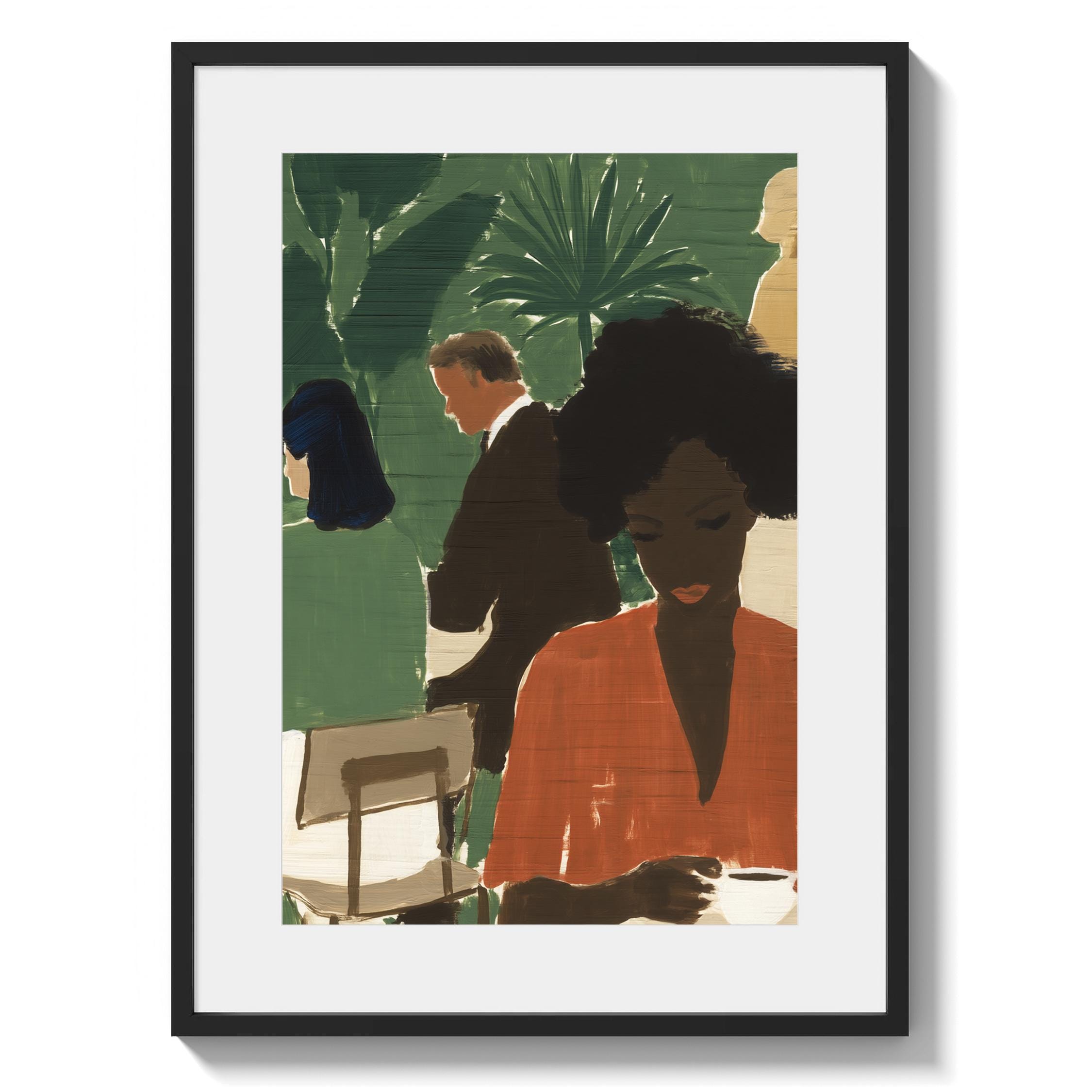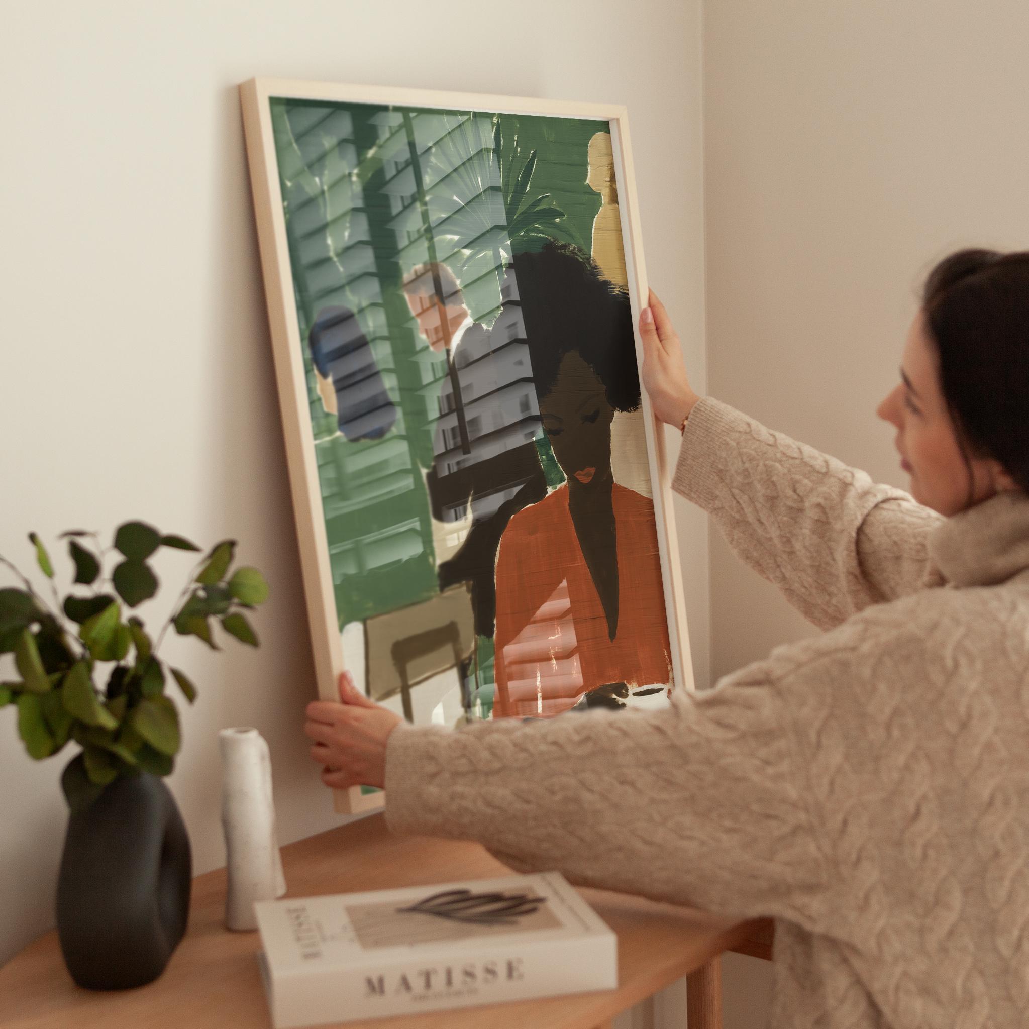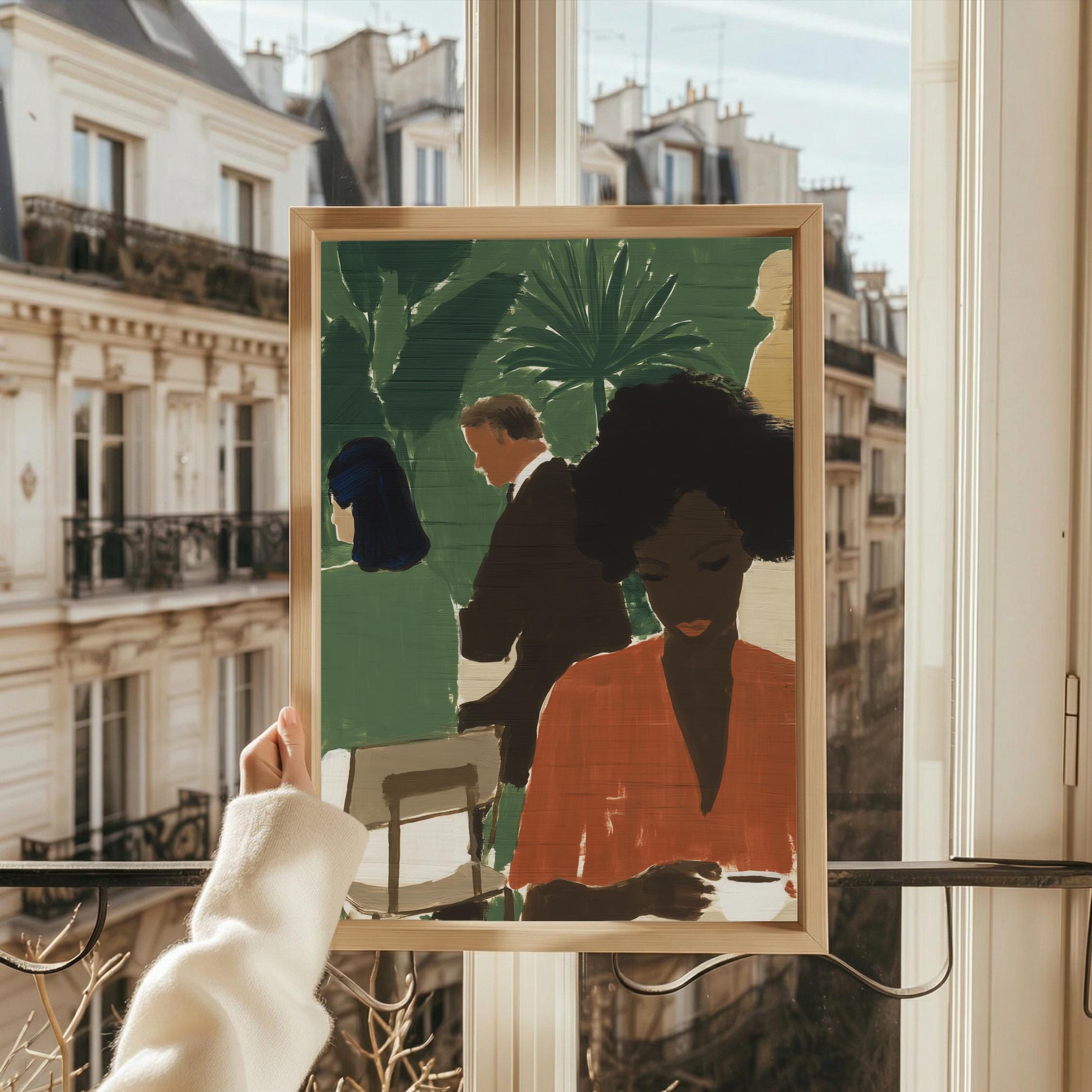 a serene portrait of an Afrohemian woman enjoying coffee, perfect for a cozy cafe or living room and a great gift for a housewarming gift or birthday surprise.