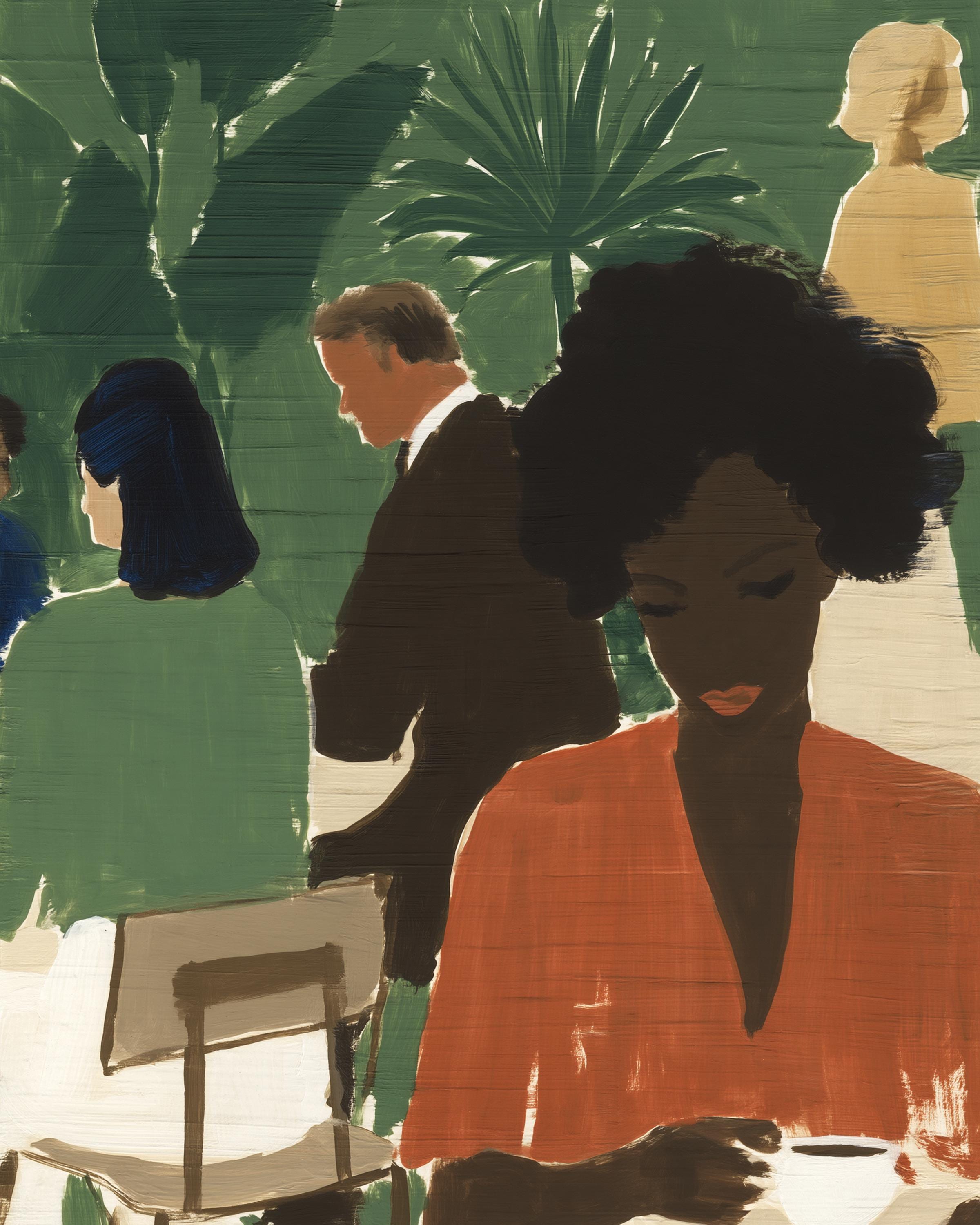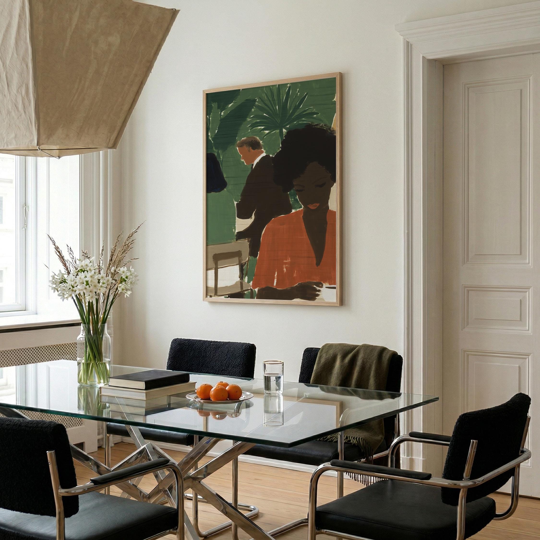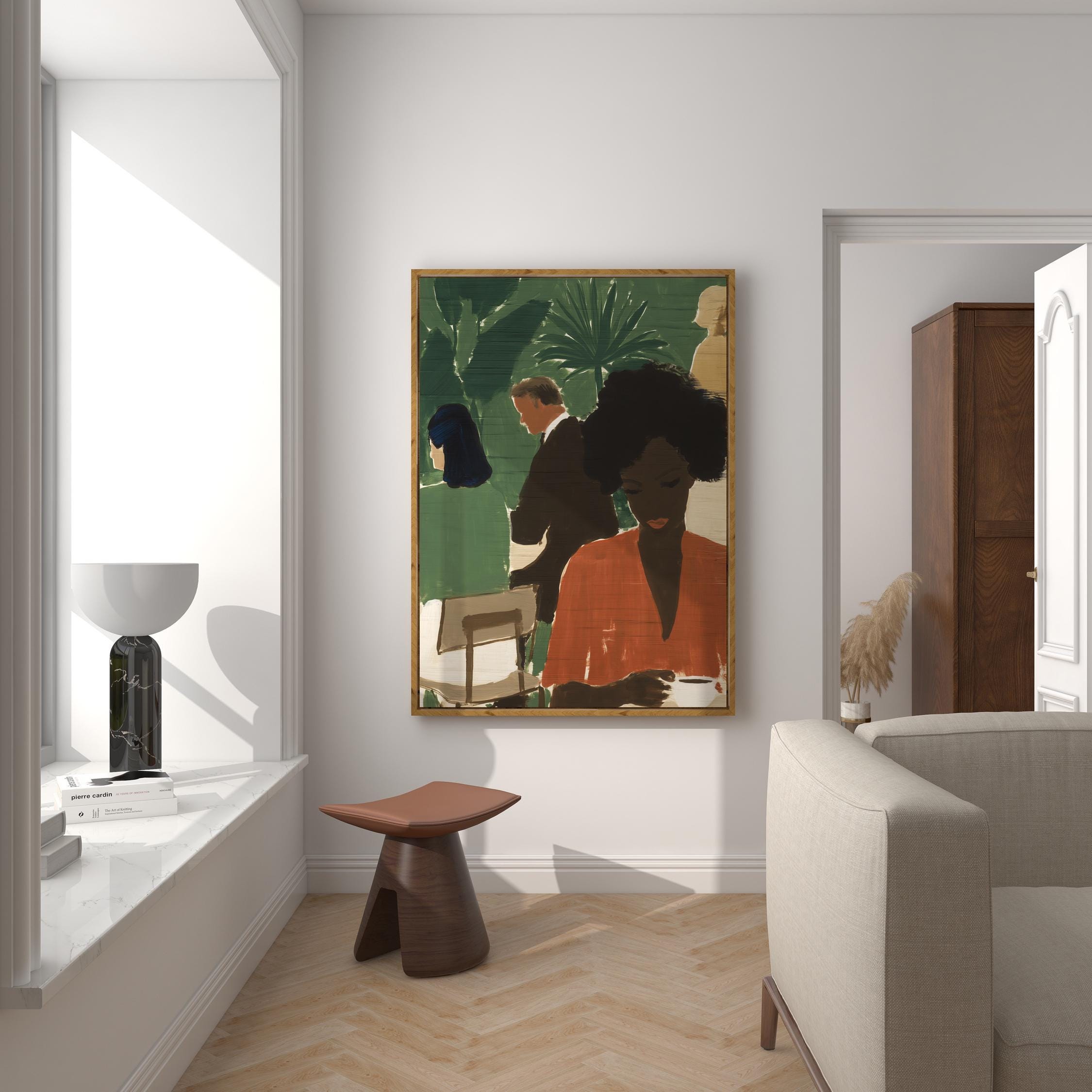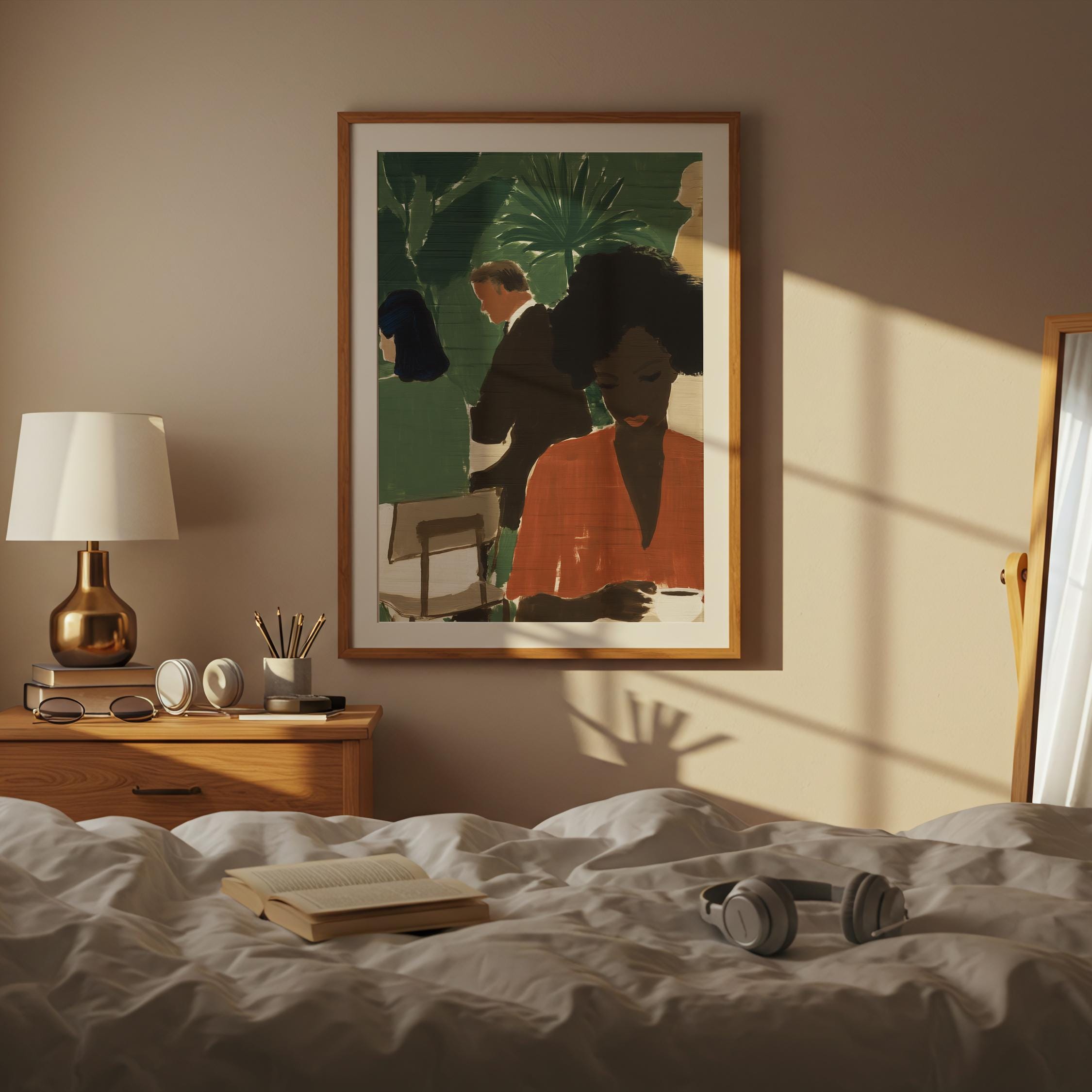 a serene portrait of an Afrohemian woman enjoying coffee, perfect for a cozy cafe or living room and a great gift for a housewarming gift or birthday surprise.