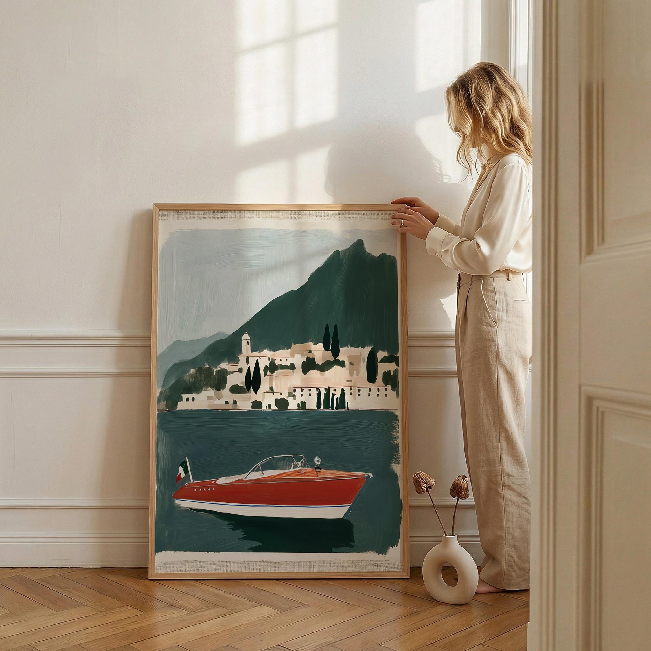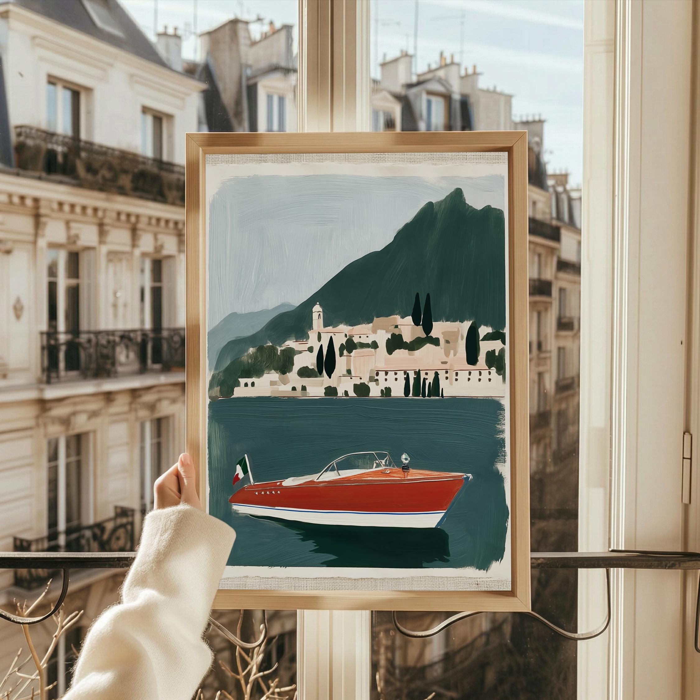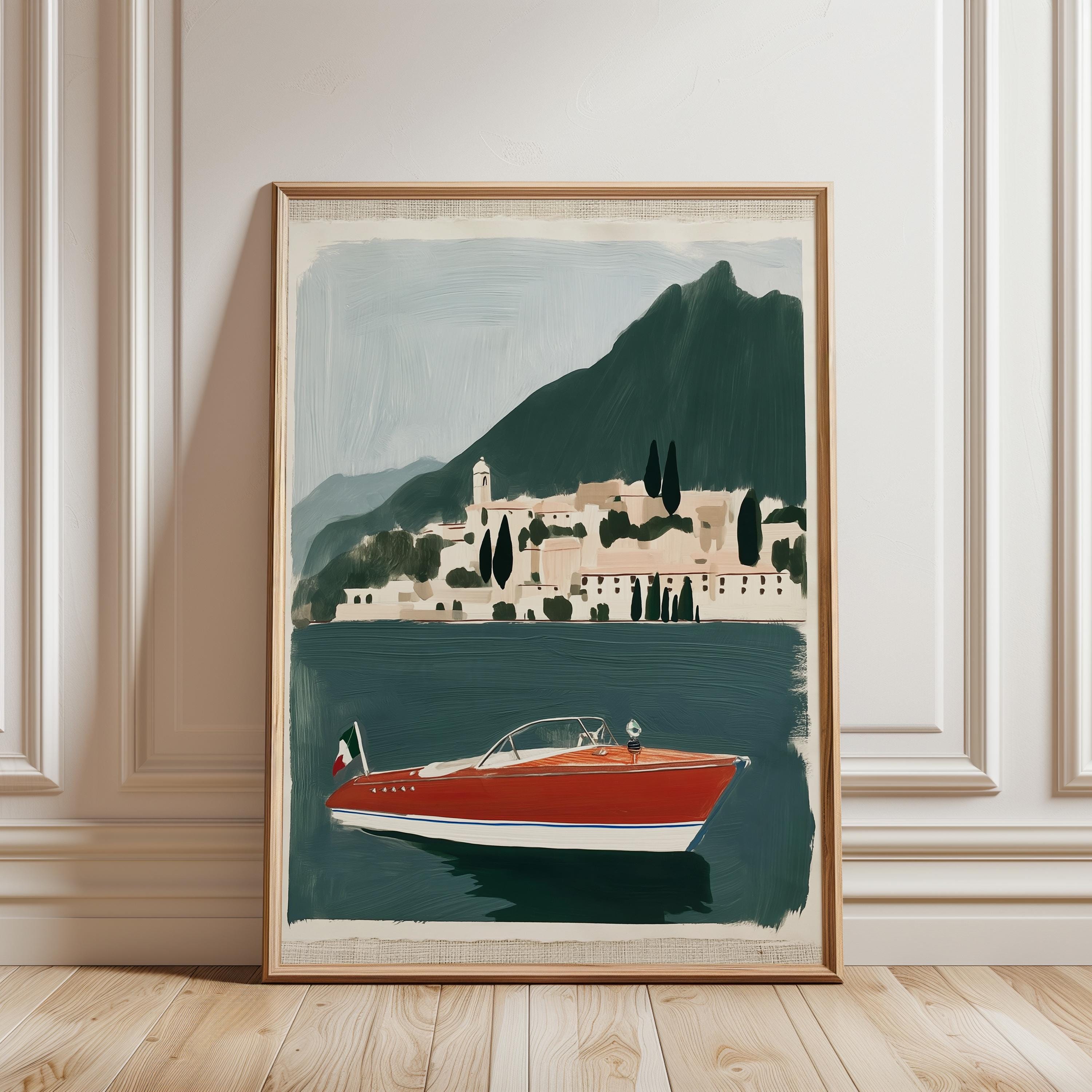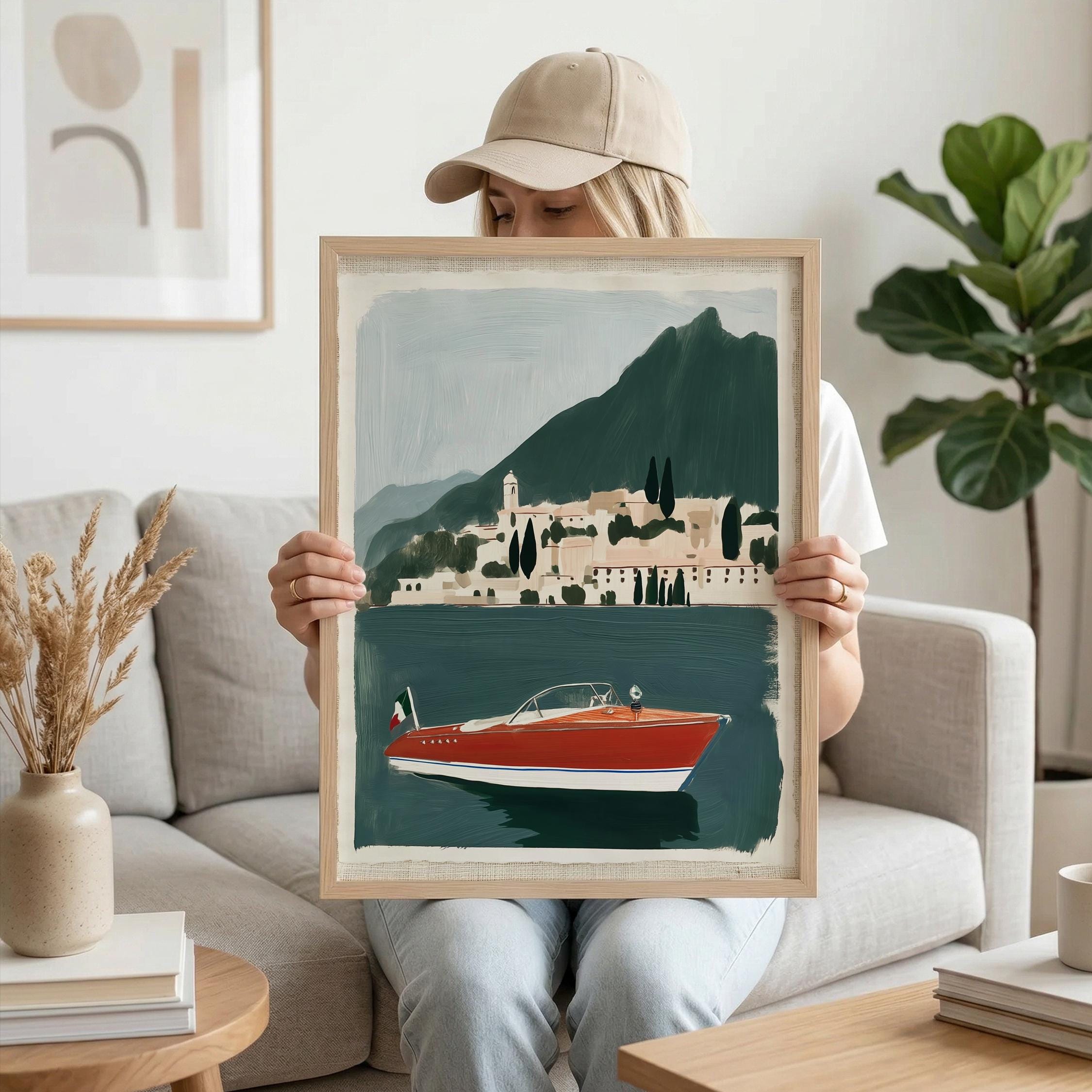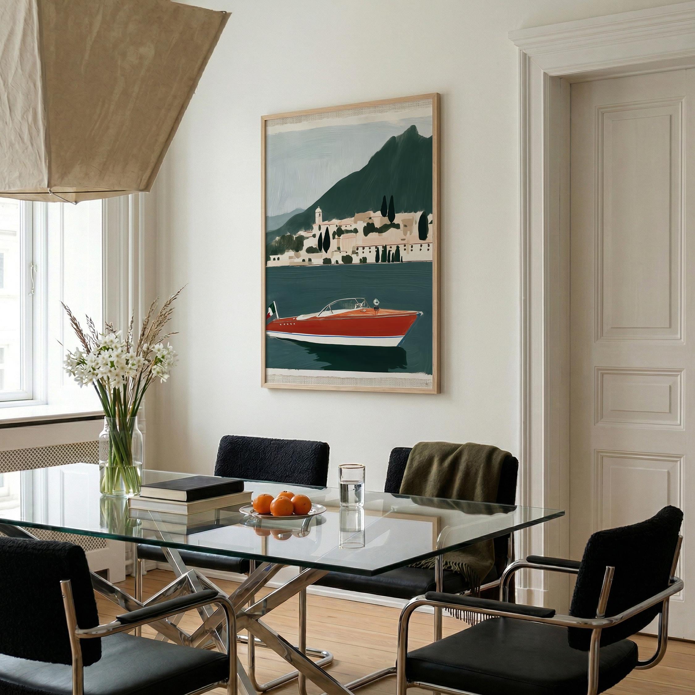 a vintage speedboat painting, perfect for a coastal living room and a great gift for a summer housewarming party.