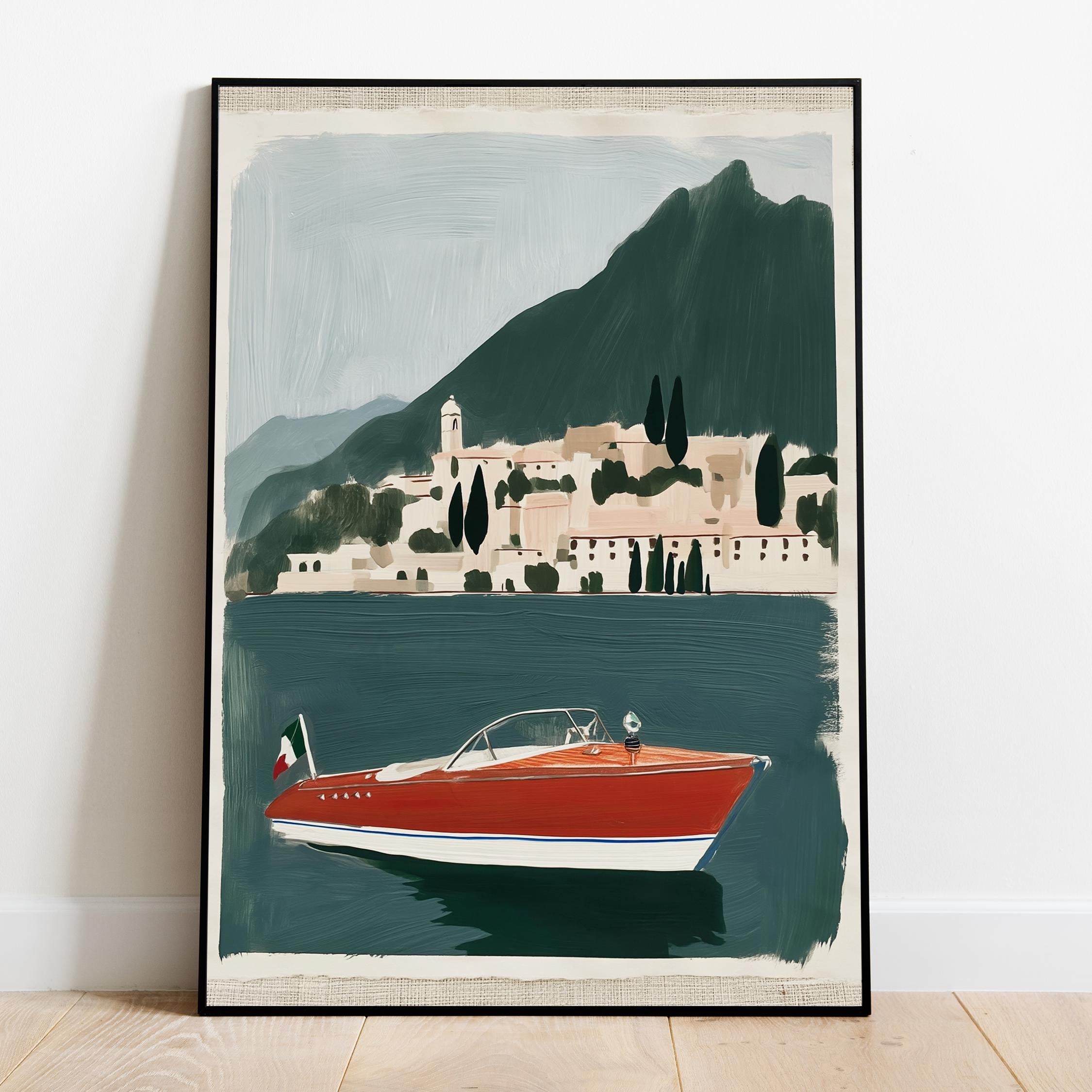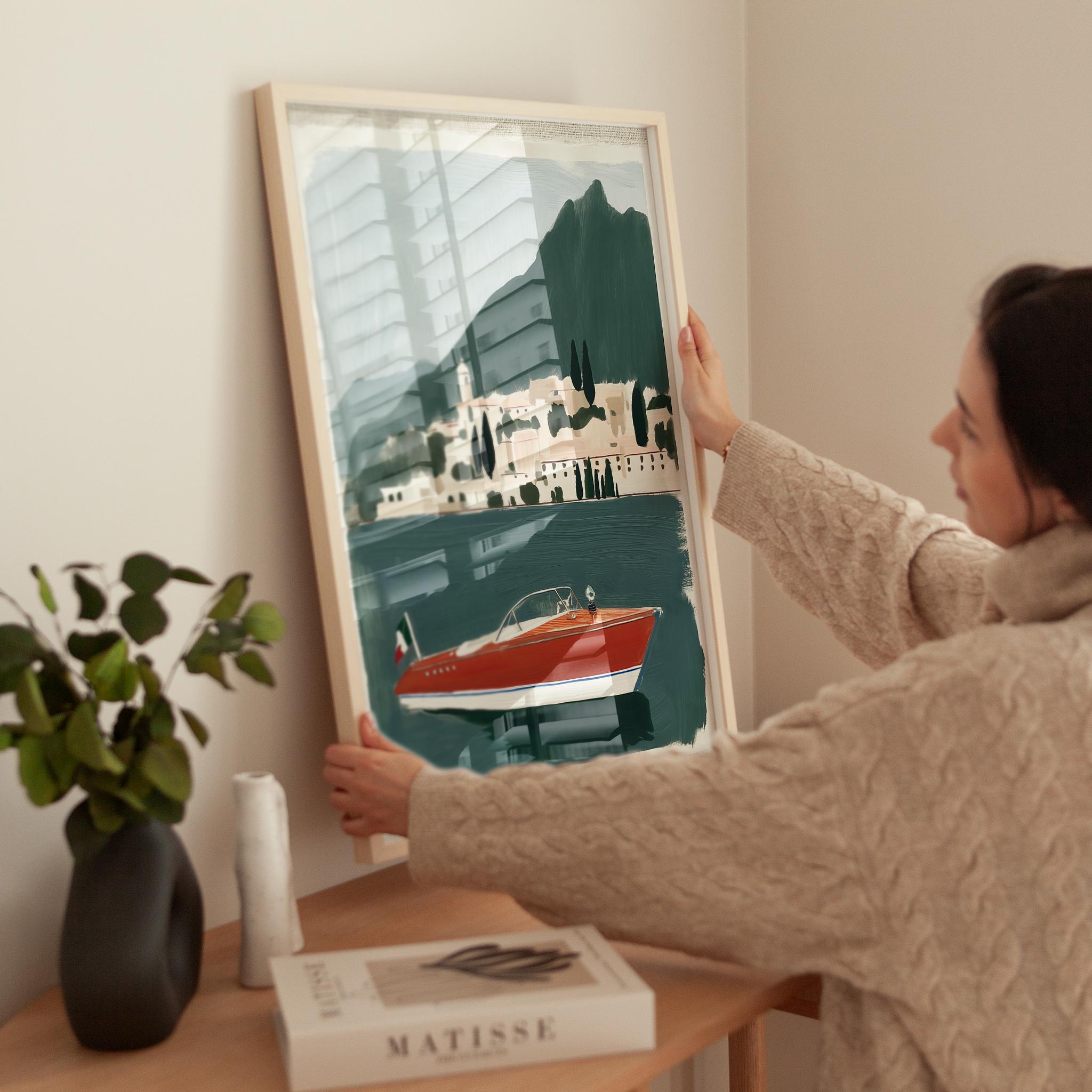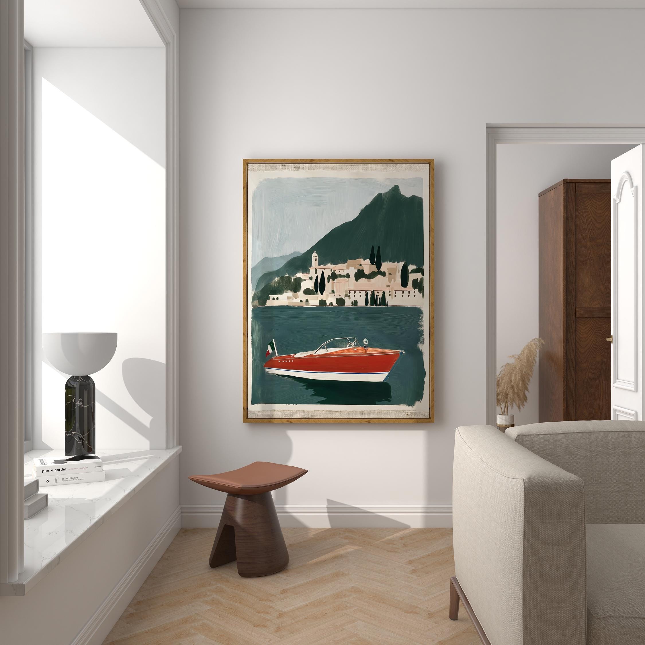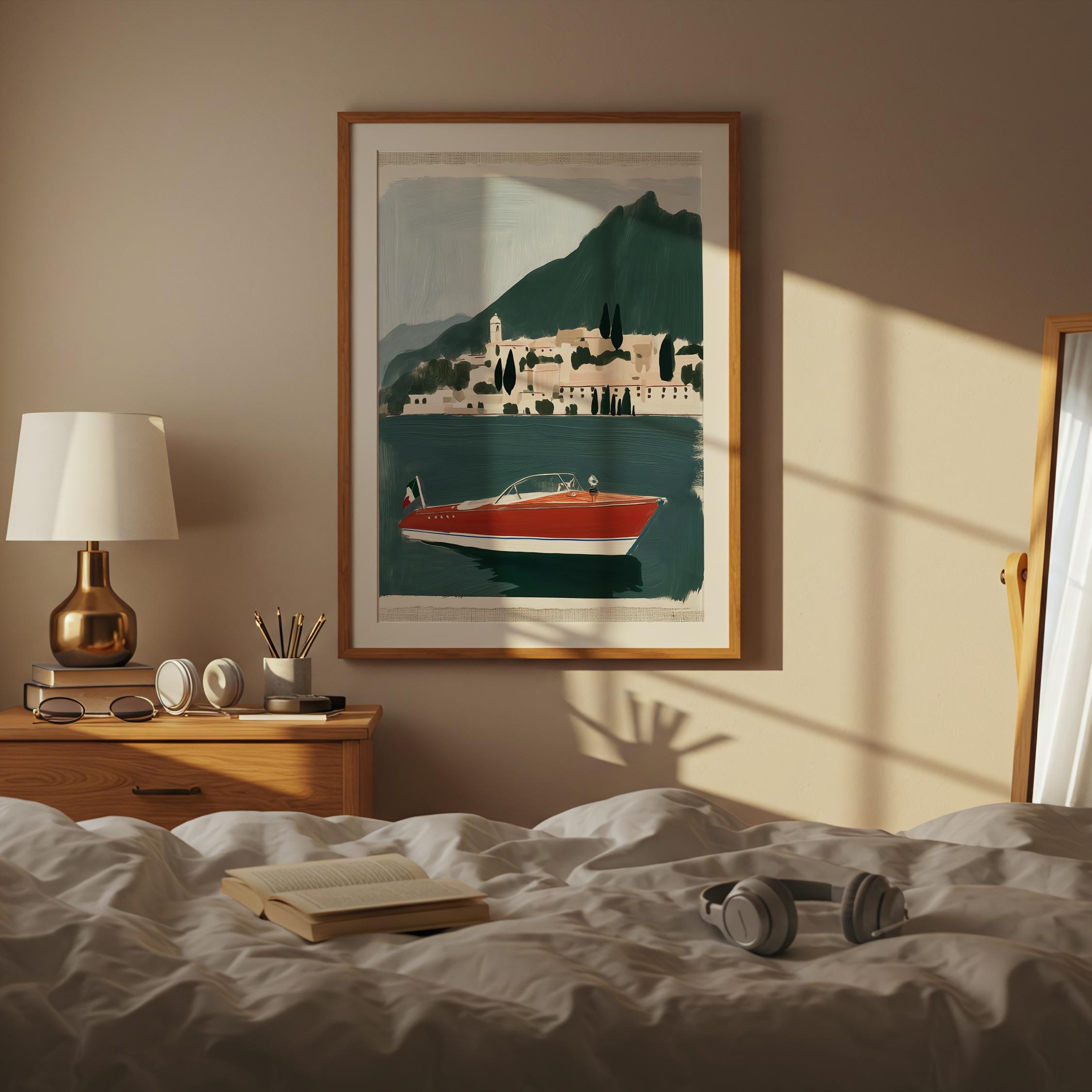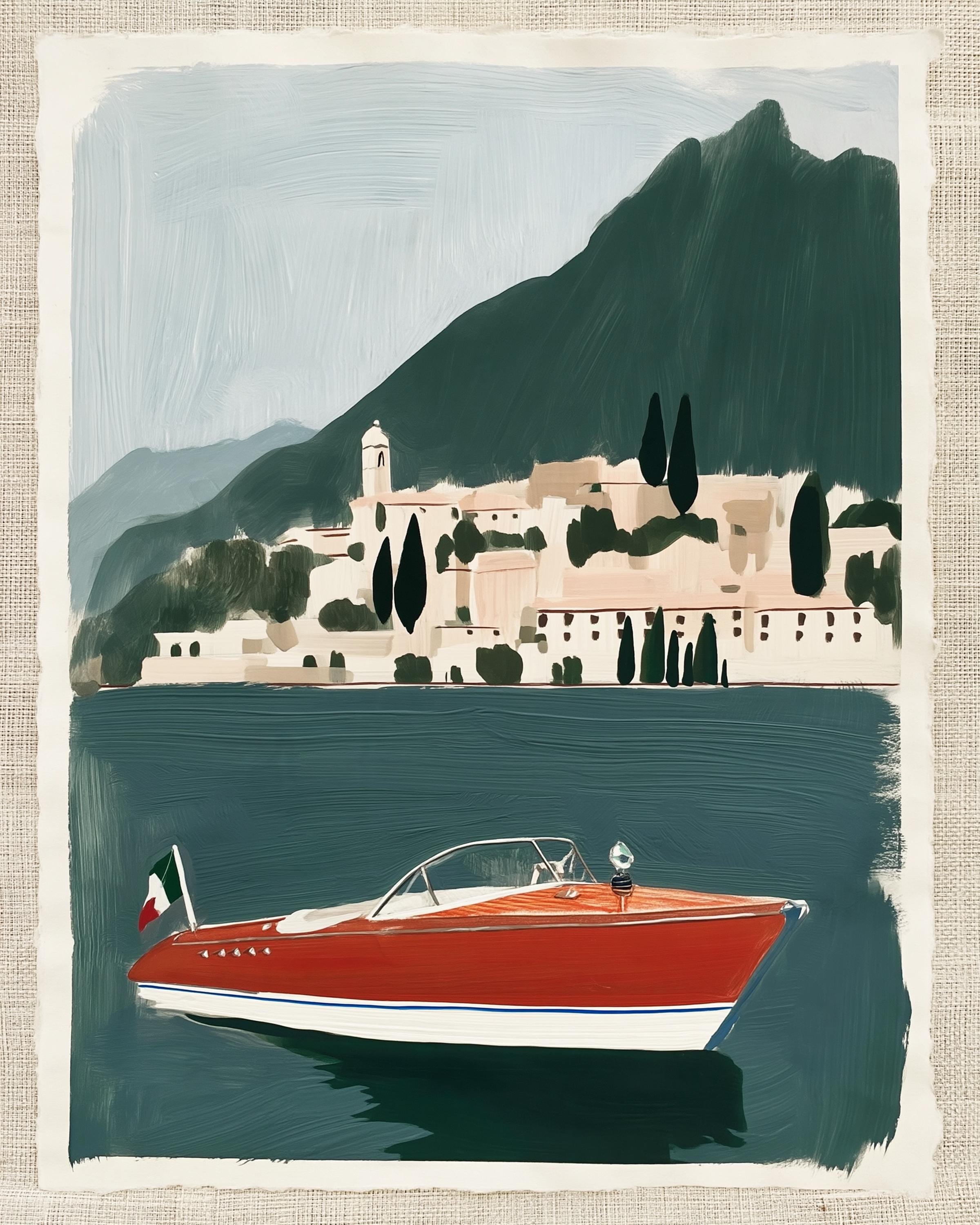 a vintage speedboat painting, perfect for a coastal living room and a great gift for a summer housewarming party.