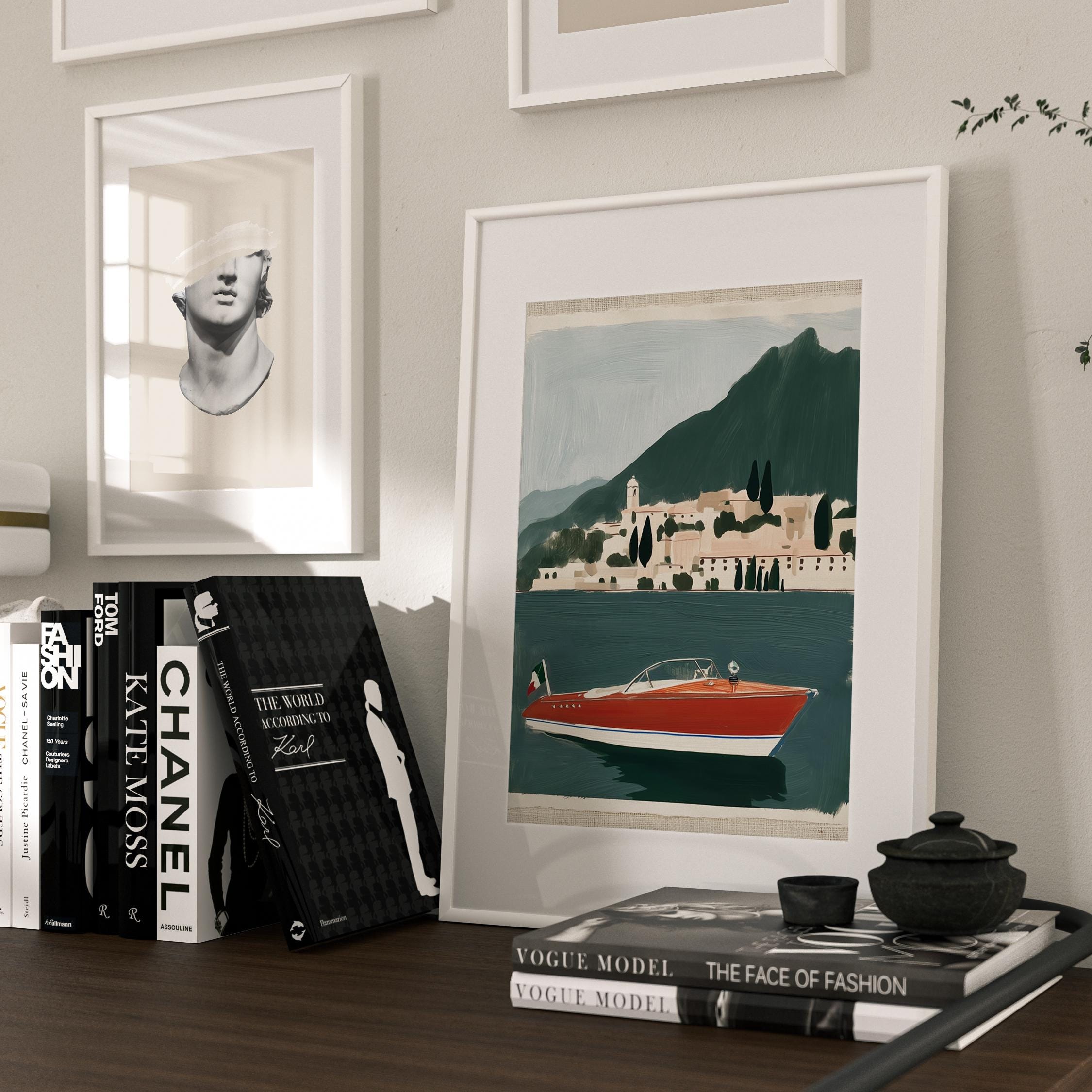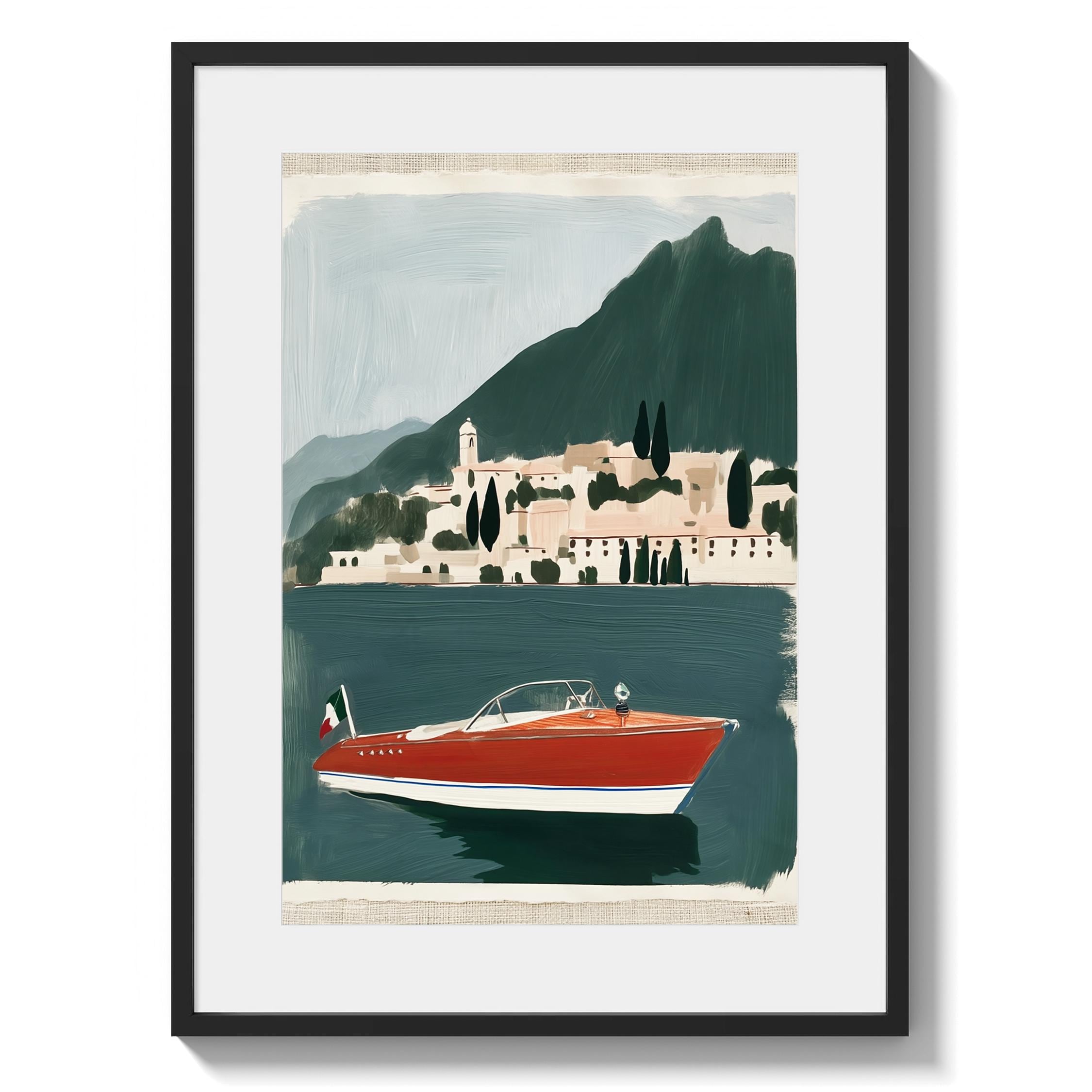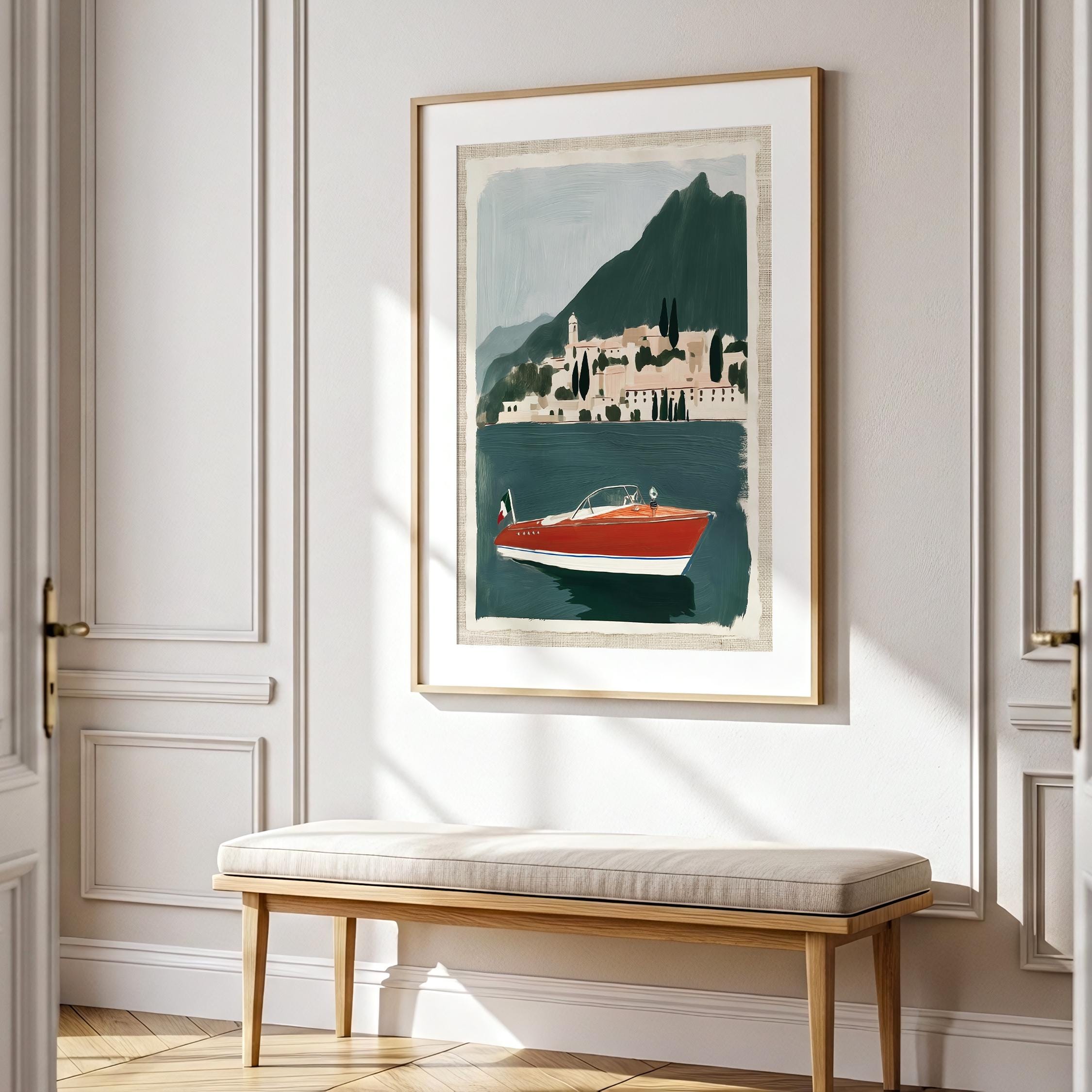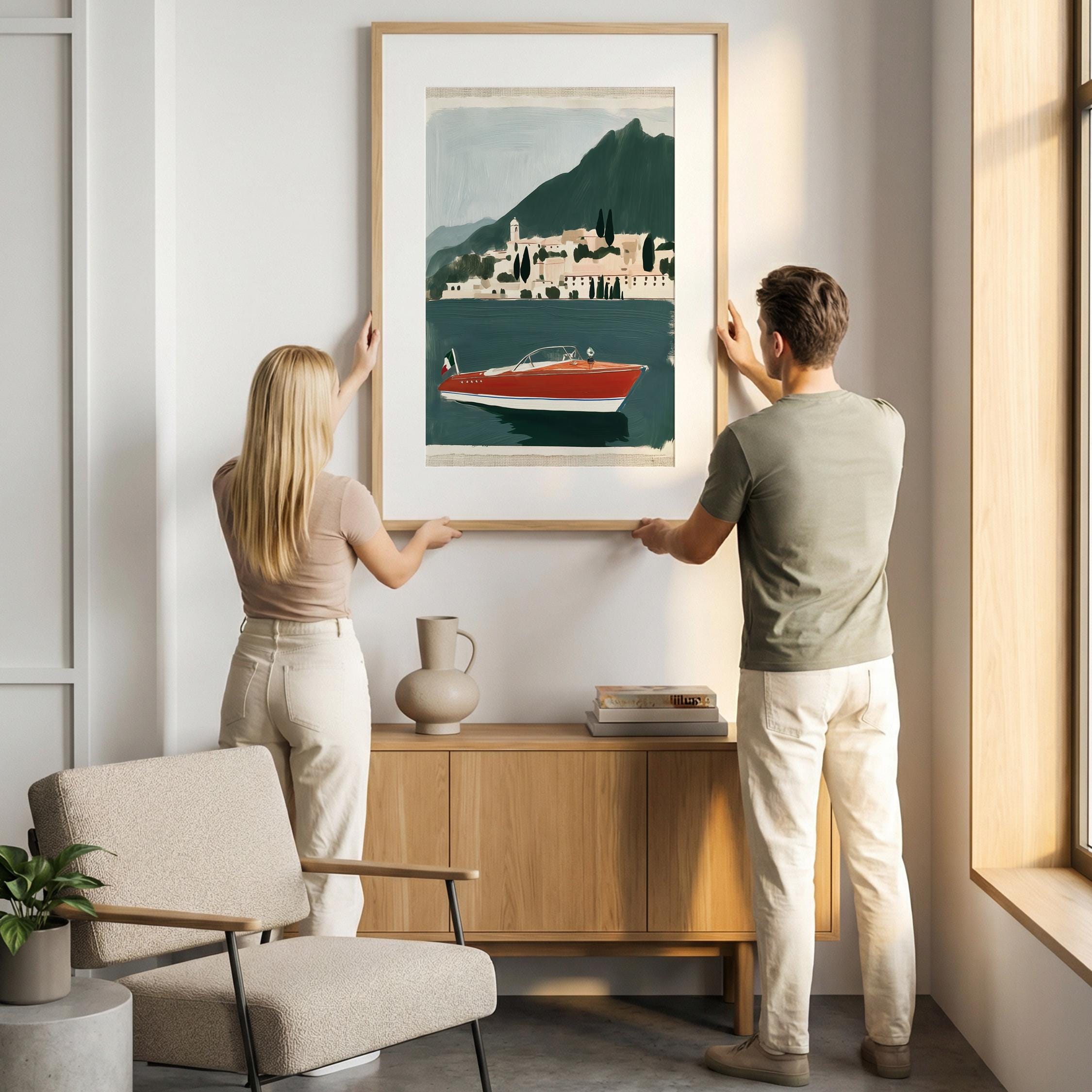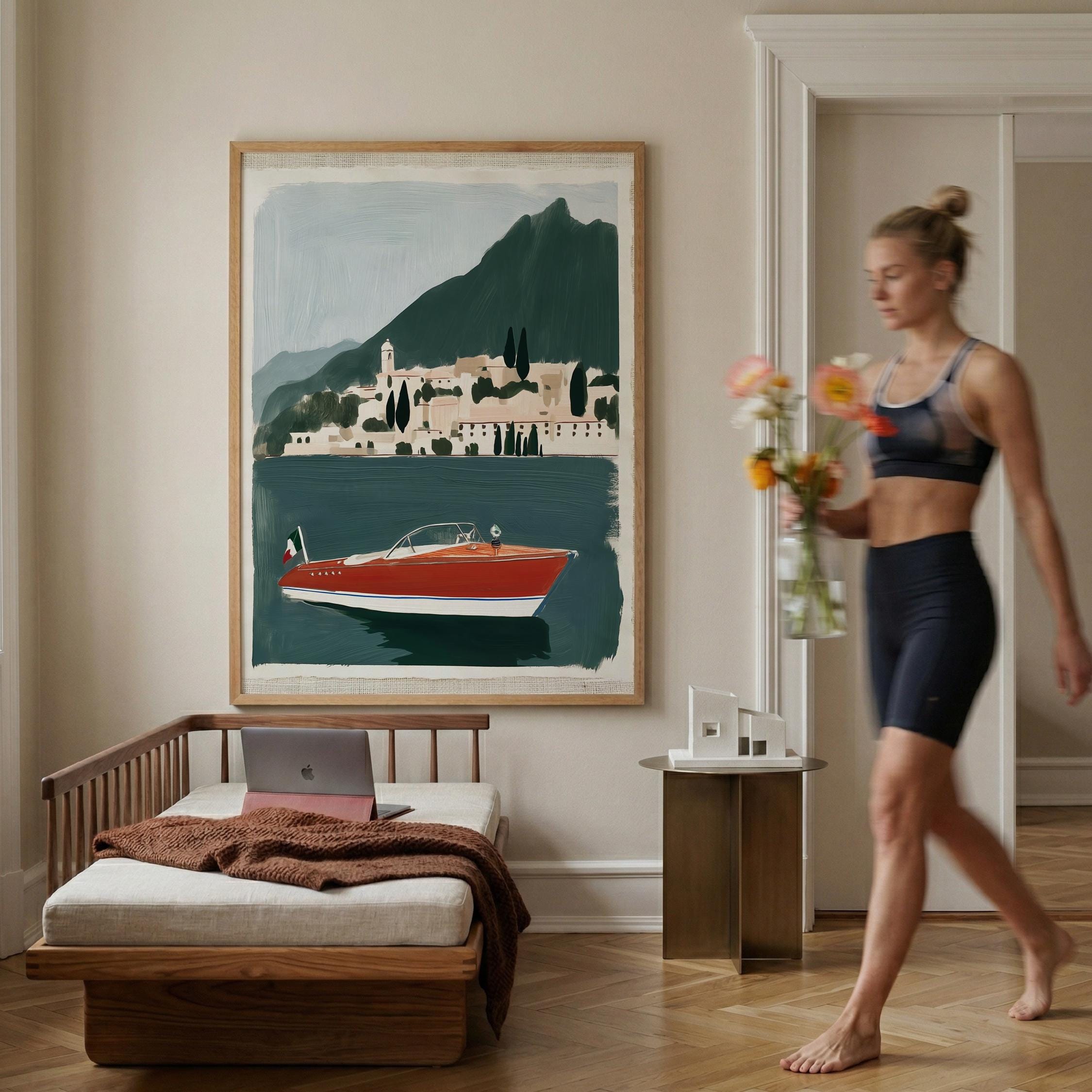 a vintage speedboat painting, perfect for a coastal living room and a great gift for a summer housewarming party.