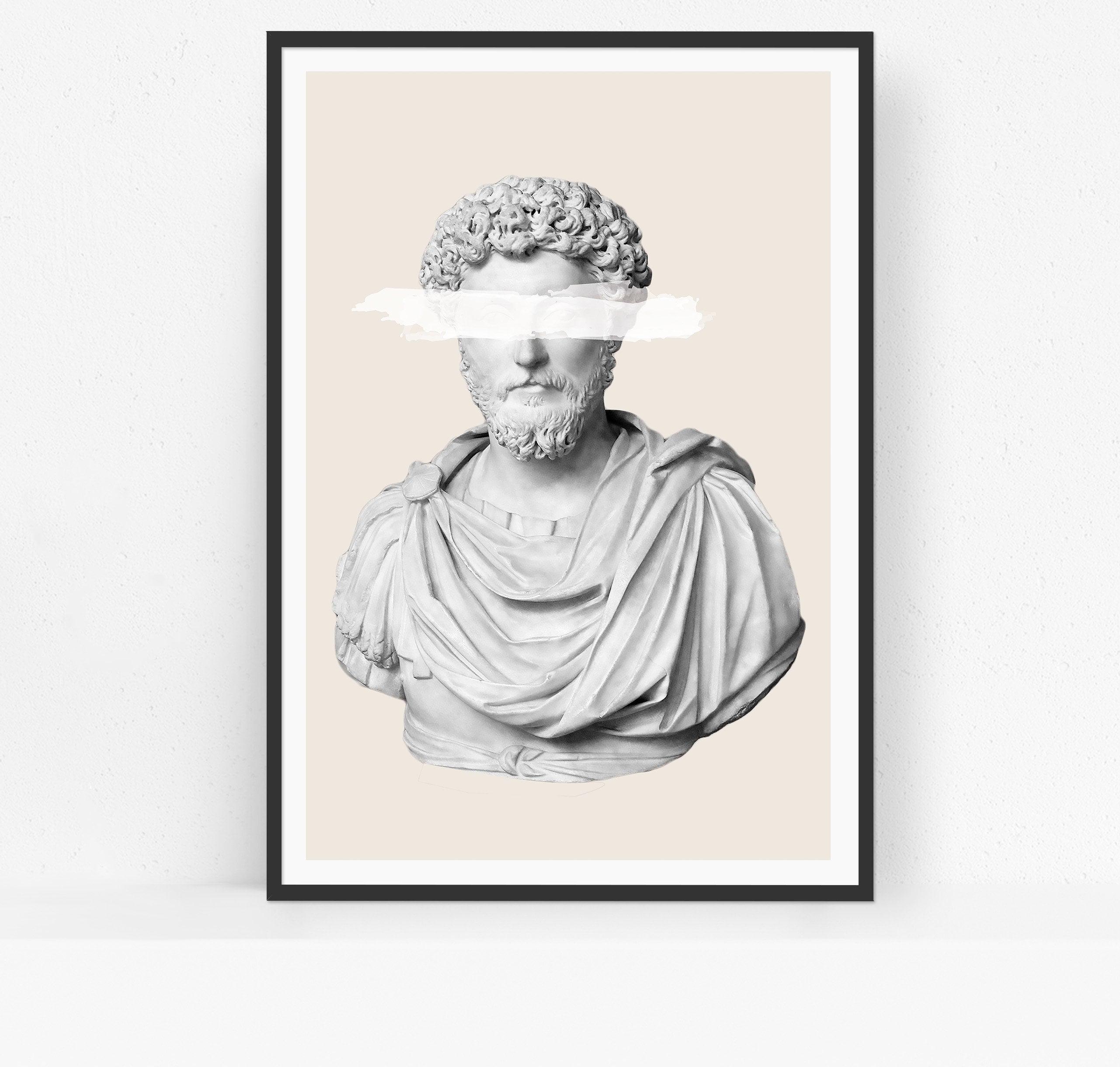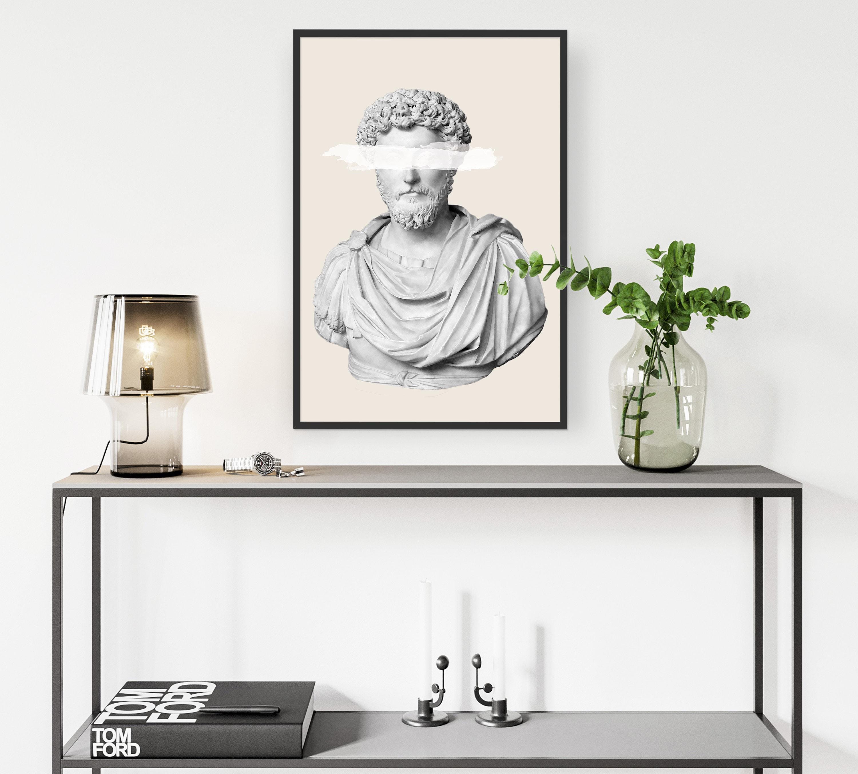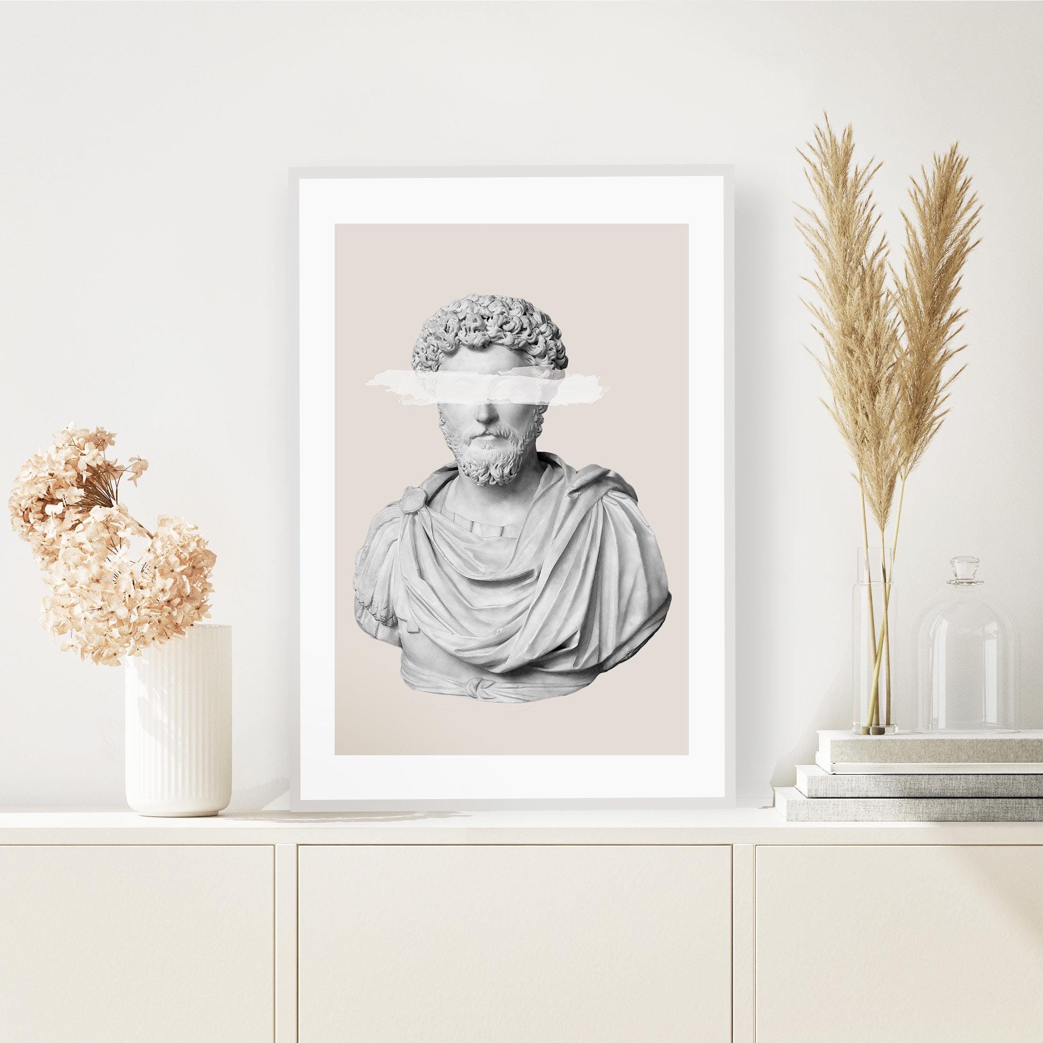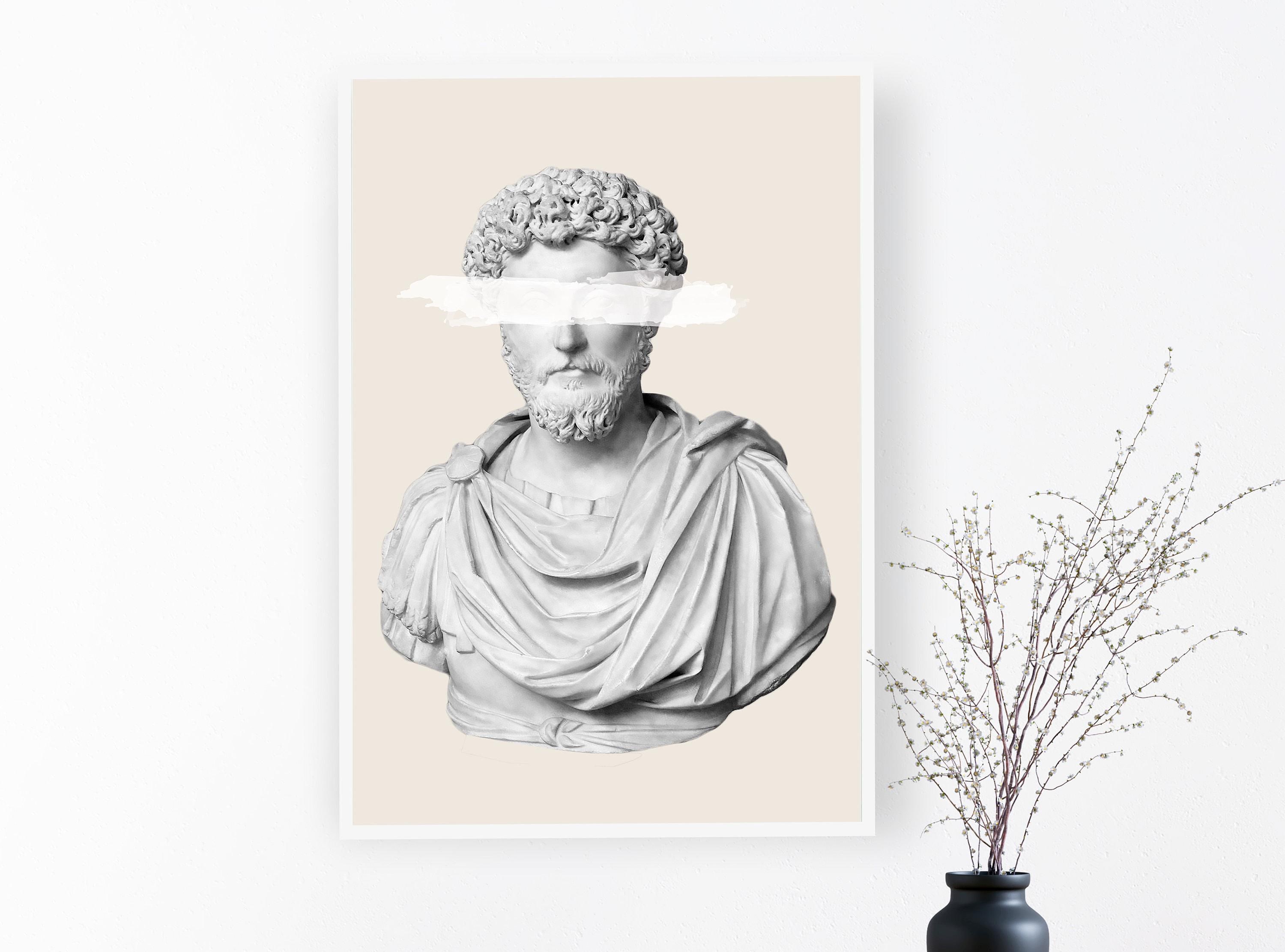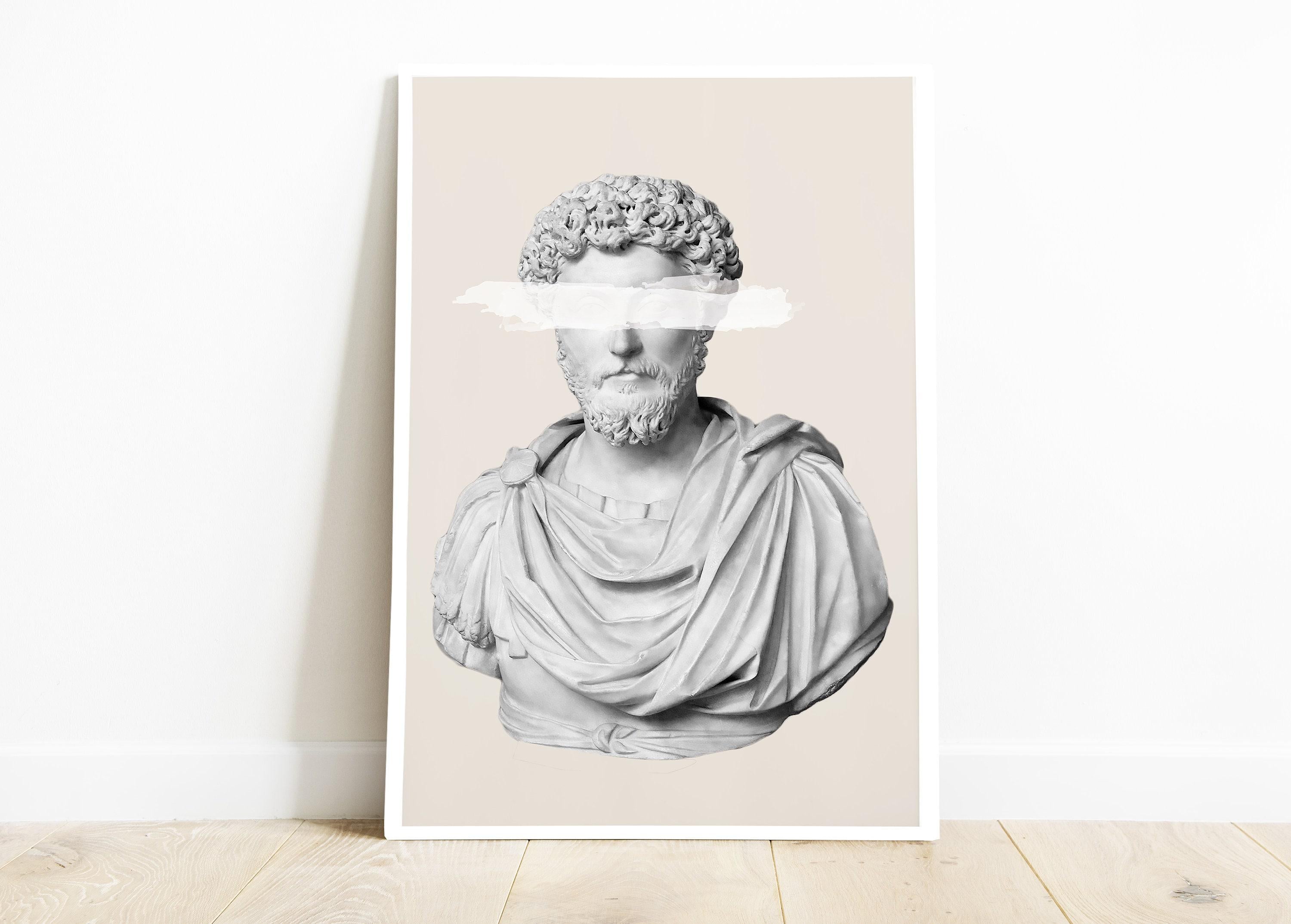 Instantly accessible, this cultured wall decor brings stoic philosophy and the legacy of the stoic roman emperor Marcus Aurelius into your home or office. Inspired by stoicism and featuring the pure beige wall art look of a classic statue, you can easily print this unique artwork in 20+ frame sizes at home, a local shop, or through an online printing service like Staples, Photobox, or Officeworks. The image captures the essence of a stoic roman bust and channels wisdom from Marcus Aurelius, Epictetus, and the ideas of amor fati and memento mori, making it a thoughtful marcus aurelius gift or an ideal stoicism decoration for any enthusiast.